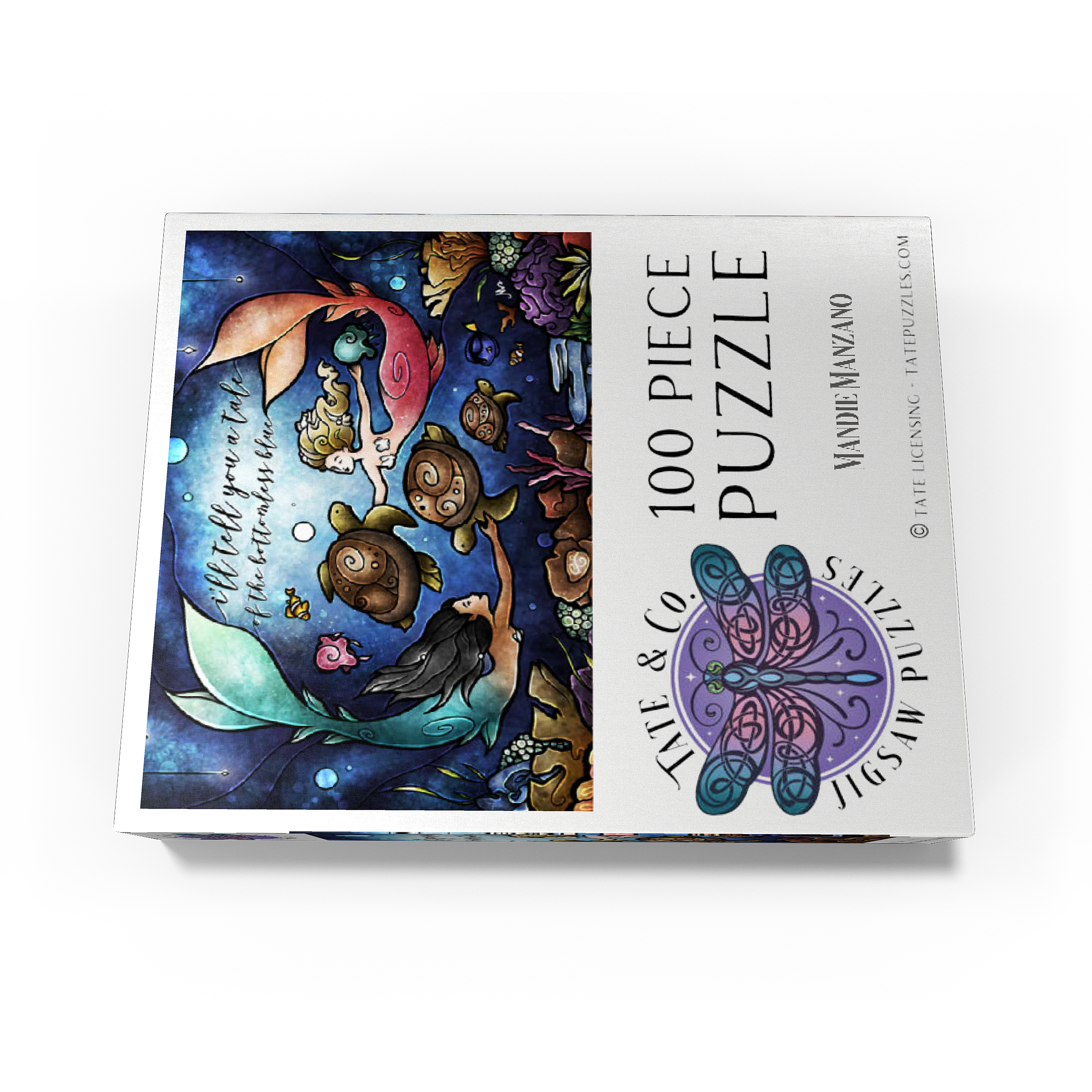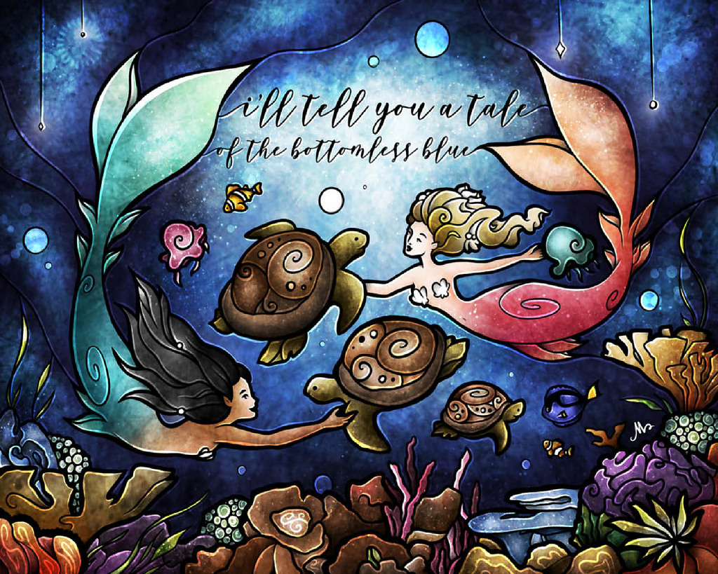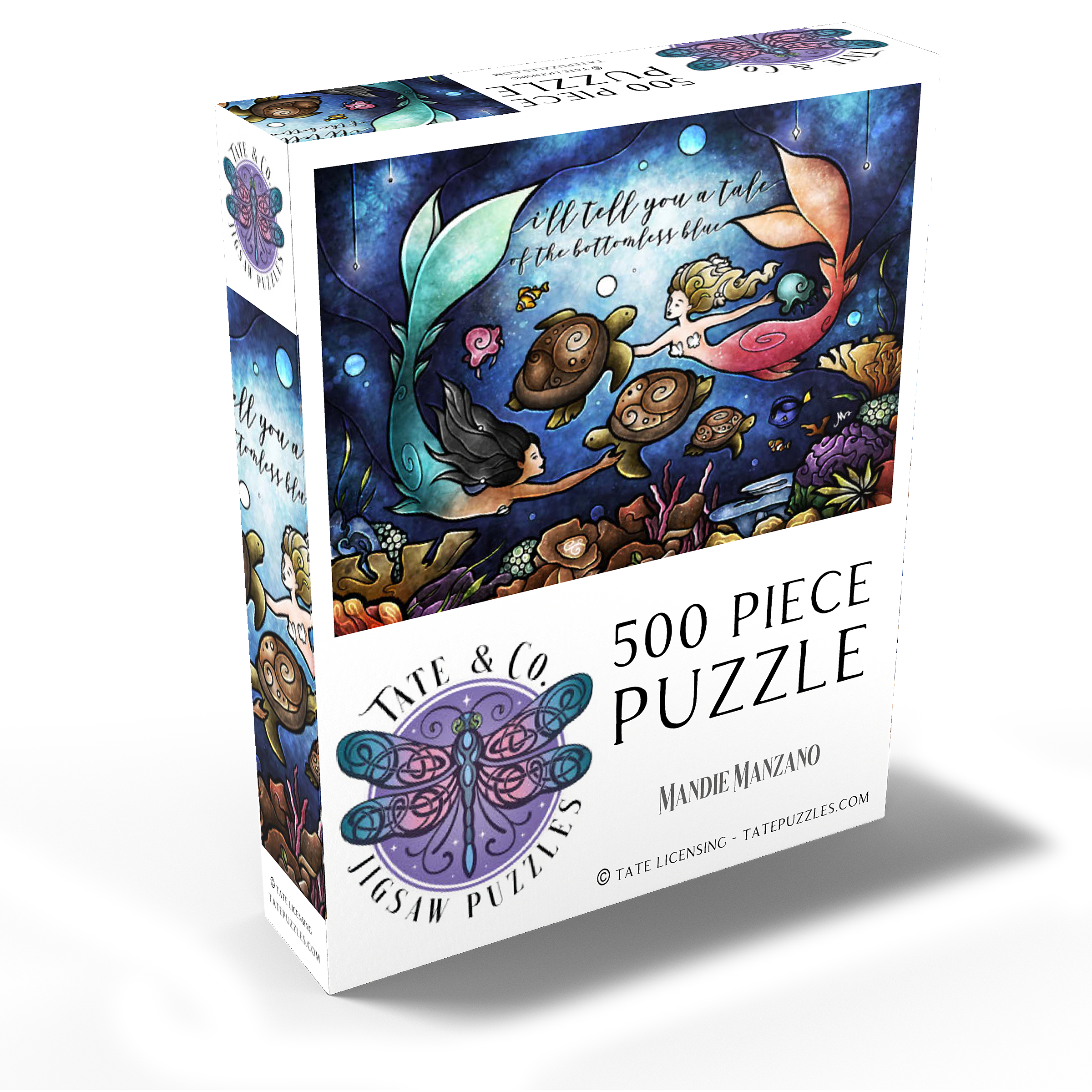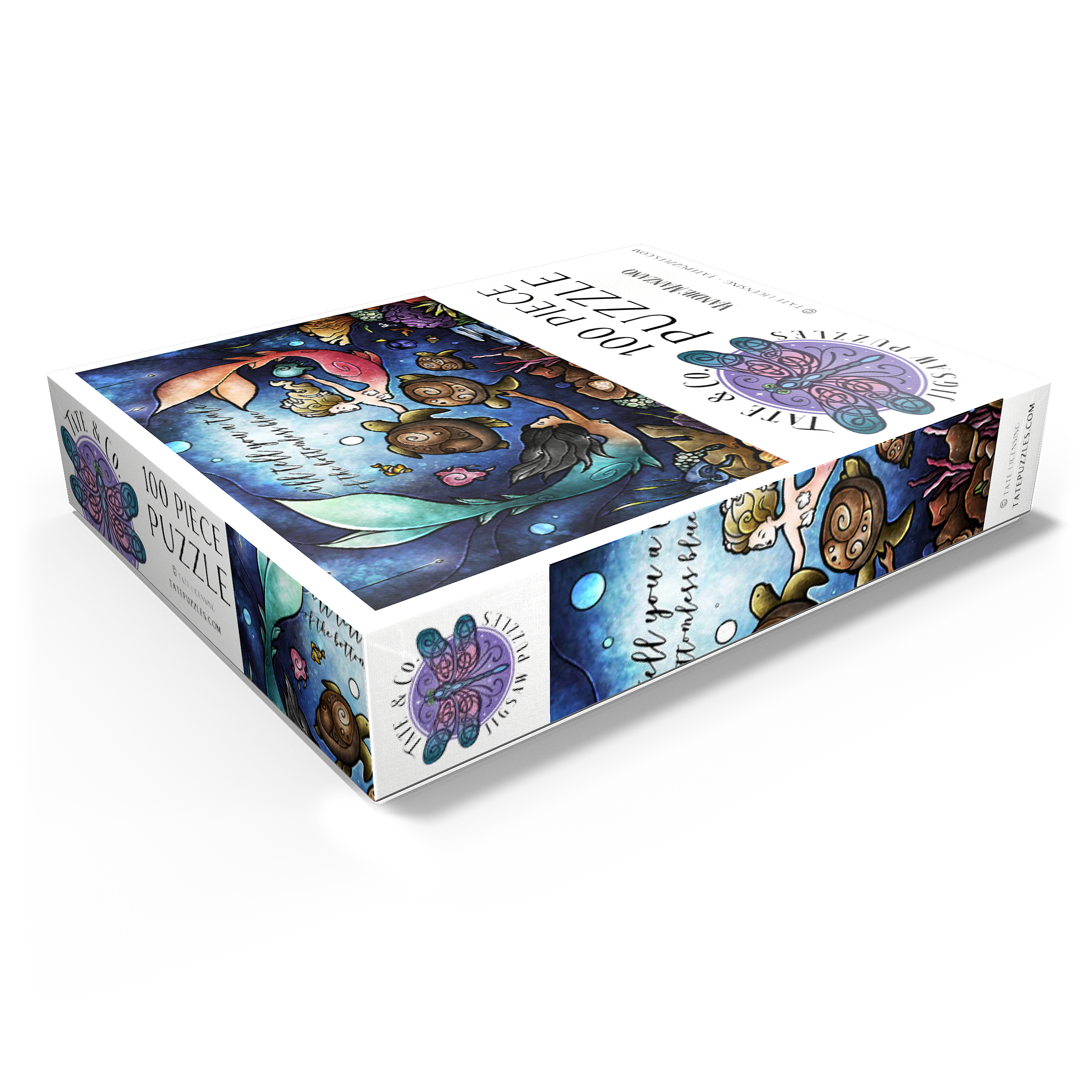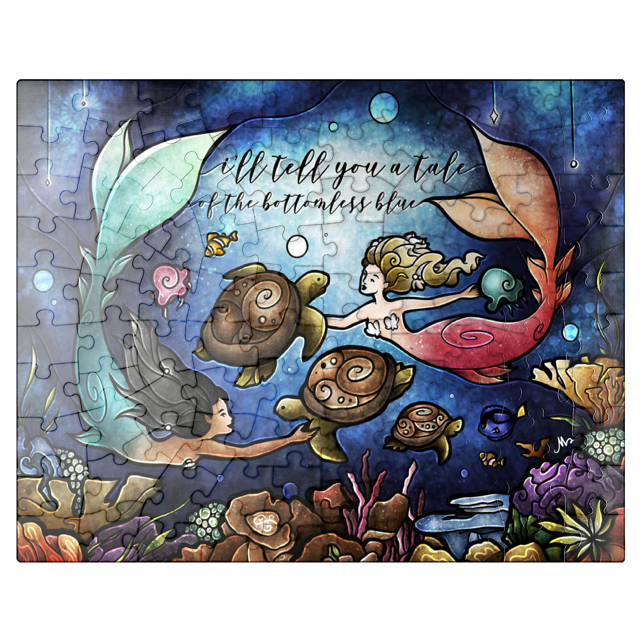 Dive into an enchanting underwater world! Two graceful mermaids, with flowing hair and vibrant tails, prepare to share a tale with their curious turtle friends amidst colorful coral and shimmering waters. Discover the secrets of the deep as you piece together this whimsical scene of friendship and storytelling beneath the waves.