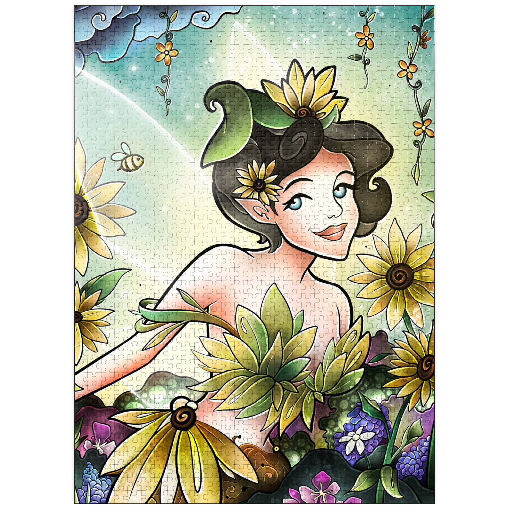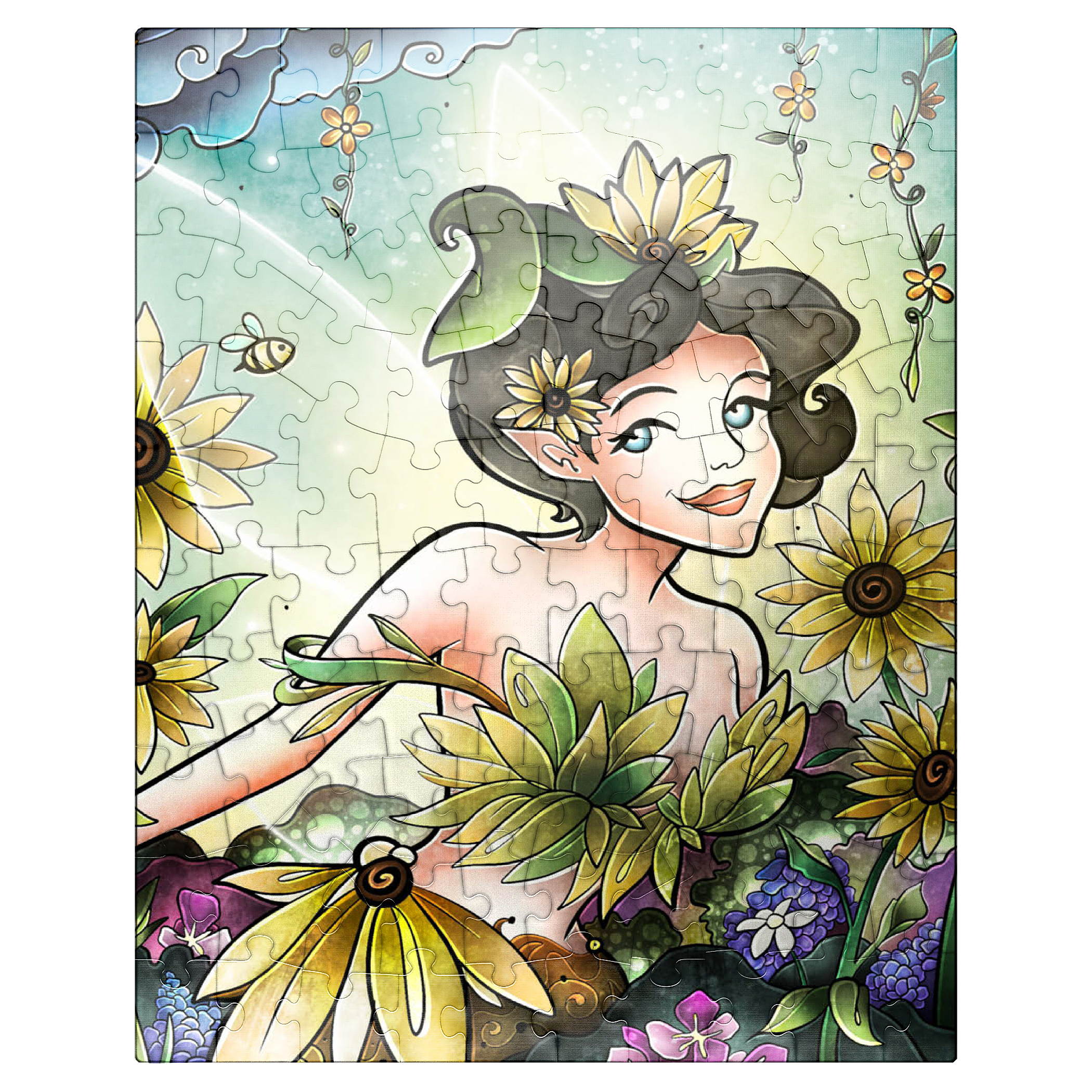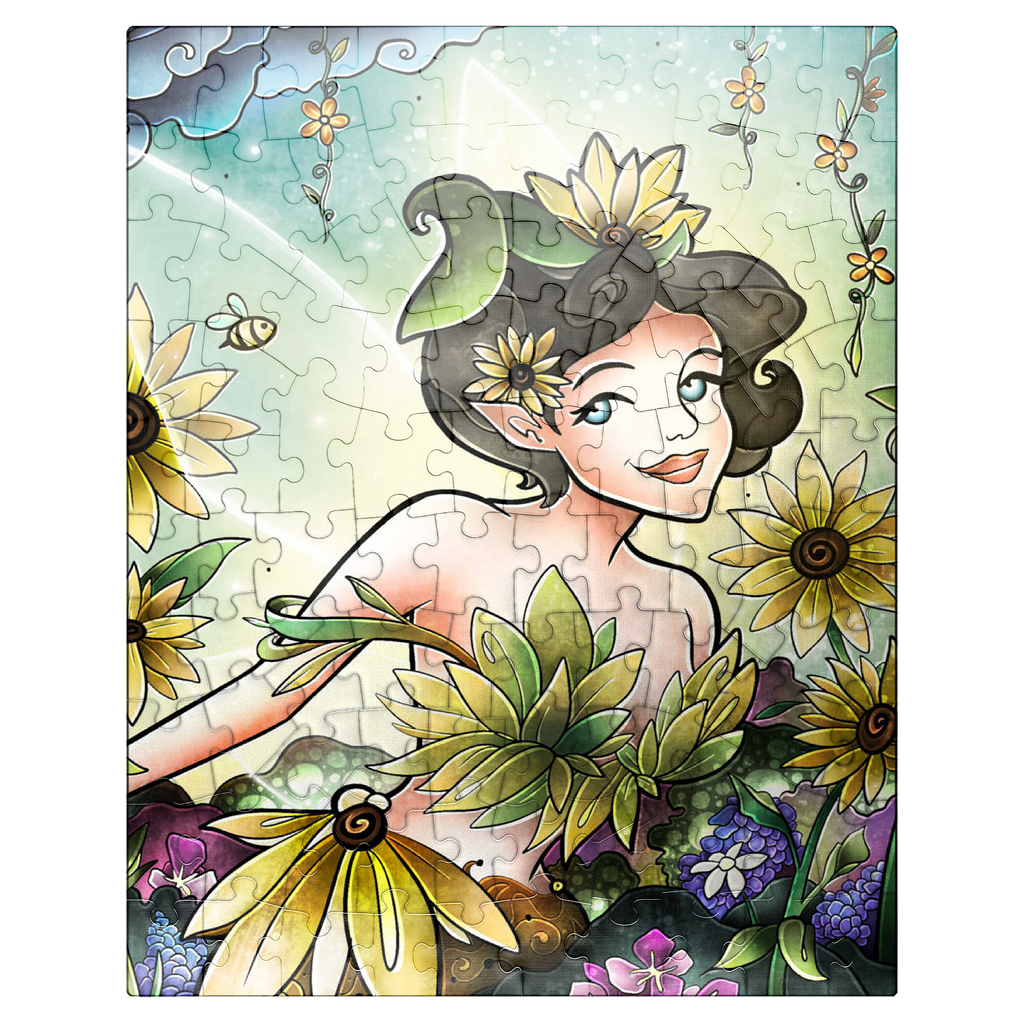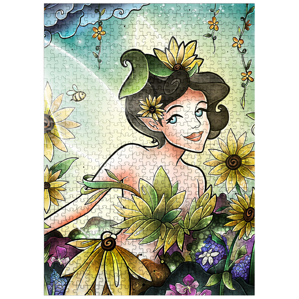 Step into the warmth of -Cyrus the Fairy of Summer- by Mandie Manzano! Piece together this sun-kissed scene of a cheerful fairy surrounded by vibrant summer blooms, including bright sunflowers. With delicate wings and a joyful expression, Cyrus embodies the energy of the season. A buzzing bee adds to the lively atmosphere. Immerse yourself in the radiant colors and summery charm of this delightful puzzle.
