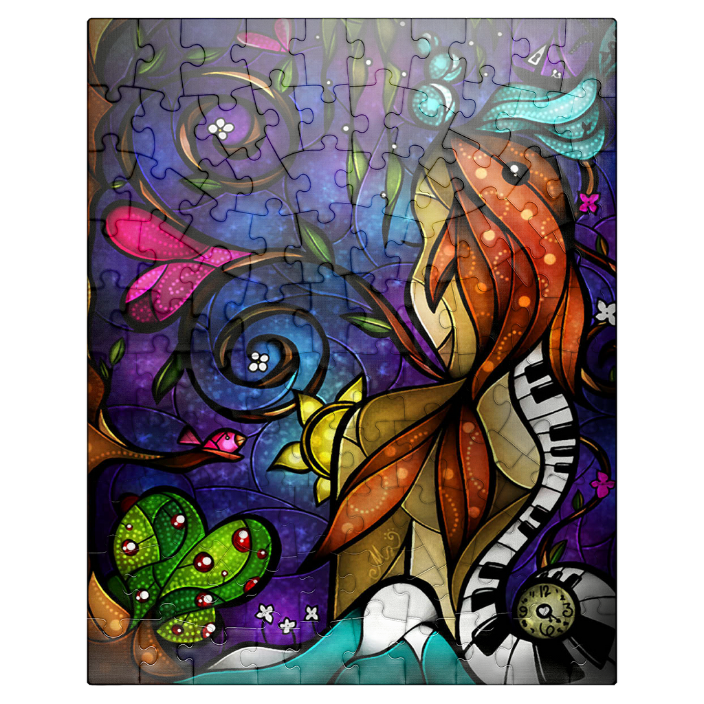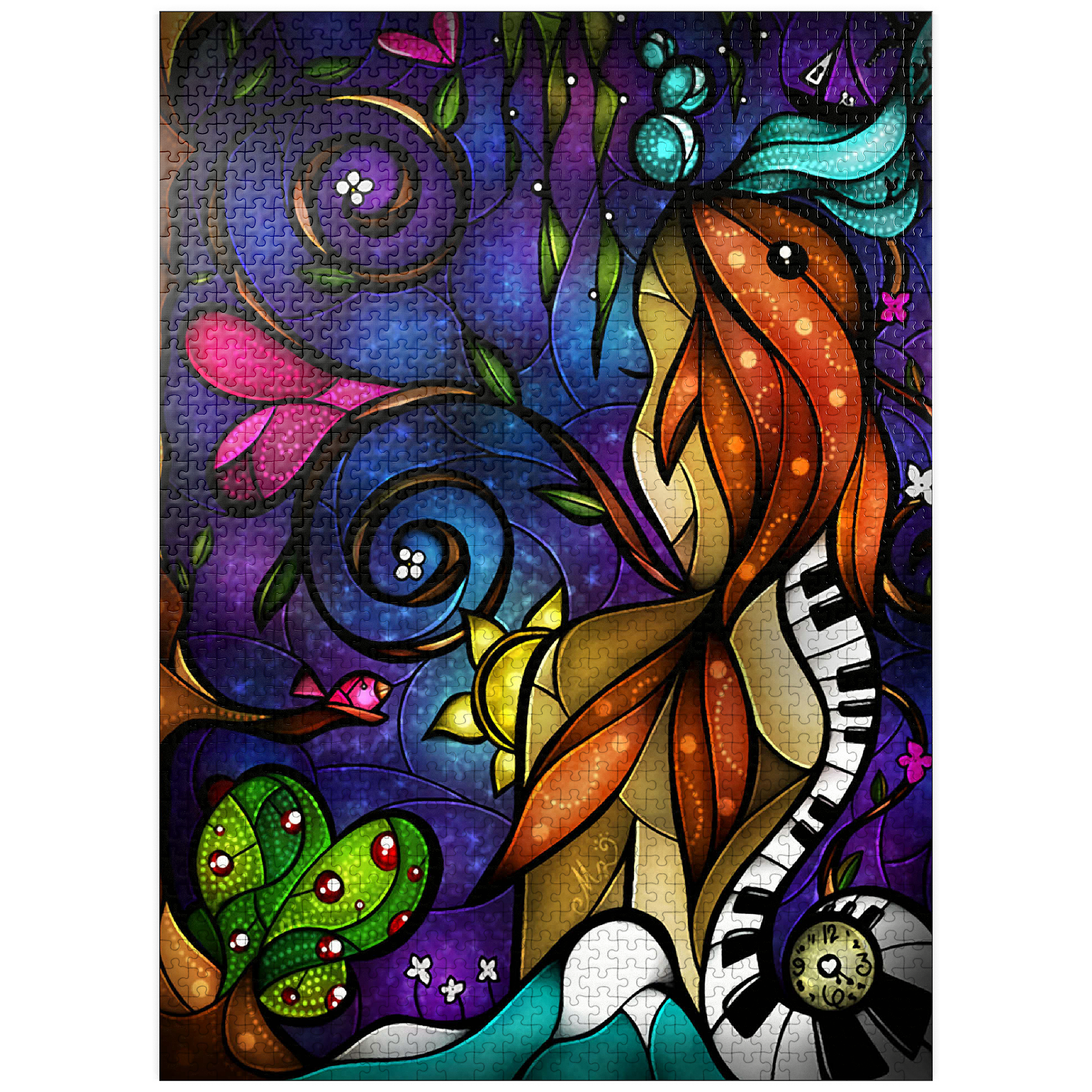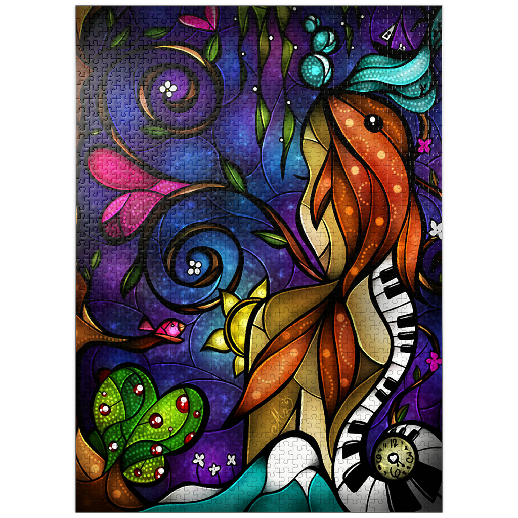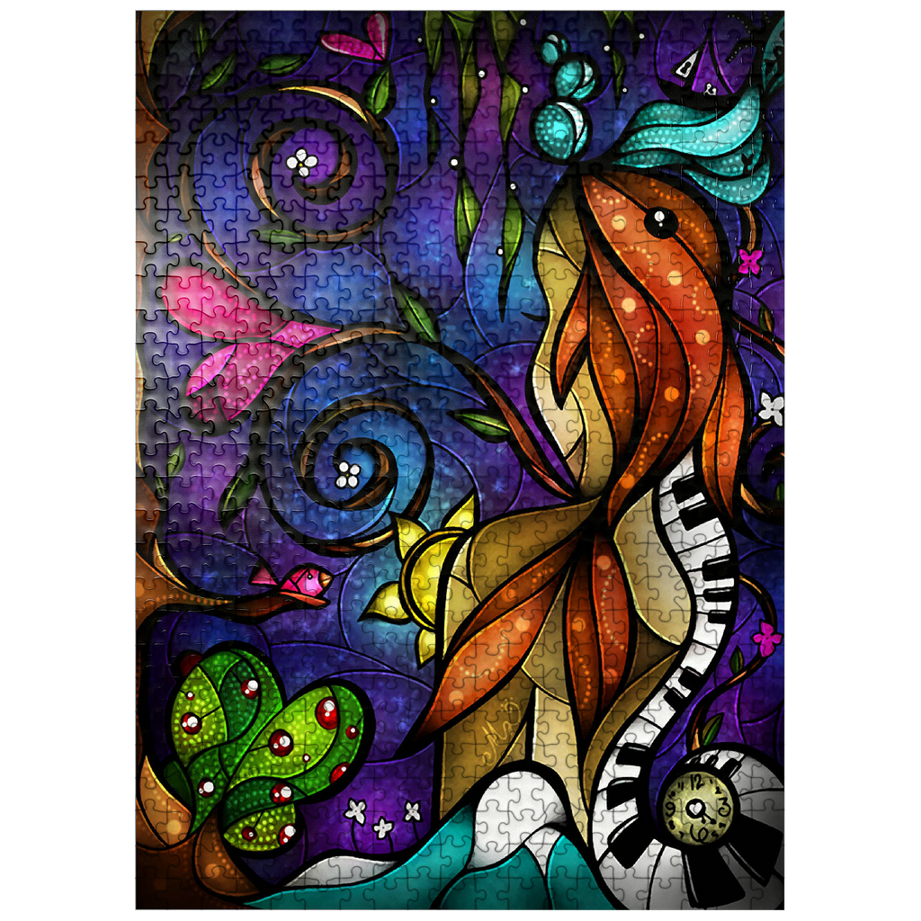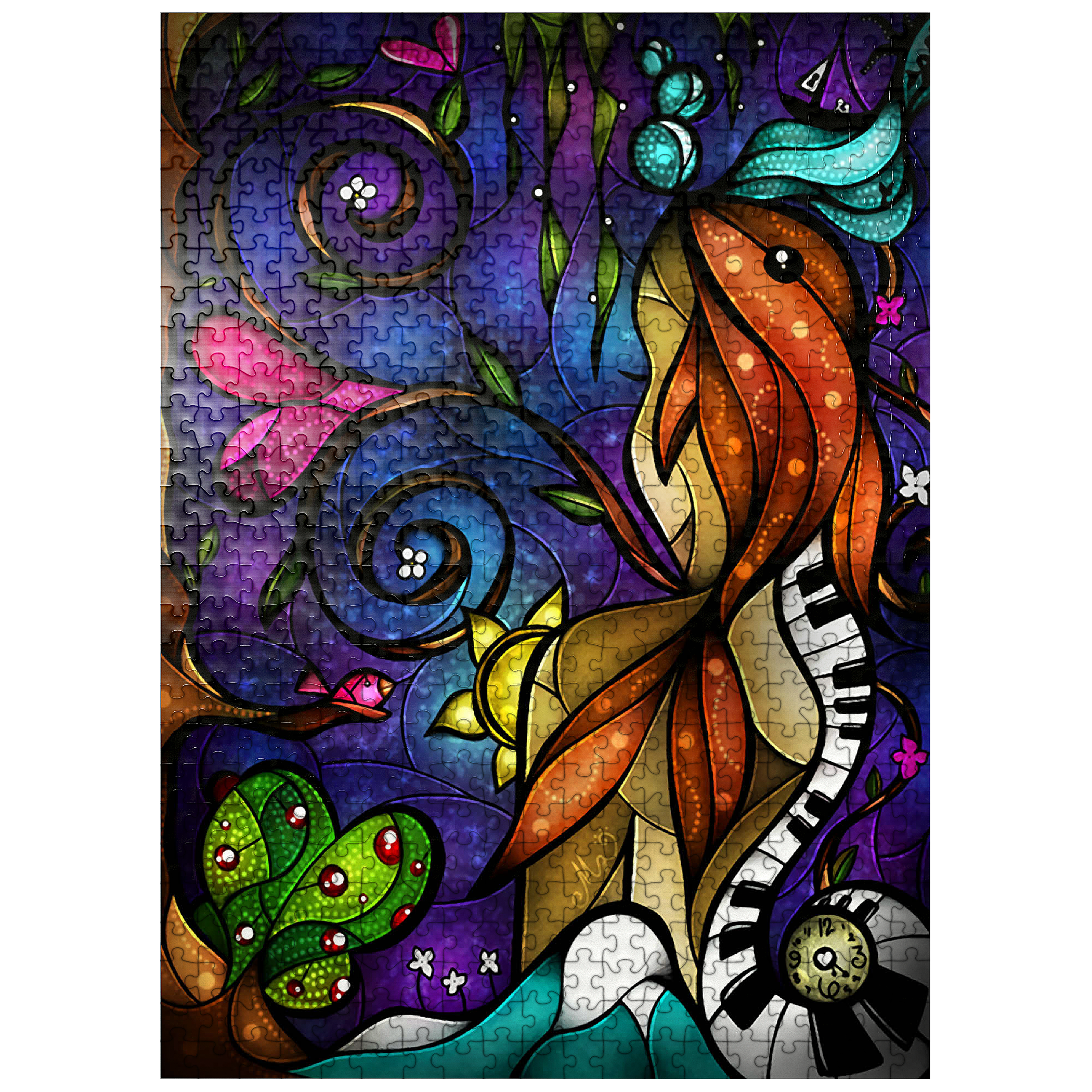 Piece together this whimsical and vibrant artwork! A stylized figure with flowing, fish-like hair merges with musical elements: a piano keyboard forms part of her silhouette, and a clock face peeks out. Swirling vines, colorful flowers, a tiny bird, and abstract shapes dance across a deep blue and purple background dotted with stars. Discover the harmonious blend of nature and music in this captivating puzzle of the artists mind.