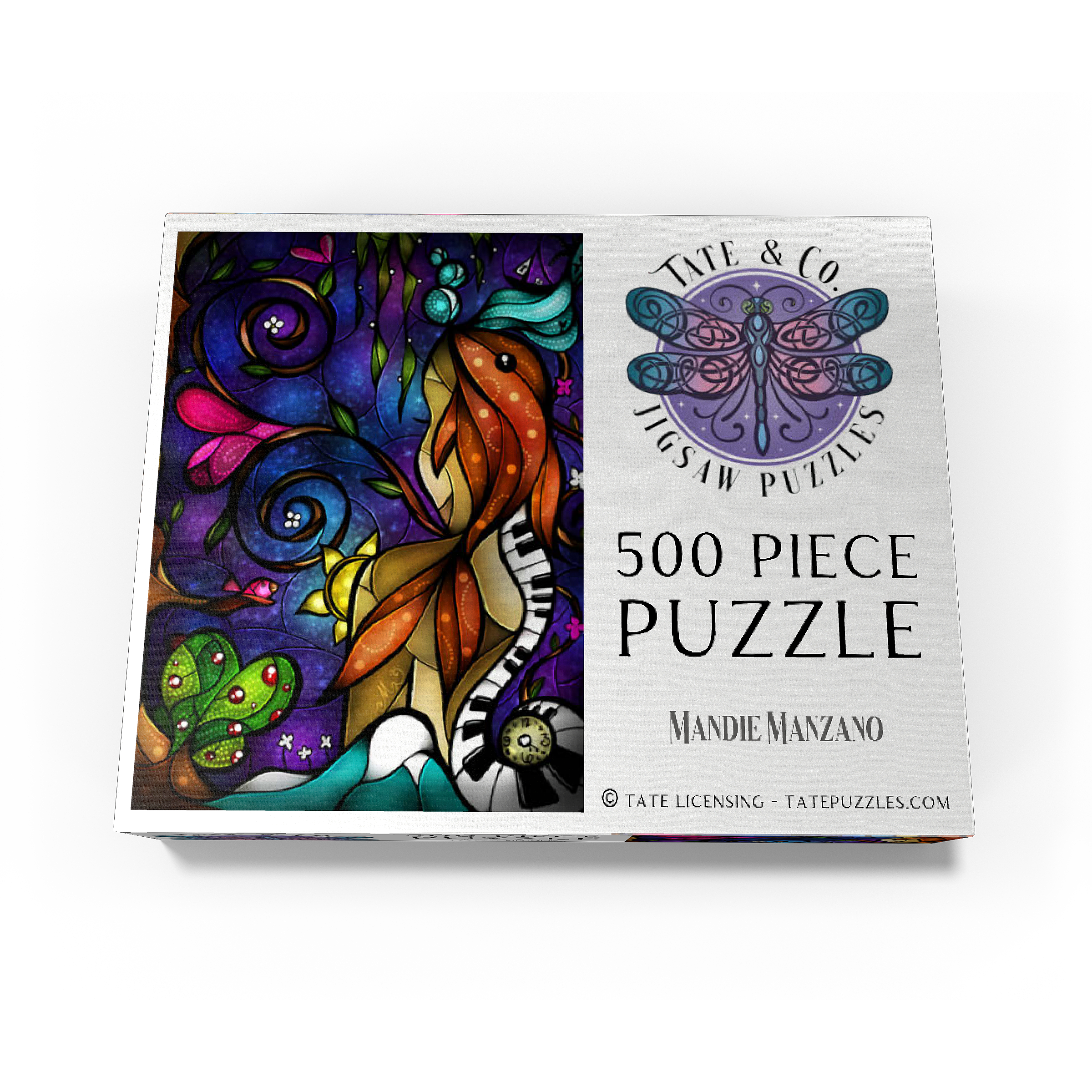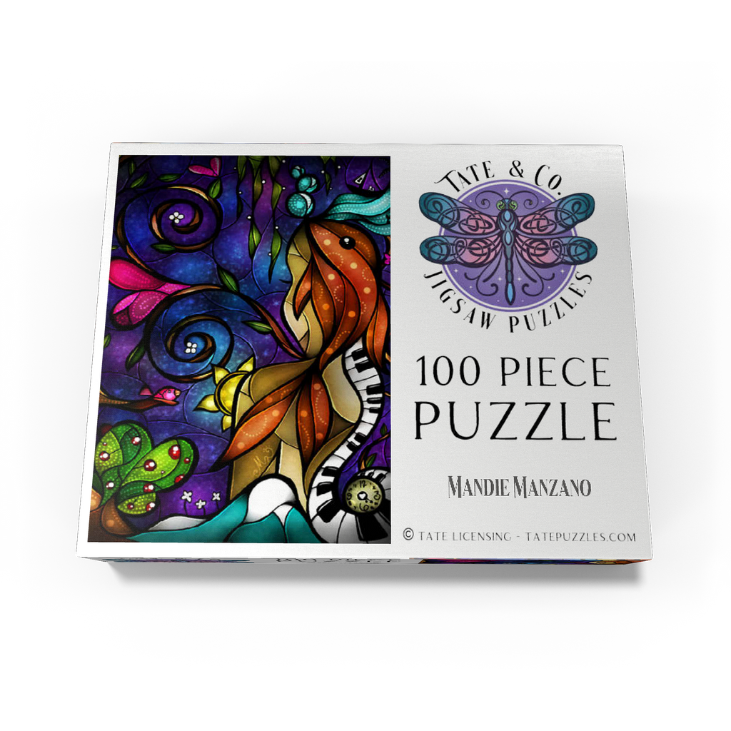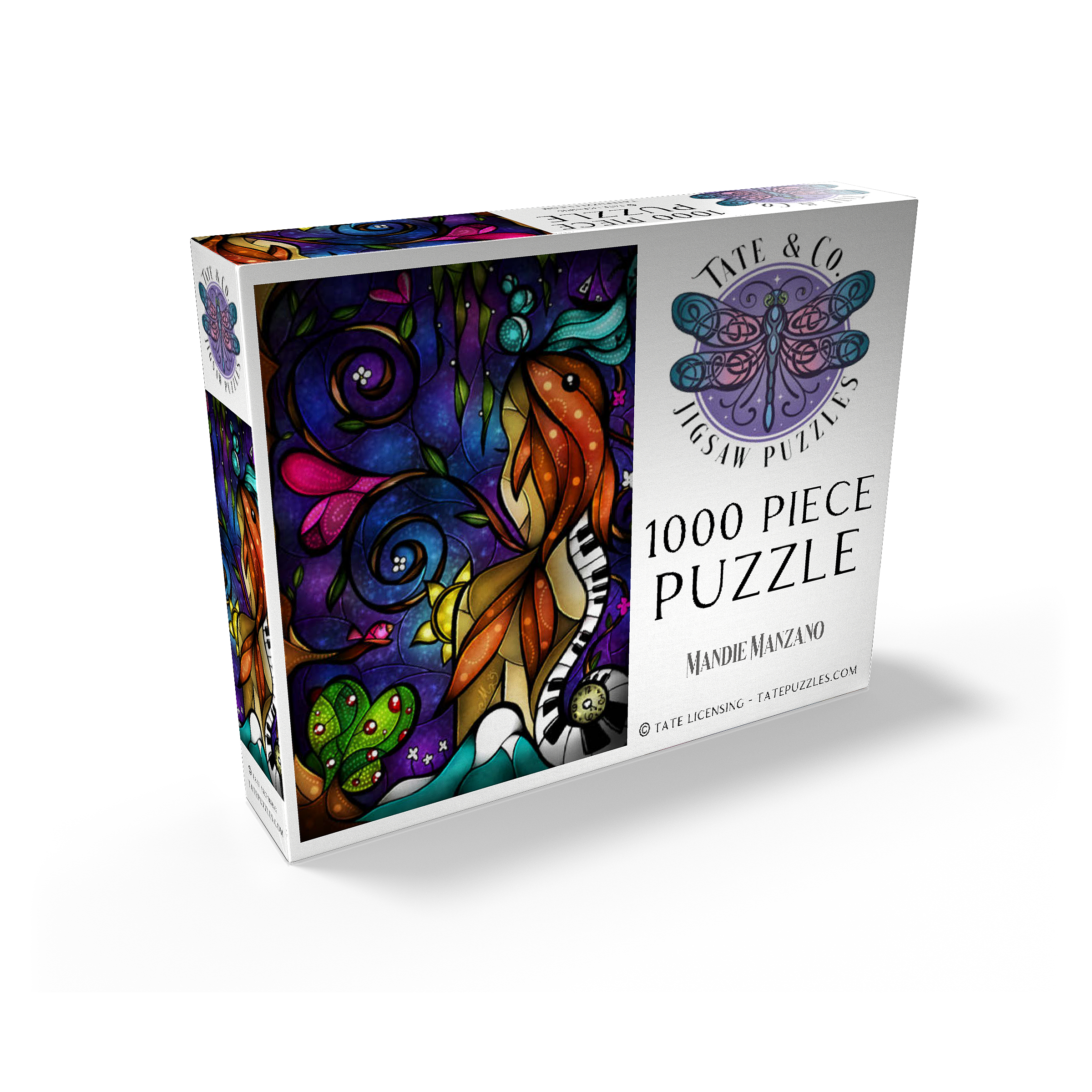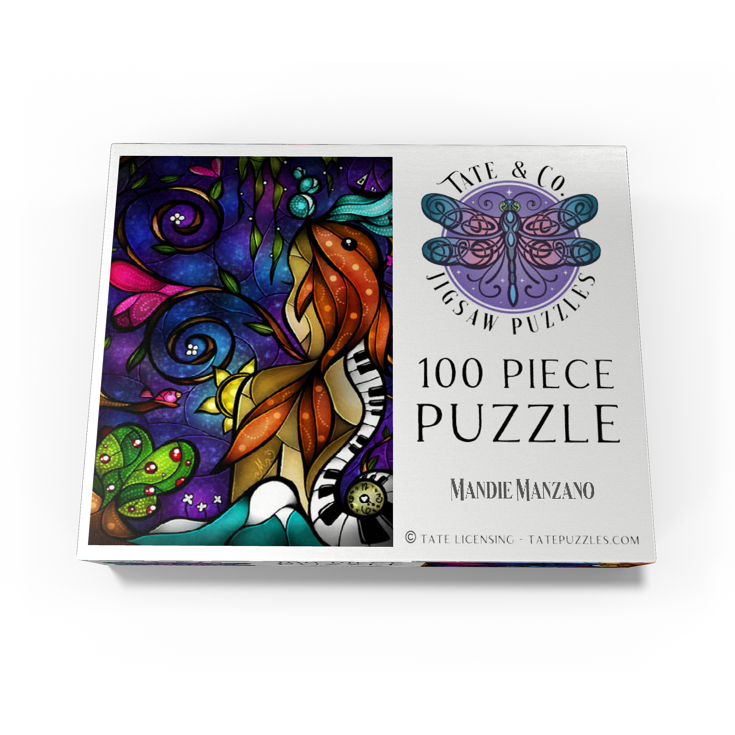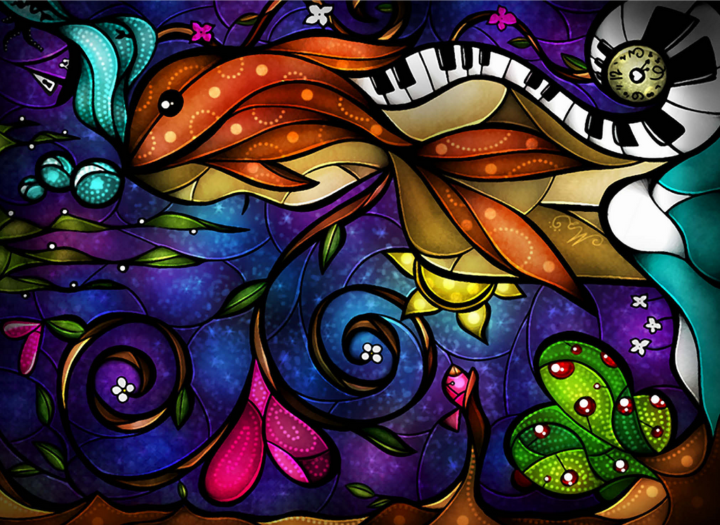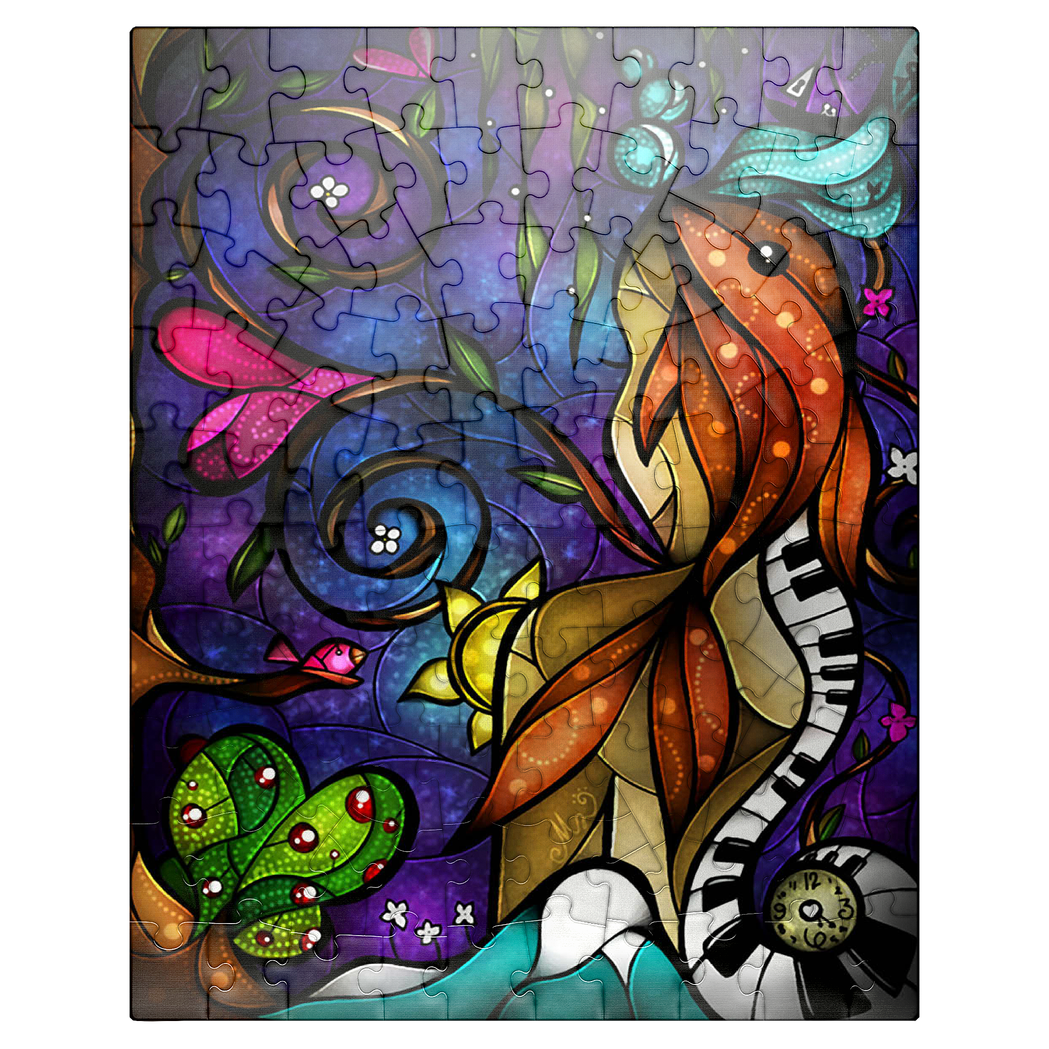 Piece together this whimsical and vibrant artwork! A stylized figure with flowing, fish-like hair merges with musical elements: a piano keyboard forms part of her silhouette, and a clock face peeks out. Swirling vines, colorful flowers, a tiny bird, and abstract shapes dance across a deep blue and purple background dotted with stars. Discover the harmonious blend of nature and music in this captivating puzzle of the artists mind.
