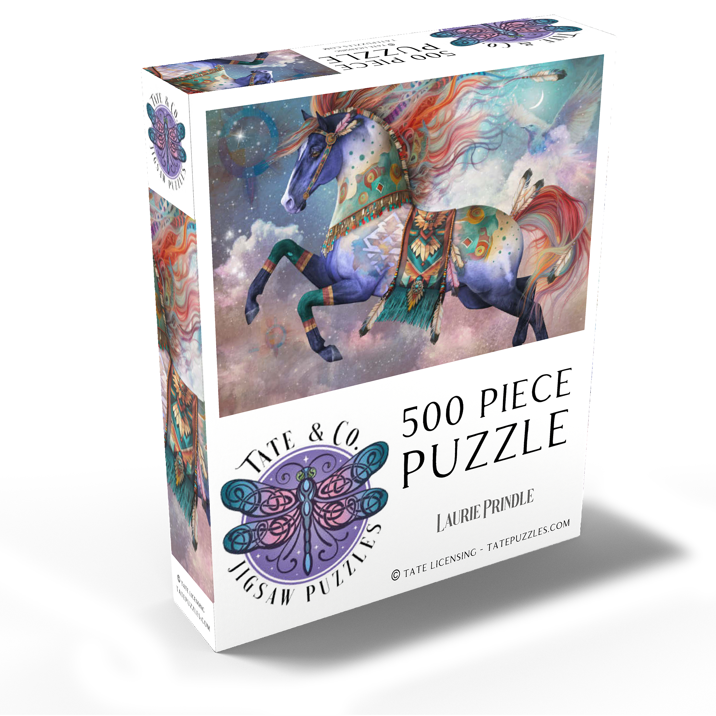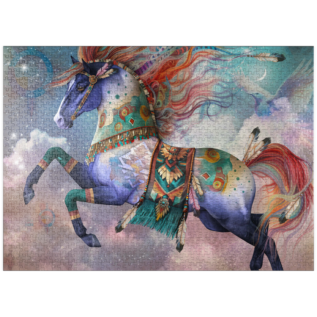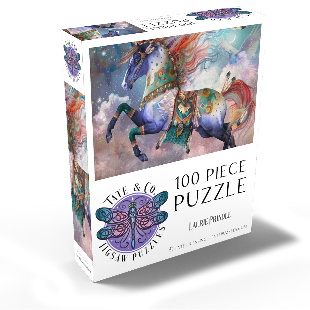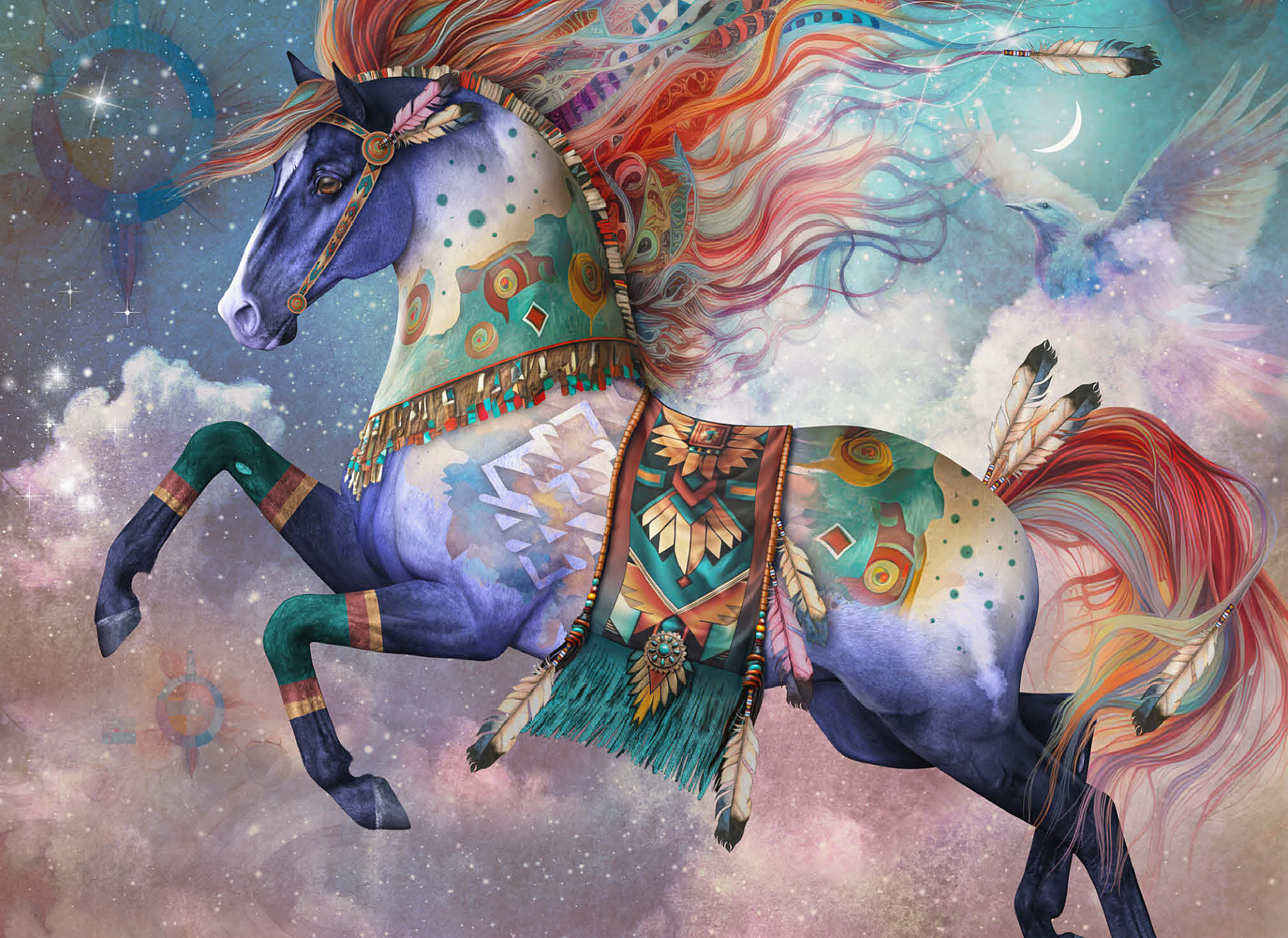 A vibrantly painted Native American war horse, its coat adorned with intricate native designs in turquoise, teal, and earth tones, with a flowing, multi-colored mane and tail in hues of orange, red, and blue, dances against a moonlit celestial sky. Elaborate native inspired tack with feathers and fringed leather enhances its mythical appearance, while in the background the crescent moon, stars, and a soaring bird spirit creates this dreamlike, mystical, and powerful native inspired artwork by Laurie Prindle.