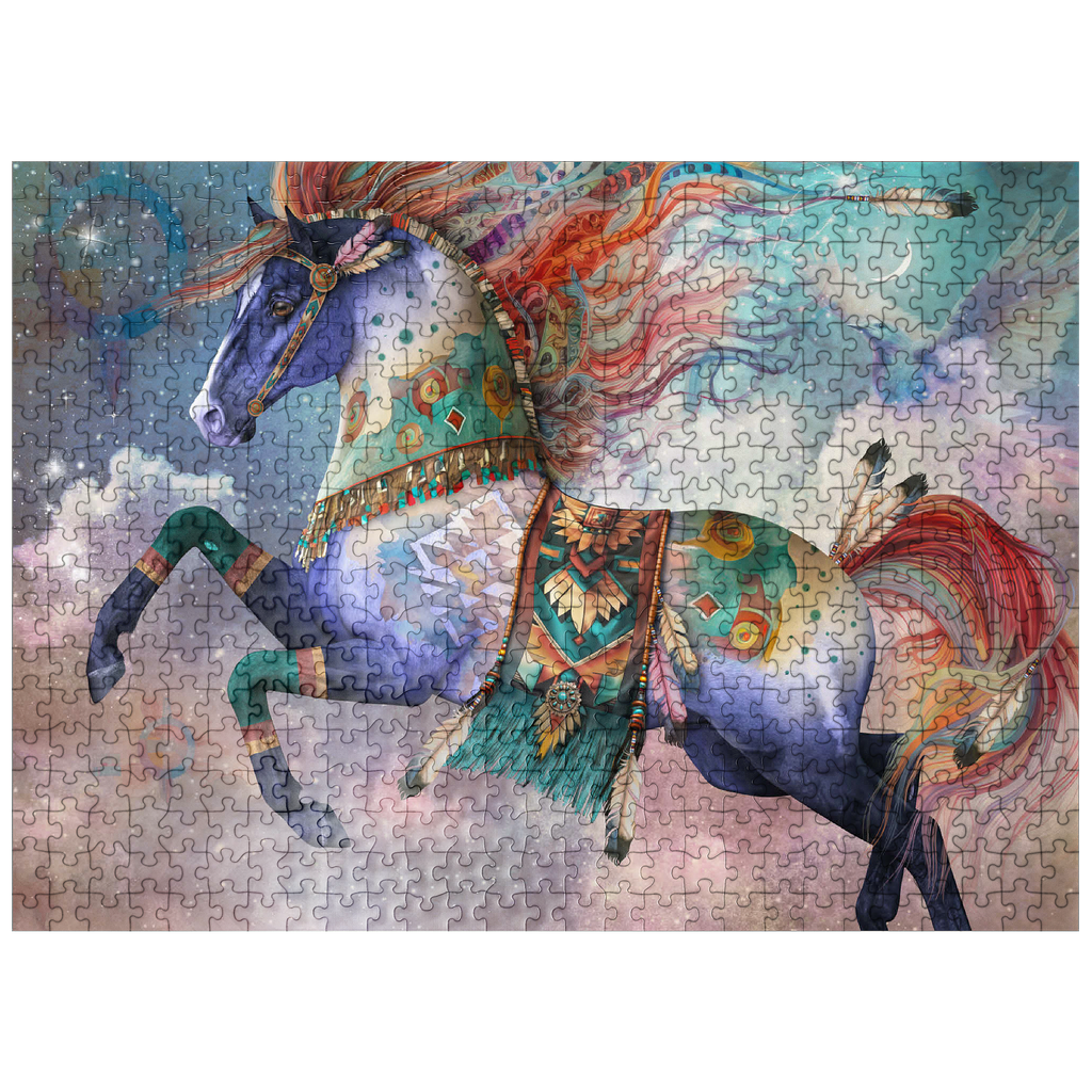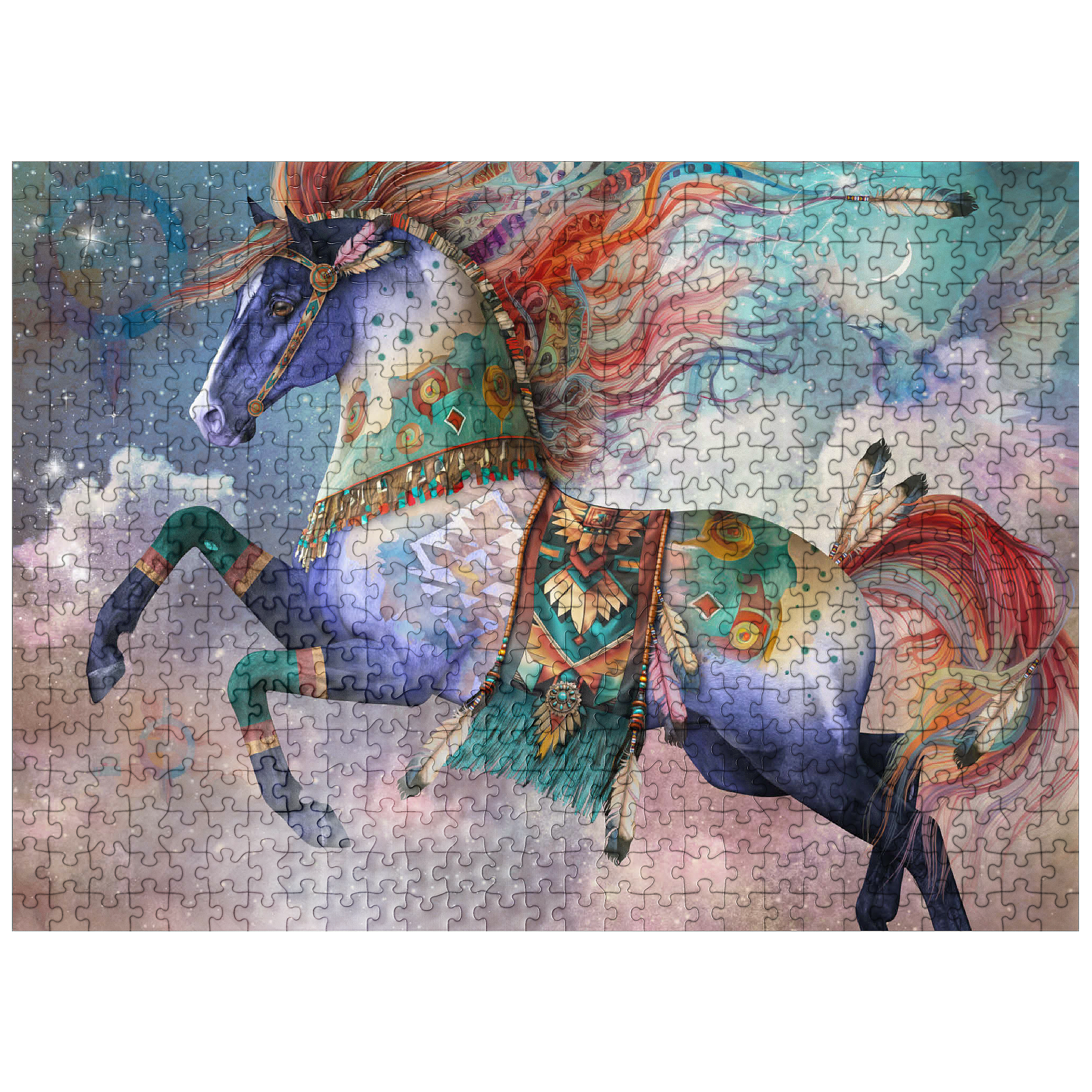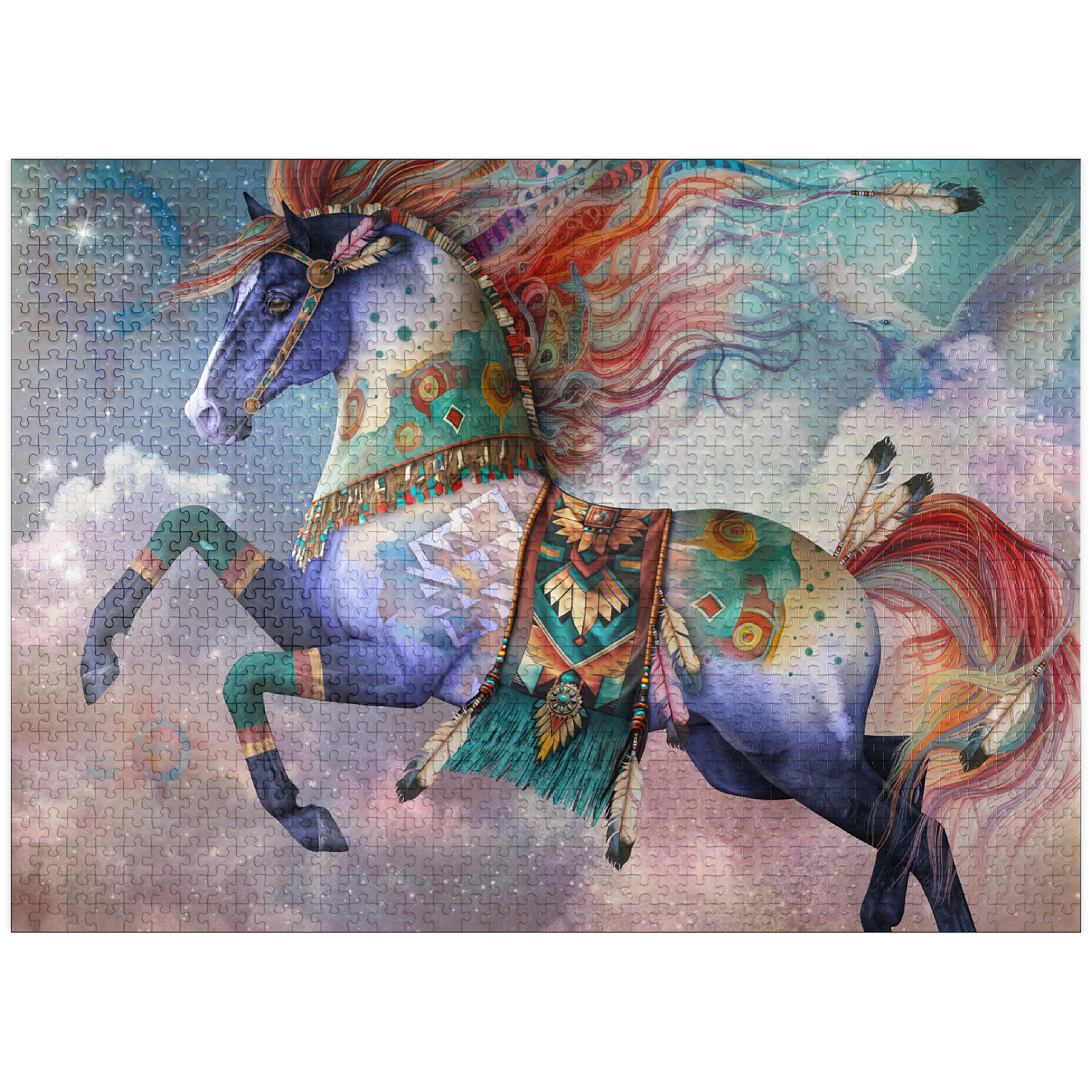 A vibrantly painted Native American war horse, its coat adorned with intricate native designs in turquoise, teal, and earth tones, with a flowing, multi-colored mane and tail in hues of orange, red, and blue, dances against a moonlit celestial sky. Elaborate native inspired tack with feathers and fringed leather enhances its mythical appearance, while in the background the crescent moon, stars, and a soaring bird spirit creates this dreamlike, mystical, and powerful native inspired artwork by Laurie Prindle.