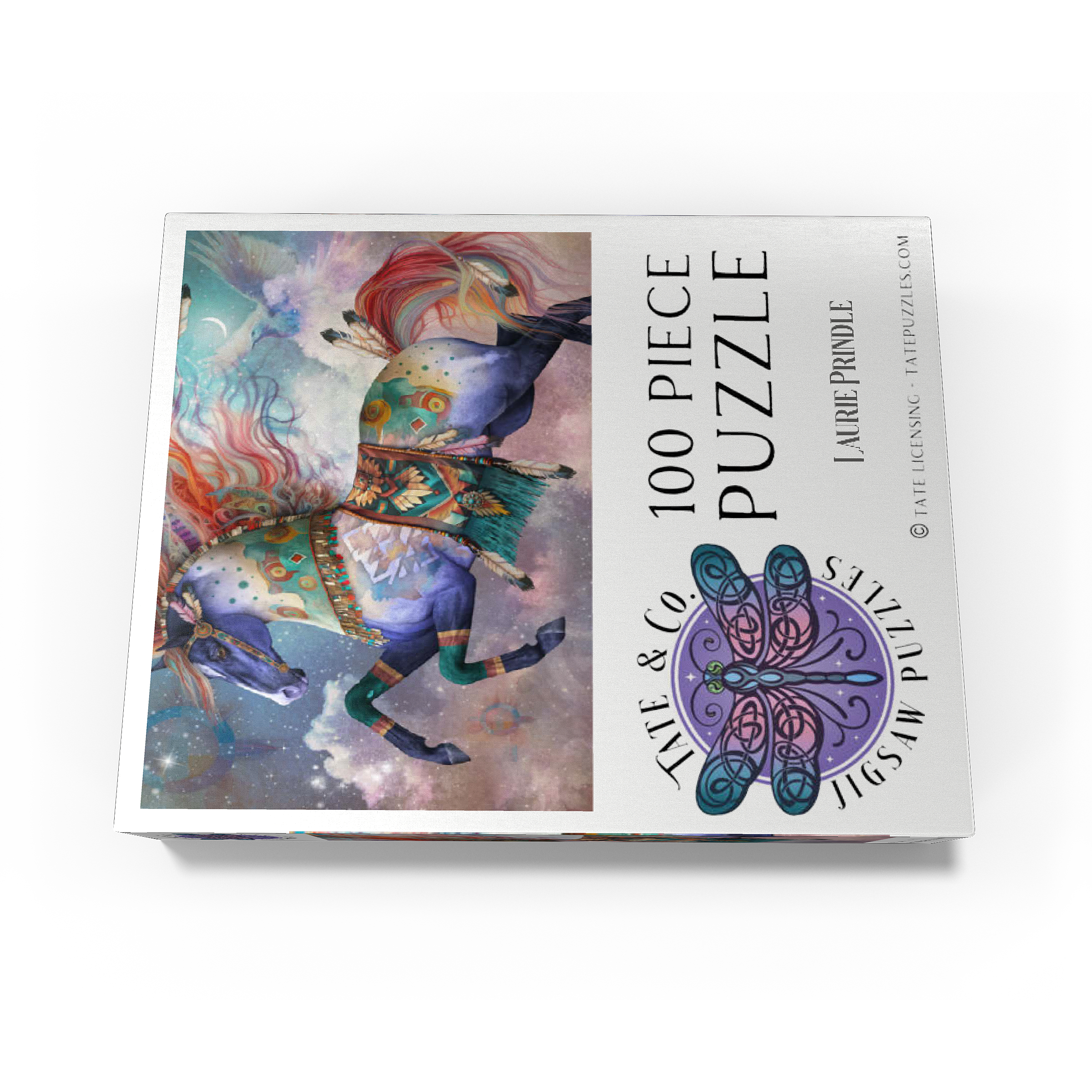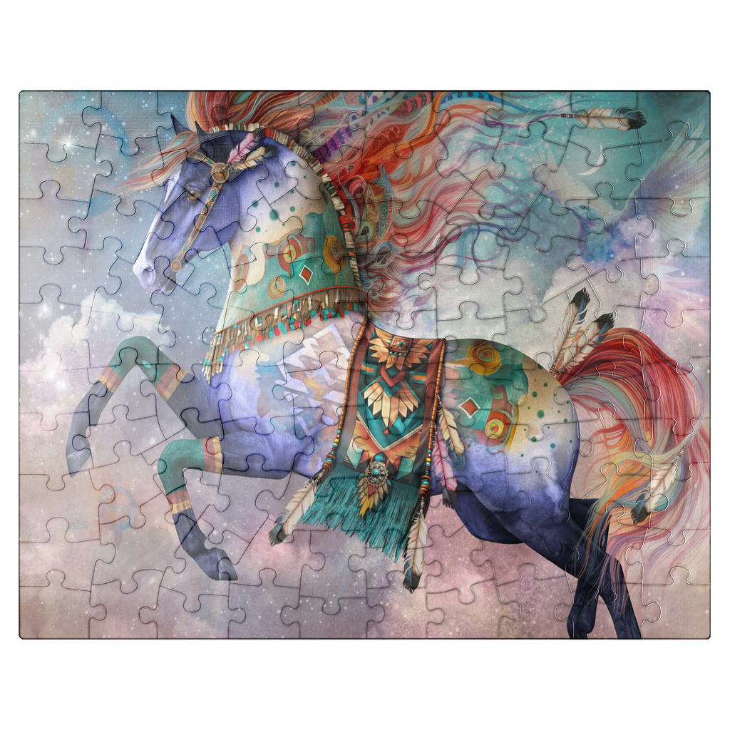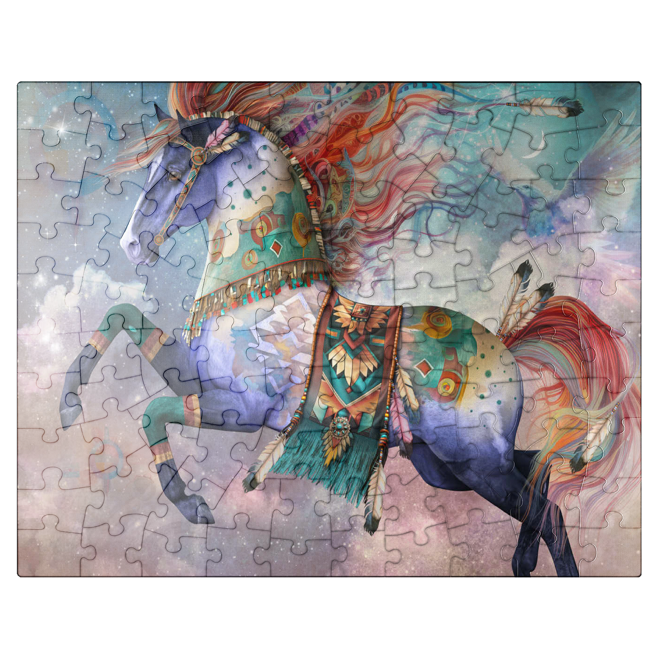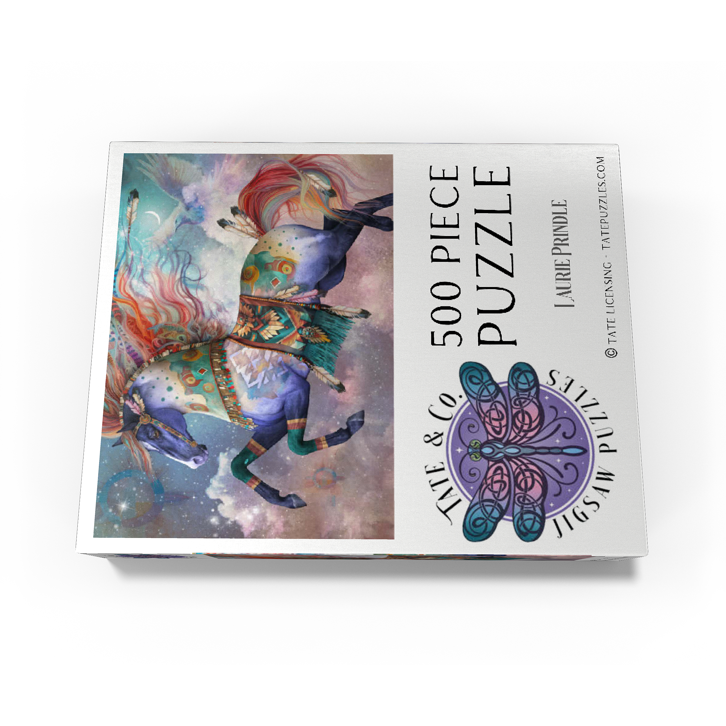 A vibrantly painted Native American war horse, its coat adorned with intricate native designs in turquoise, teal, and earth tones, with a flowing, multi-colored mane and tail in hues of orange, red, and blue, dances against a moonlit celestial sky. Elaborate native inspired tack with feathers and fringed leather enhances its mythical appearance, while in the background the crescent moon, stars, and a soaring bird spirit creates this dreamlike, mystical, and powerful native inspired artwork by Laurie Prindle.