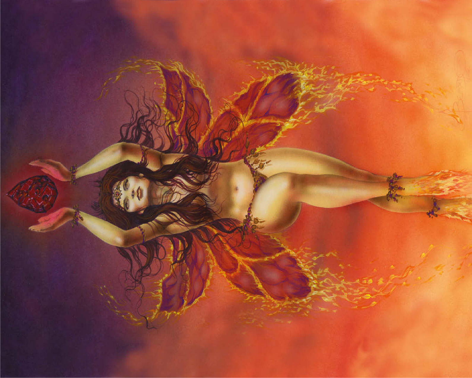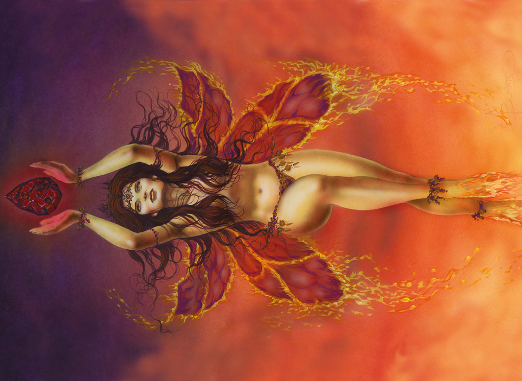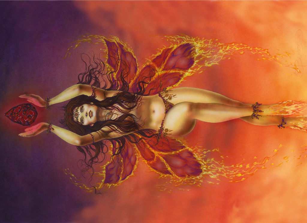 The fire fairy uses the element of fire to protect and defend nature and all things fey. She brings light and warmth to the forest and realm of the fae. She channels her power through the garnet crystal.
