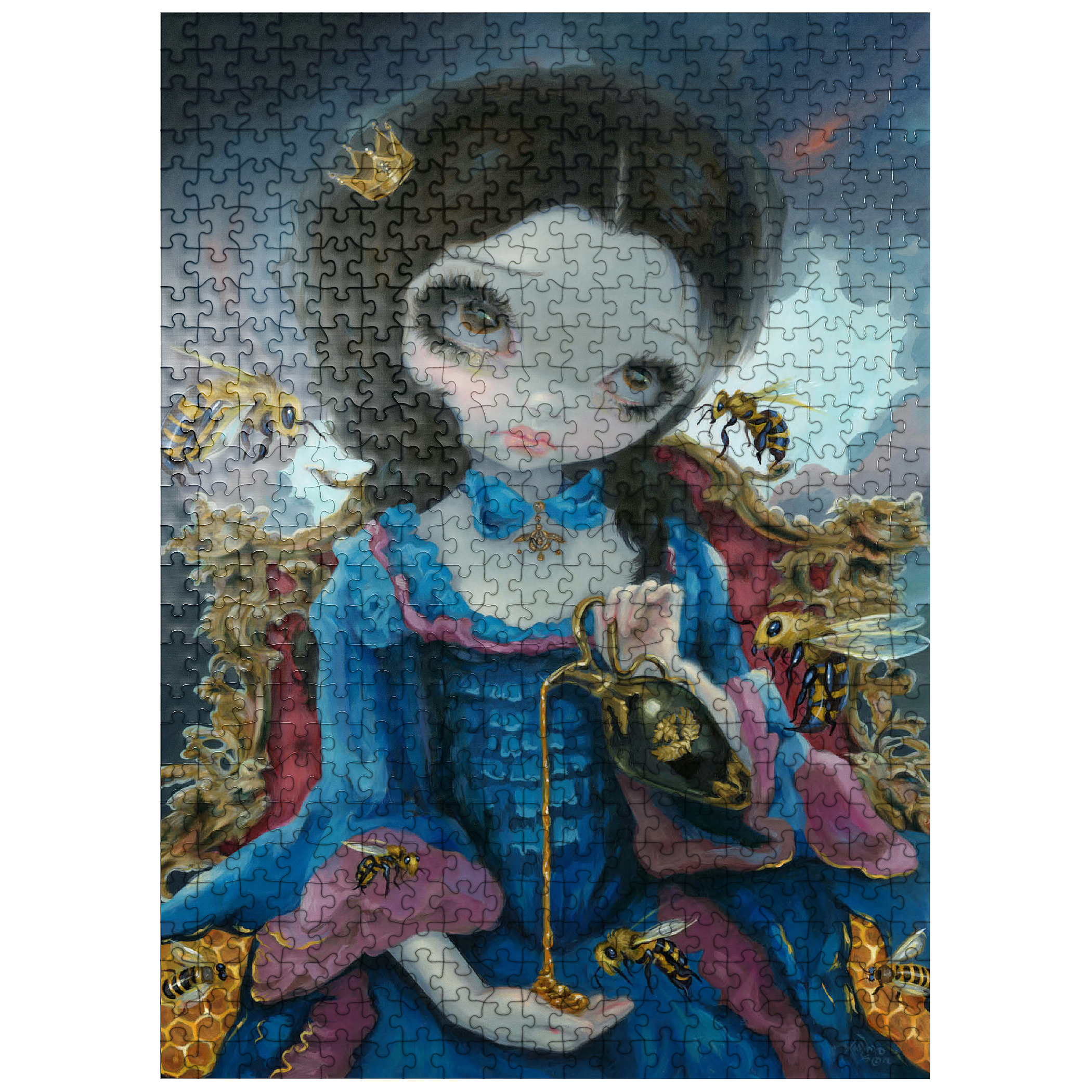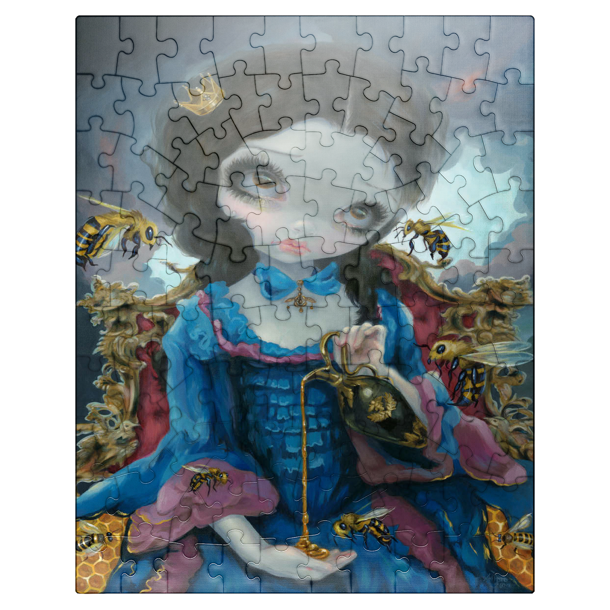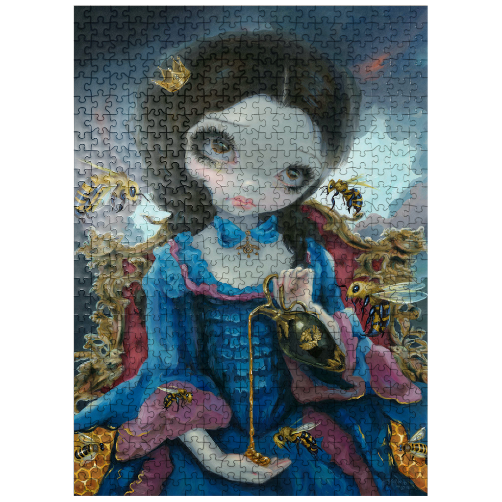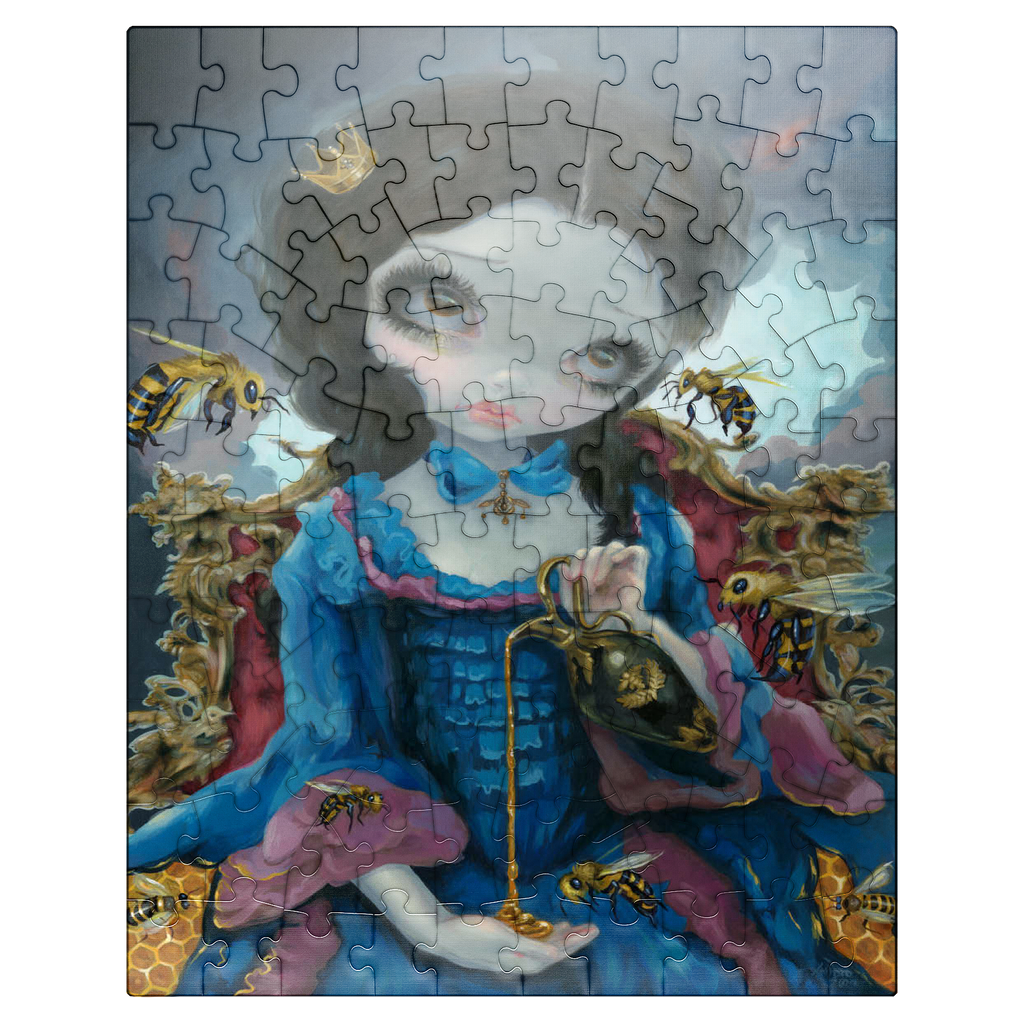 Unpuzzle the regal -Queen of Bees-! Assemble a stunning Rococo portrait of a queen surrounded by intricate bee details. Discover historical references, including a Minoan bee pendant and Napoleon's -Bee with Laurels.- Piece together this elegant and symbolic puzzle!