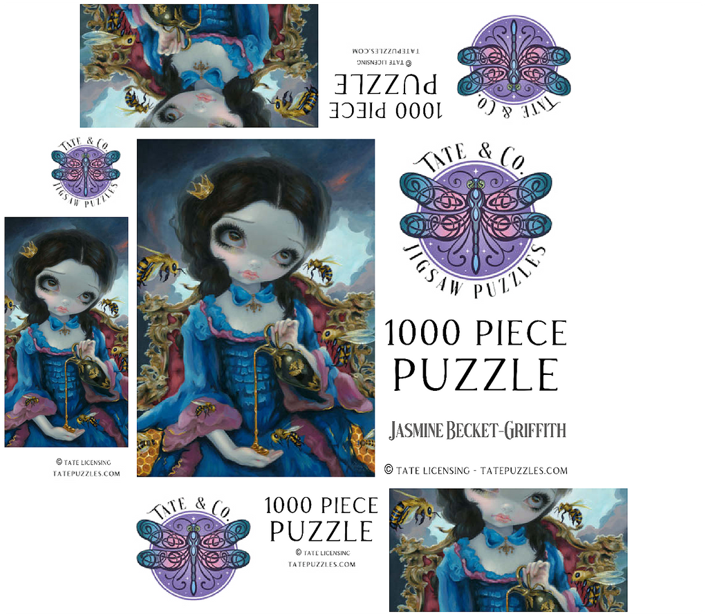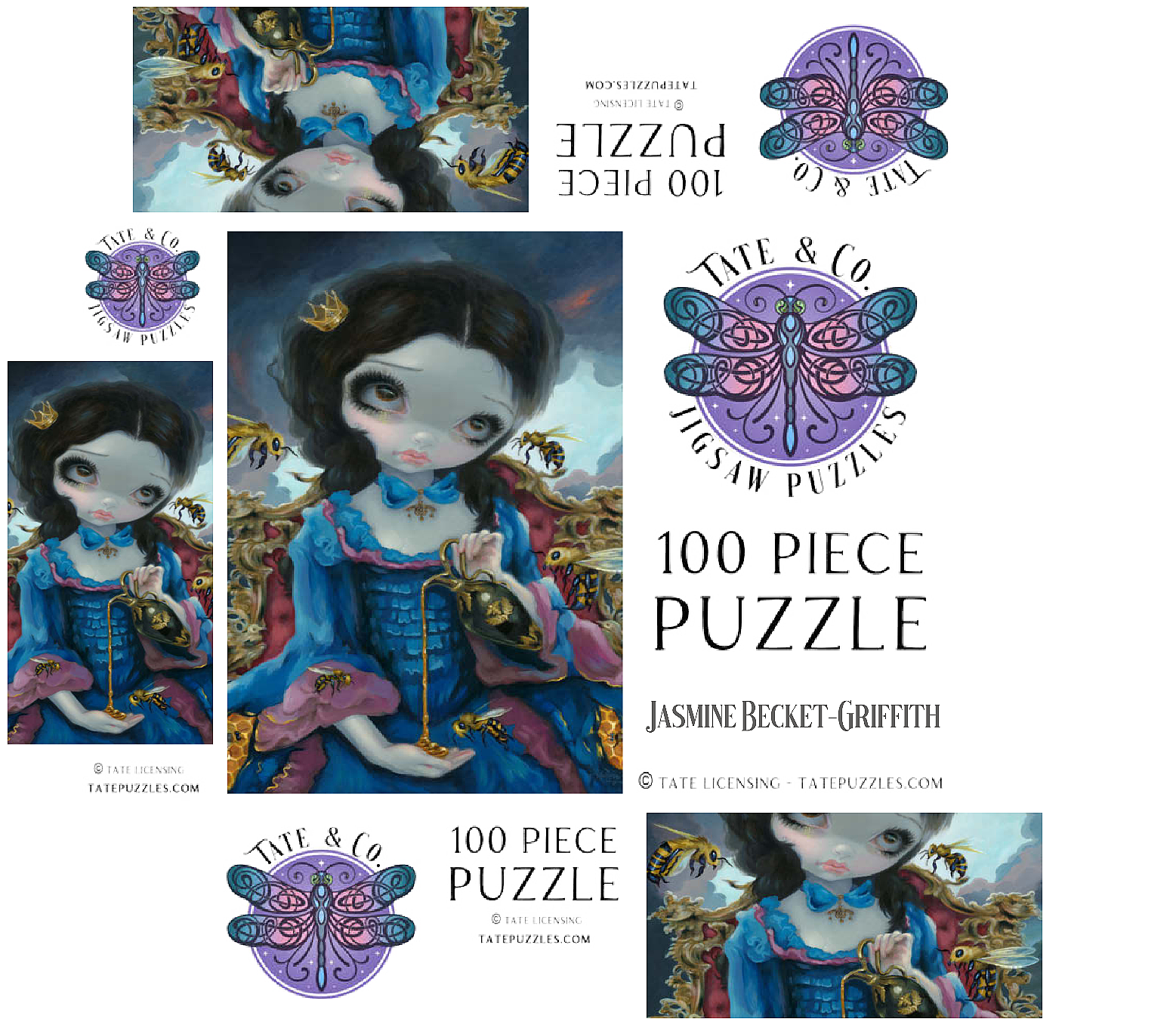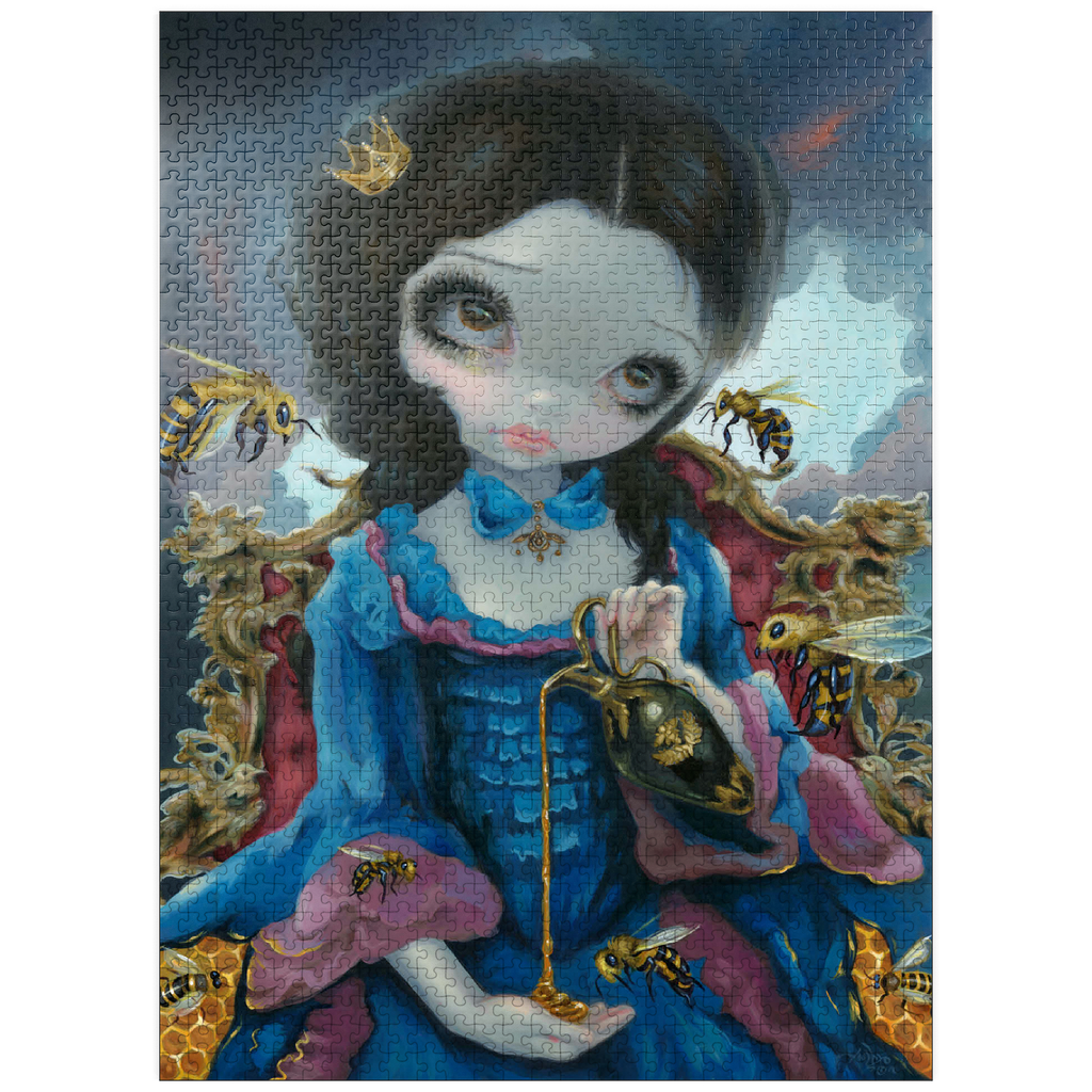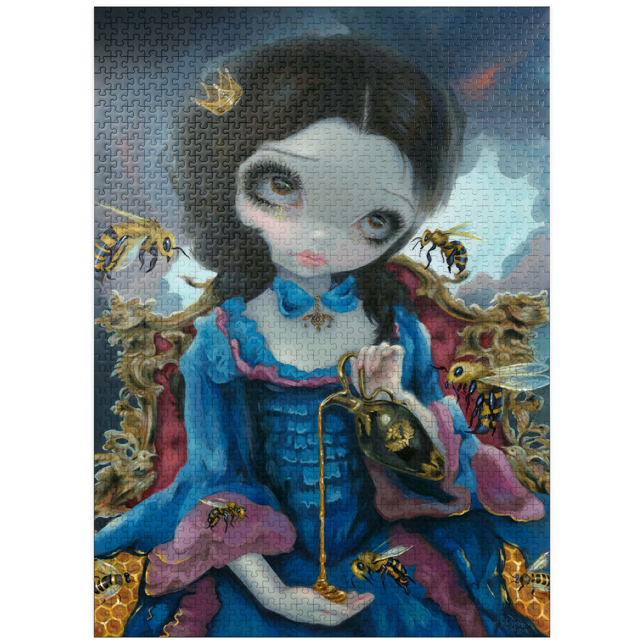 Unpuzzle the regal -Queen of Bees-! Assemble a stunning Rococo portrait of a queen surrounded by intricate bee details. Discover historical references, including a Minoan bee pendant and Napoleon's -Bee with Laurels.- Piece together this elegant and symbolic puzzle!