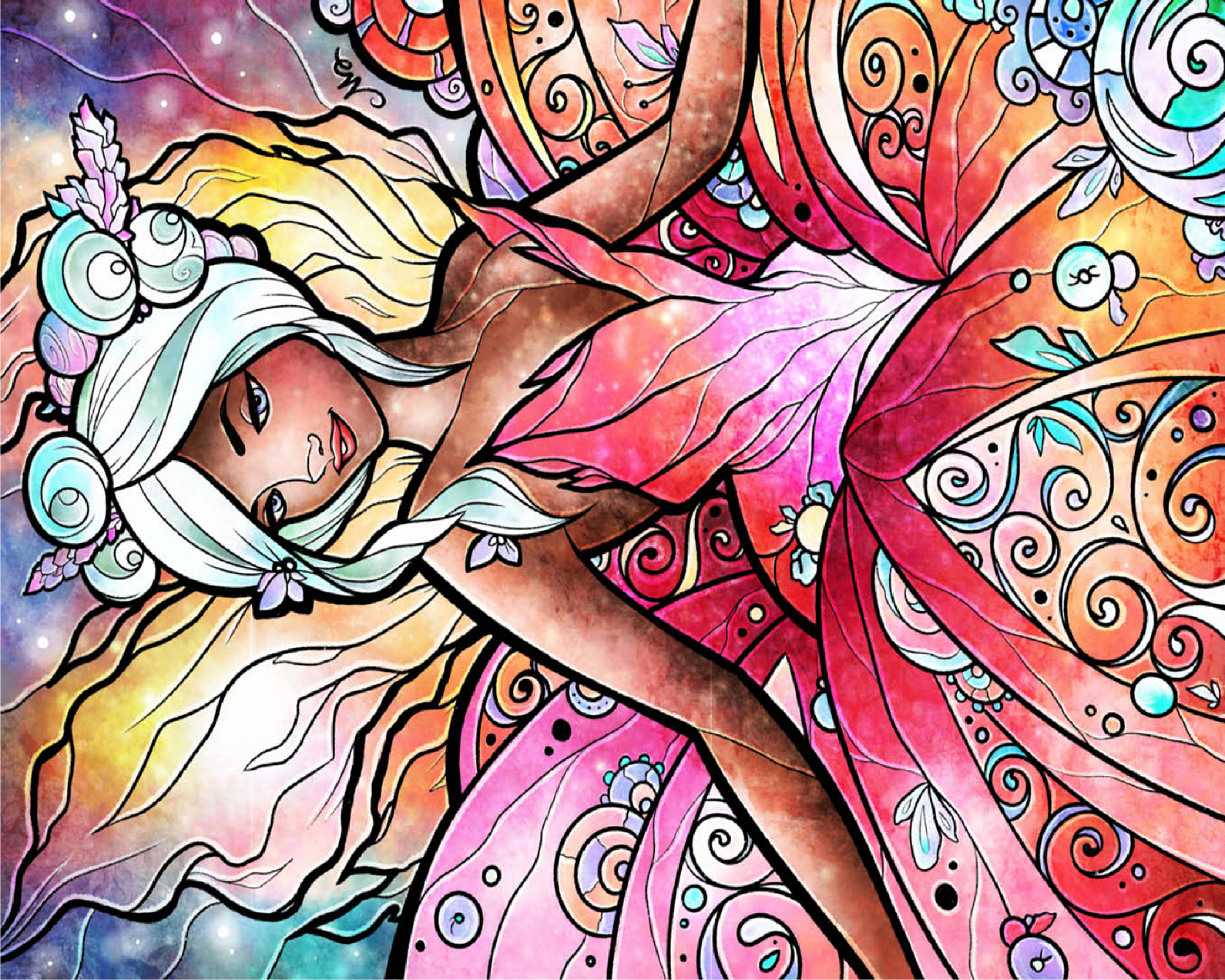 "Like panes of colored glass filtering sunlight, Mandie Manzano’s work seems fit for a Monastery or faraway castle. Gentle maidens and lush environments fill each scene, crafting a story and enchanting the eyes. Manzano builds her compositions with light as her primary medium. Rays break through, colors gradate, and warmth permeates throughout. Each is a luminous patchwork of vibrant blocks, connected by bold tendrils and patterned stripes. Capturing an ineffable beauty, Manzano’s work reminds us that our full brilliance is revealed only when our own light from within shines through."