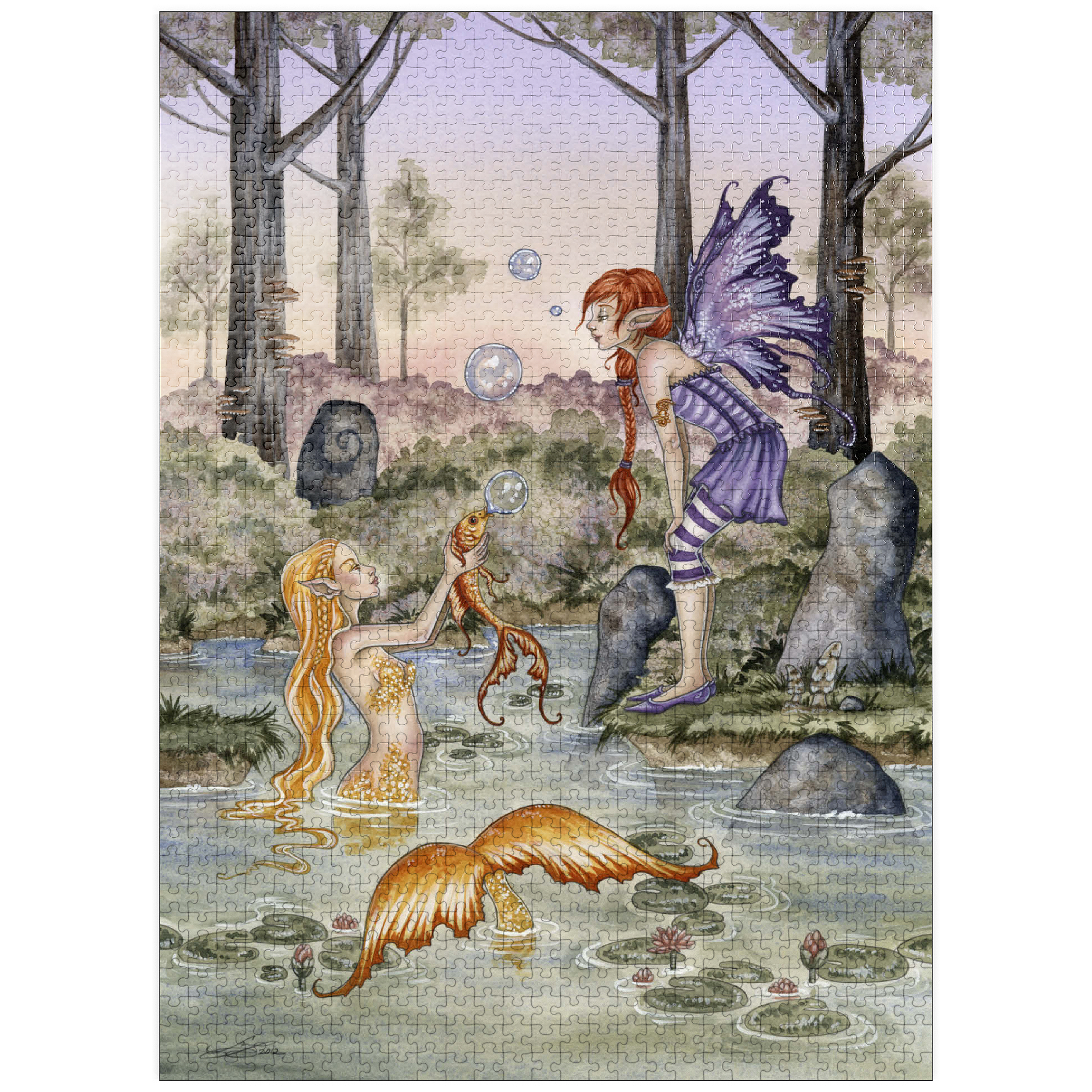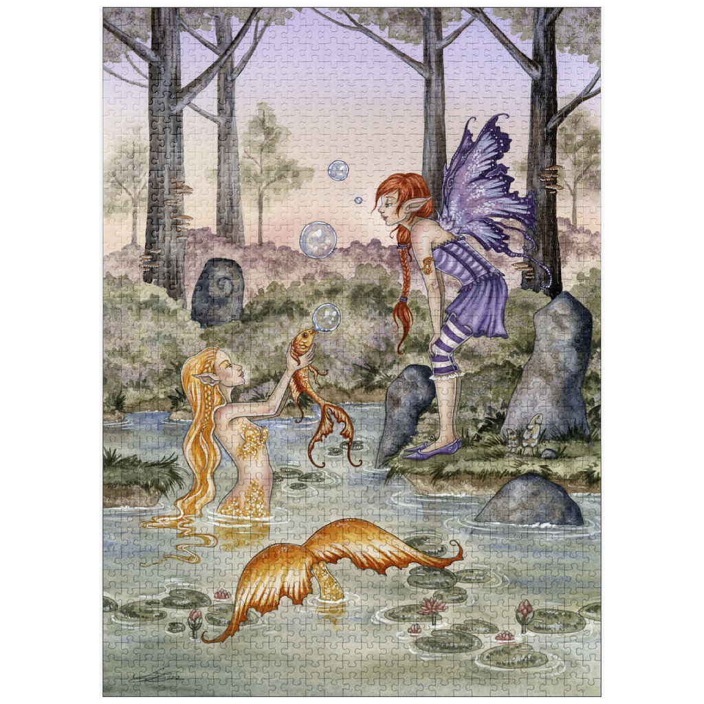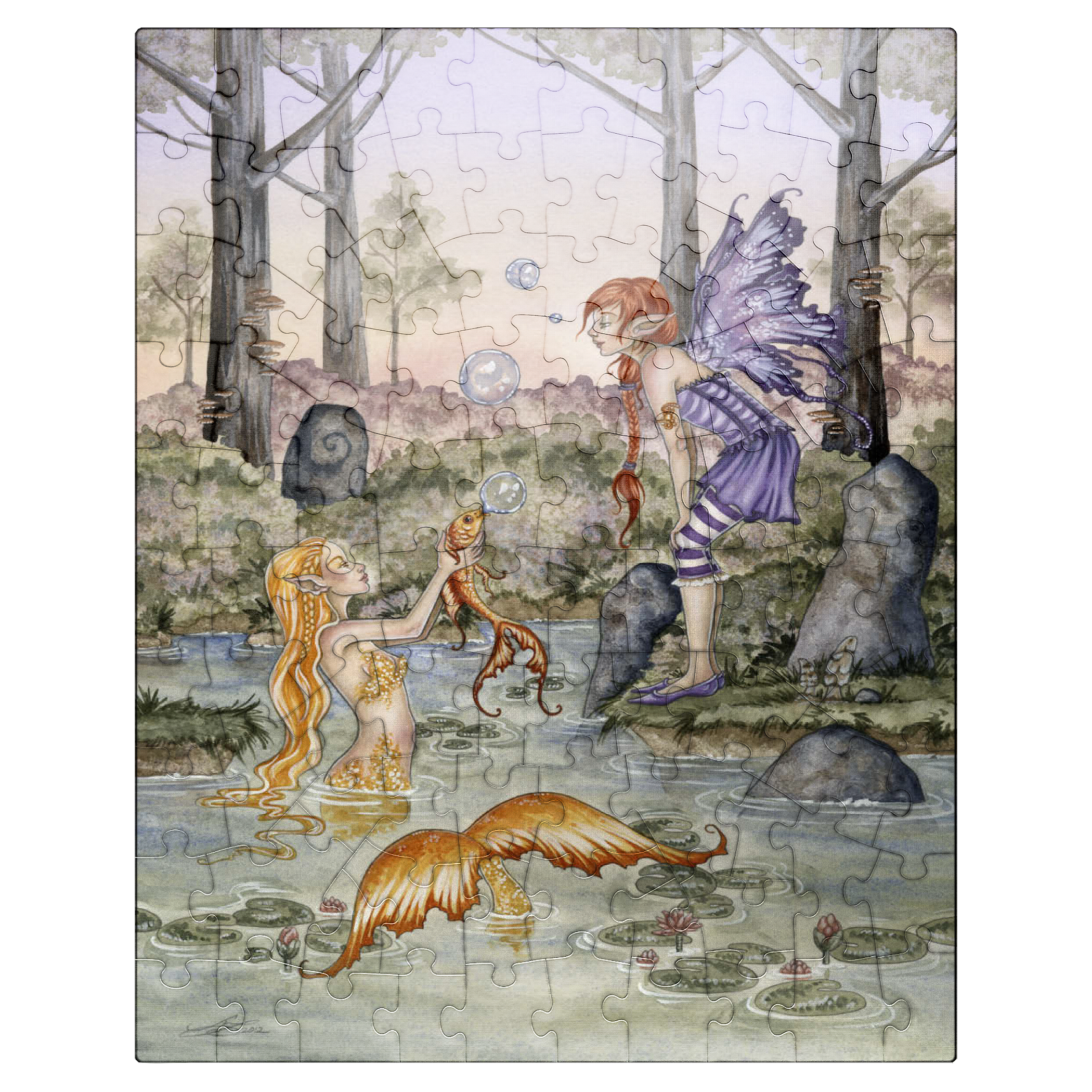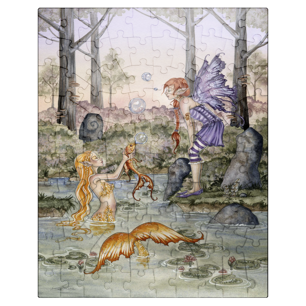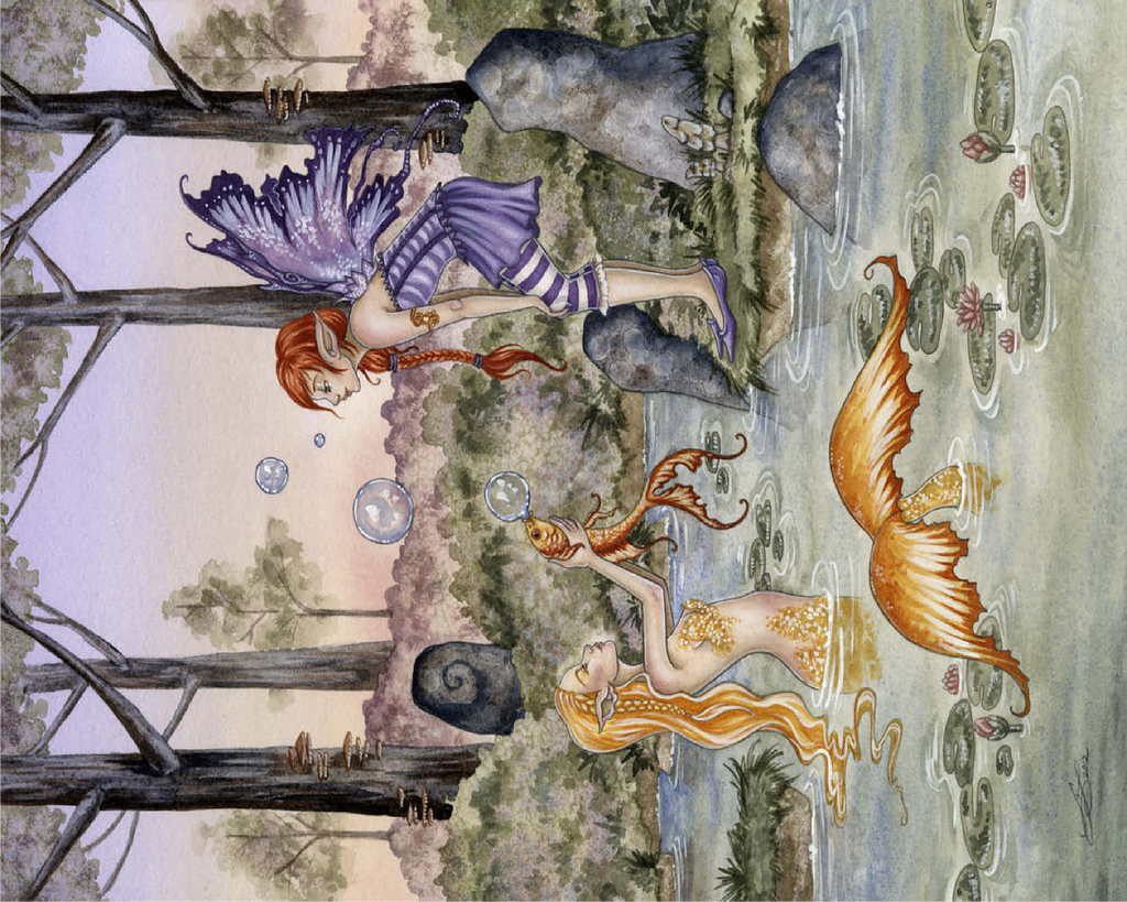 In The Wishing Fish, a golden mermaid offers a magical fish to a curious fairy perched at the forest's edge, their eyes meeting over shimmering water and floating bubbles. The scene glows with playful wonder, capturing a moment where whimsy and wish-making ripple through an enchanted glade.