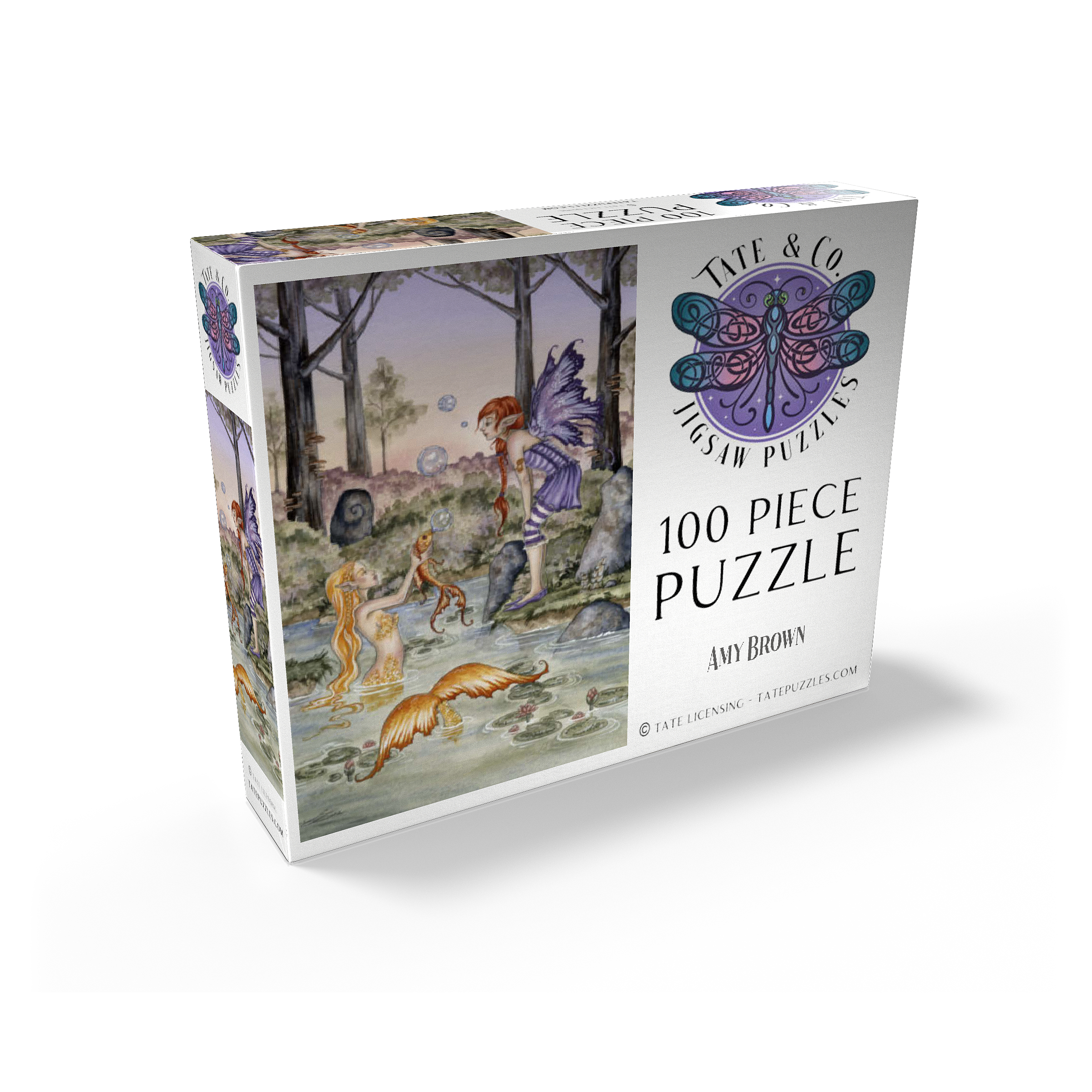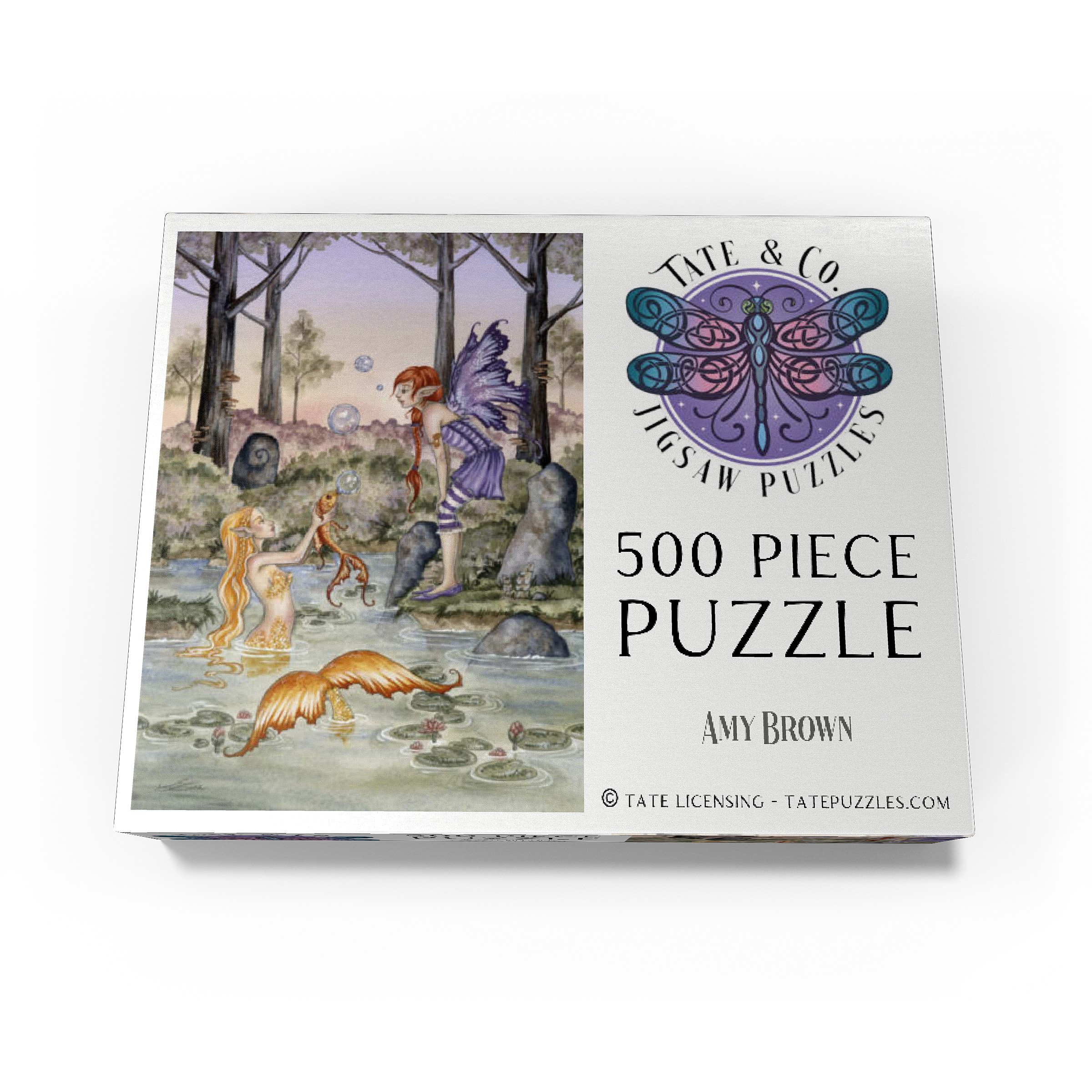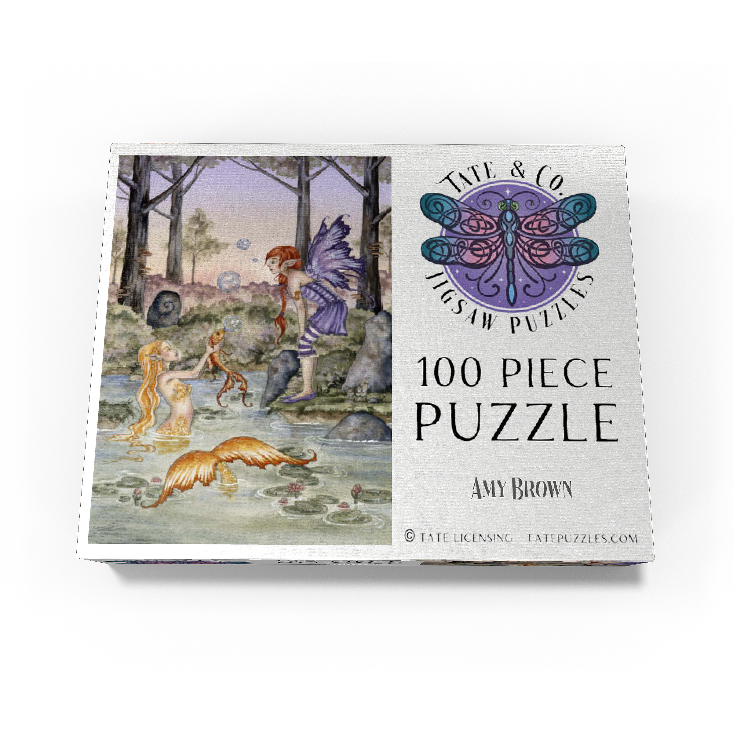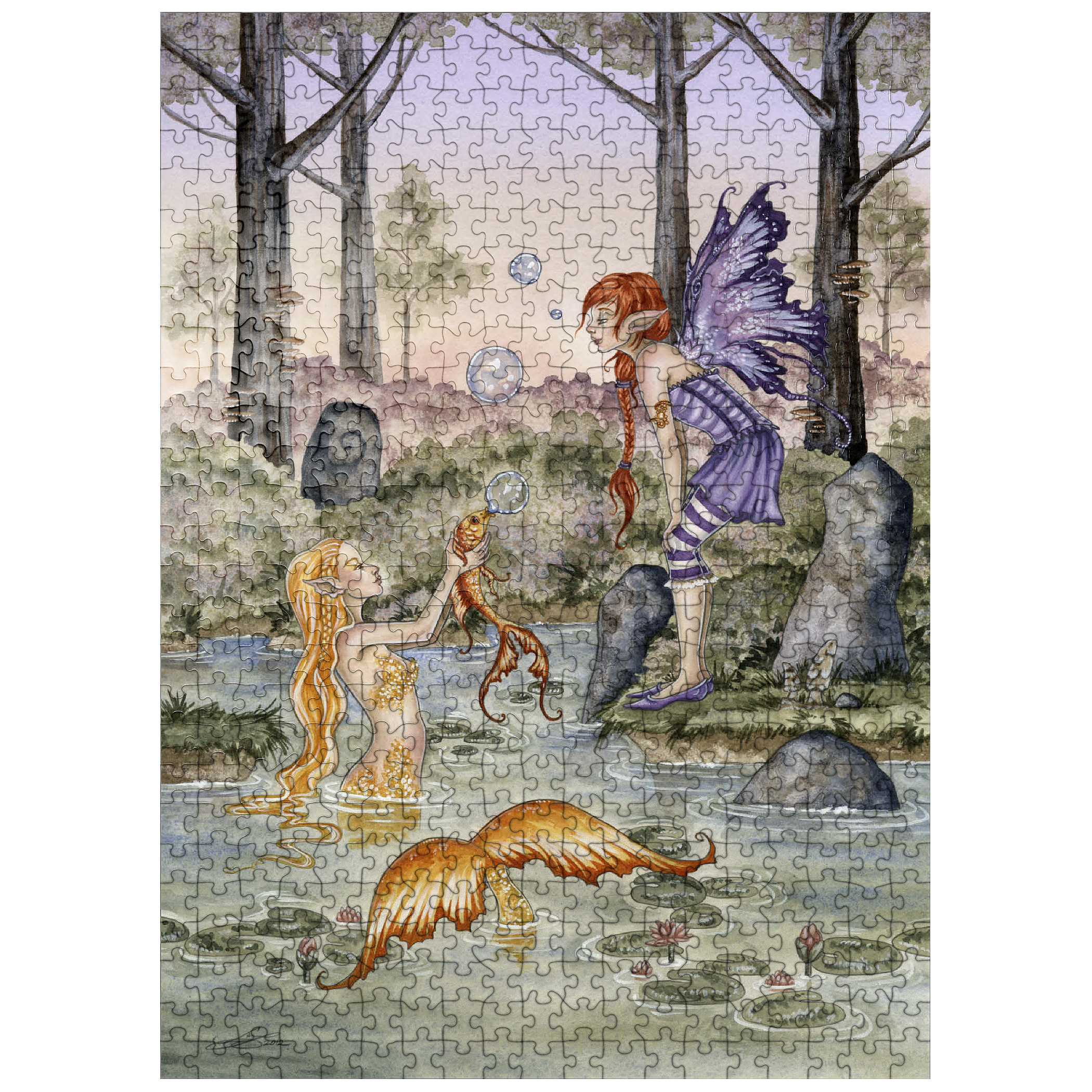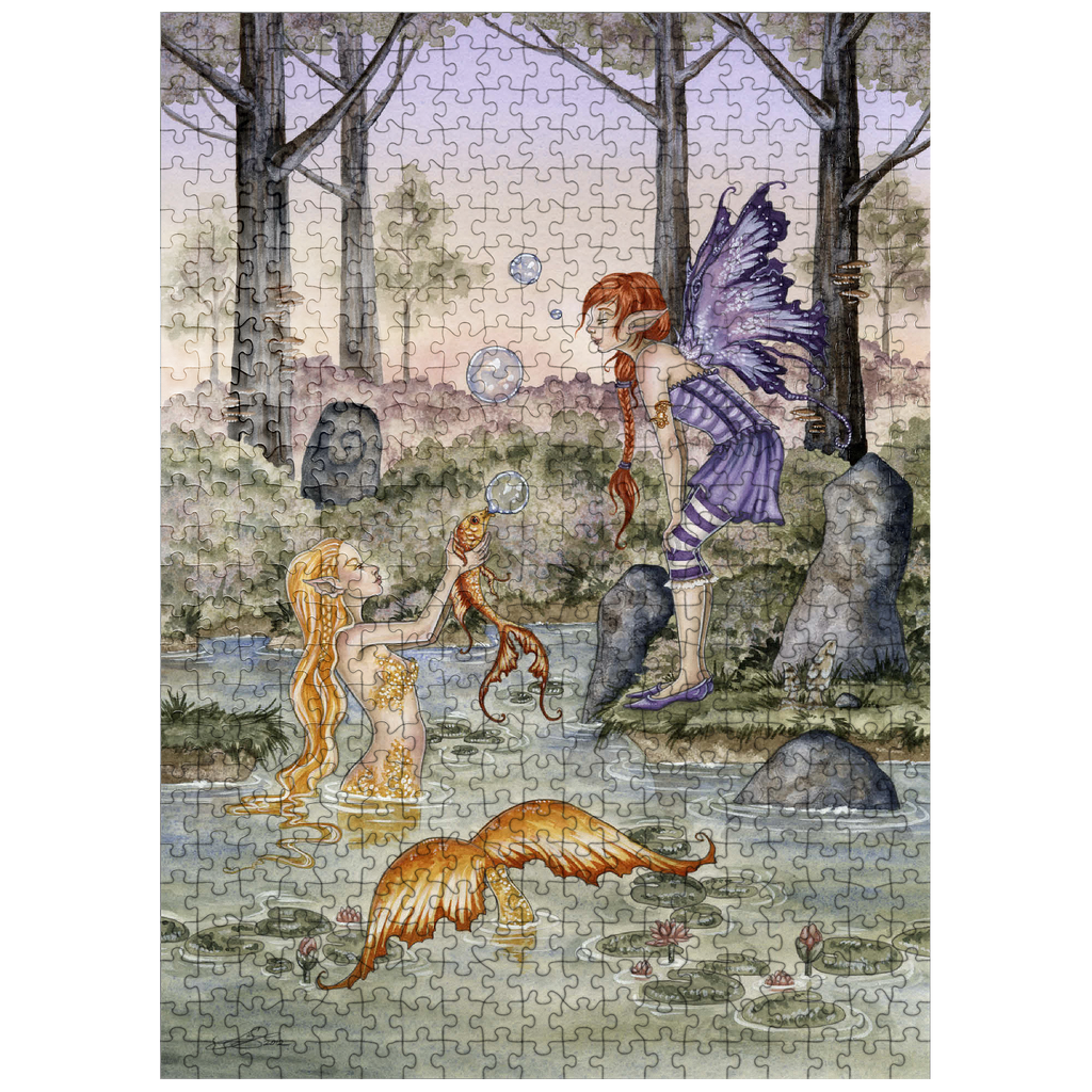 In The Wishing Fish, a golden mermaid offers a magical fish to a curious fairy perched at the forest's edge, their eyes meeting over shimmering water and floating bubbles. The scene glows with playful wonder, capturing a moment where whimsy and wish-making ripple through an enchanted glade.
