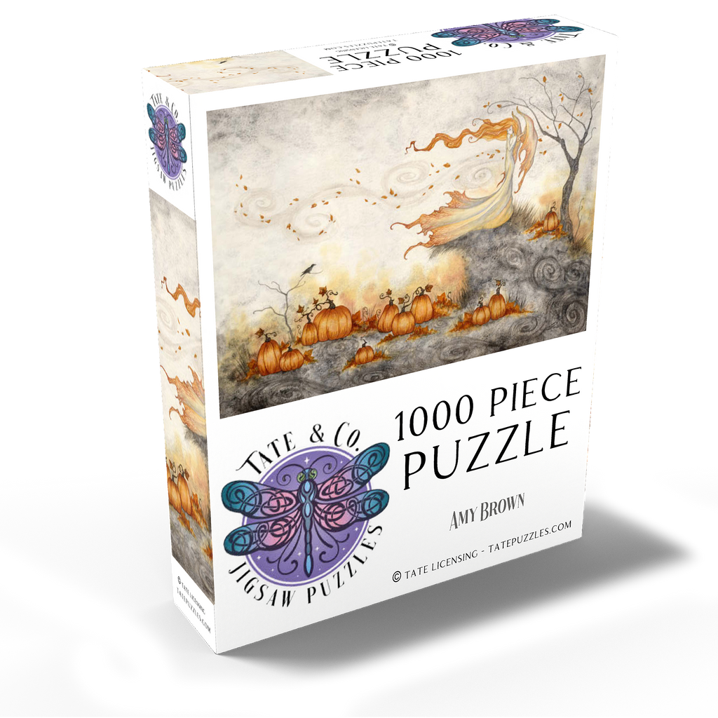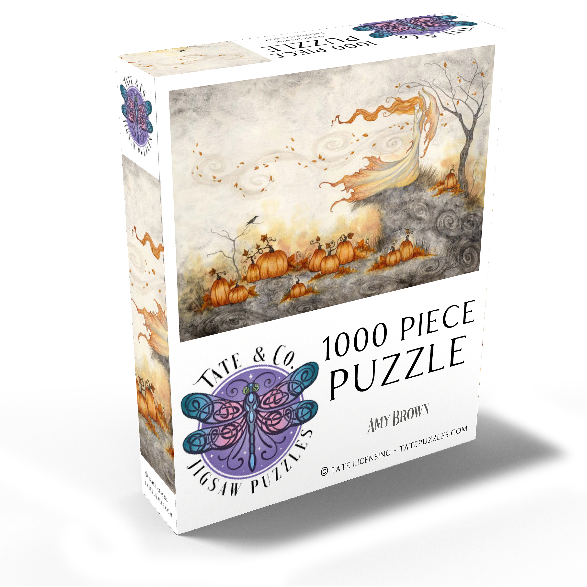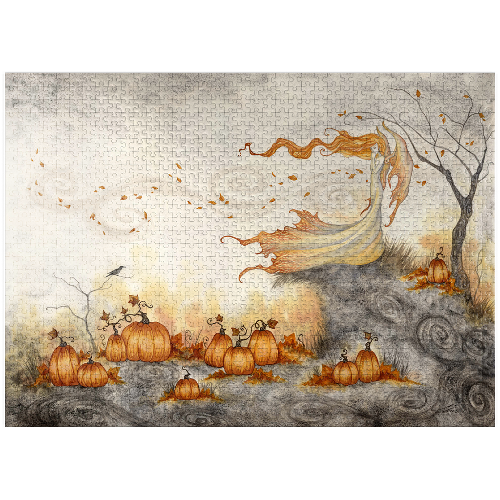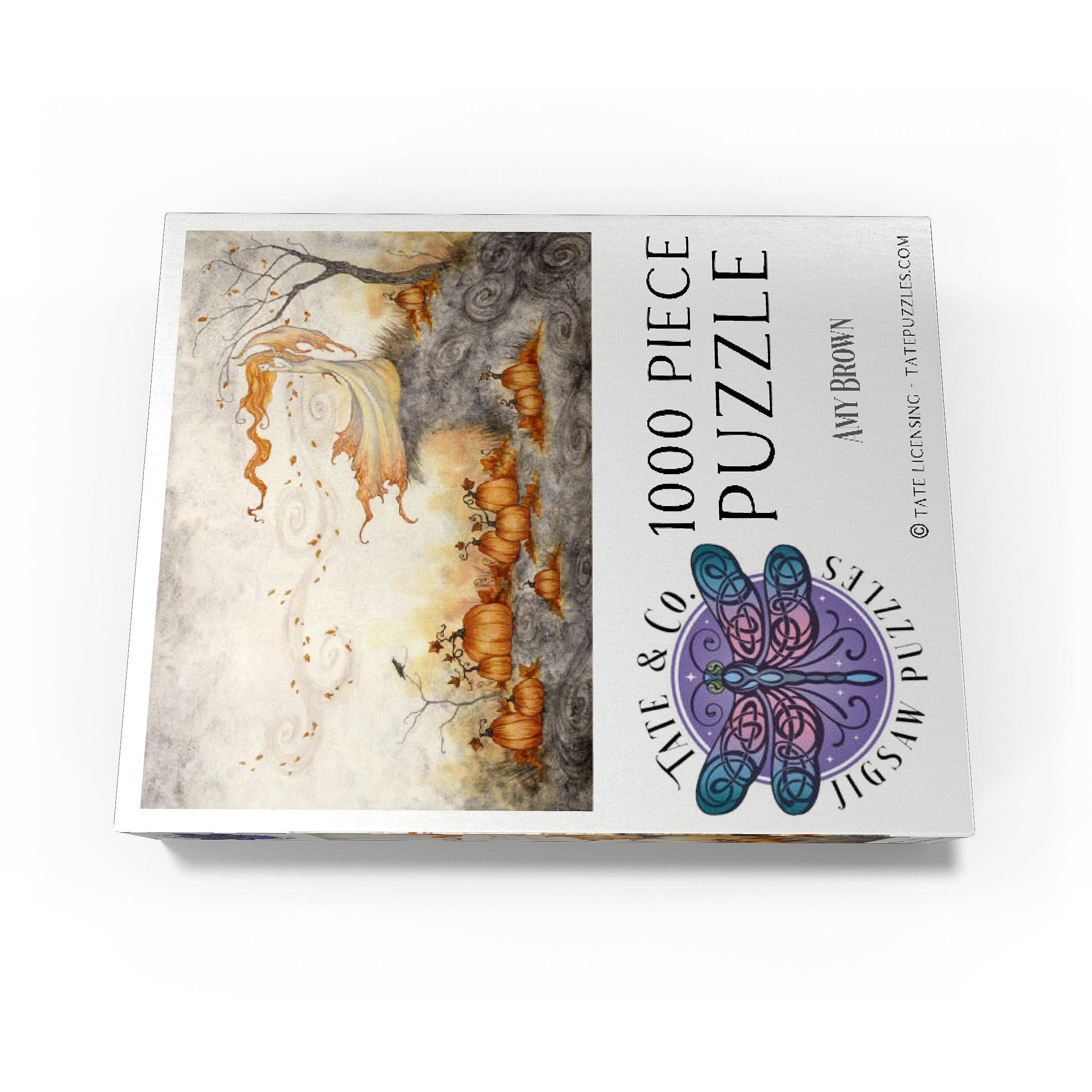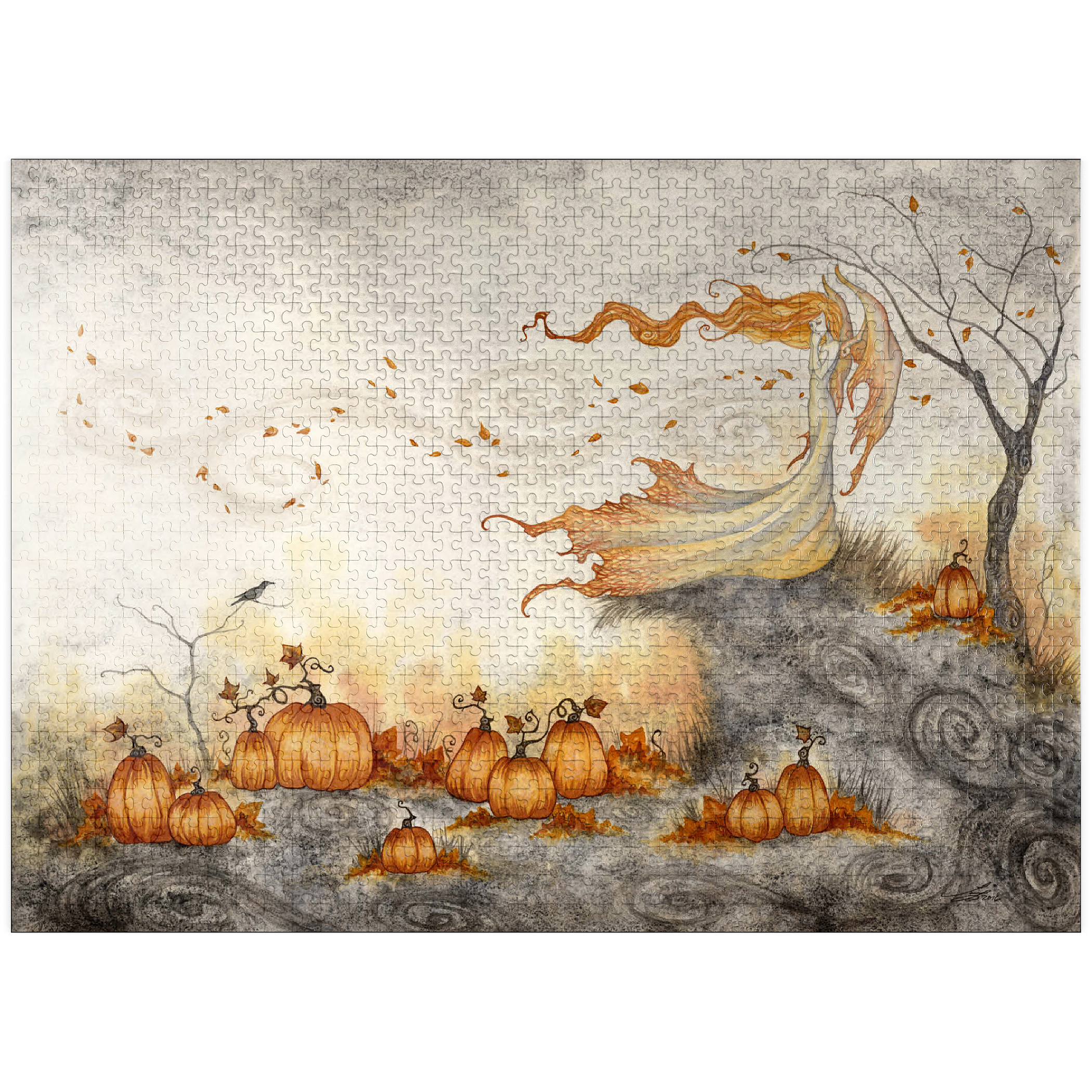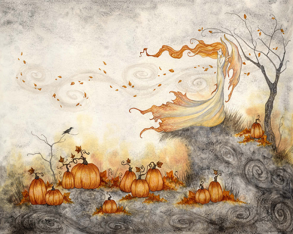 A graceful faery in a flowing gown stands on a windswept hill, her long hair and wings trailing like fire as autumn leaves swirl around her. Whispers in the Pumpkin Patch captures a moment of still magic as she listens to secrets carried by the breeze above a glowing field of pumpkins.