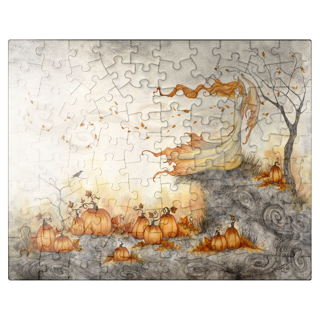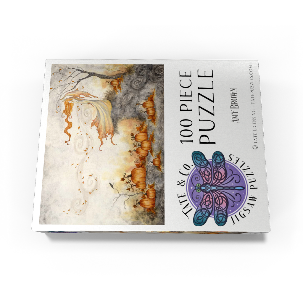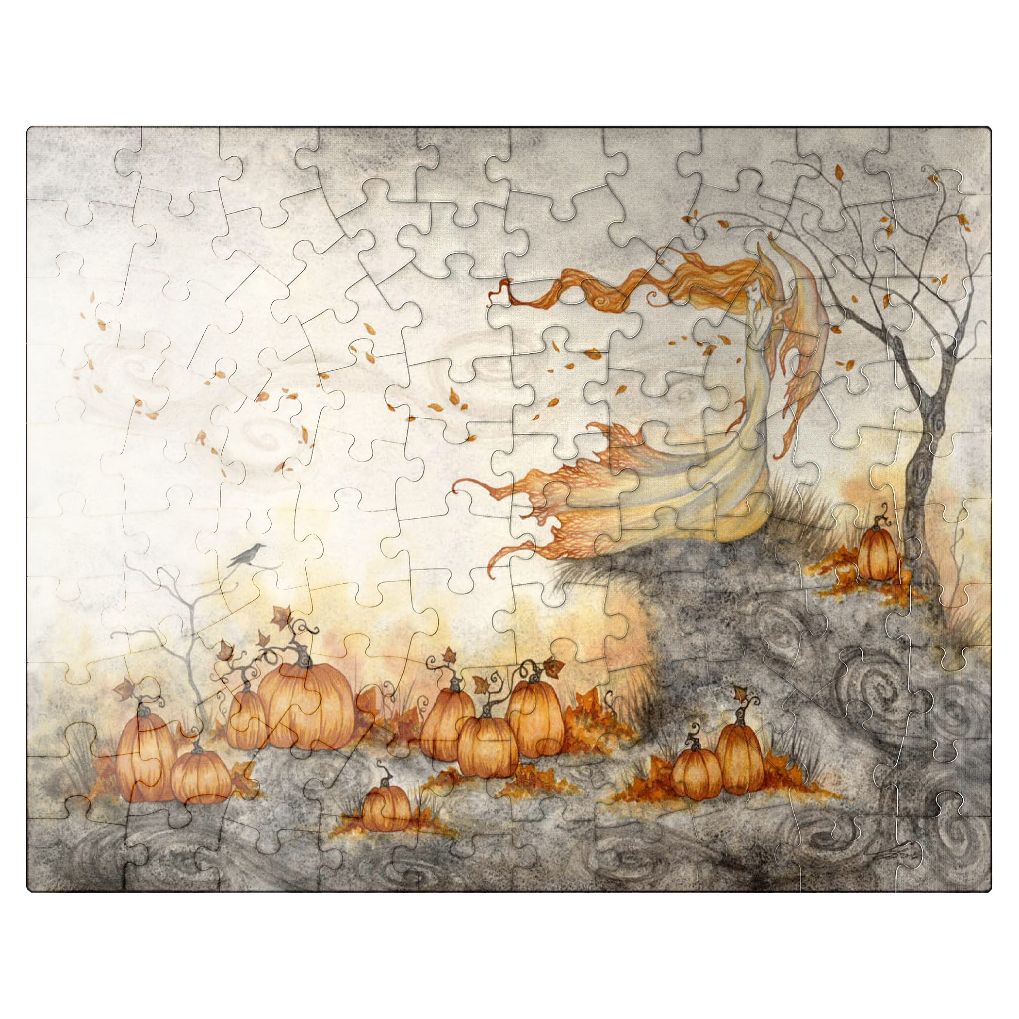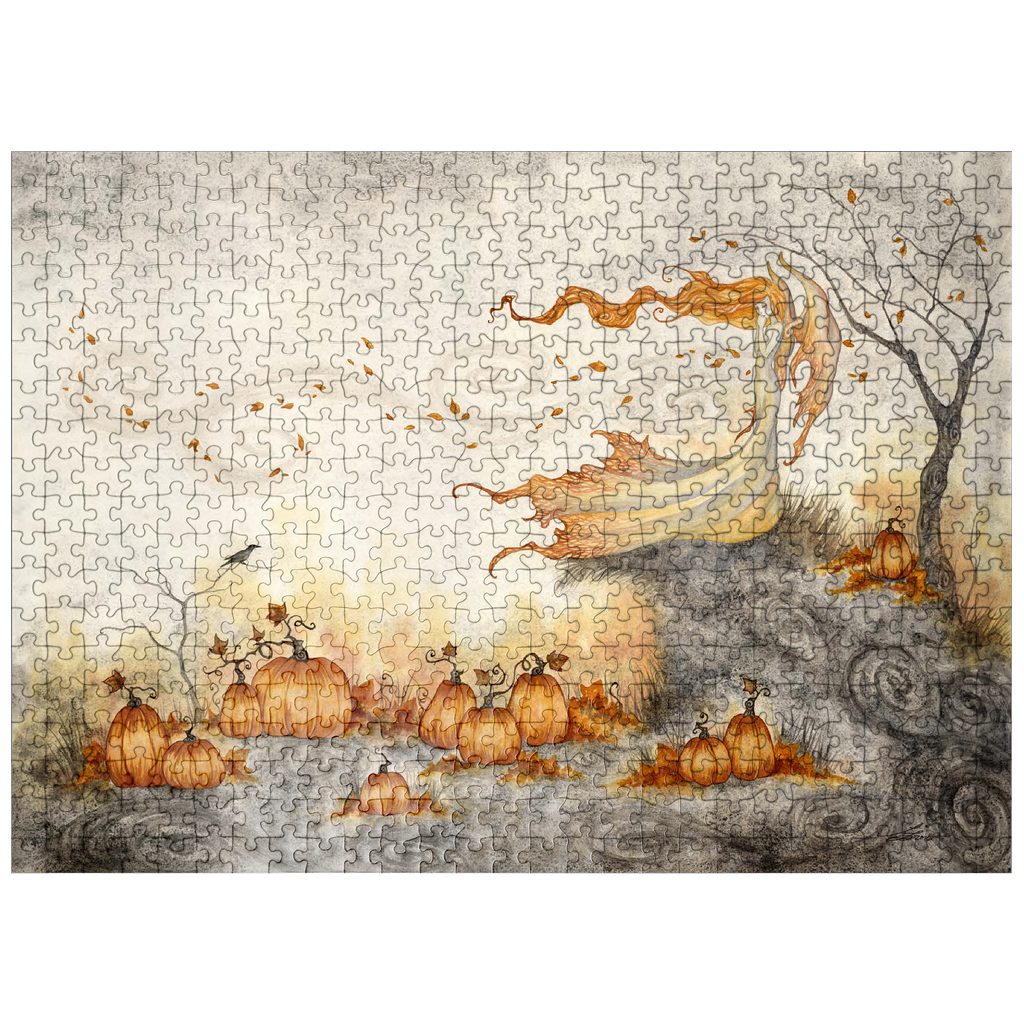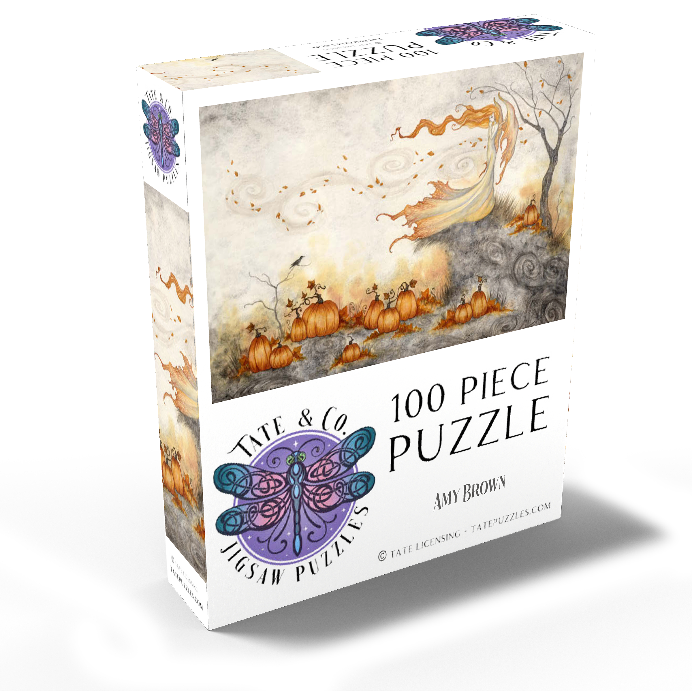 A graceful faery in a flowing gown stands on a windswept hill, her long hair and wings trailing like fire as autumn leaves swirl around her. Whispers in the Pumpkin Patch captures a moment of still magic as she listens to secrets carried by the breeze above a glowing field of pumpkins.