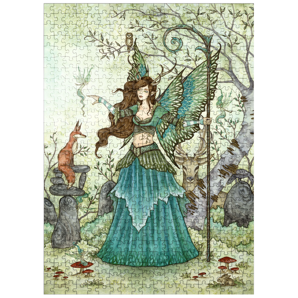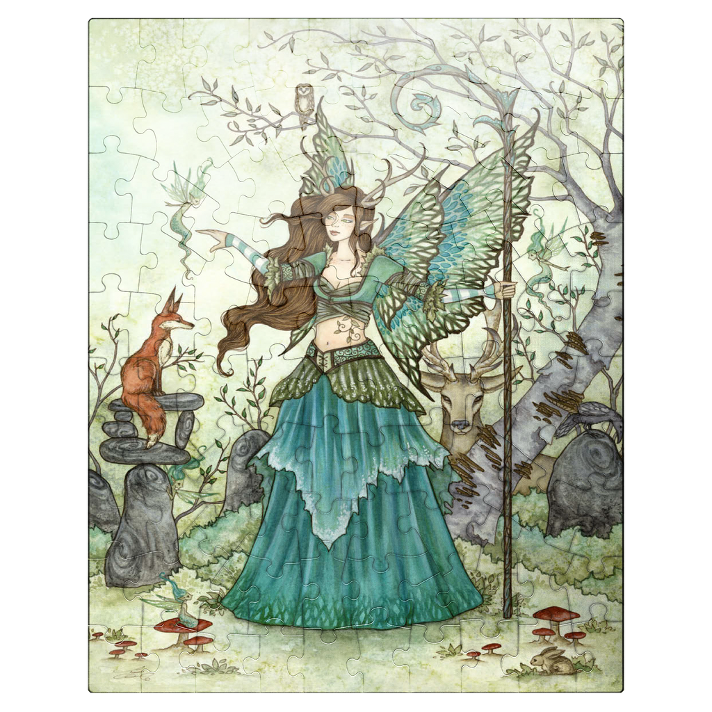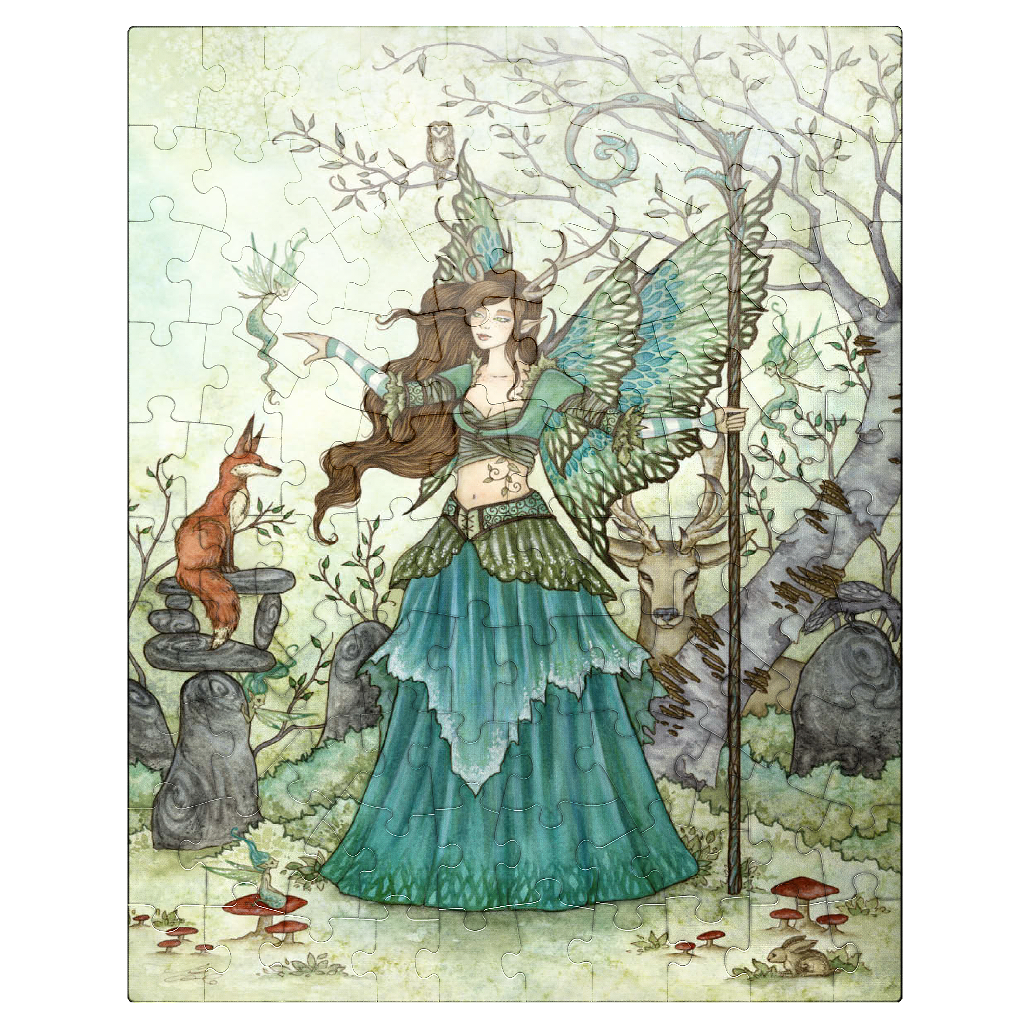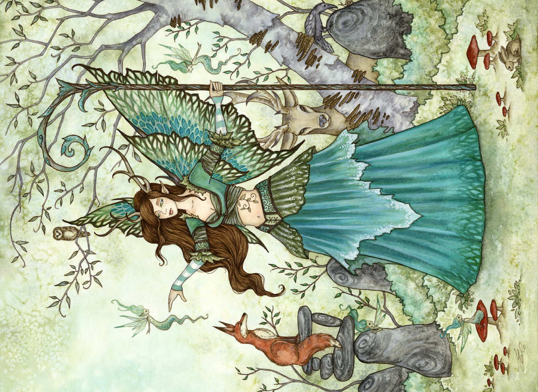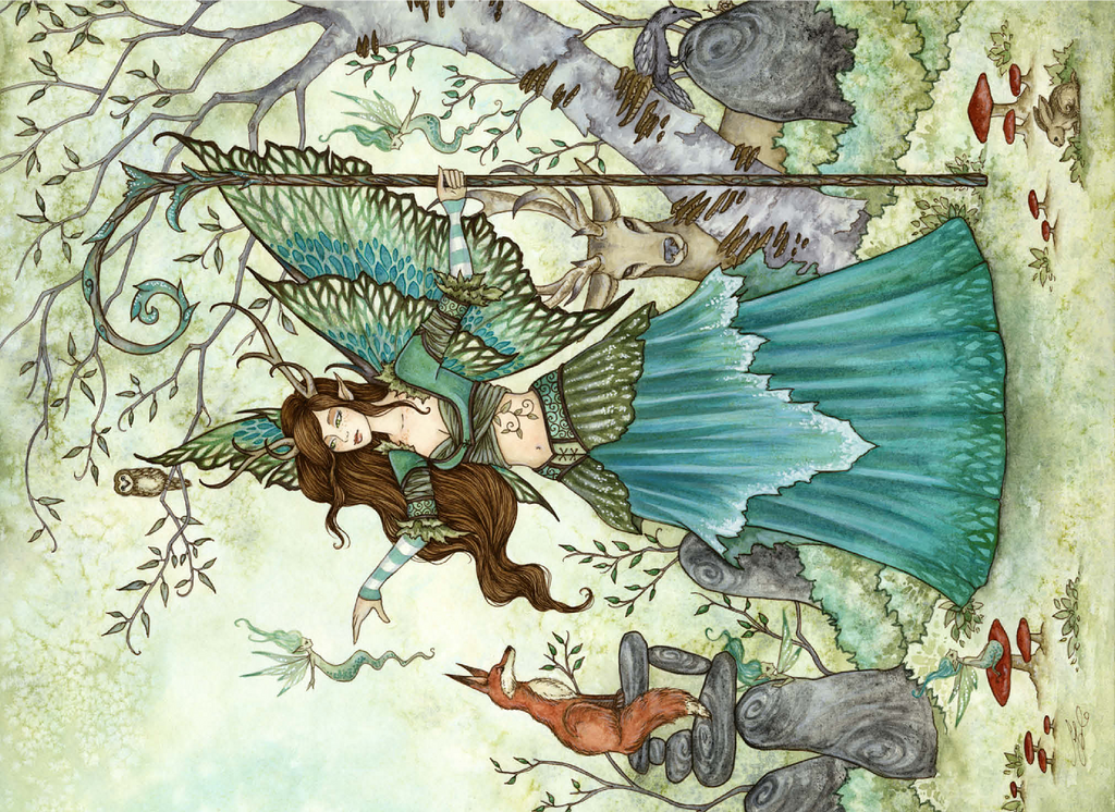 -Woodland Gathering- centers on a forest faery with vibrant green wings, summoning woodland spirits amid a circle of attentive animals. Surrounded by foxes, owls, deer, and dancing sprites, she stands as a radiant conduit between the natural and magical realms.