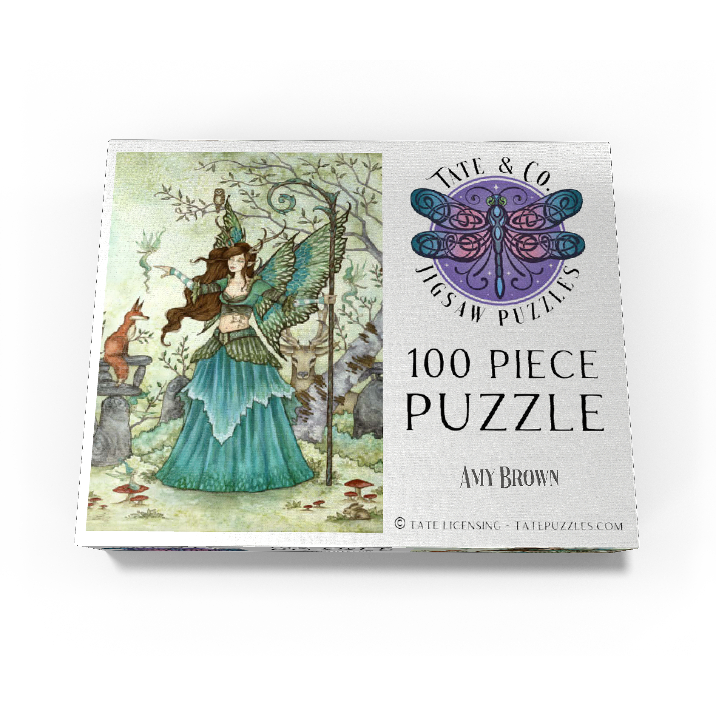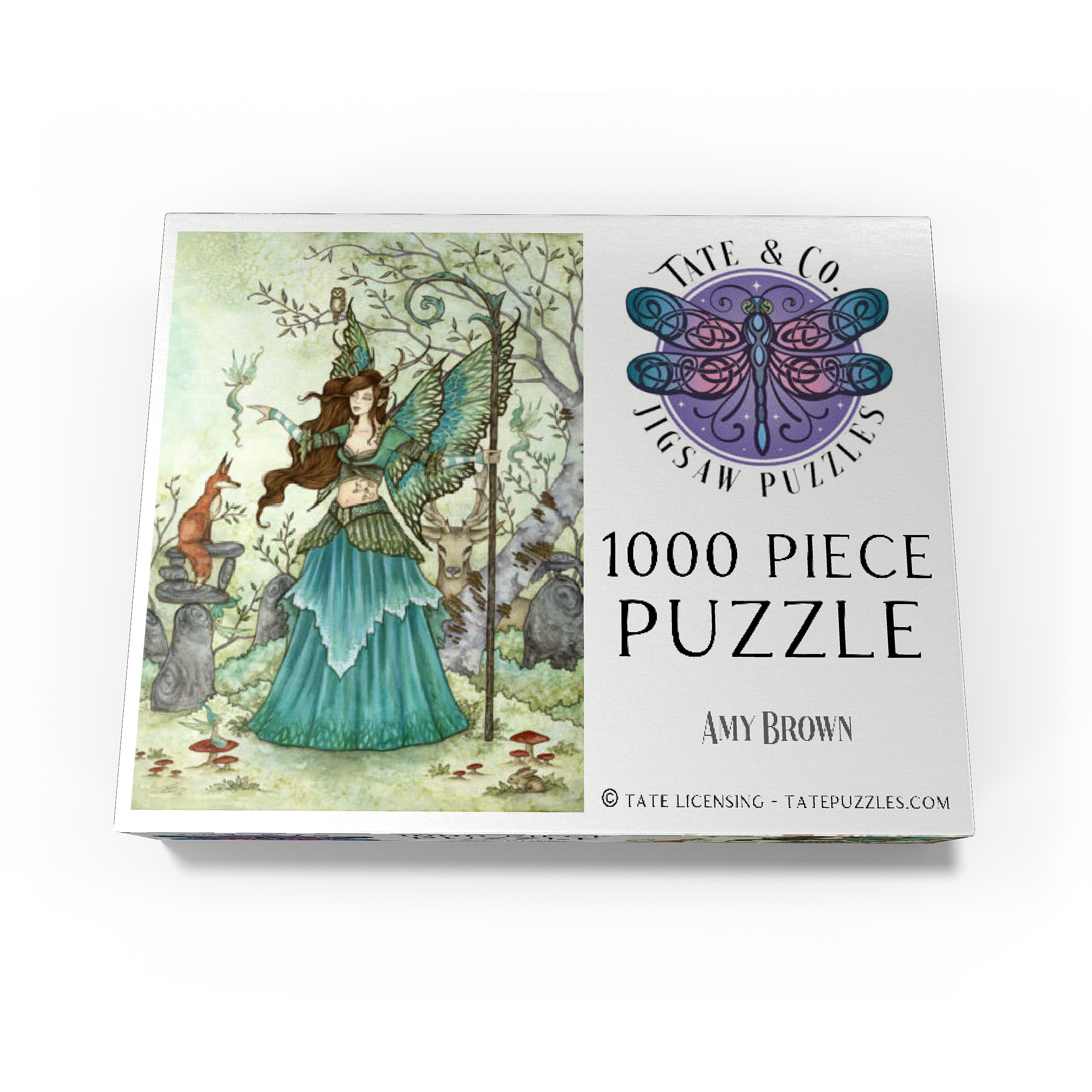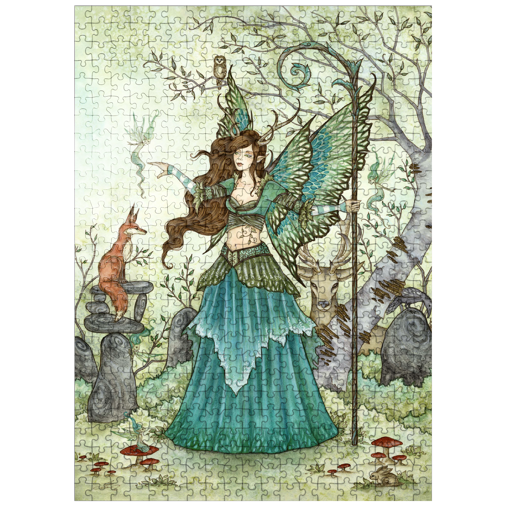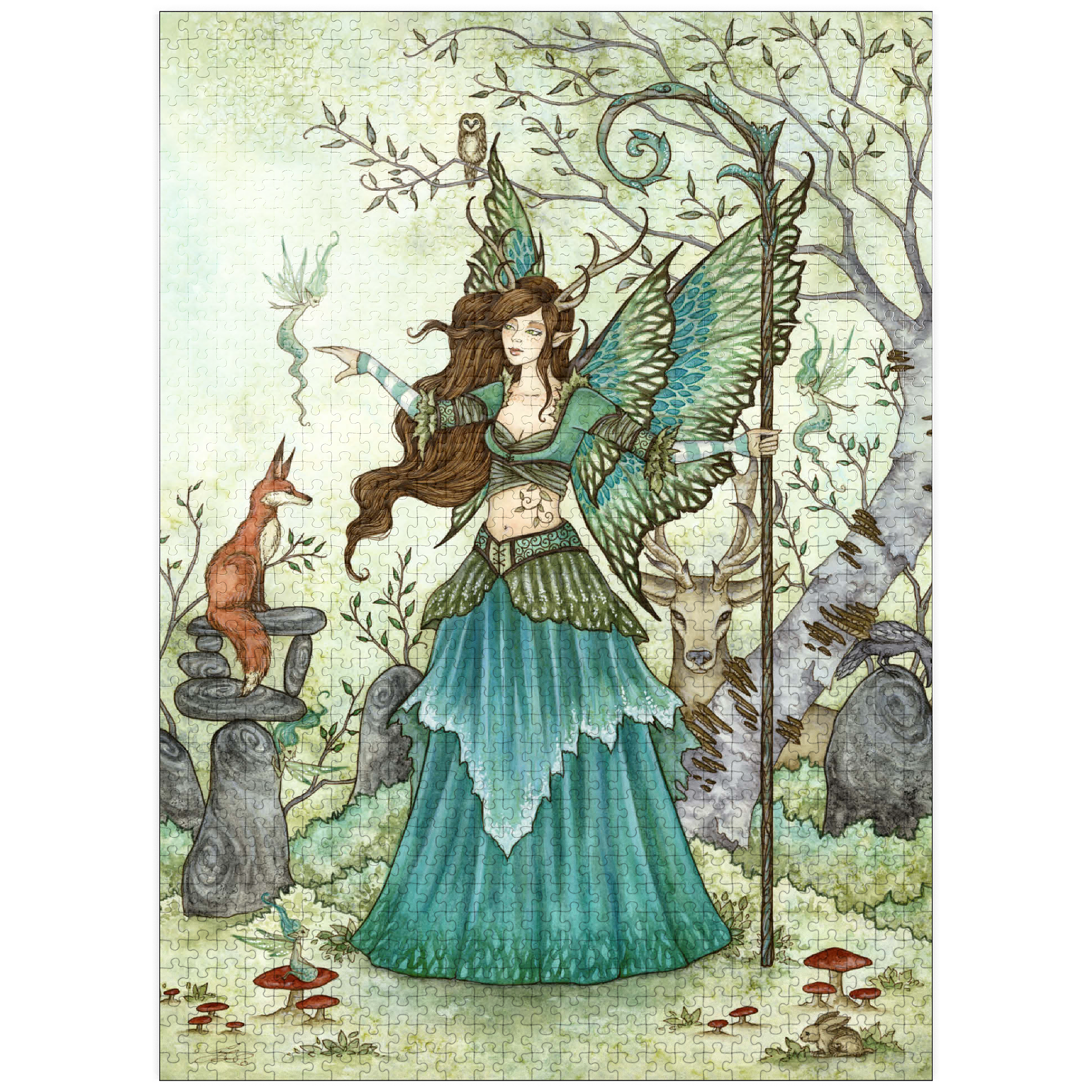 -Woodland Gathering- centers on a forest faery with vibrant green wings, summoning woodland spirits amid a circle of attentive animals. Surrounded by foxes, owls, deer, and dancing sprites, she stands as a radiant conduit between the natural and magical realms.