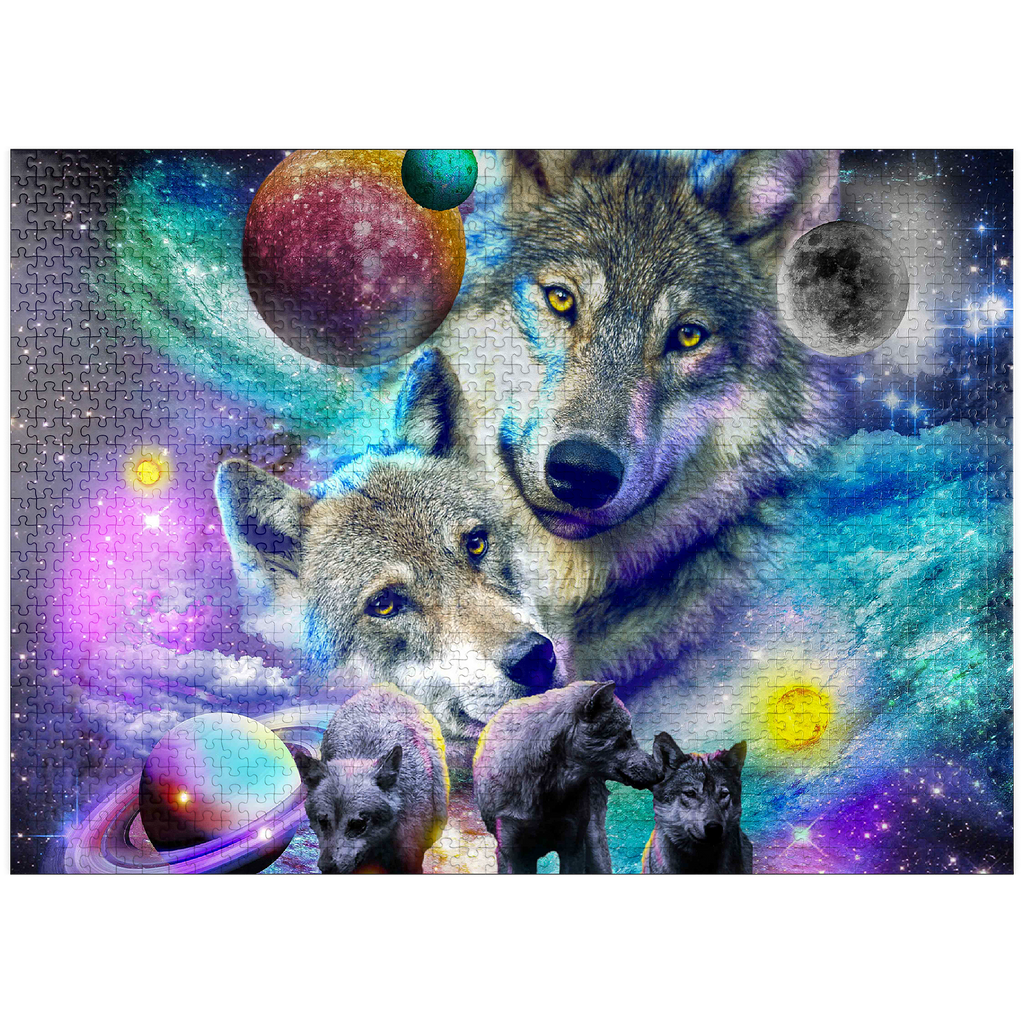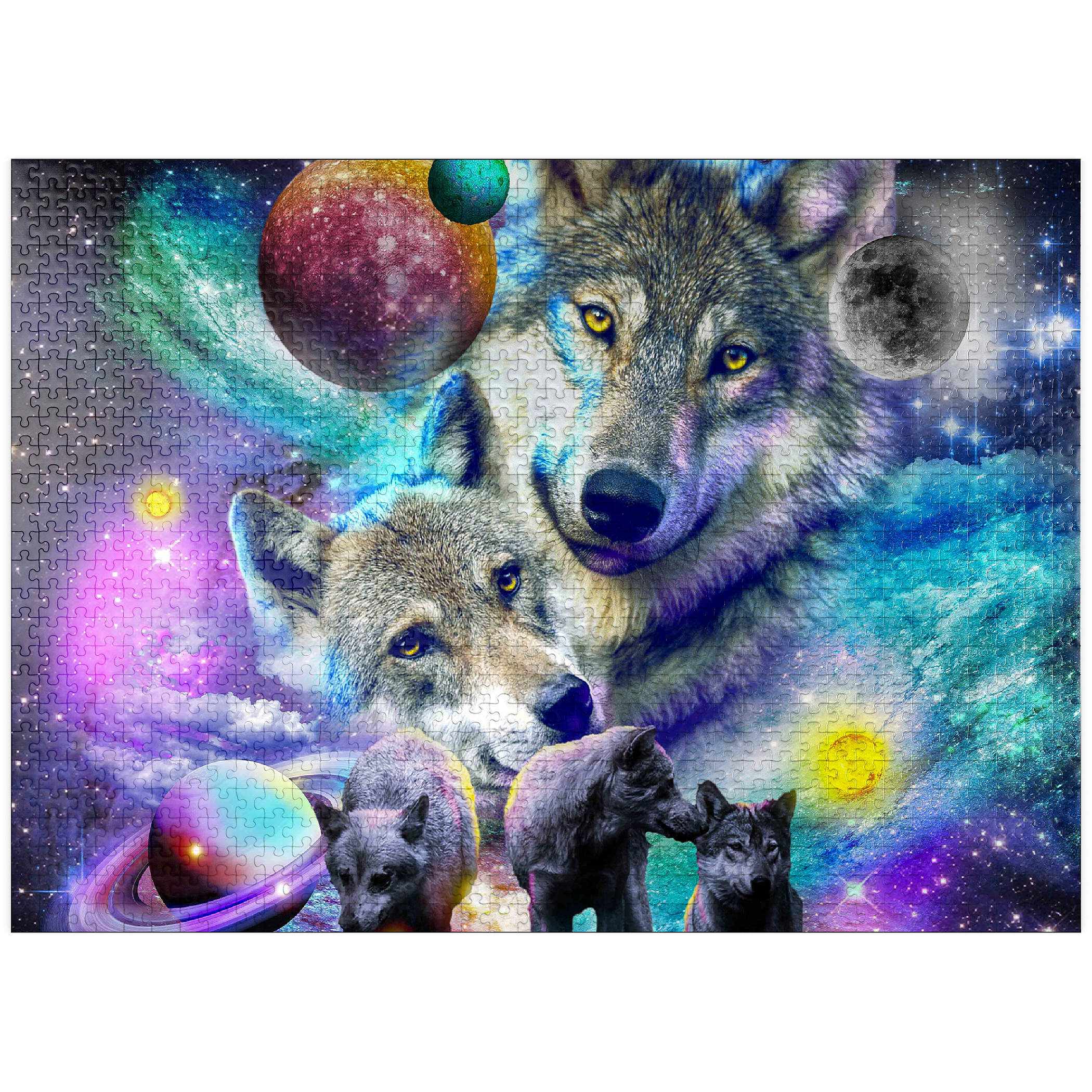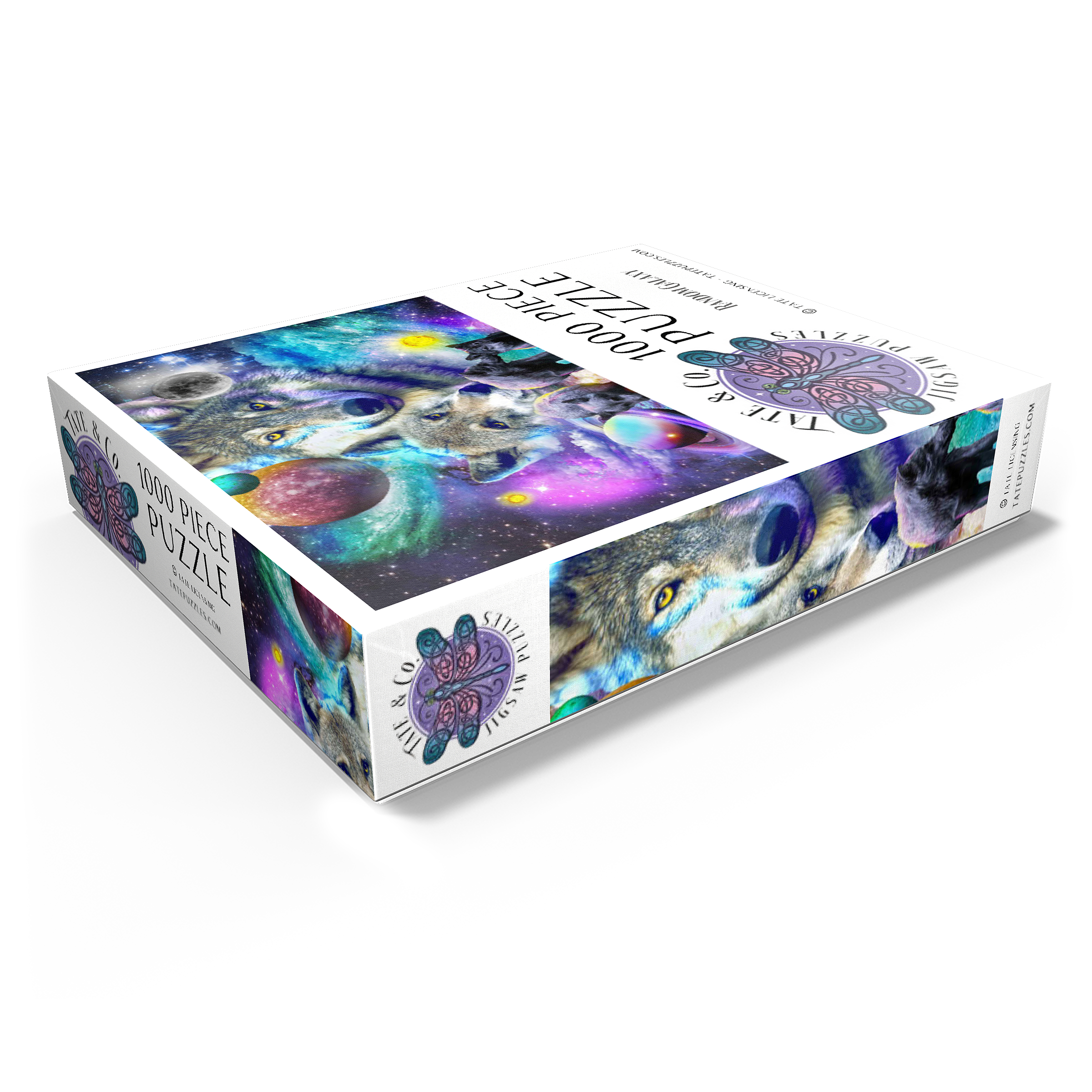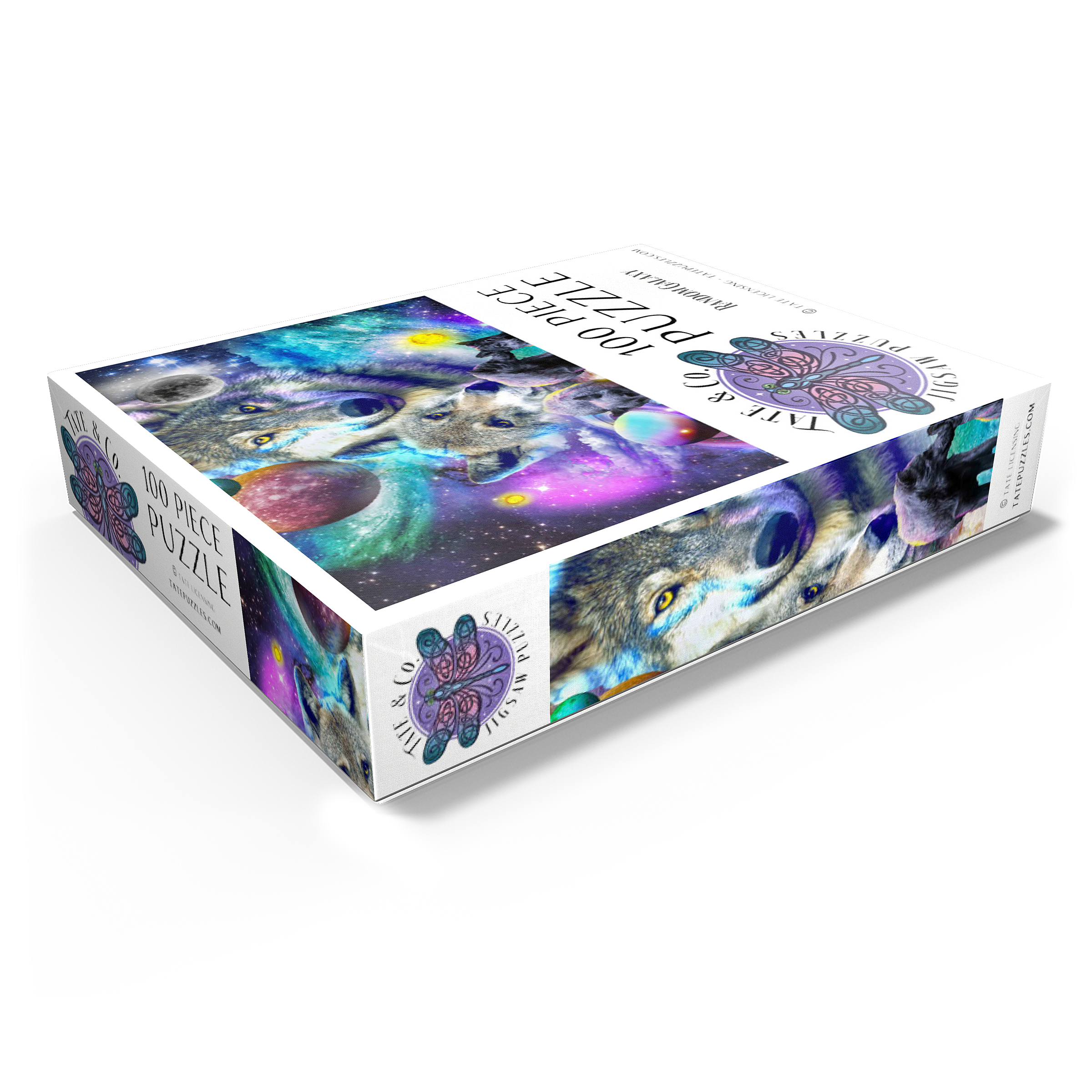 A lone wolf howls beneath a nebula sky, surrounded by galaxies that shimmer like northern lights. This majestic cosmic scene captures the mysterious beauty of Random Galaxy's interstellar wilderness.