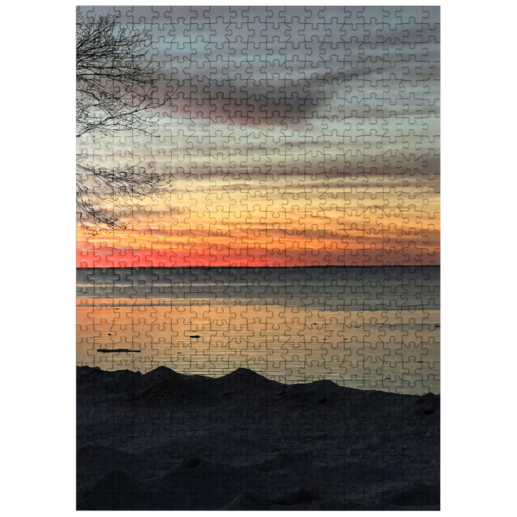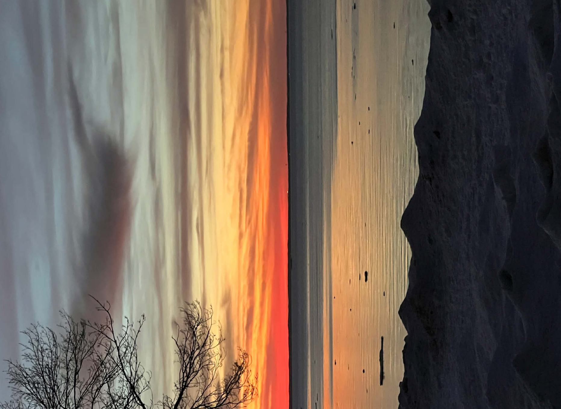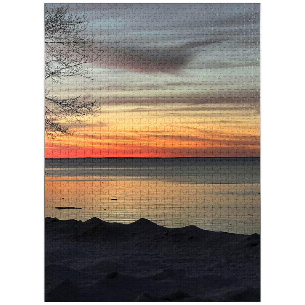 Witness the breathtaking beauty of a winter sunset over a tranquil, partially frozen lake. The sky is painted in stunning shades of orange, red, and gold, reflecting on the icy water’s surface, creating a peaceful and dreamlike atmosphere. A silhouetted tree branch frames the scene, adding depth and contrast to the soft, snow-covered shoreline. This serene nature photograph captures the quiet magic of winter evenings, making it ideal for wall art, digital backgrounds, or seasonal decor. Perfect for those who appreciate the beauty of nature’s transitions and peaceful winter landscapes.