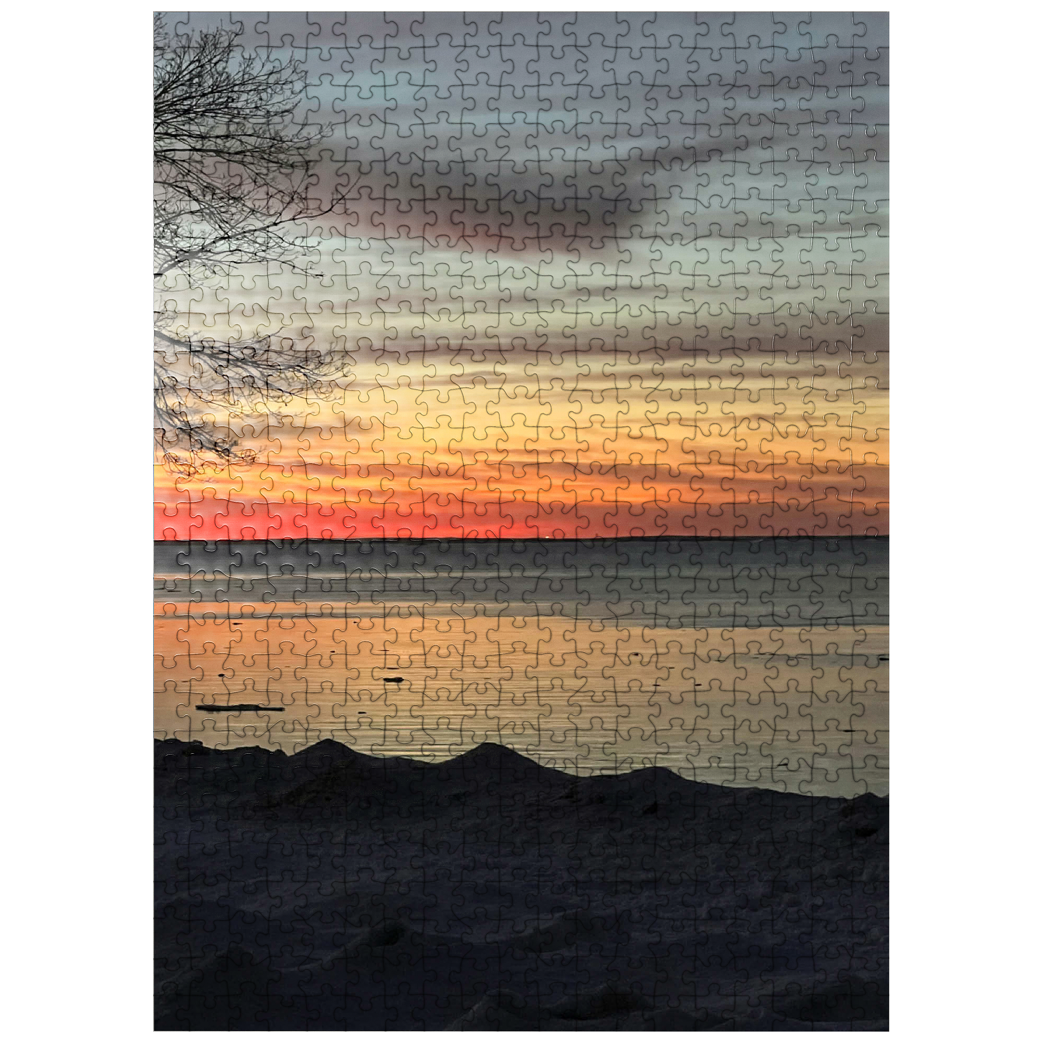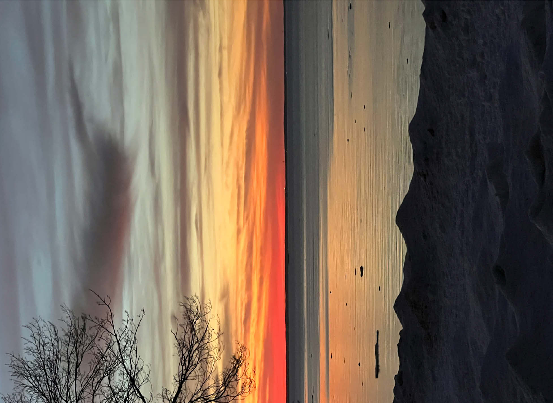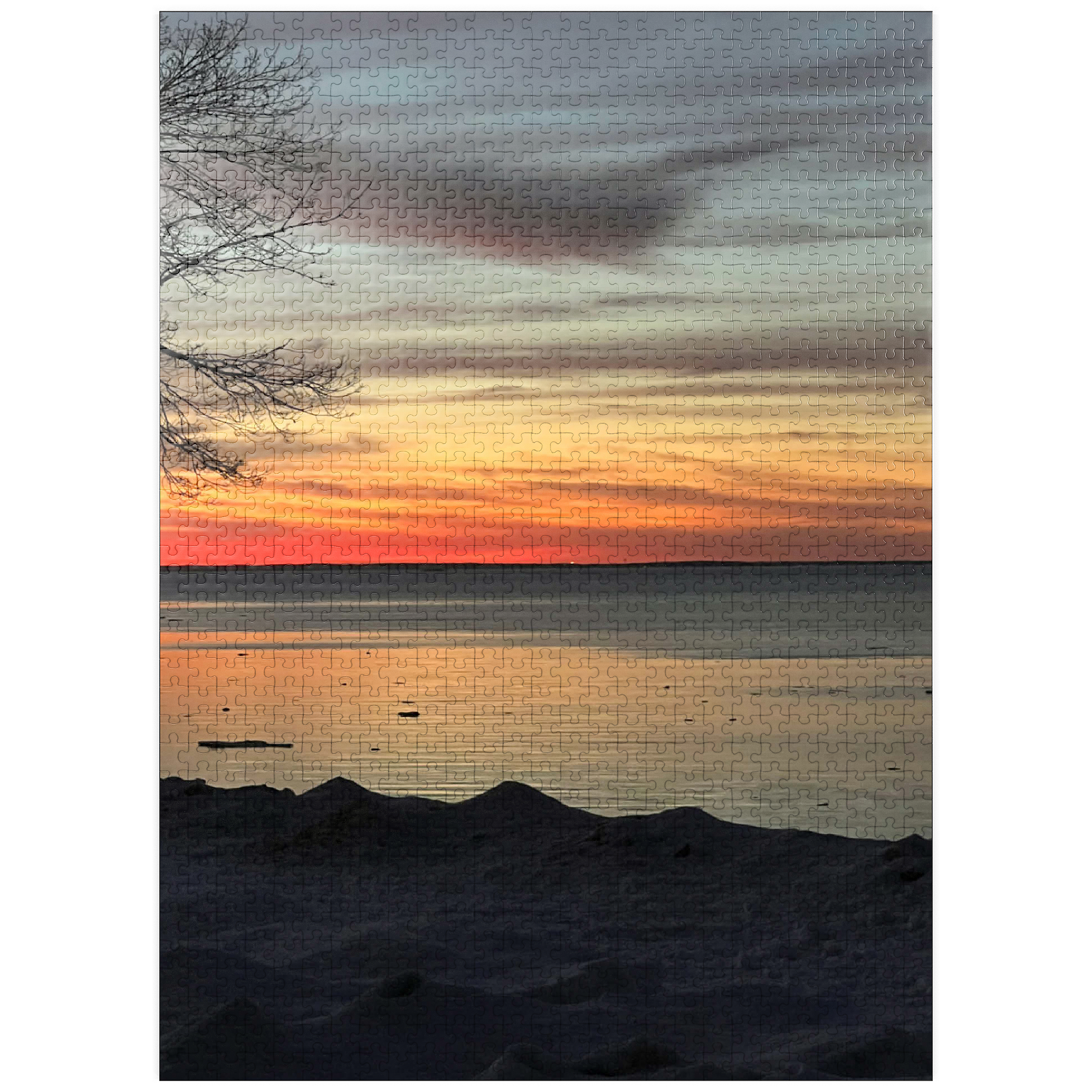 Witness the breathtaking beauty of a winter sunset over a tranquil, partially frozen lake. The sky is painted in stunning shades of orange, red, and gold, reflecting on the icy water’s surface, creating a peaceful and dreamlike atmosphere. A silhouetted tree branch frames the scene, adding depth and contrast to the soft, snow-covered shoreline. This serene nature photograph captures the quiet magic of winter evenings, making it ideal for wall art, digital backgrounds, or seasonal decor. Perfect for those who appreciate the beauty of nature’s transitions and peaceful winter landscapes.