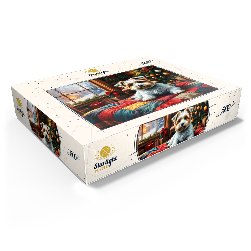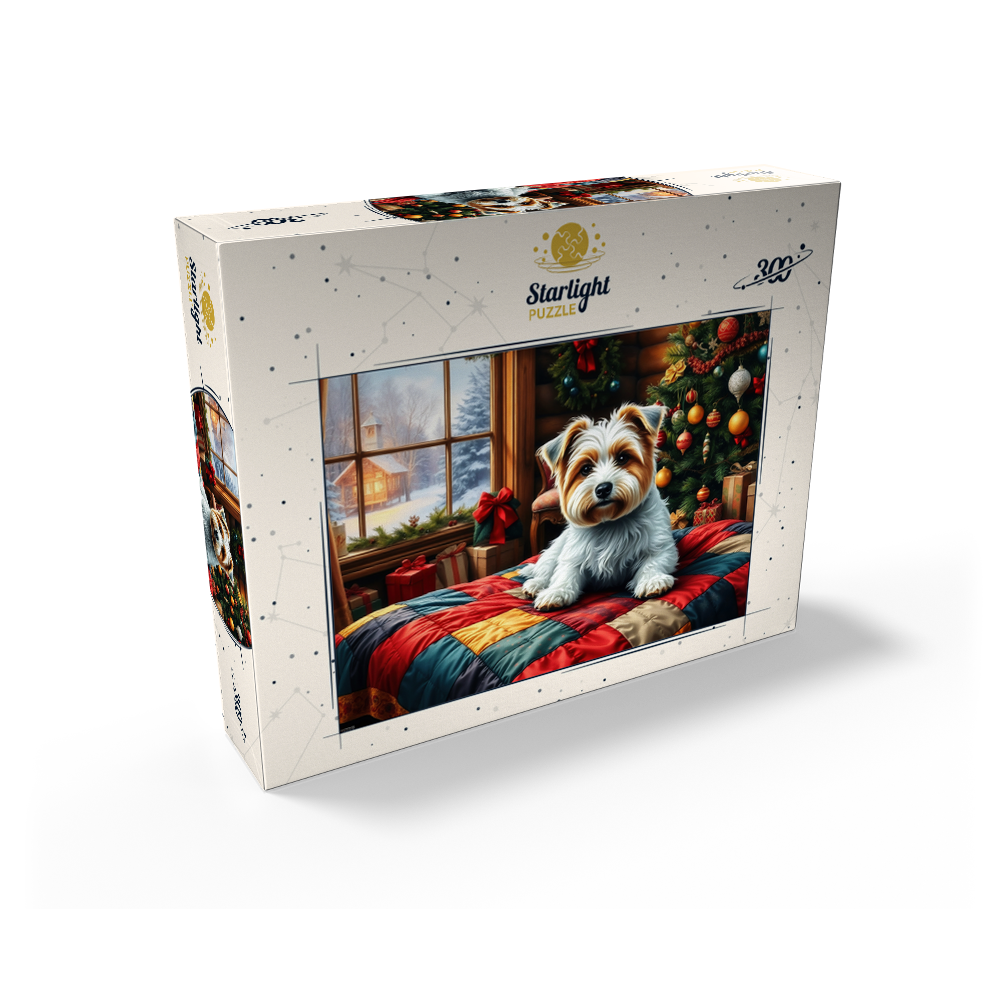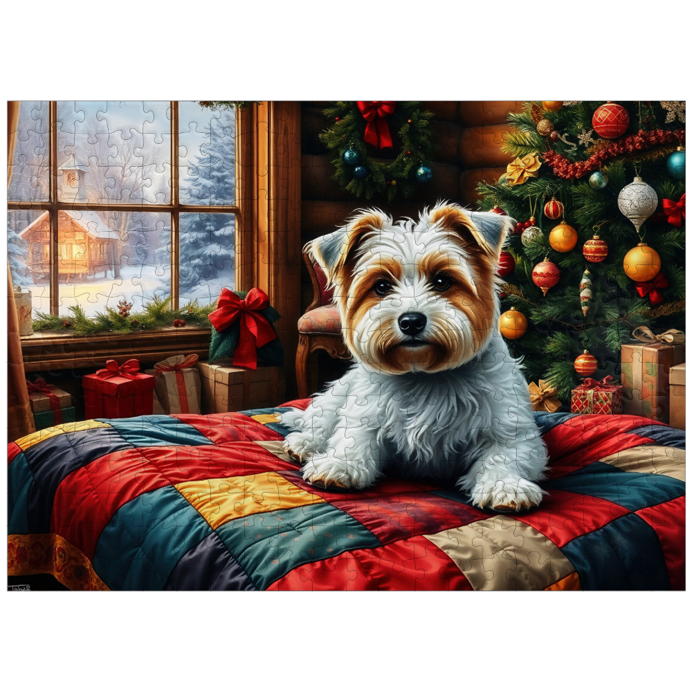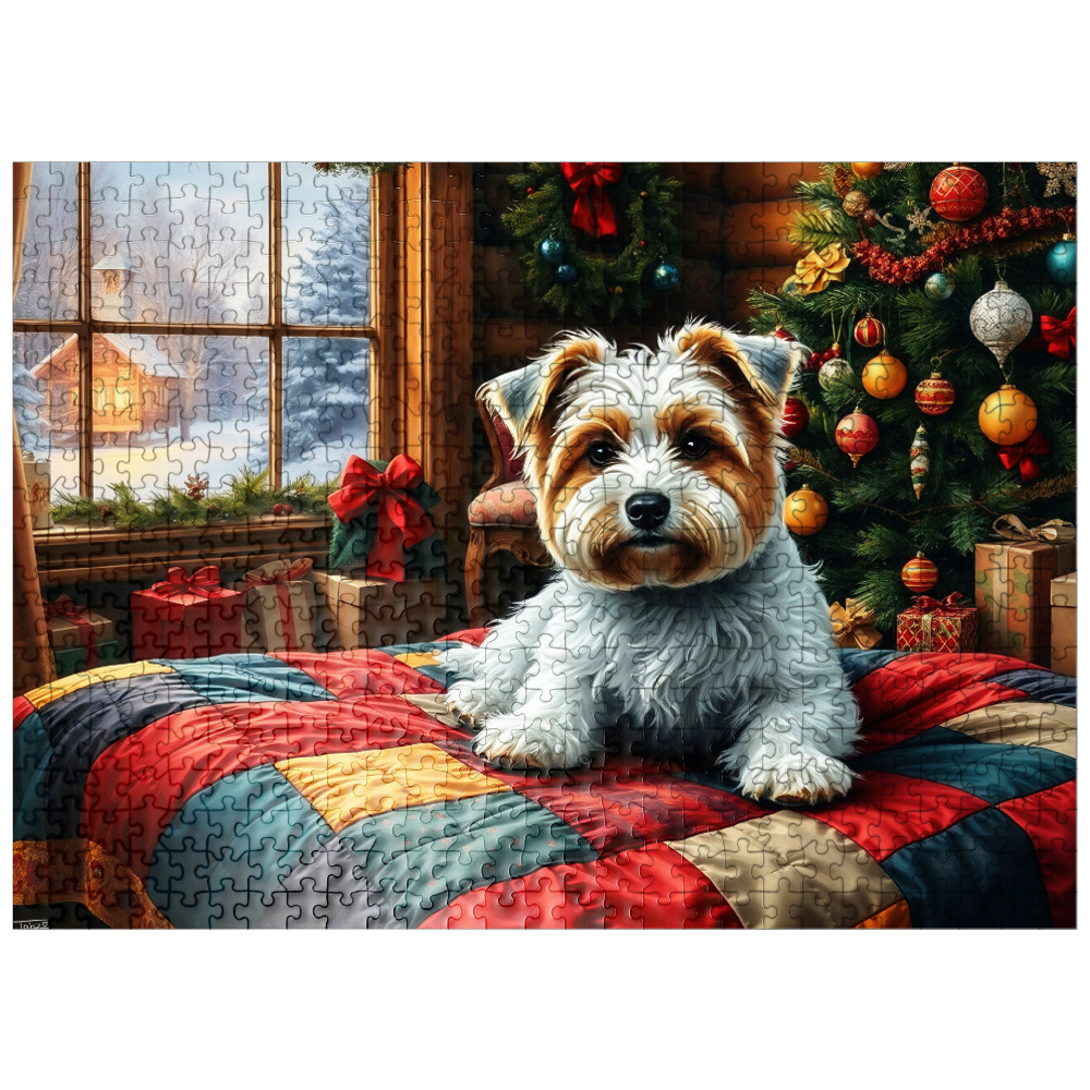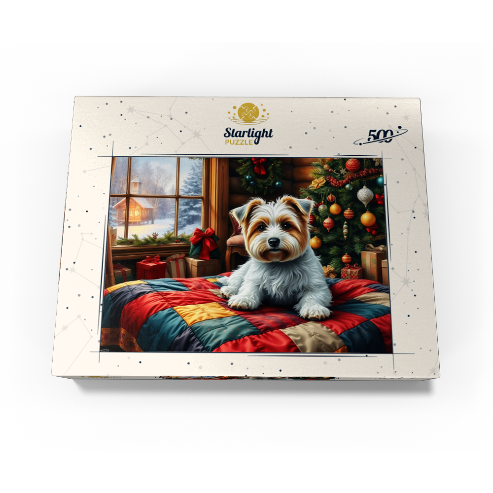 A cozy Christmas log cabin living room scene features a small terrier type dog resting on a colorful patchwork quilt beside a decorated Christmas tree with ornaments, bows, and wrapped gifts. Warm golden cabin lighting highlights crisp textures in the dogs fur, pine needles, and rustic wood interior, creating a calm holiday atmosphere. Through the window, a snowy winter landscape appears with frosted trees and a softly lit cabin outside, adding seasonal depth and hygge vibes. This realistic style festive interior is ideal for searches related to Christmas decor, winter cabin home design, holiday pets, rustic lodge living, and cozy seasonal lifestyle imagery.