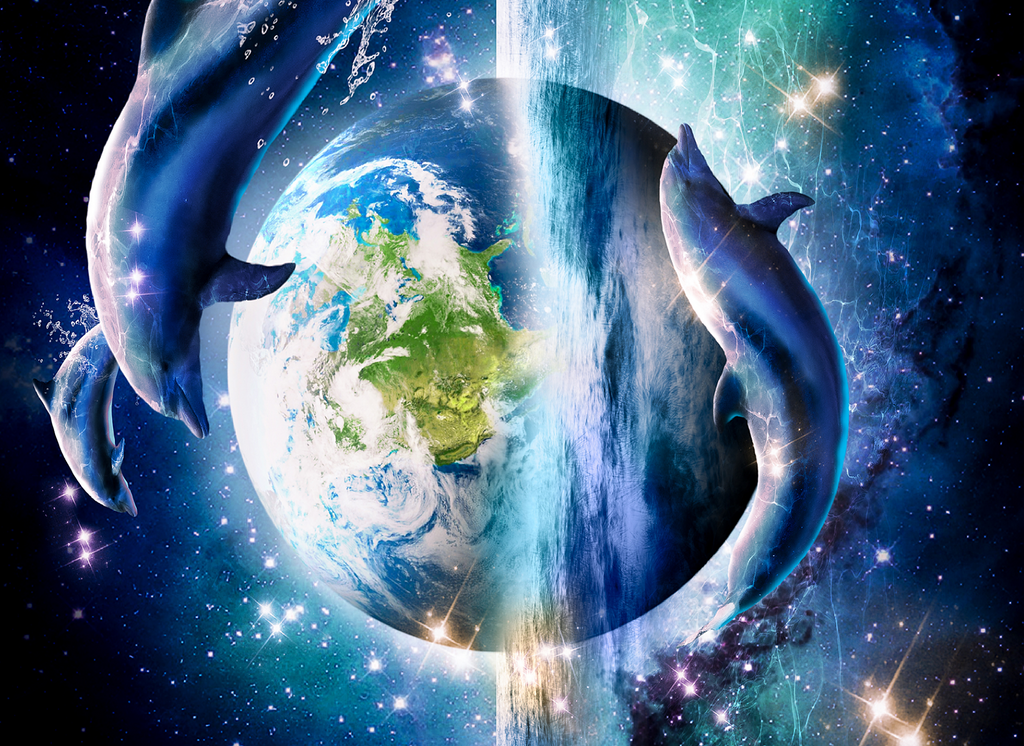 Shimmering rainbow dolphins leap across glowing waves beneath a pastel sky. Random Galaxy's radiant vision fuses sea and sky in a dreamlike celebration of color and motion.