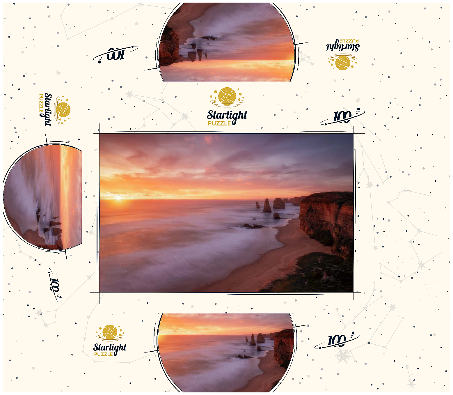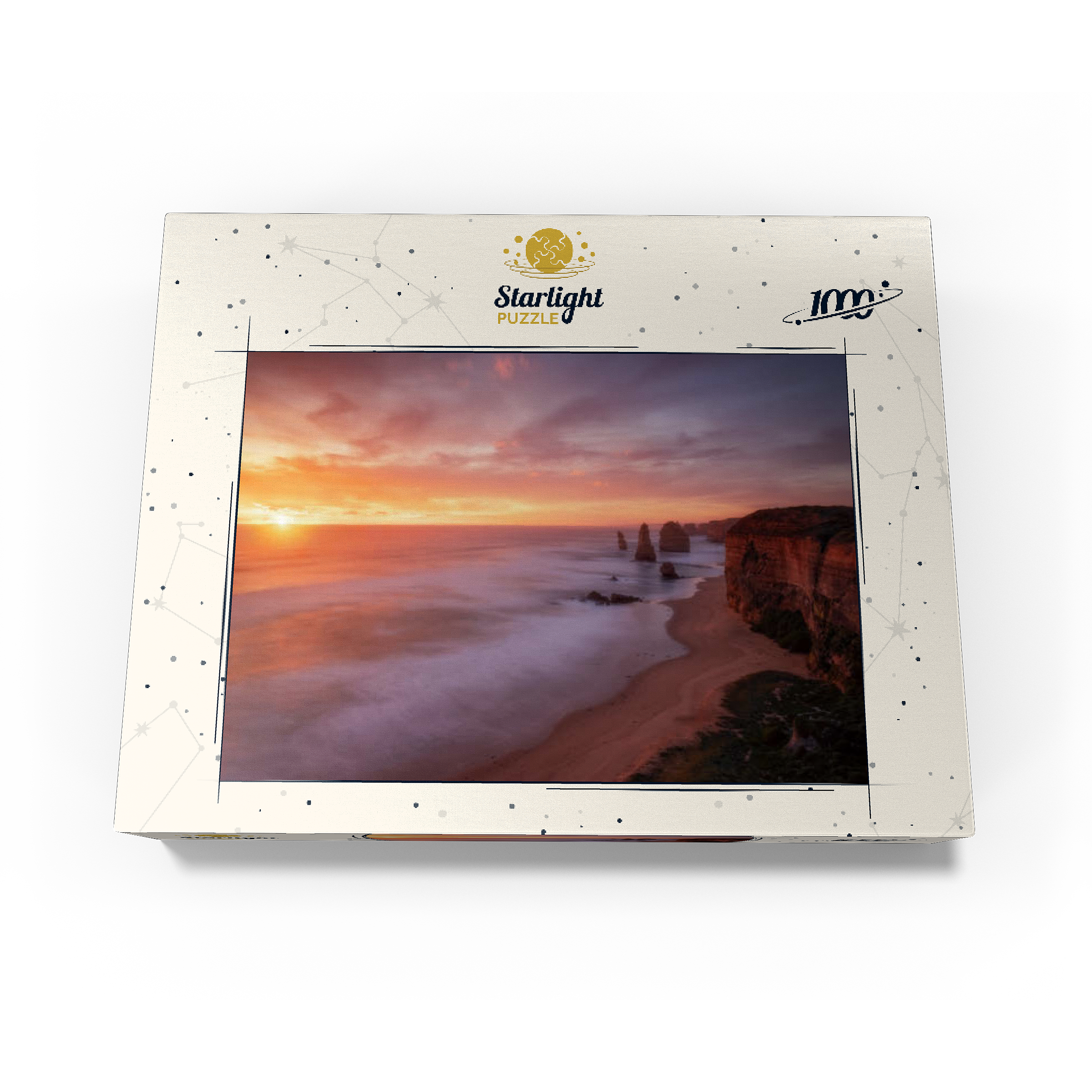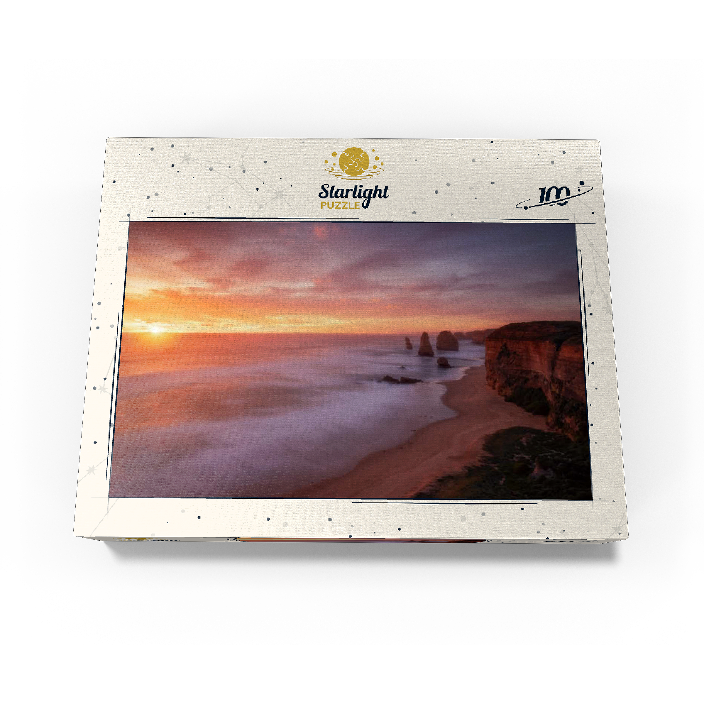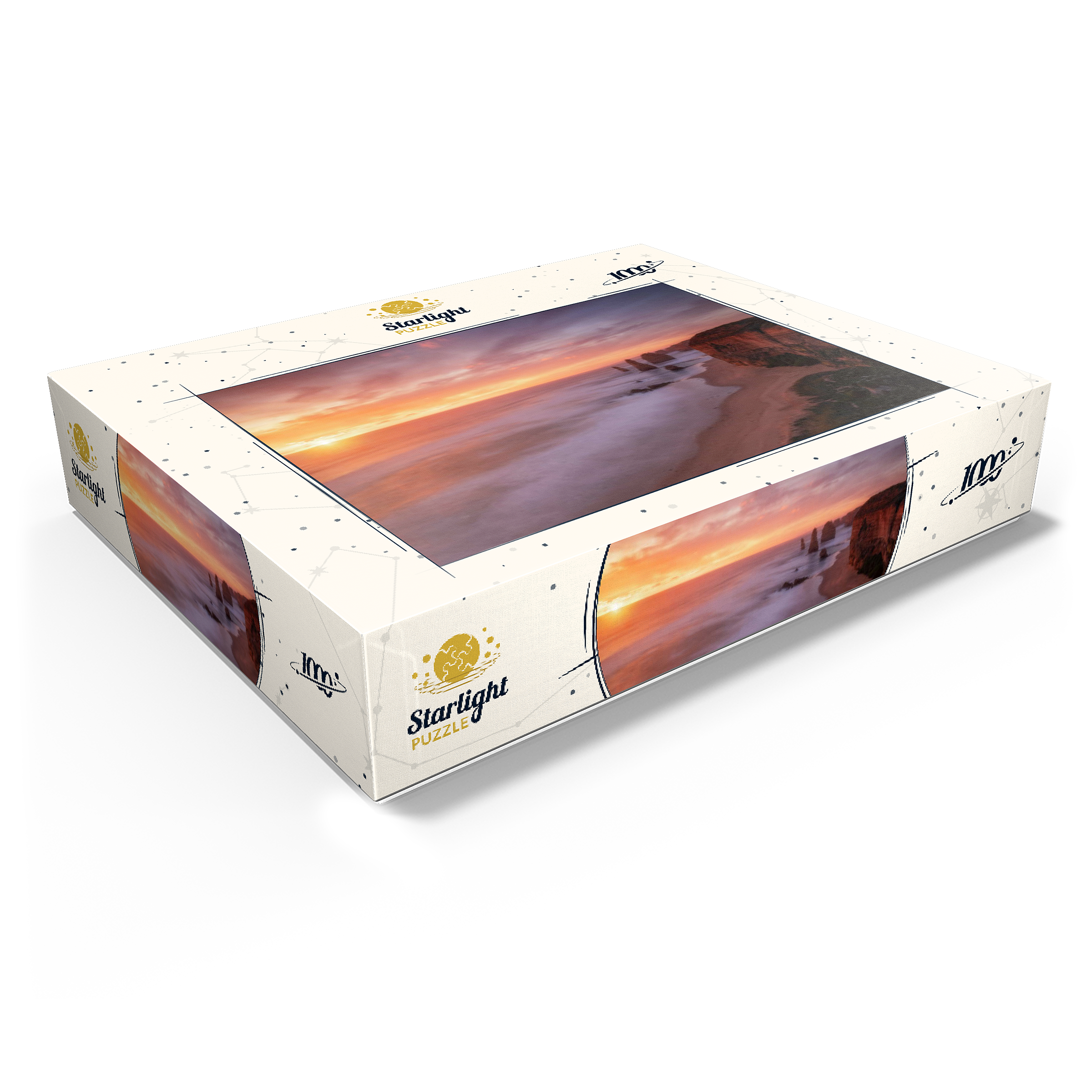 The Twelve Apostles, a world-renowned natural wonder located along the Great Ocean Road in Victoria, Australia, are captured here under a glowing sunset sky. These dramatic limestone stacks rise from the Southern Ocean, shaped over millions of years by relentless wind and waves. The golden-orange hues of the setting sun bathe the cliffs and the ocean in warm light, while gentle waves blur against the rugged shore, creating a dreamy, ethereal seascape. This iconic viewpoint near Port Campbell National Park attracts nature lovers and photographers from around the world, making it a must-see destination on Australia's southeastern coastline.