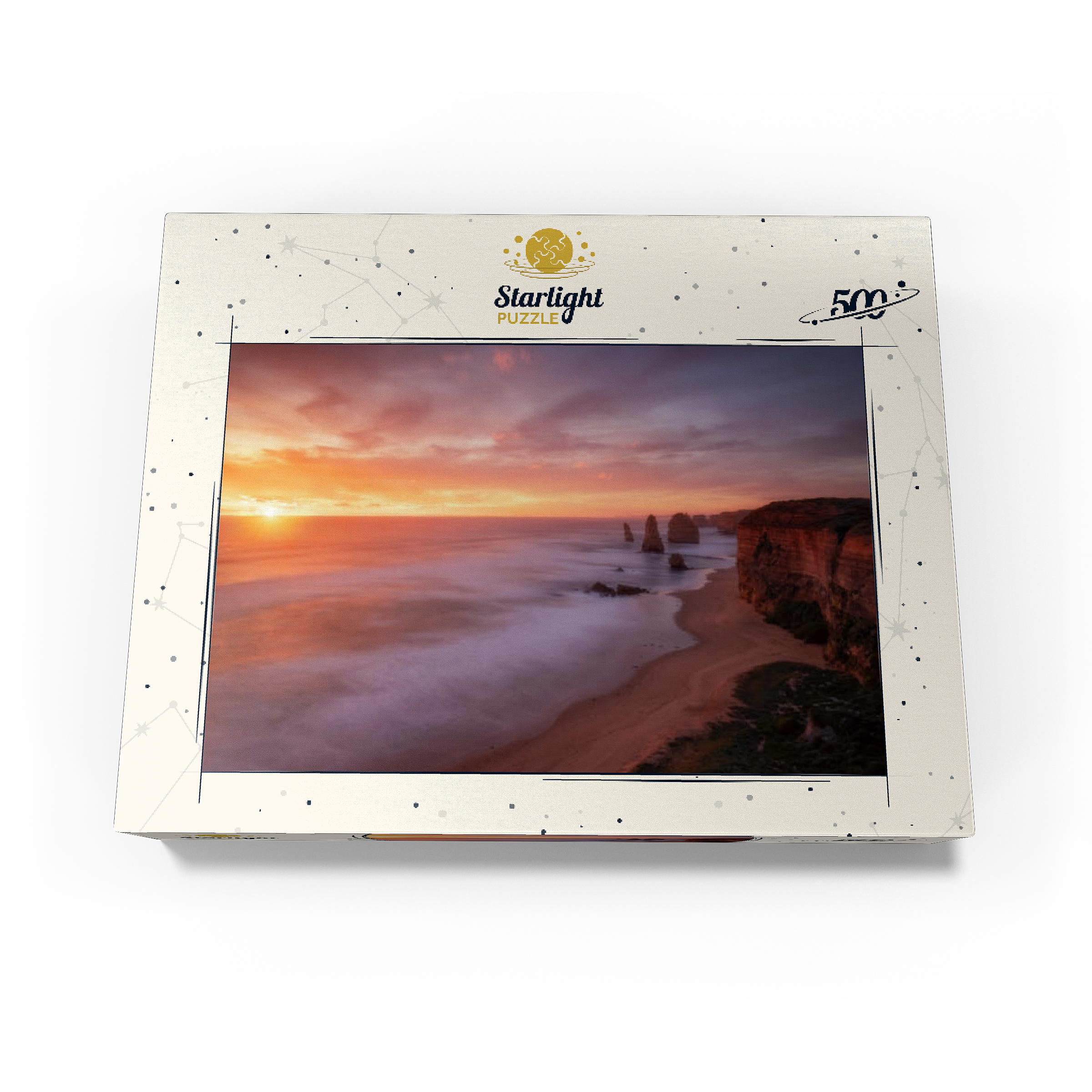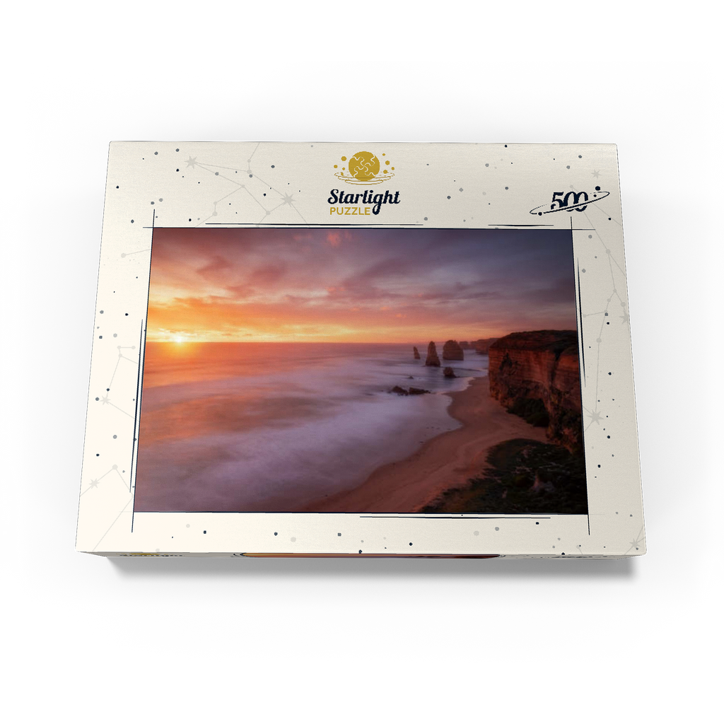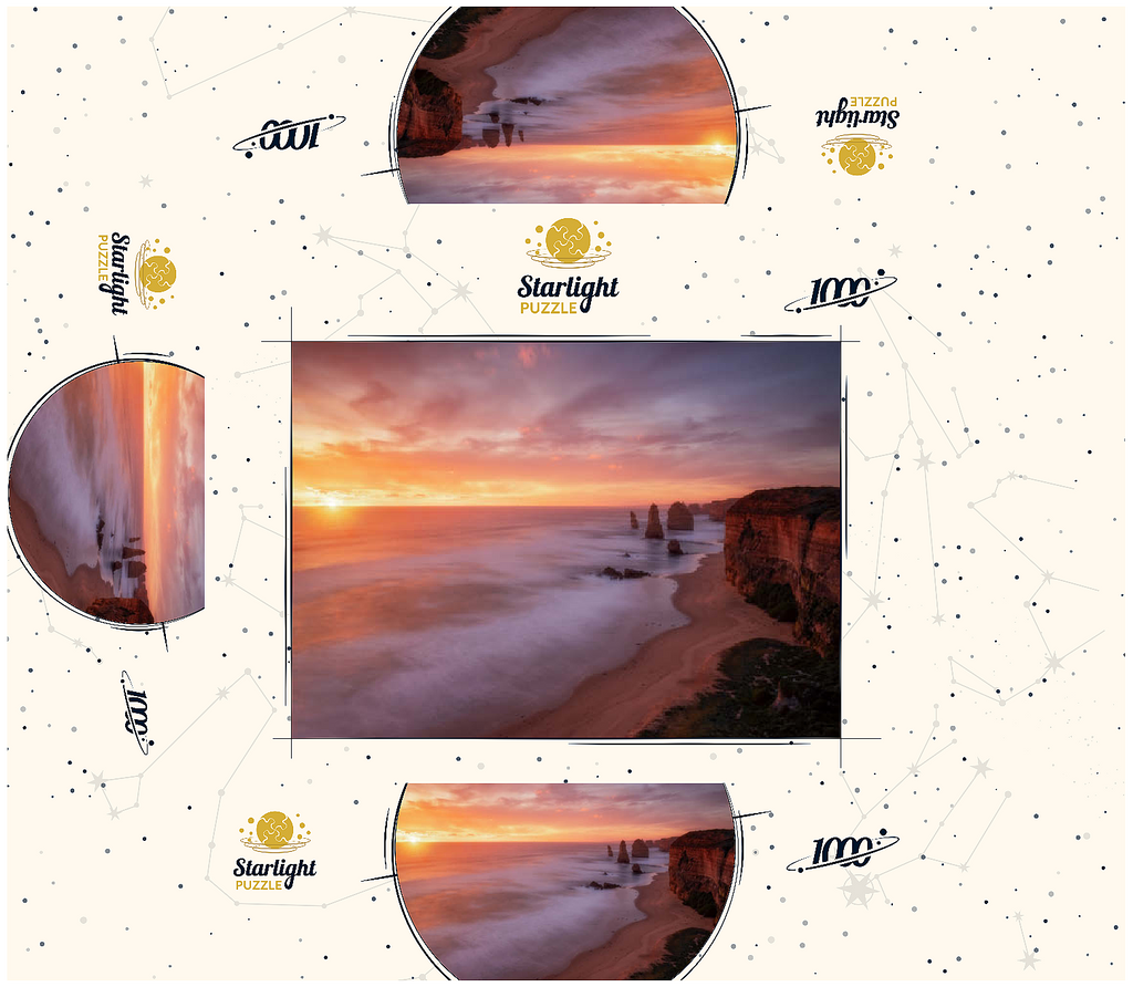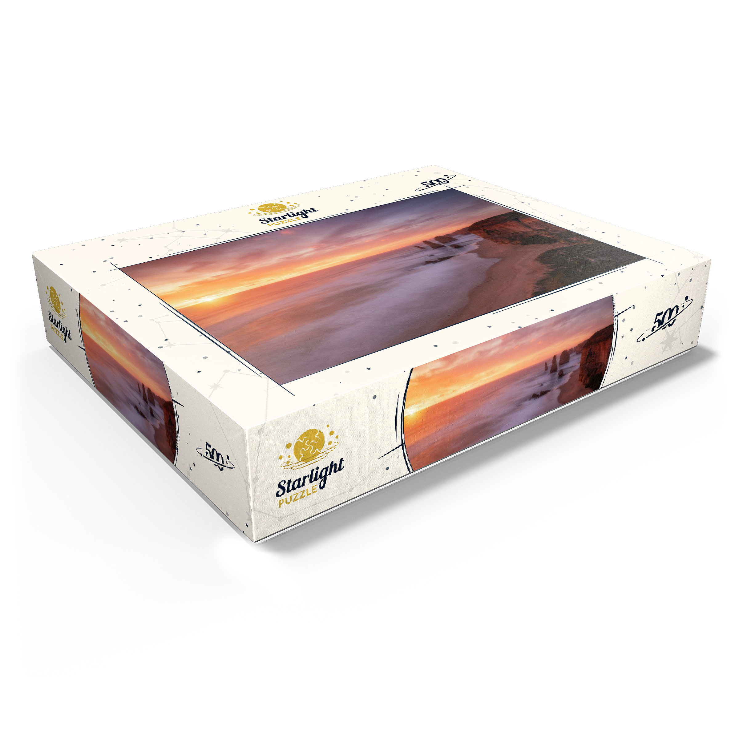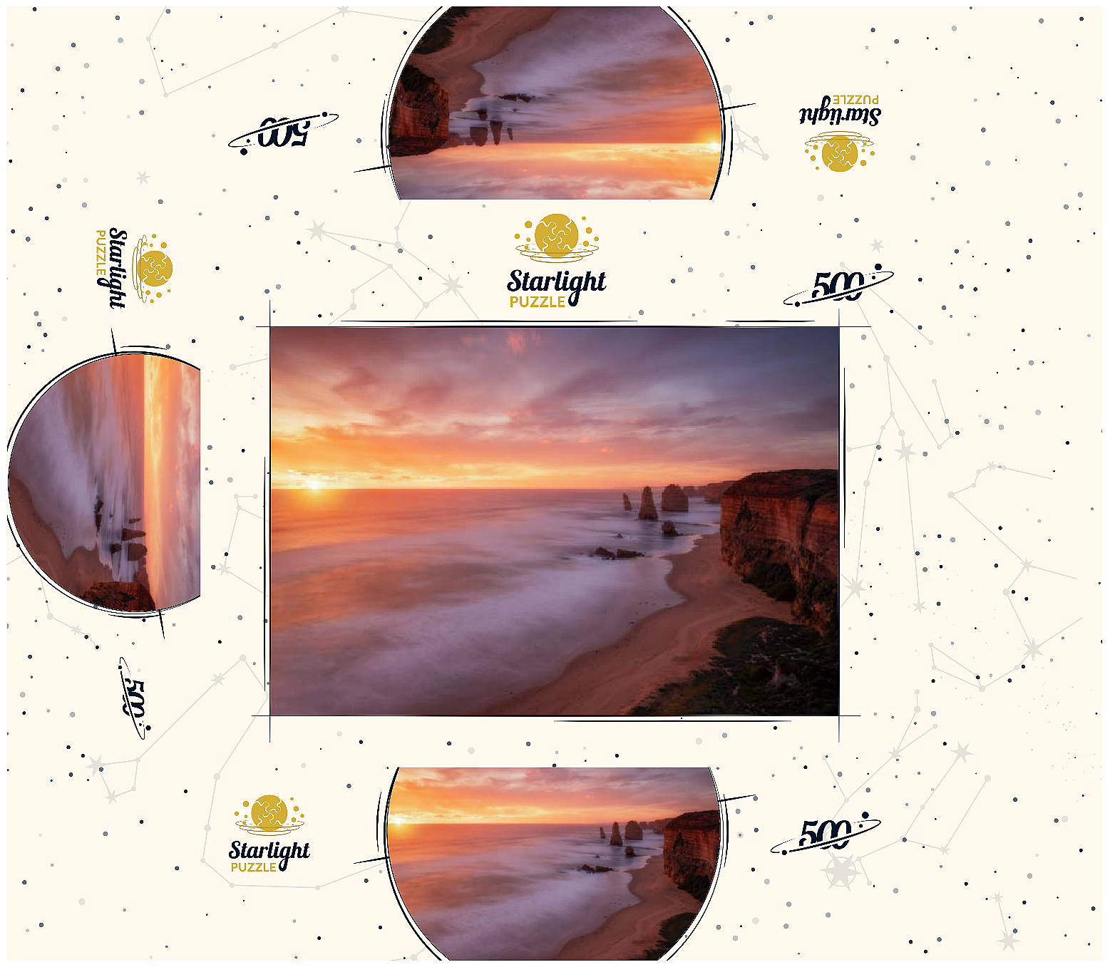 The Twelve Apostles, a world-renowned natural wonder located along the Great Ocean Road in Victoria, Australia, are captured here under a glowing sunset sky. These dramatic limestone stacks rise from the Southern Ocean, shaped over millions of years by relentless wind and waves. The golden-orange hues of the setting sun bathe the cliffs and the ocean in warm light, while gentle waves blur against the rugged shore, creating a dreamy, ethereal seascape. This iconic viewpoint near Port Campbell National Park attracts nature lovers and photographers from around the world, making it a must-see destination on Australia's southeastern coastline.