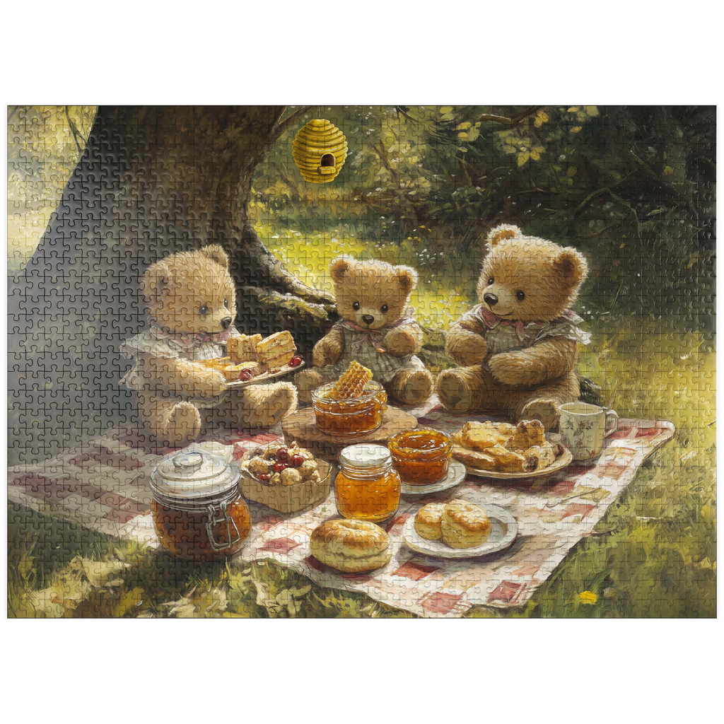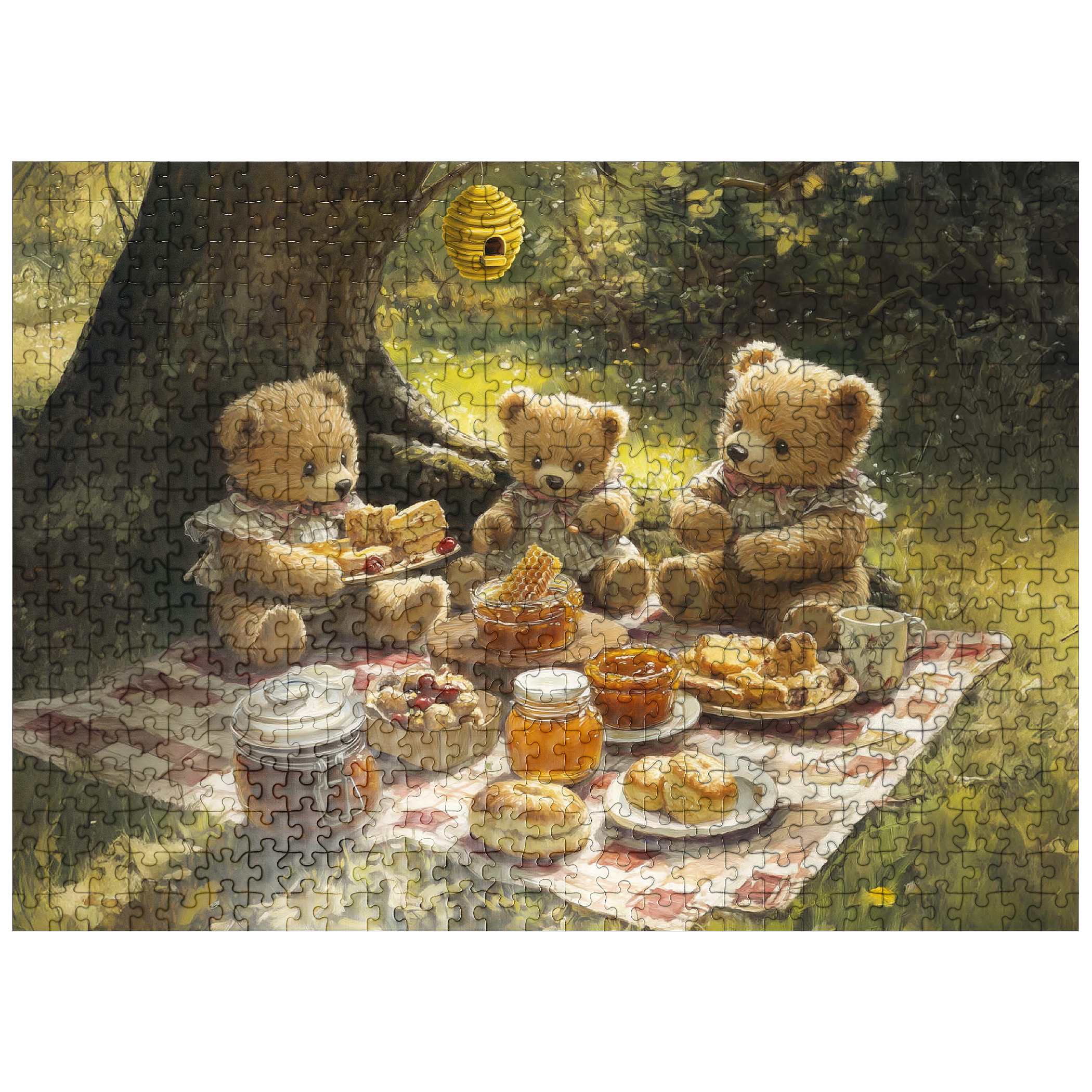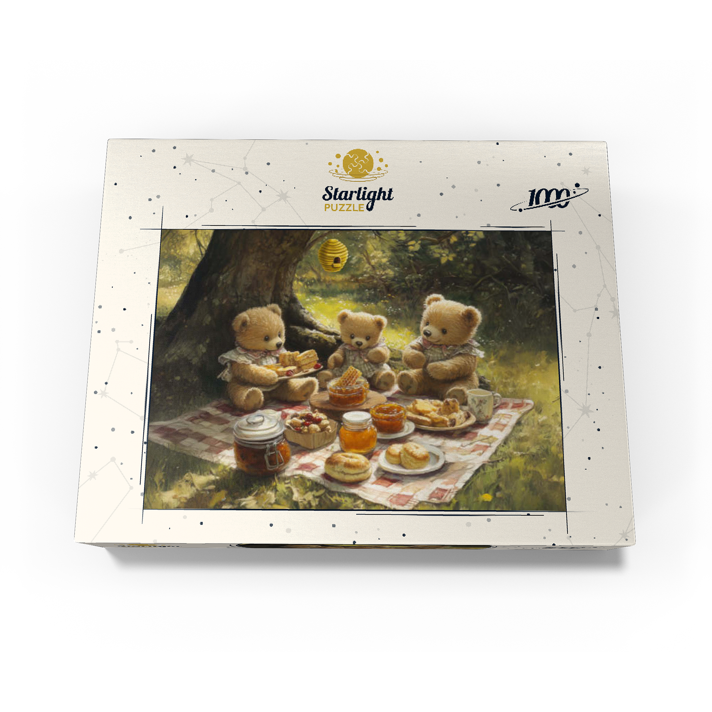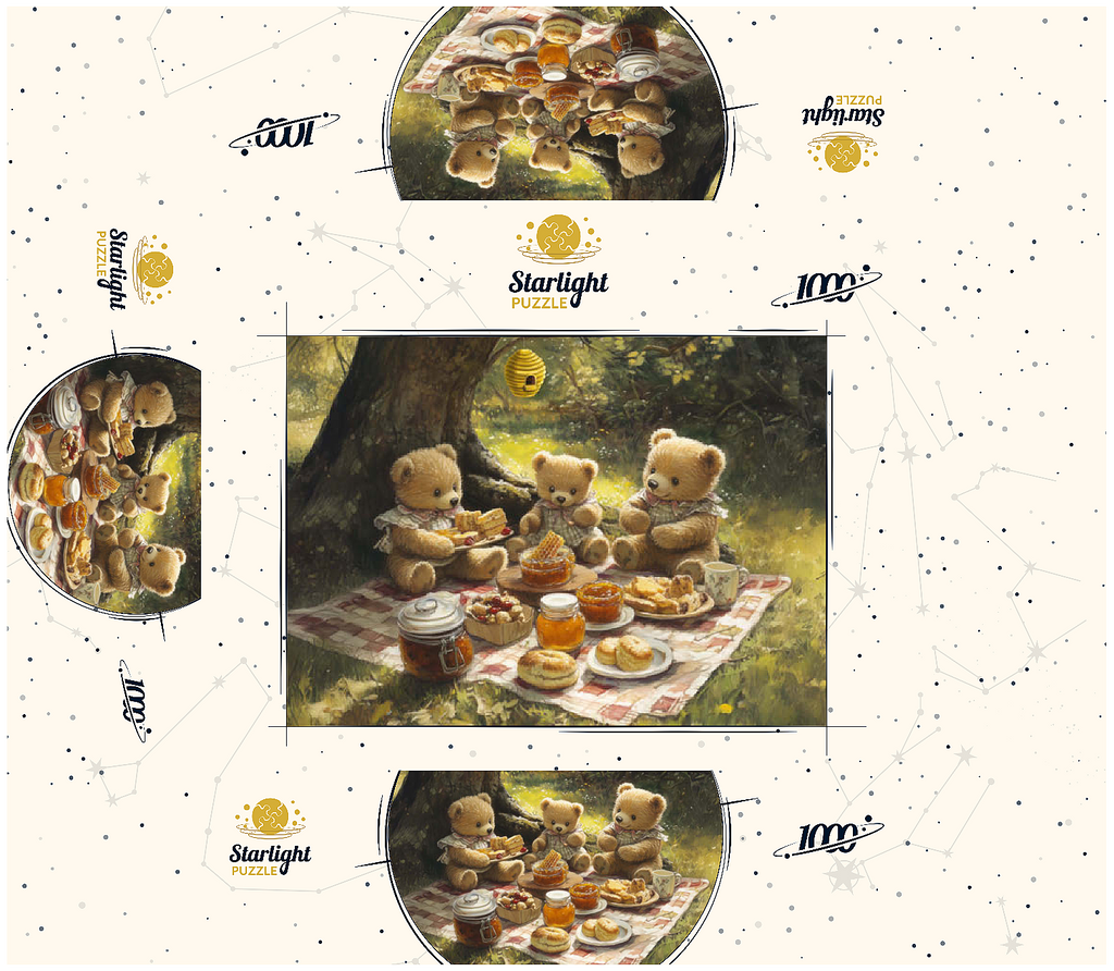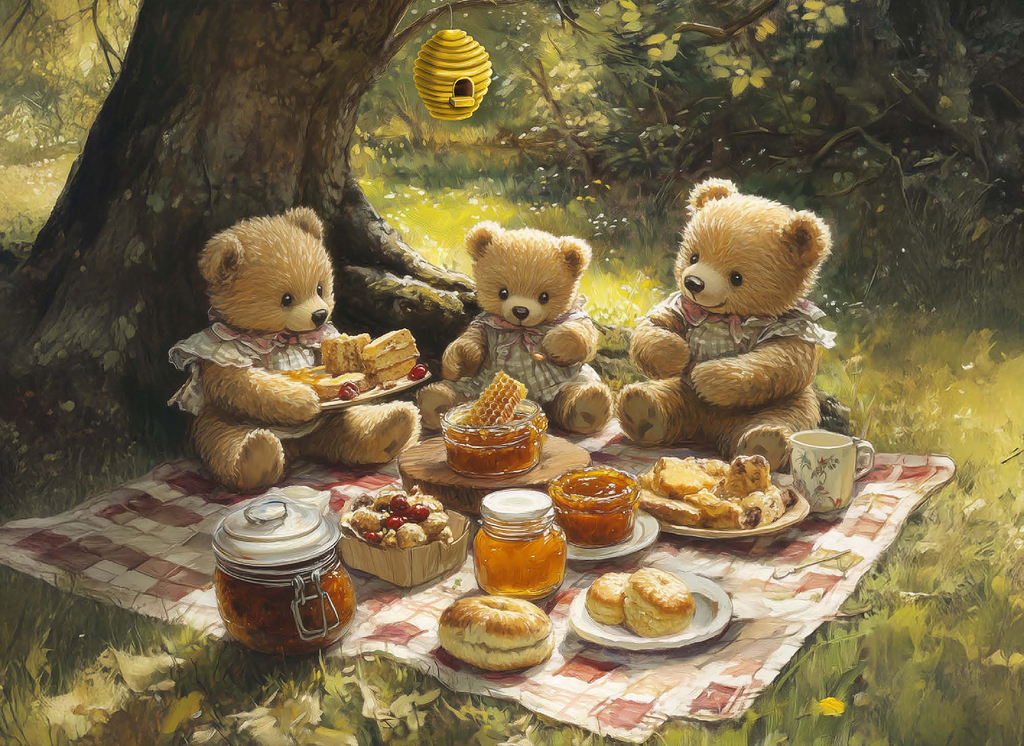 A heartwarming digital artwork of three adorable teddy bears enjoying a delightful picnic beneath the shade of a large tree. Dressed in charming vintage-style outfits with frilly collars, the bears sit on a classic red-and-white checkered blanket, surrounded by an assortment of delicious treats. The spread includes honeycomb, jam, scones, cake, and fresh berries, all presented in rustic jars and plates. A small beehive hangs from a branch, adding a whimsical touch to the sunlit forest setting. This enchanting scene is perfect for children's decor, nursery art, or anyone who loves nostalgic and whimsical illustrations.