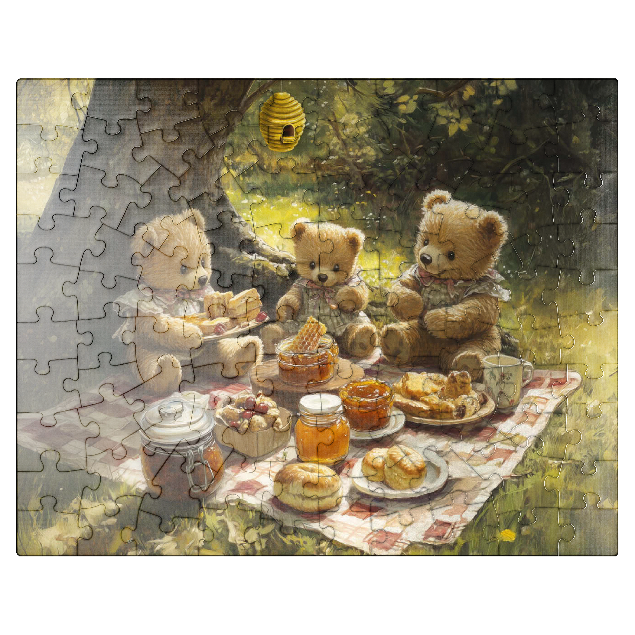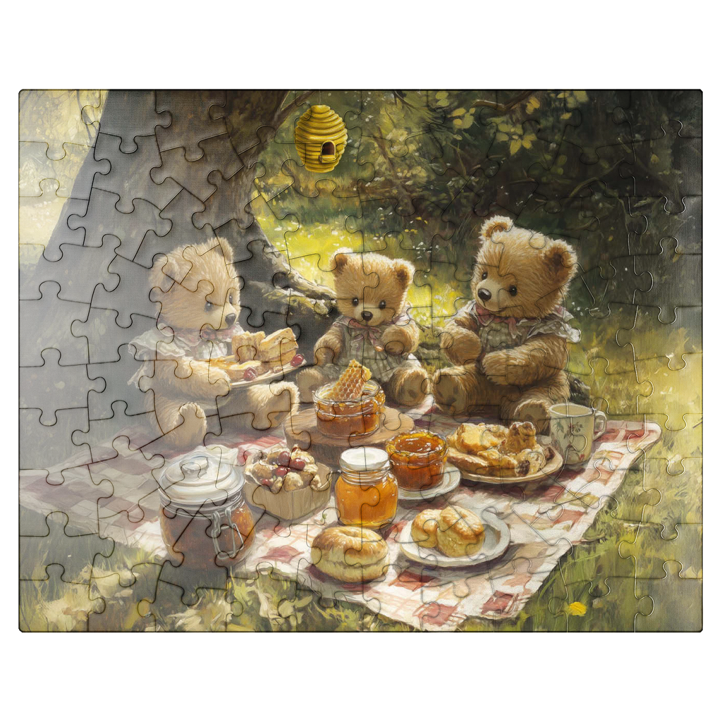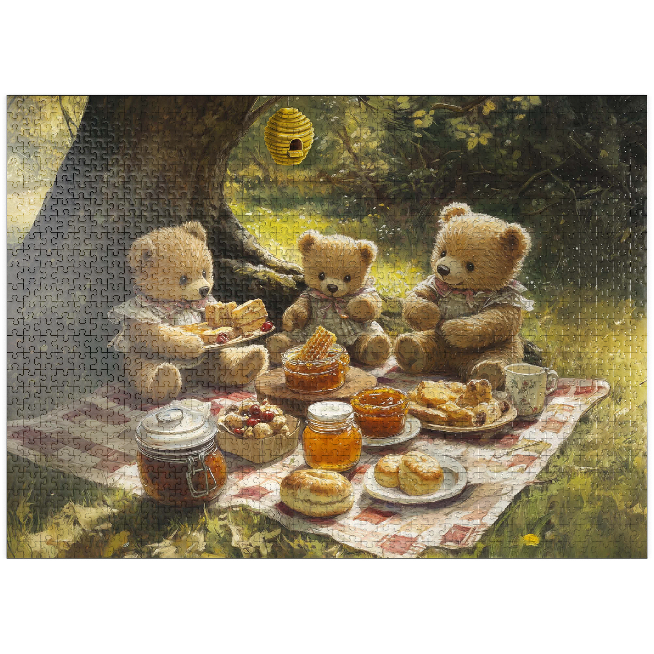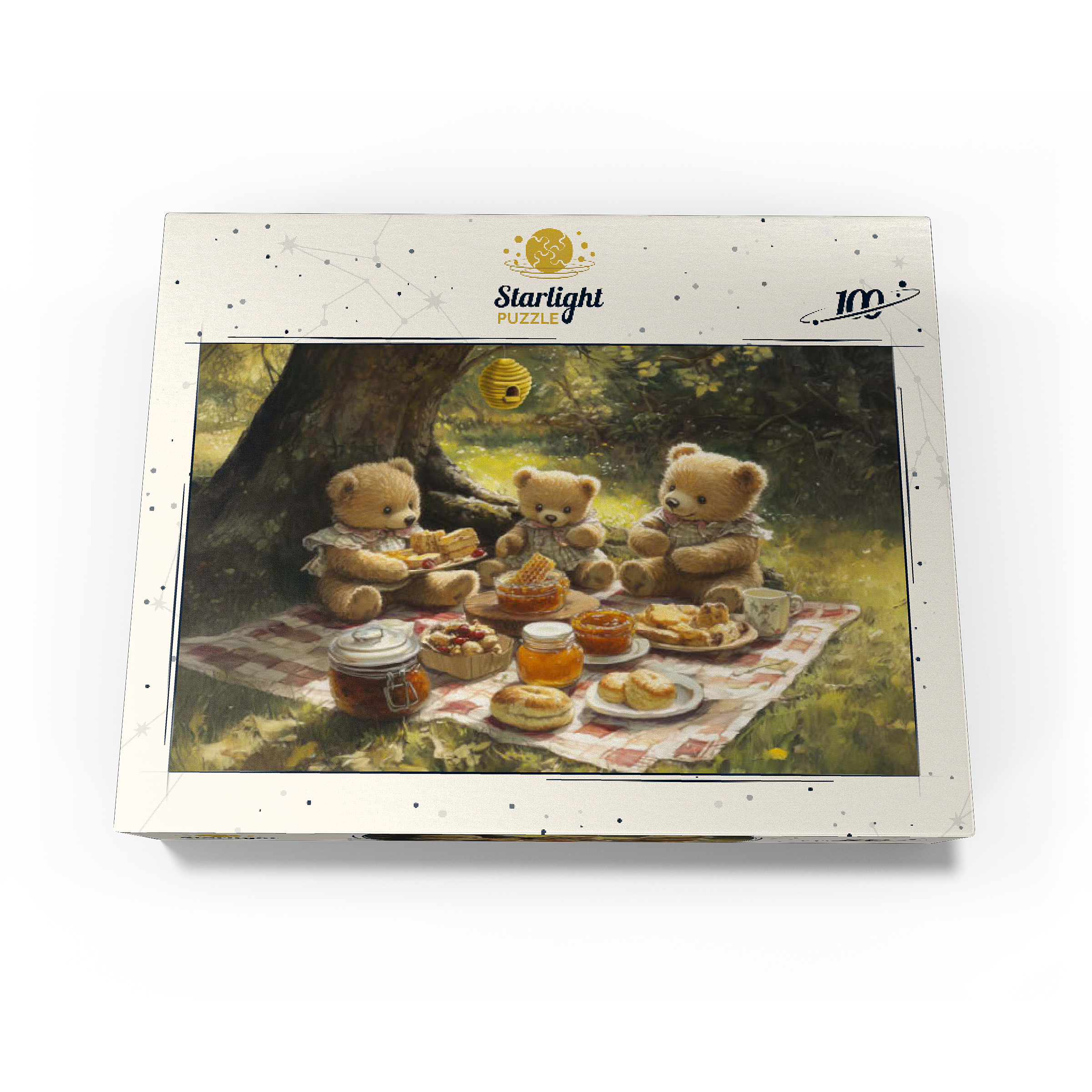 A heartwarming digital artwork of three adorable teddy bears enjoying a delightful picnic beneath the shade of a large tree. Dressed in charming vintage-style outfits with frilly collars, the bears sit on a classic red-and-white checkered blanket, surrounded by an assortment of delicious treats. The spread includes honeycomb, jam, scones, cake, and fresh berries, all presented in rustic jars and plates. A small beehive hangs from a branch, adding a whimsical touch to the sunlit forest setting. This enchanting scene is perfect for children's decor, nursery art, or anyone who loves nostalgic and whimsical illustrations.