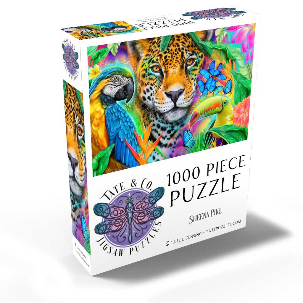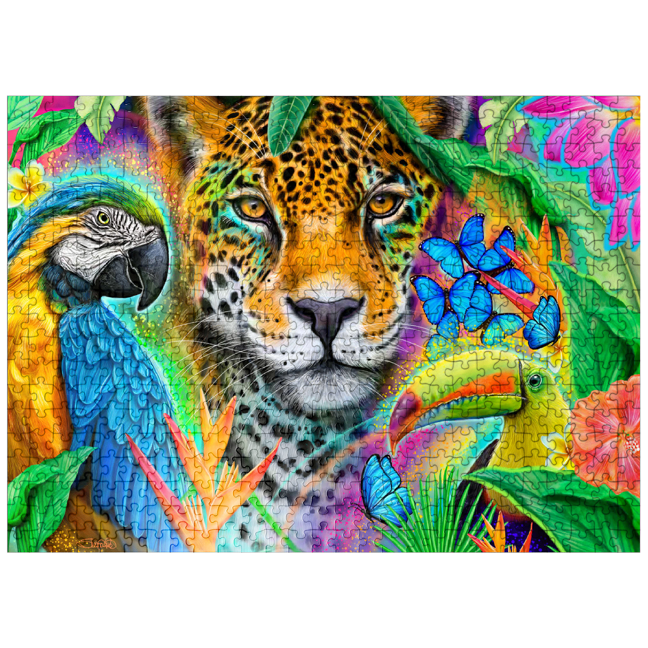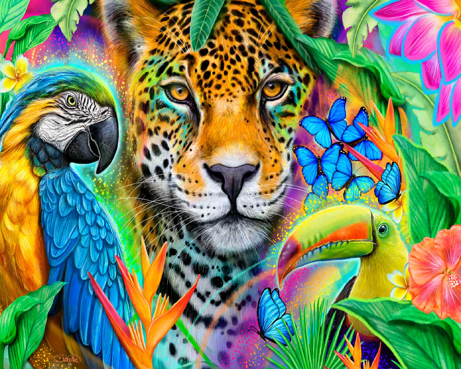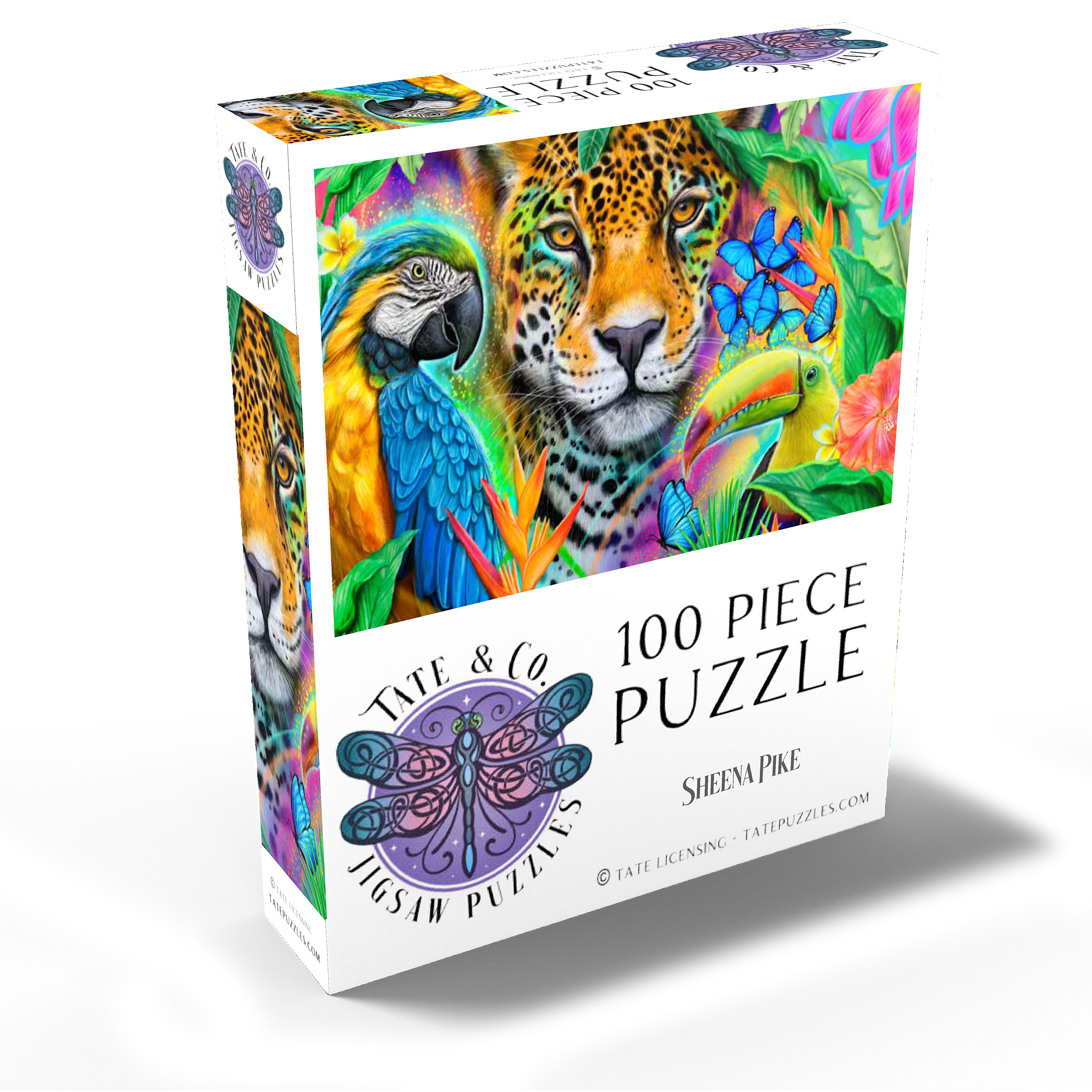 A vivid and striking illustration reminiscent of Sheena Pike's style. The scene depicts a neon-infused jungle teeming with life. A majestic leopard is the focal point, rendered with vibrant, eye-catching colors. It's accompanied by a brilliant Macaw and a playful Toucan, perched amidst lush tropical foliage and exotic, vividly colored flowers. The overall composition highlights the beauty and biodiversity of the rainforest through a striking and modern artistic lens. The use of neon accents creates a vibrant and surreal atmosphere.