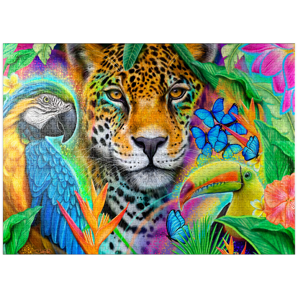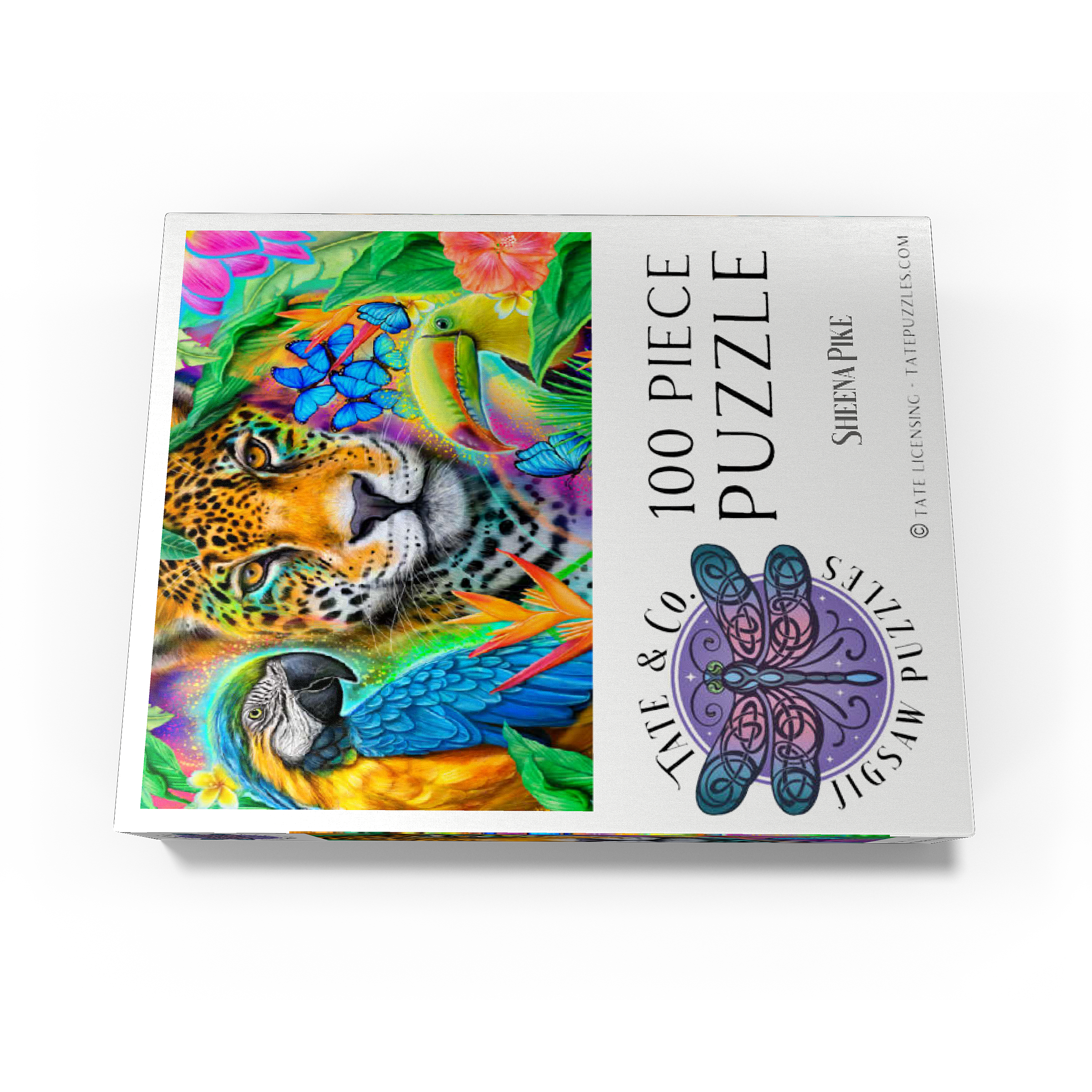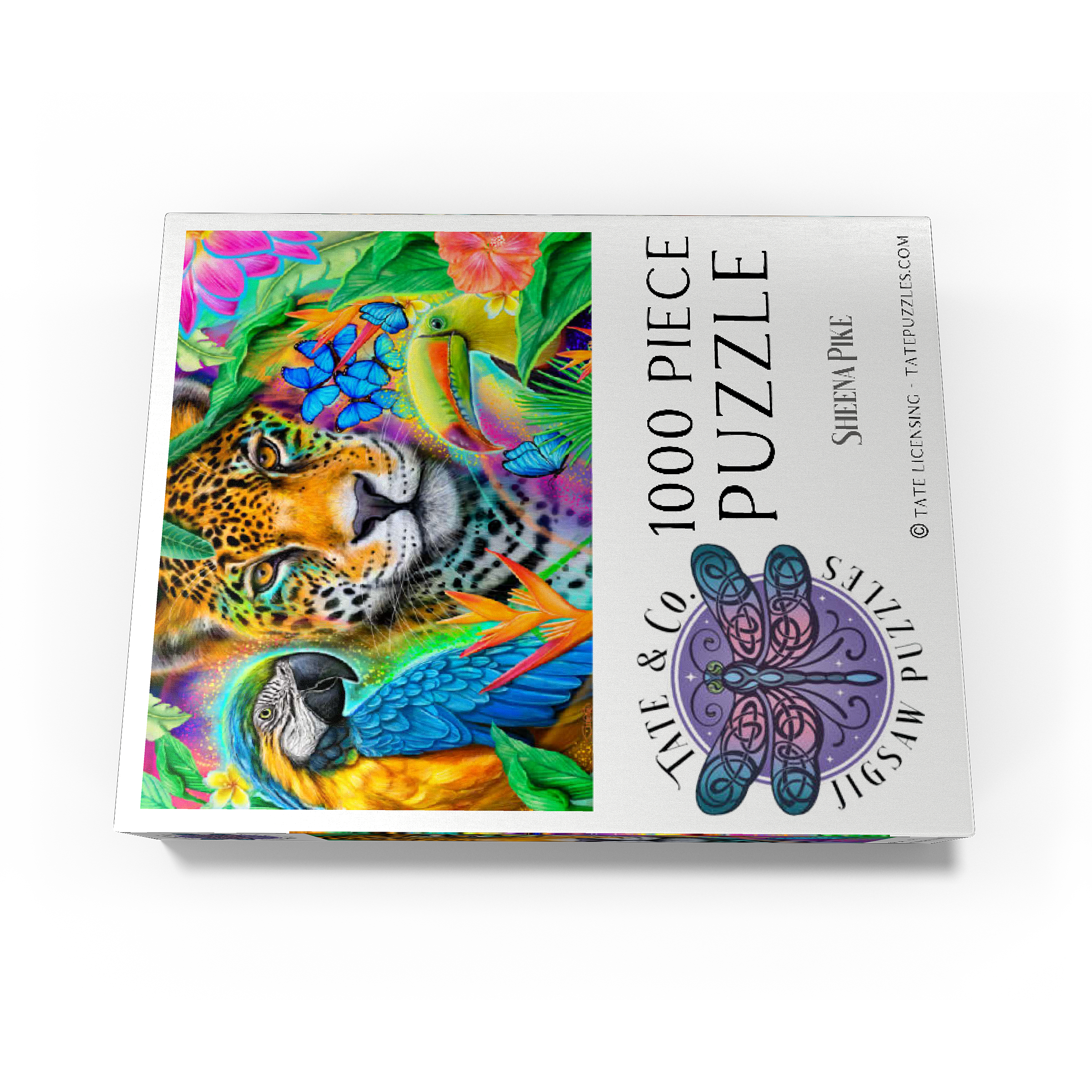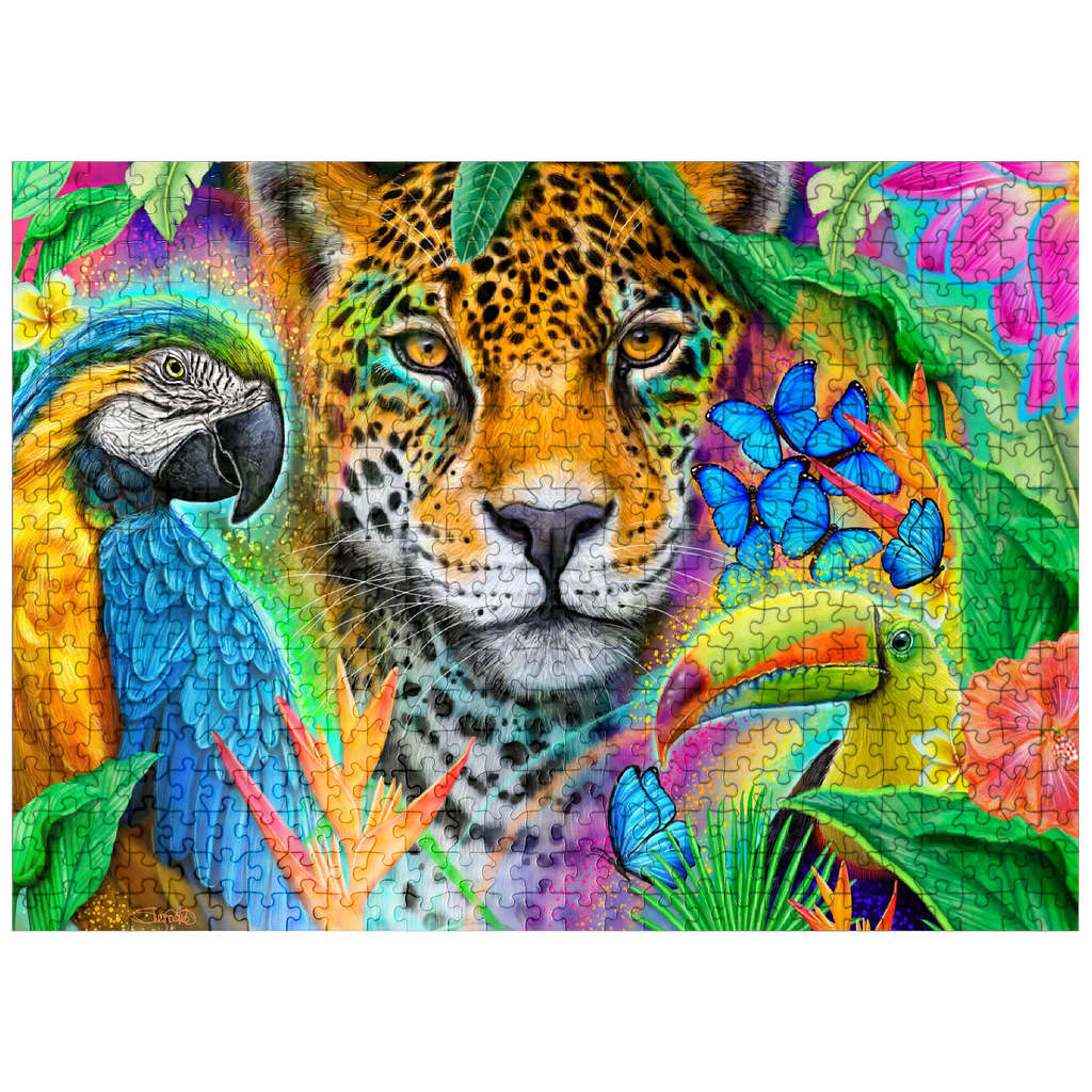 A vivid and striking illustration reminiscent of Sheena Pike's style. The scene depicts a neon-infused jungle teeming with life. A majestic leopard is the focal point, rendered with vibrant, eye-catching colors. It's accompanied by a brilliant Macaw and a playful Toucan, perched amidst lush tropical foliage and exotic, vividly colored flowers. The overall composition highlights the beauty and biodiversity of the rainforest through a striking and modern artistic lens. The use of neon accents creates a vibrant and surreal atmosphere.