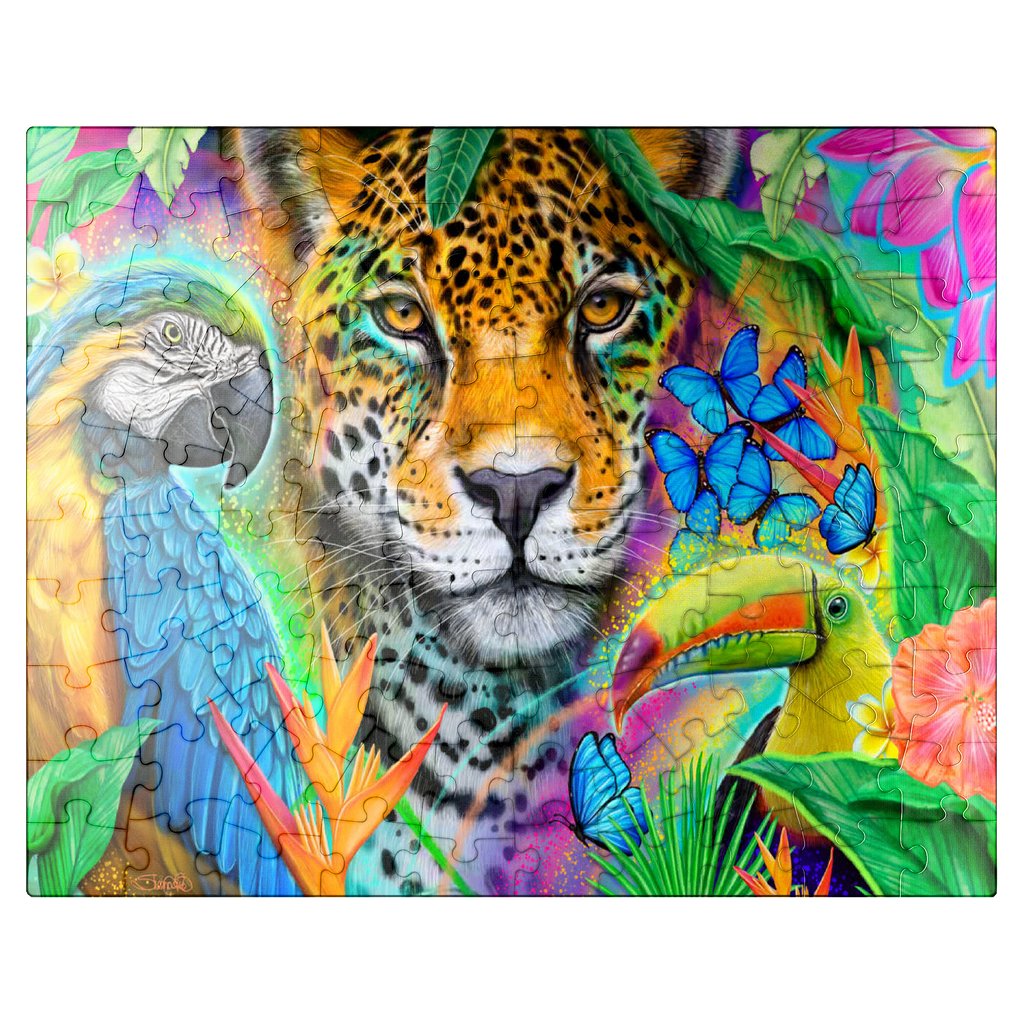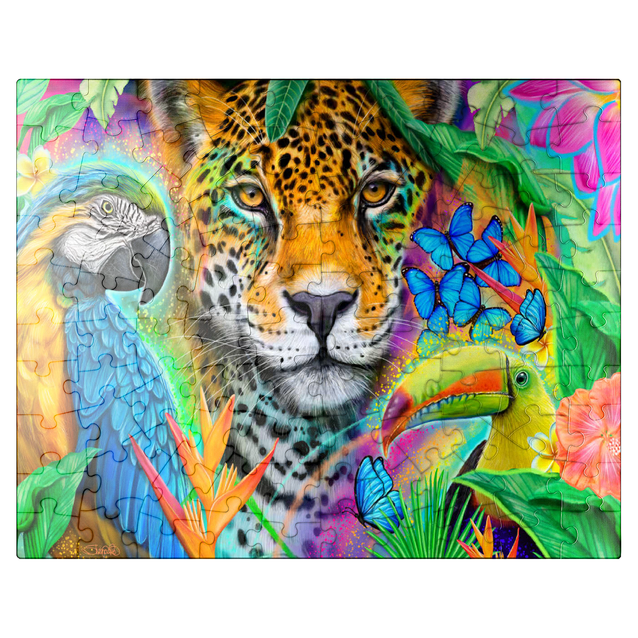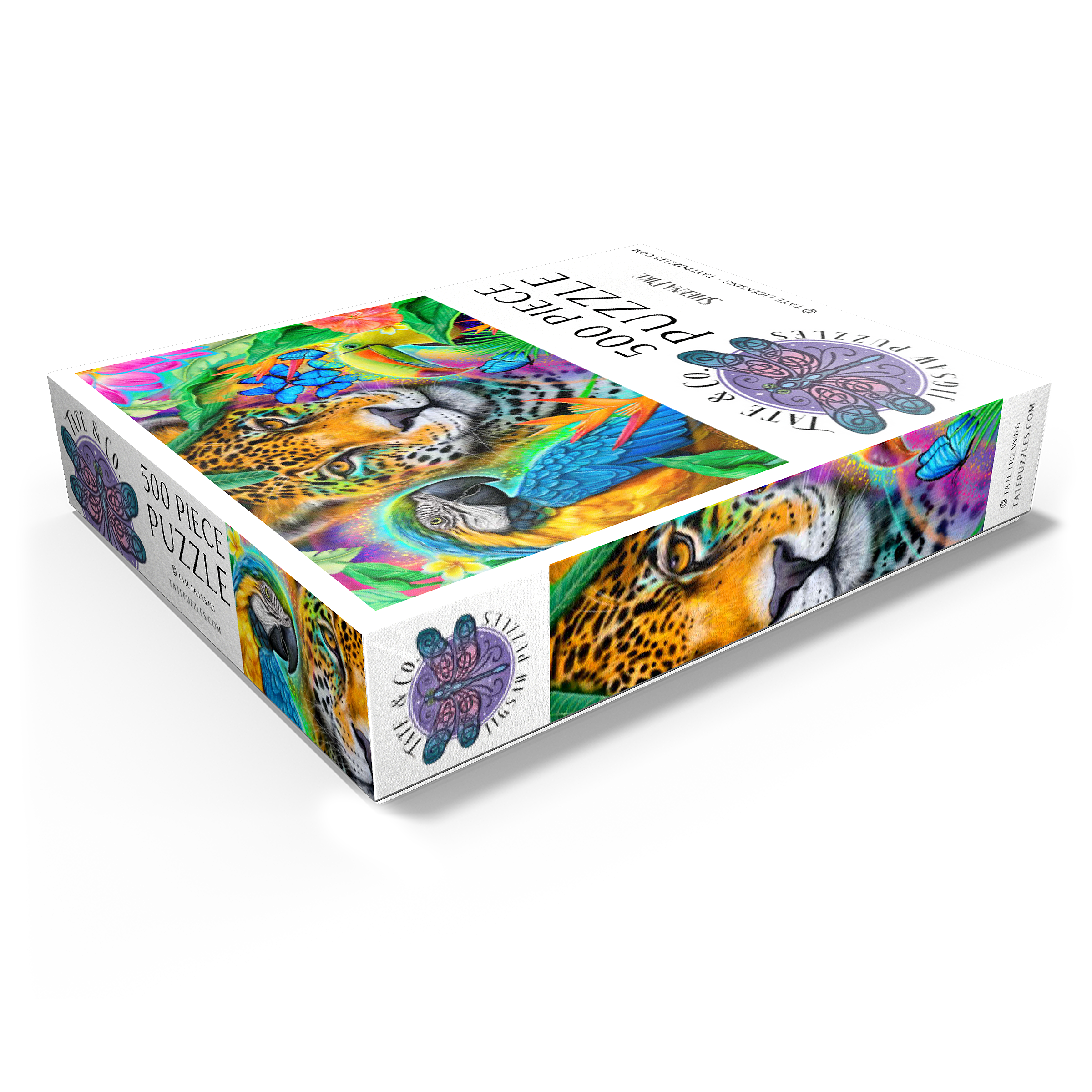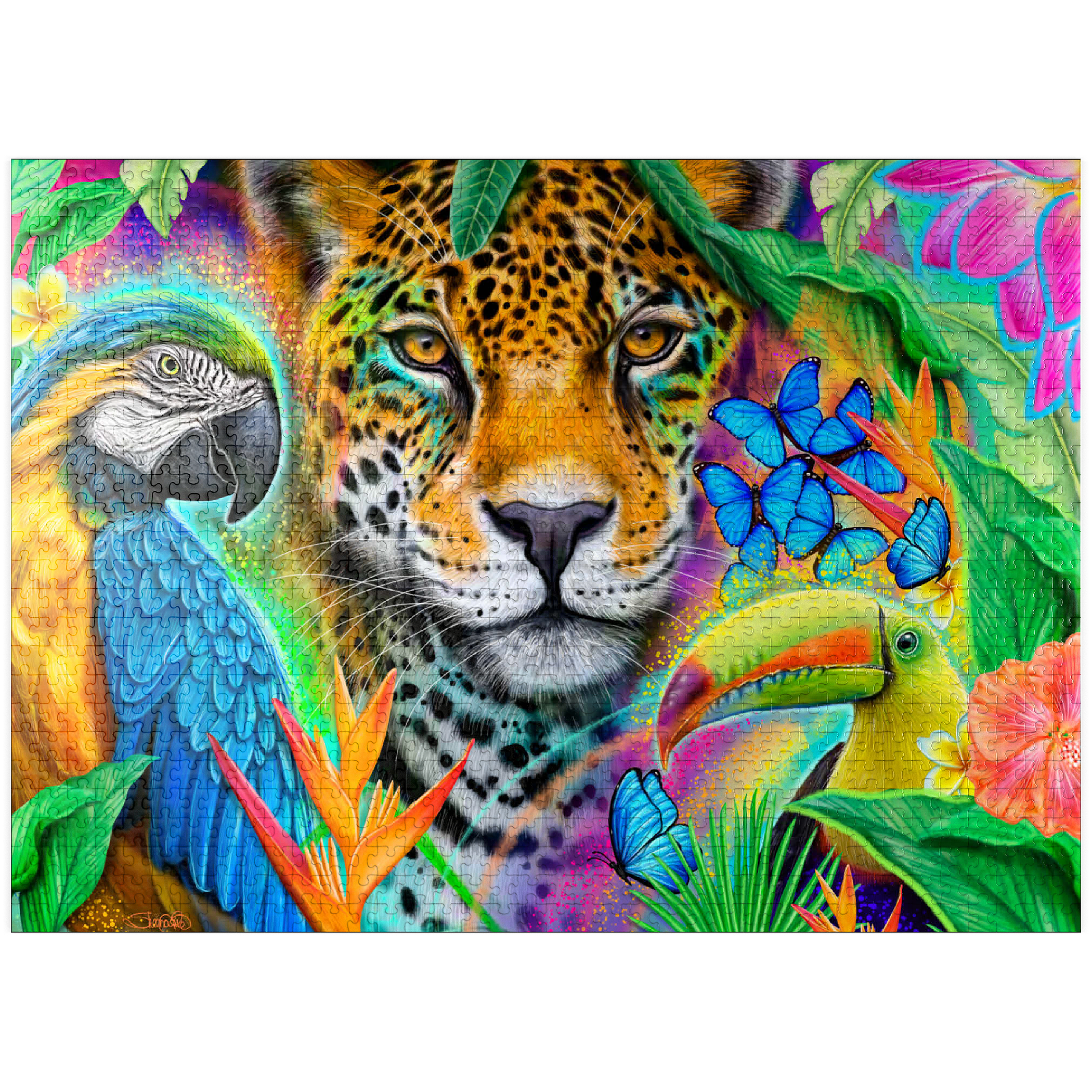 A vivid and striking illustration reminiscent of Sheena Pike's style. The scene depicts a neon-infused jungle teeming with life. A majestic leopard is the focal point, rendered with vibrant, eye-catching colors. It's accompanied by a brilliant Macaw and a playful Toucan, perched amidst lush tropical foliage and exotic, vividly colored flowers. The overall composition highlights the beauty and biodiversity of the rainforest through a striking and modern artistic lens. The use of neon accents creates a vibrant and surreal atmosphere.