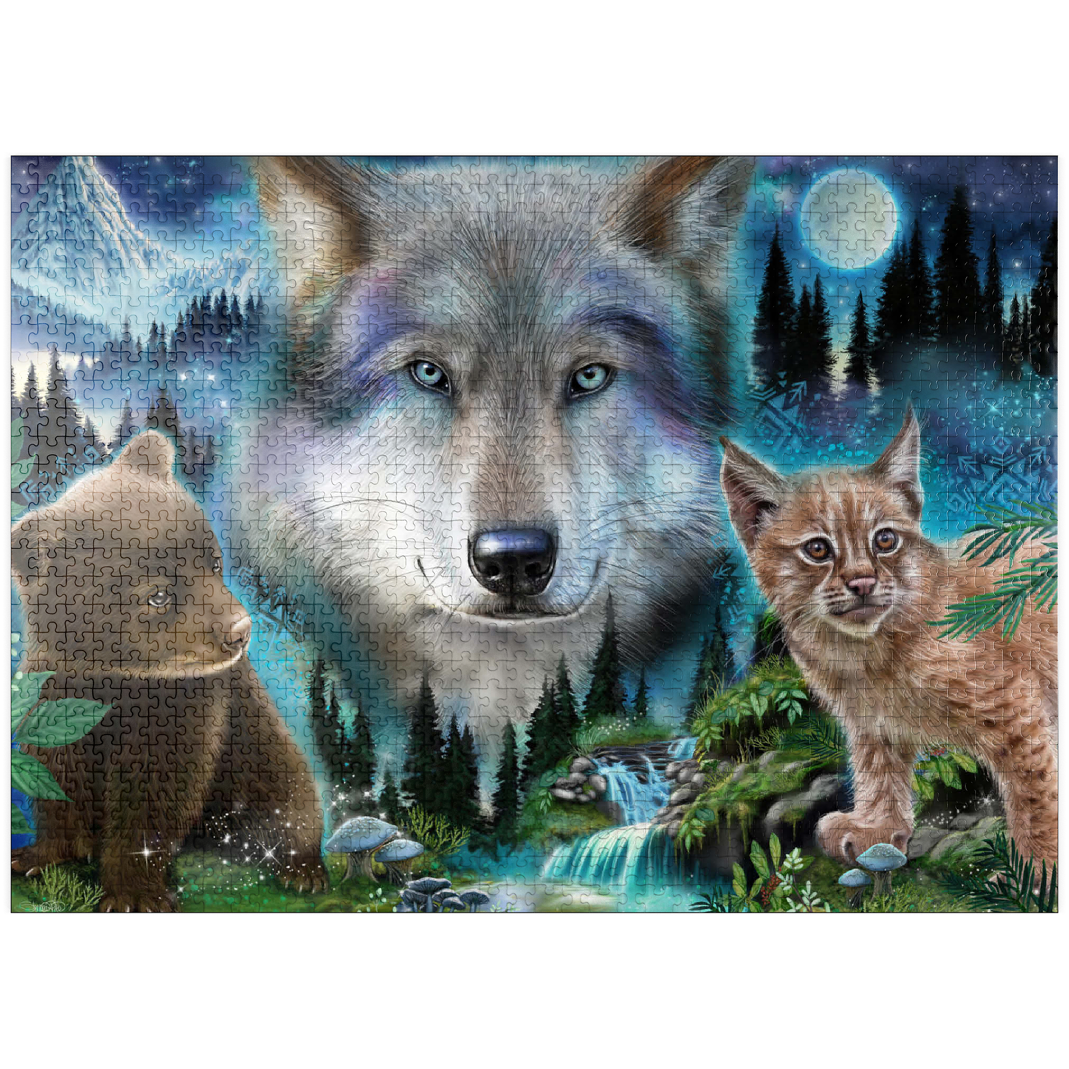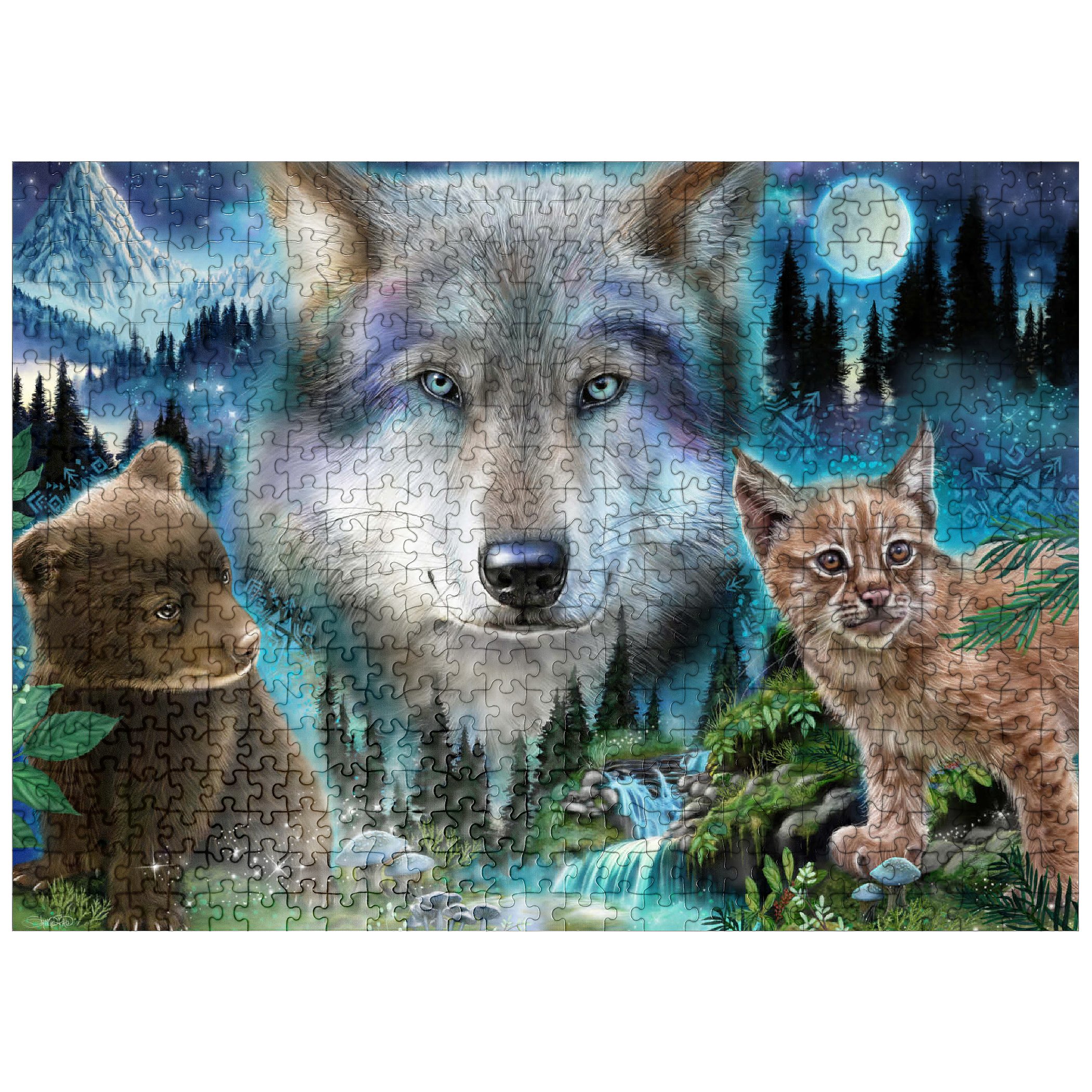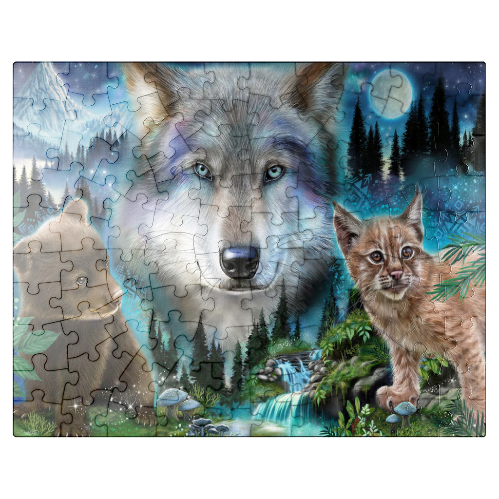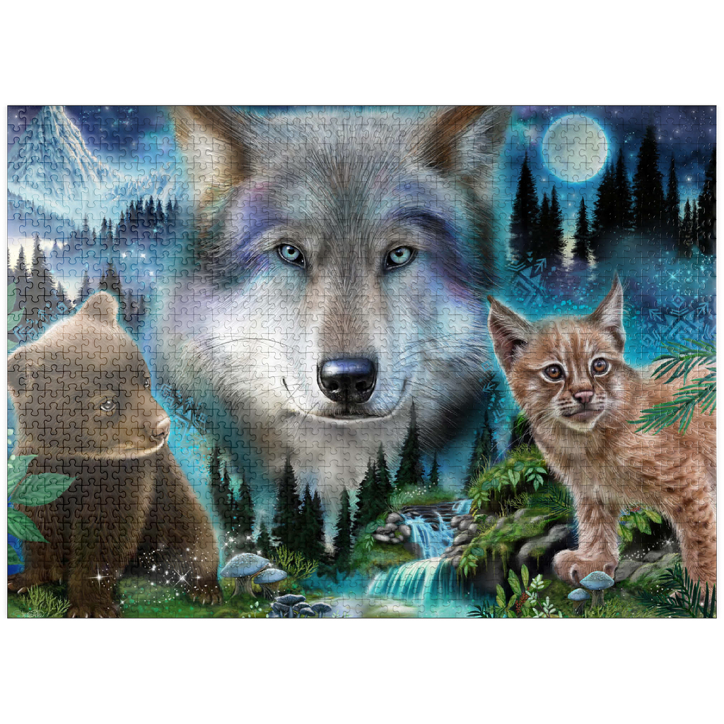 Immerse yourself in the enchanting wilderness with this stunning wildlife puzzle, by Sheena Pike featuring a majestic wolf, a playful bear cub, and a curious lynx. Set against a breathtaking backdrop of misty forests, cascading waterfalls, and a glowing moon, this puzzle captures the serene beauty of nature. The vibrant colors of the animals' fur and the mystical ambiance of the forest evoke a sense of wonder and tranquility. Ideal for nature enthusiasts and puzzle lovers alike, this captivating scene offers a relaxing challenge that transports you into the heart of the wild. Perfect for cozy evenings or as a thoughtful gift for those who appreciate the beauty of the natural world.