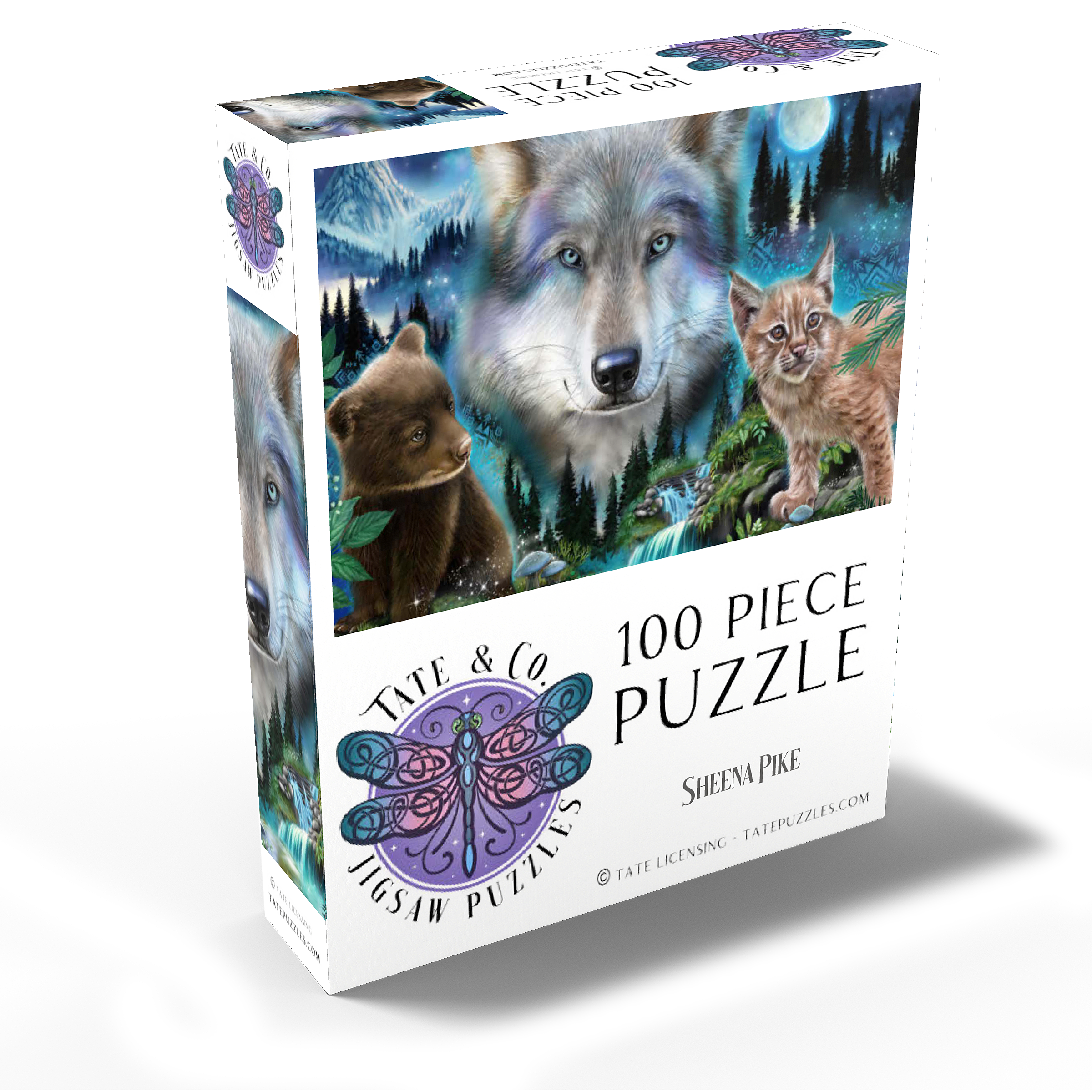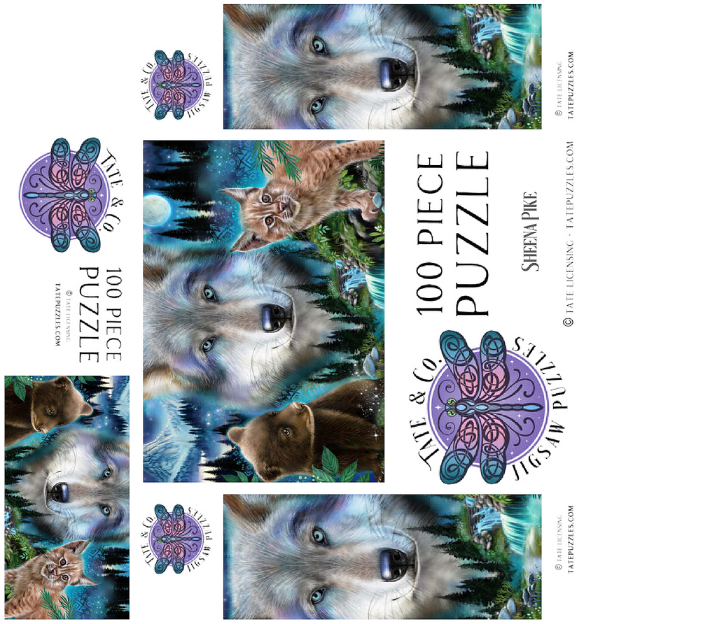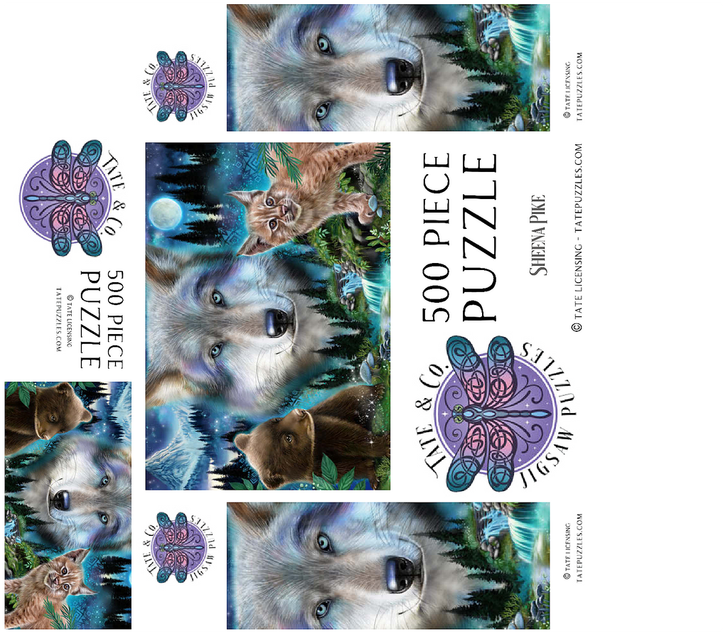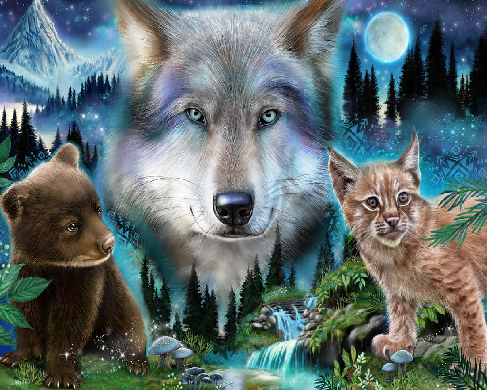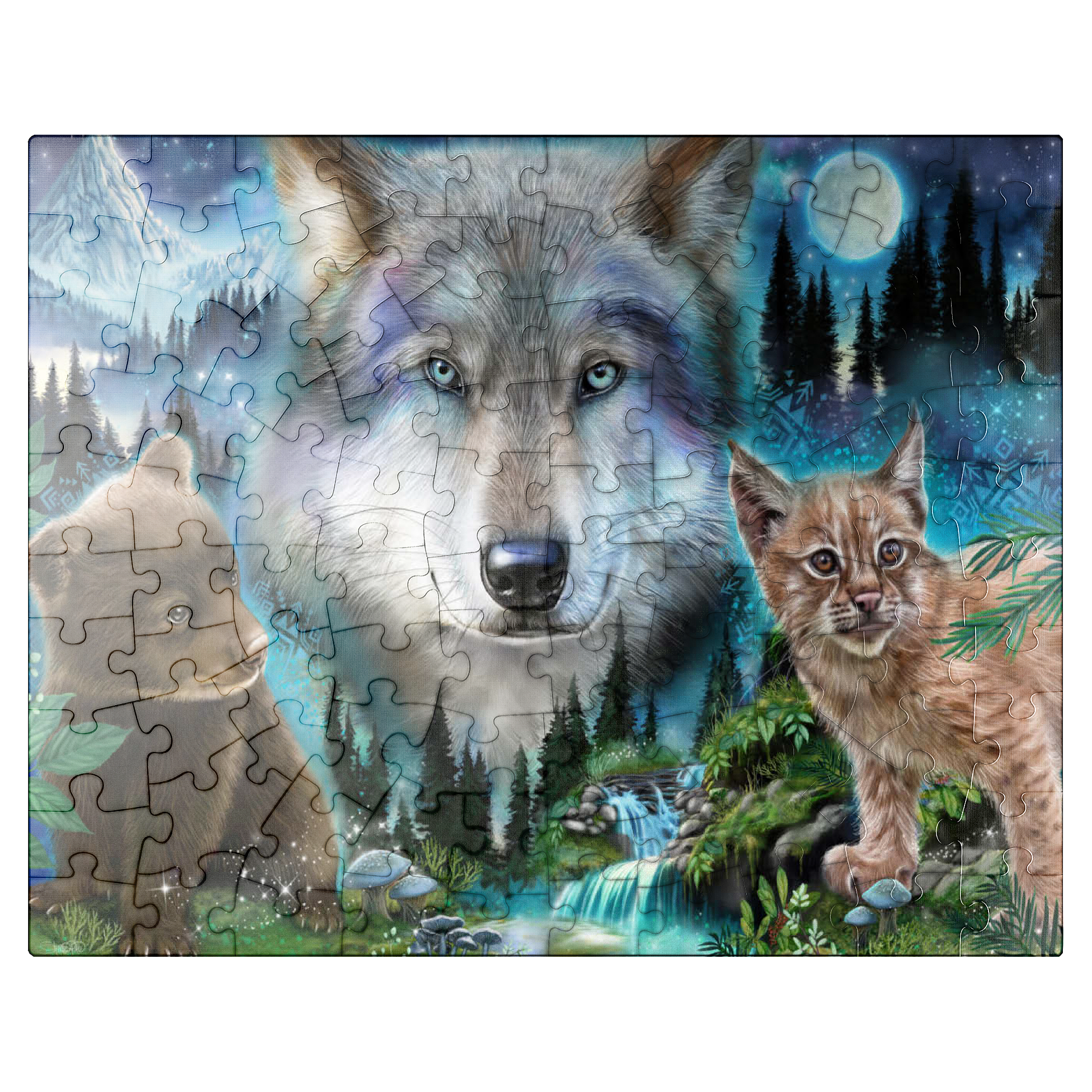 Immerse yourself in the enchanting wilderness with this stunning wildlife puzzle, by Sheena Pike featuring a majestic wolf, a playful bear cub, and a curious lynx. Set against a breathtaking backdrop of misty forests, cascading waterfalls, and a glowing moon, this puzzle captures the serene beauty of nature. The vibrant colors of the animals' fur and the mystical ambiance of the forest evoke a sense of wonder and tranquility. Ideal for nature enthusiasts and puzzle lovers alike, this captivating scene offers a relaxing challenge that transports you into the heart of the wild. Perfect for cozy evenings or as a thoughtful gift for those who appreciate the beauty of the natural world.