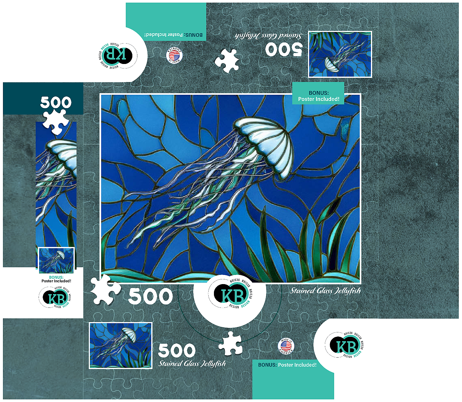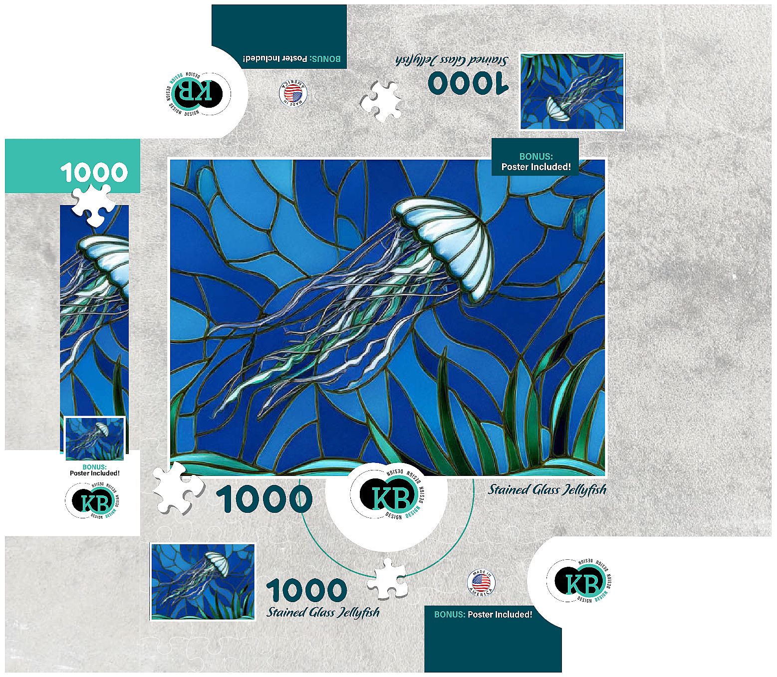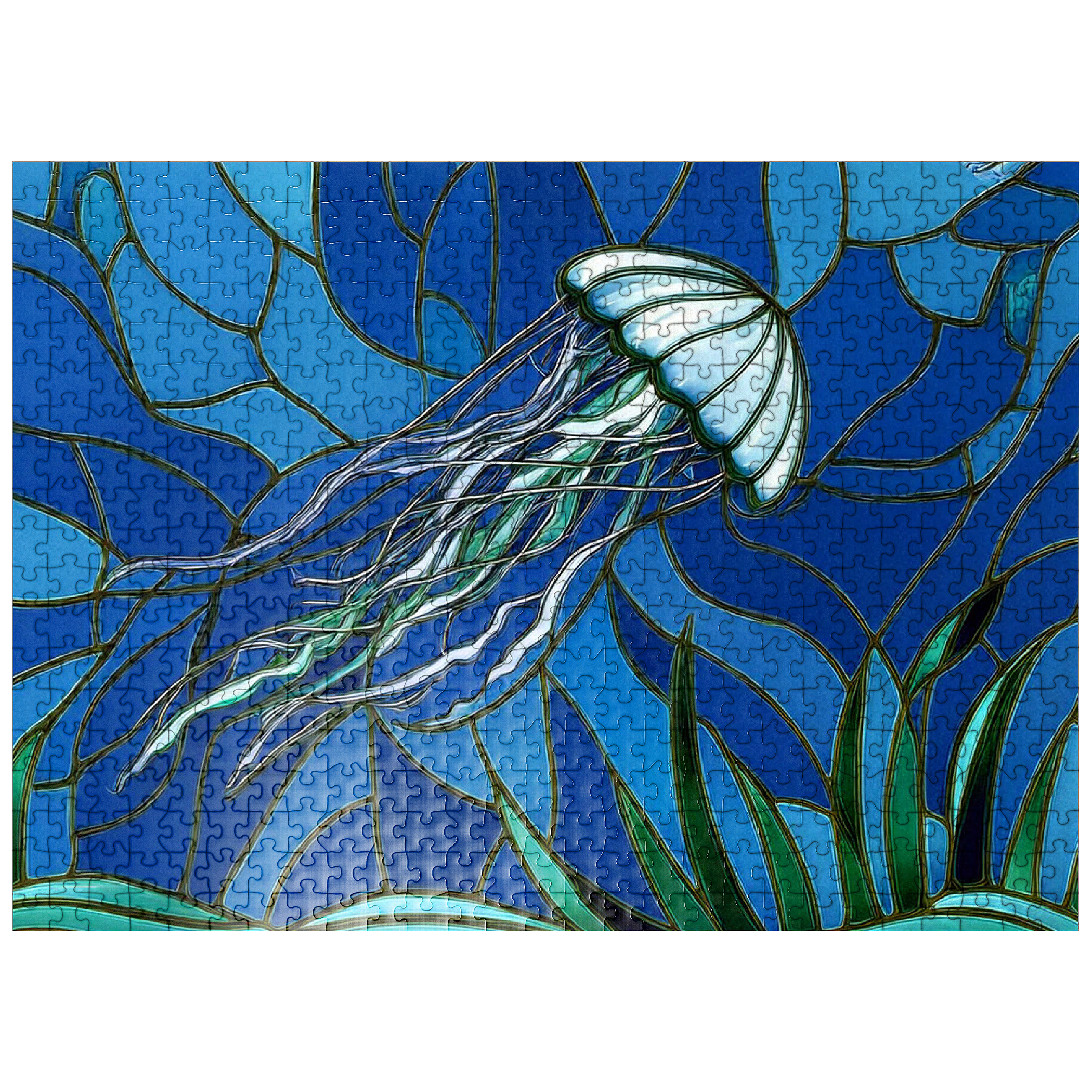 The abstract stained glass collection is a unique way to display some of your favorite subjects in artistic fashion. Designed to mimic the beauty of a stained glass window with bold panels of color-this jellyfish is a must-have for any wall. Choose from many other puzzles in this collection and display them all together to bring brilliant hues of abstract color into your home.