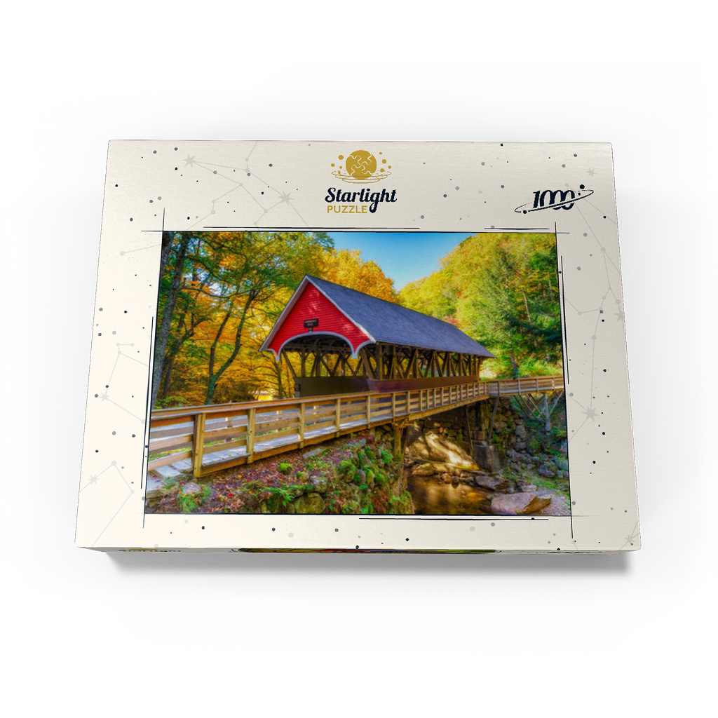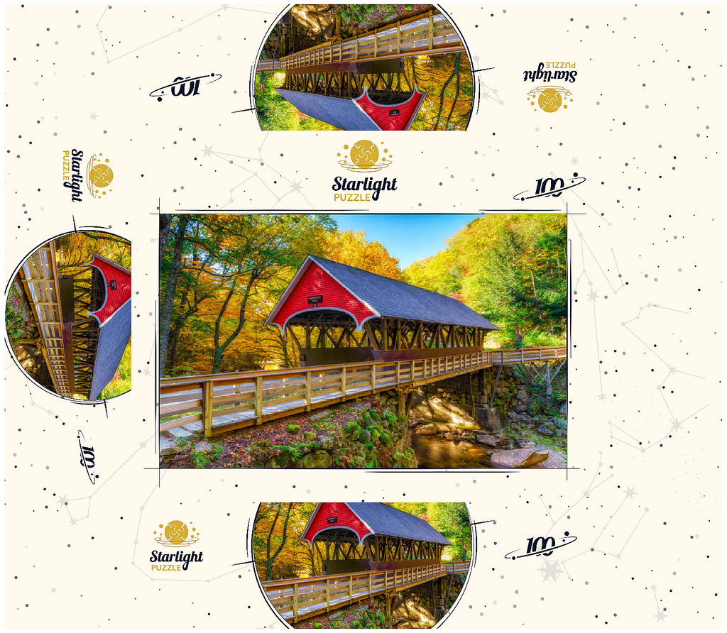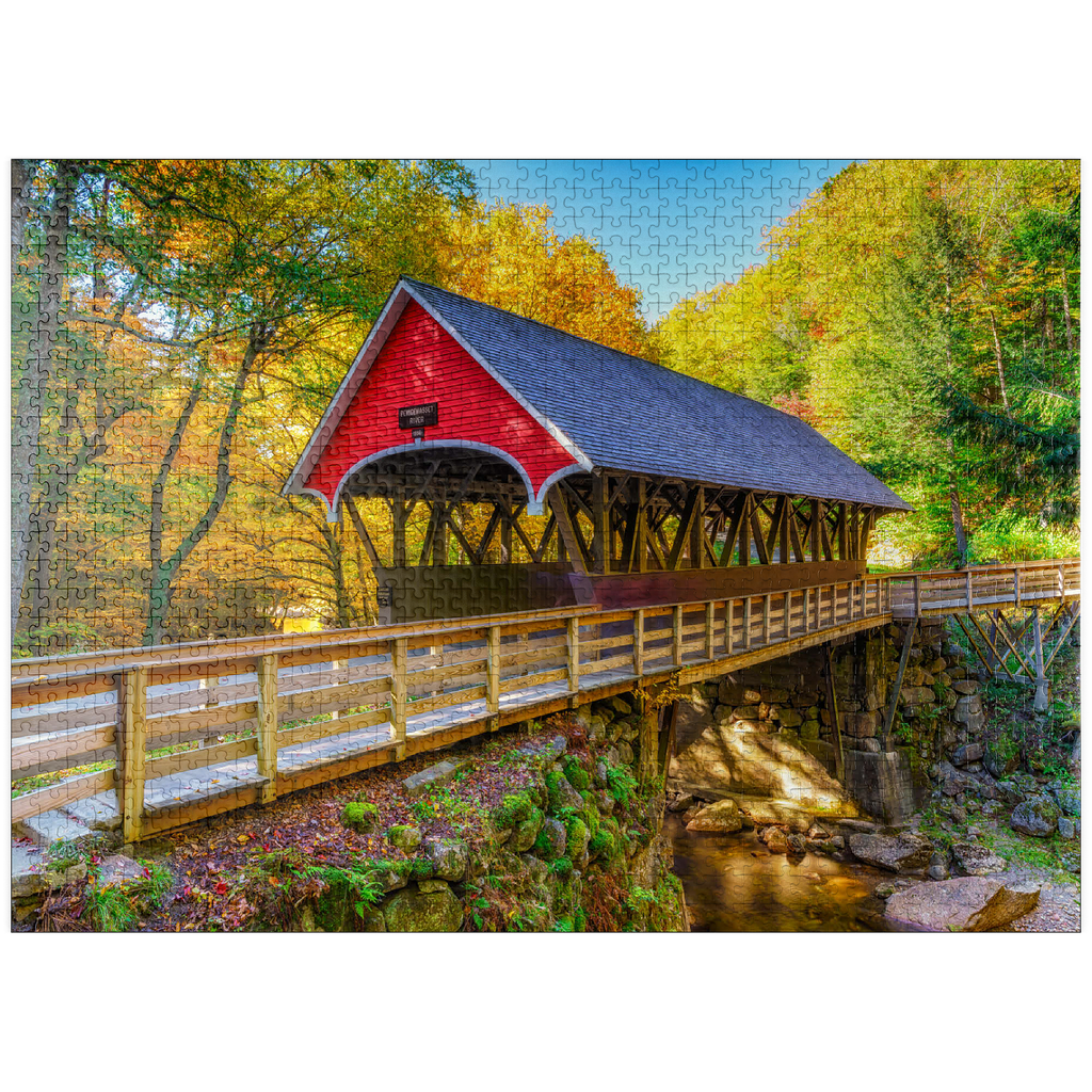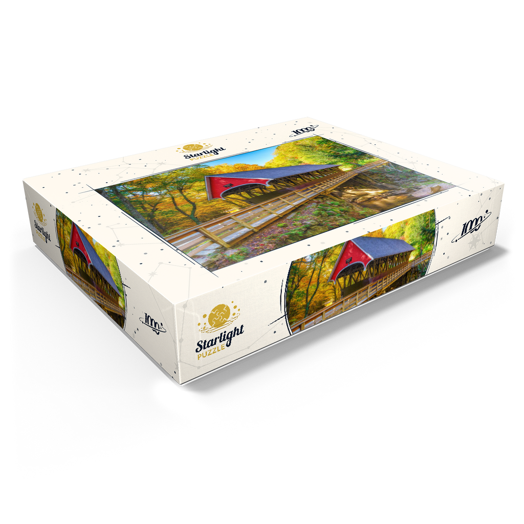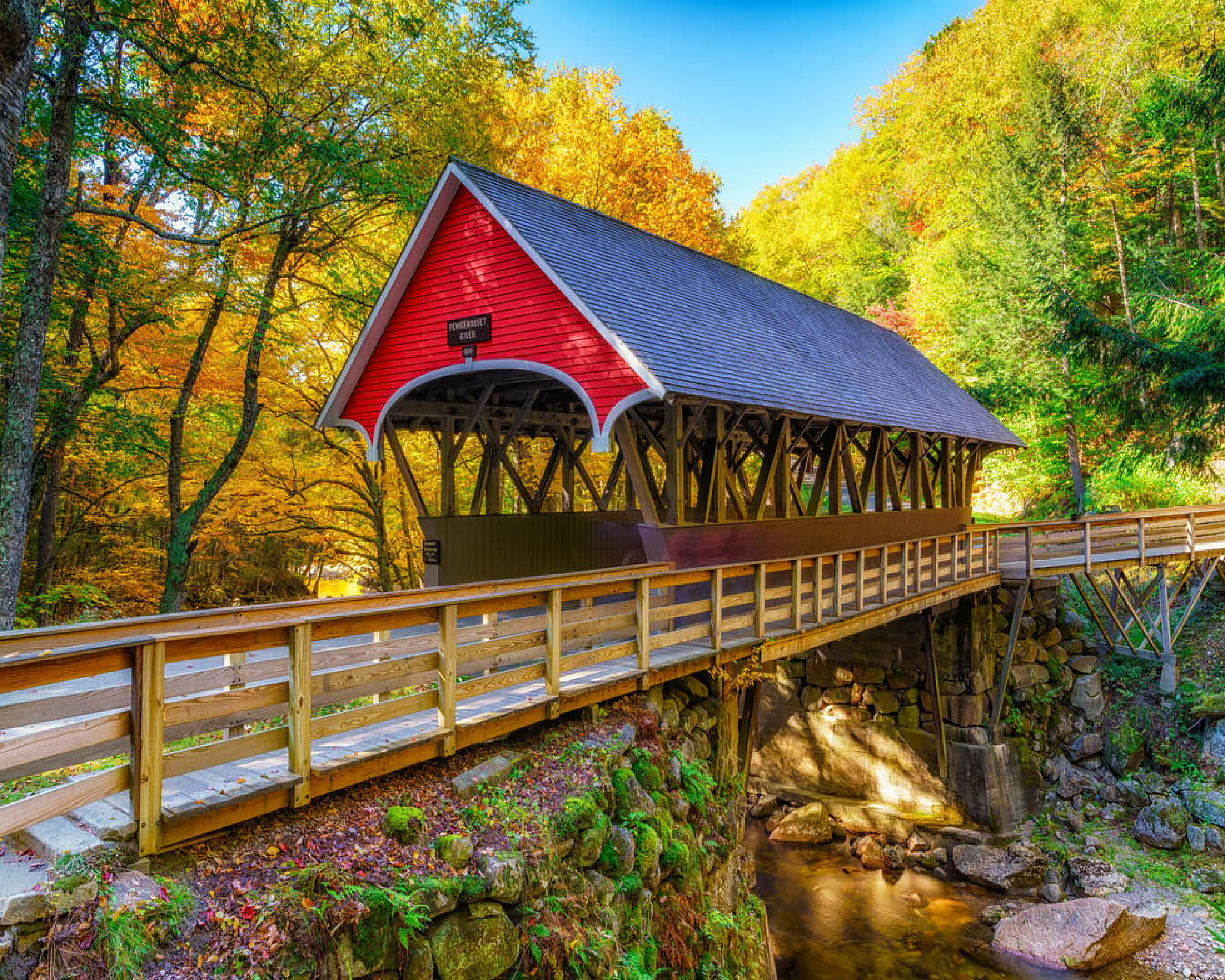 This picturesque scene showcases a classic red covered bridge nestled amidst a vibrant autumn landscape. The bridge, with its timeless wooden architecture, spans a tranquil stream surrounded by golden and orange foliage. Sunlight filters through the trees, illuminating the lush greenery and moss-covered rocks below. A rustic wooden walkway leads to the bridge, inviting visitors to experience the serene beauty of this charming, historic setting.