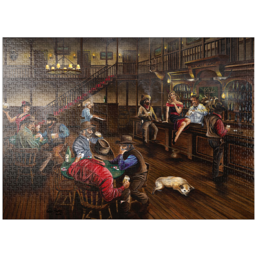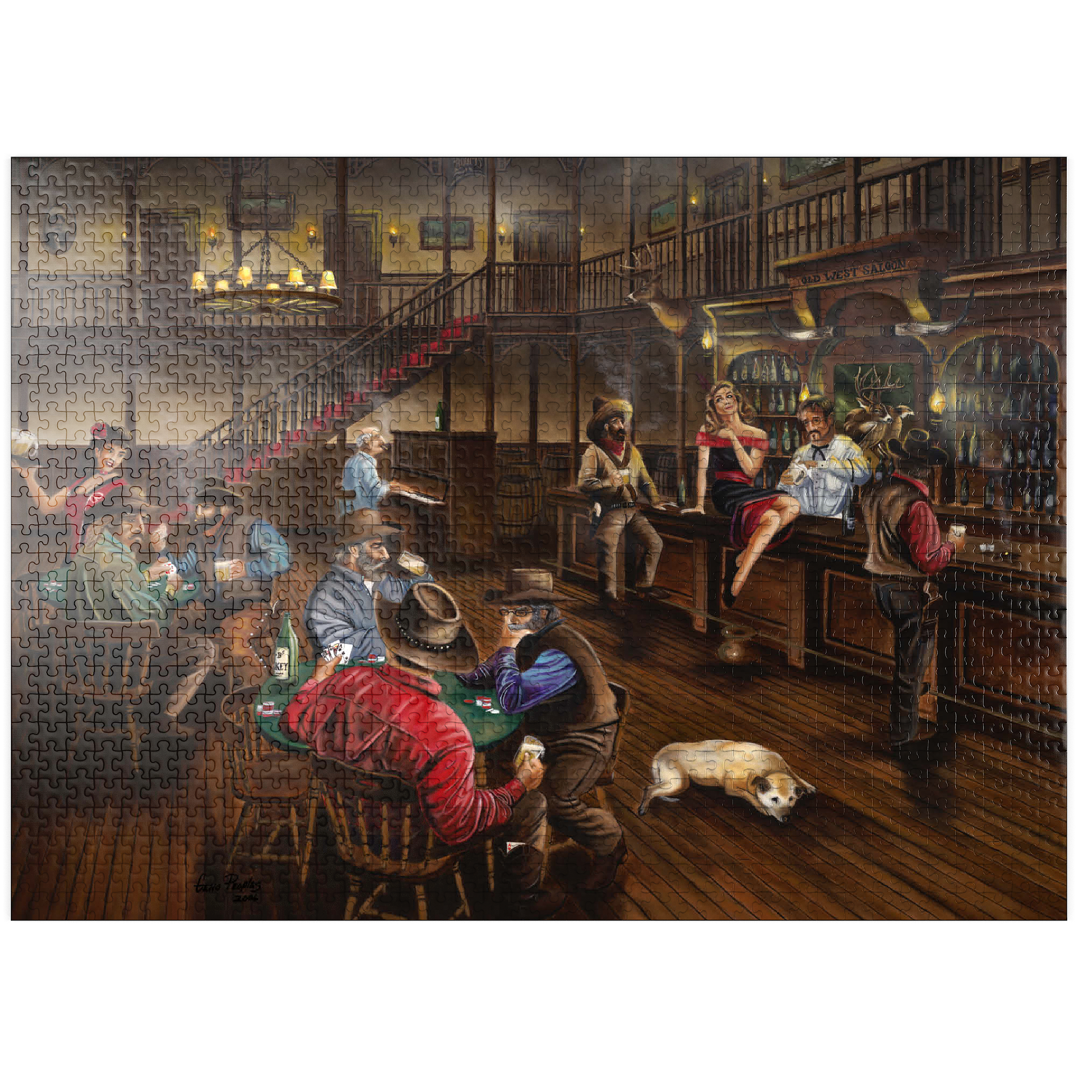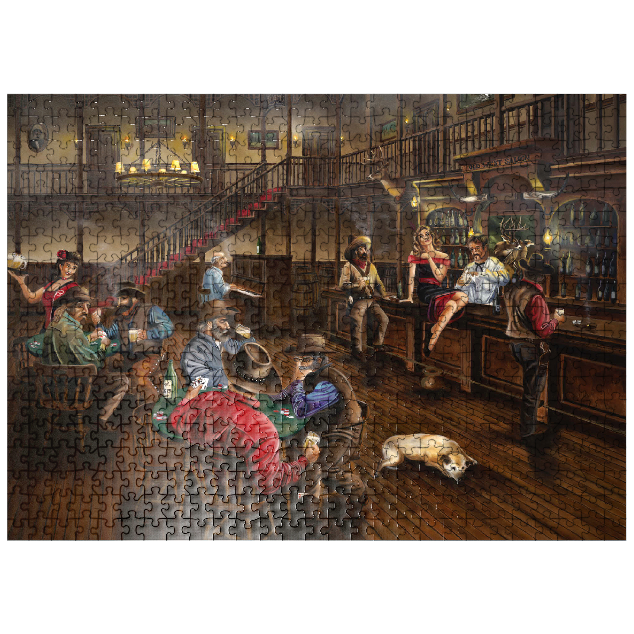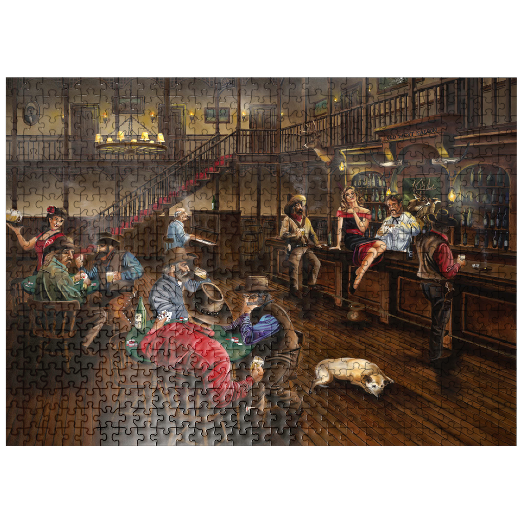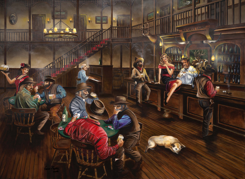 This richly detailed artwork captures a vibrant scene inside a classic Old West saloon. Cowboys gather around card tables, engaged in intense poker games and sharing drinks, while a lively bartender serves up whiskey behind a well-stocked bar. A piano player adds musical charm in the background, and a showgirl in red draws attention with her poised allure. Taxidermy decor, wooden interiors, chandeliers, and a staircase leading to upstairs rooms all contribute to the authentic Western ambiance. The relaxed presence of a sleeping dog adds a touch of calm to the otherwise bustling environment of camaraderie and mischief.