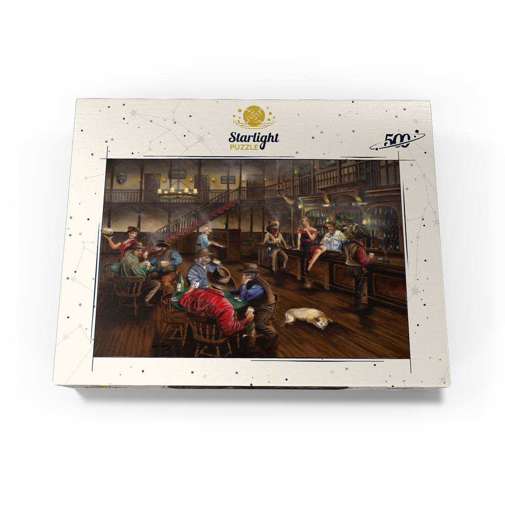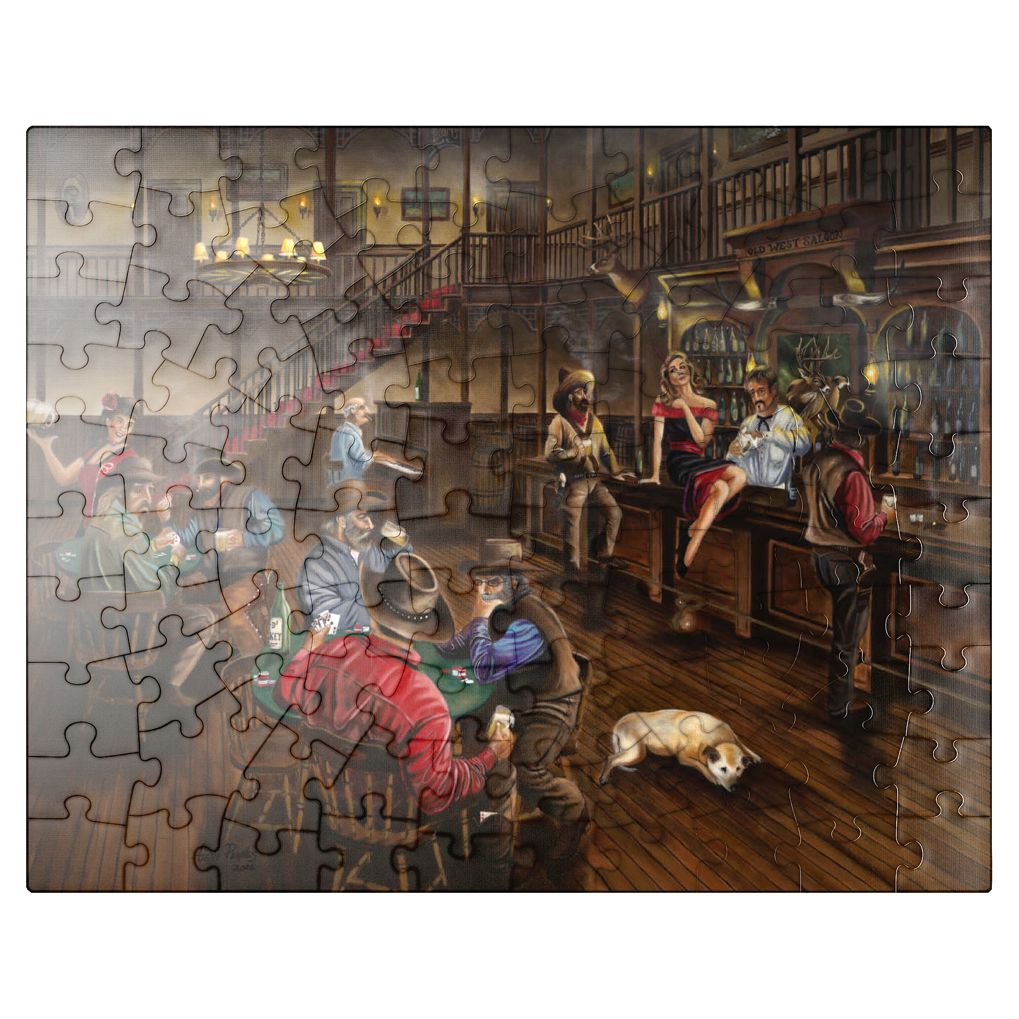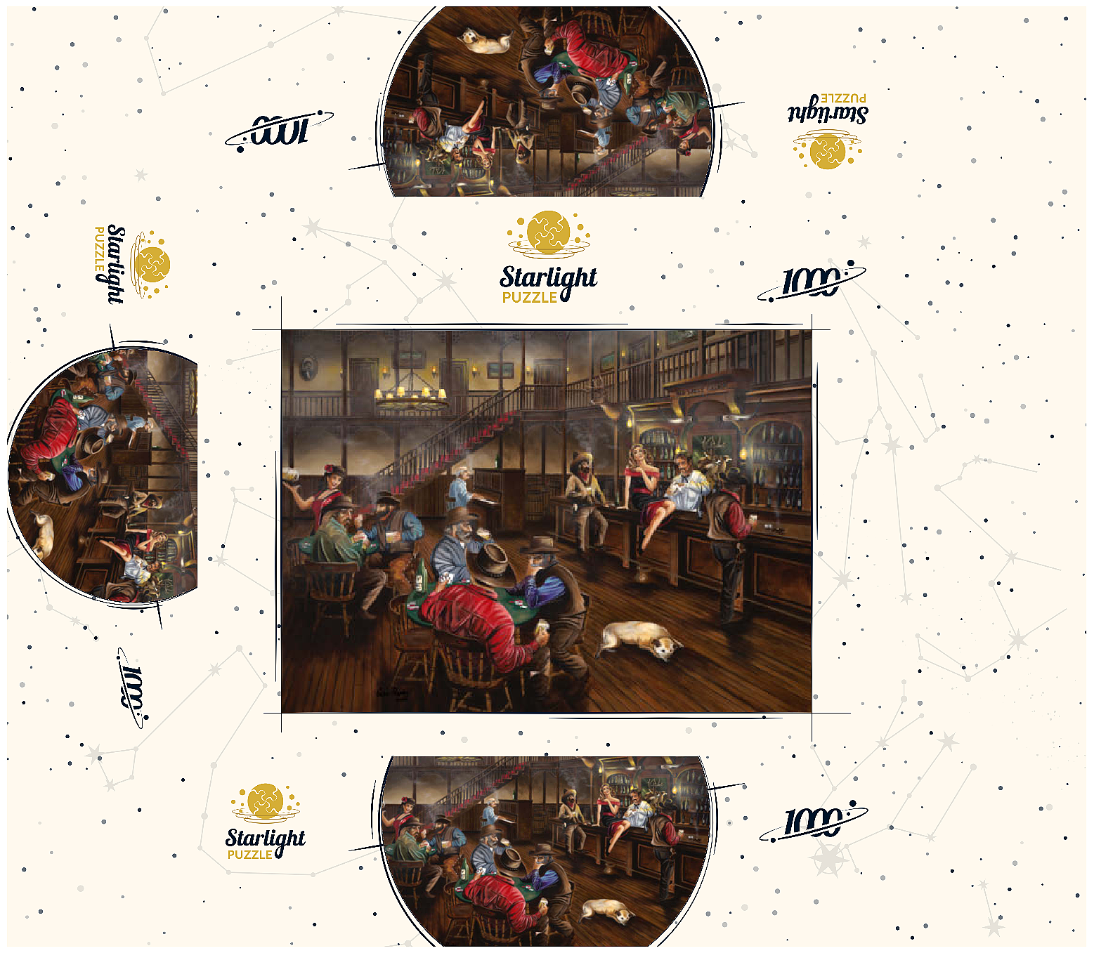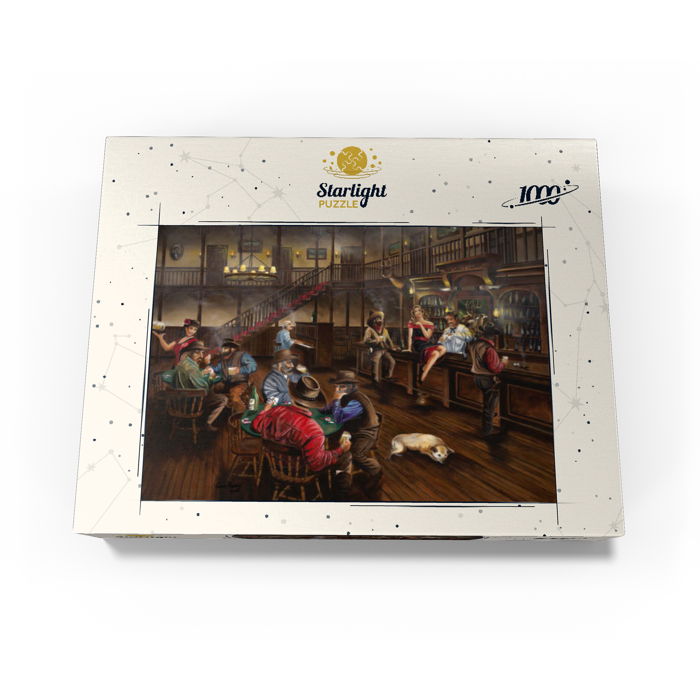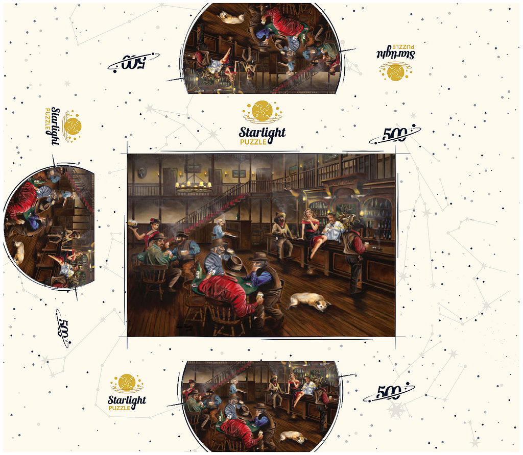 This richly detailed artwork captures a vibrant scene inside a classic Old West saloon. Cowboys gather around card tables, engaged in intense poker games and sharing drinks, while a lively bartender serves up whiskey behind a well-stocked bar. A piano player adds musical charm in the background, and a showgirl in red draws attention with her poised allure. Taxidermy decor, wooden interiors, chandeliers, and a staircase leading to upstairs rooms all contribute to the authentic Western ambiance. The relaxed presence of a sleeping dog adds a touch of calm to the otherwise bustling environment of camaraderie and mischief.