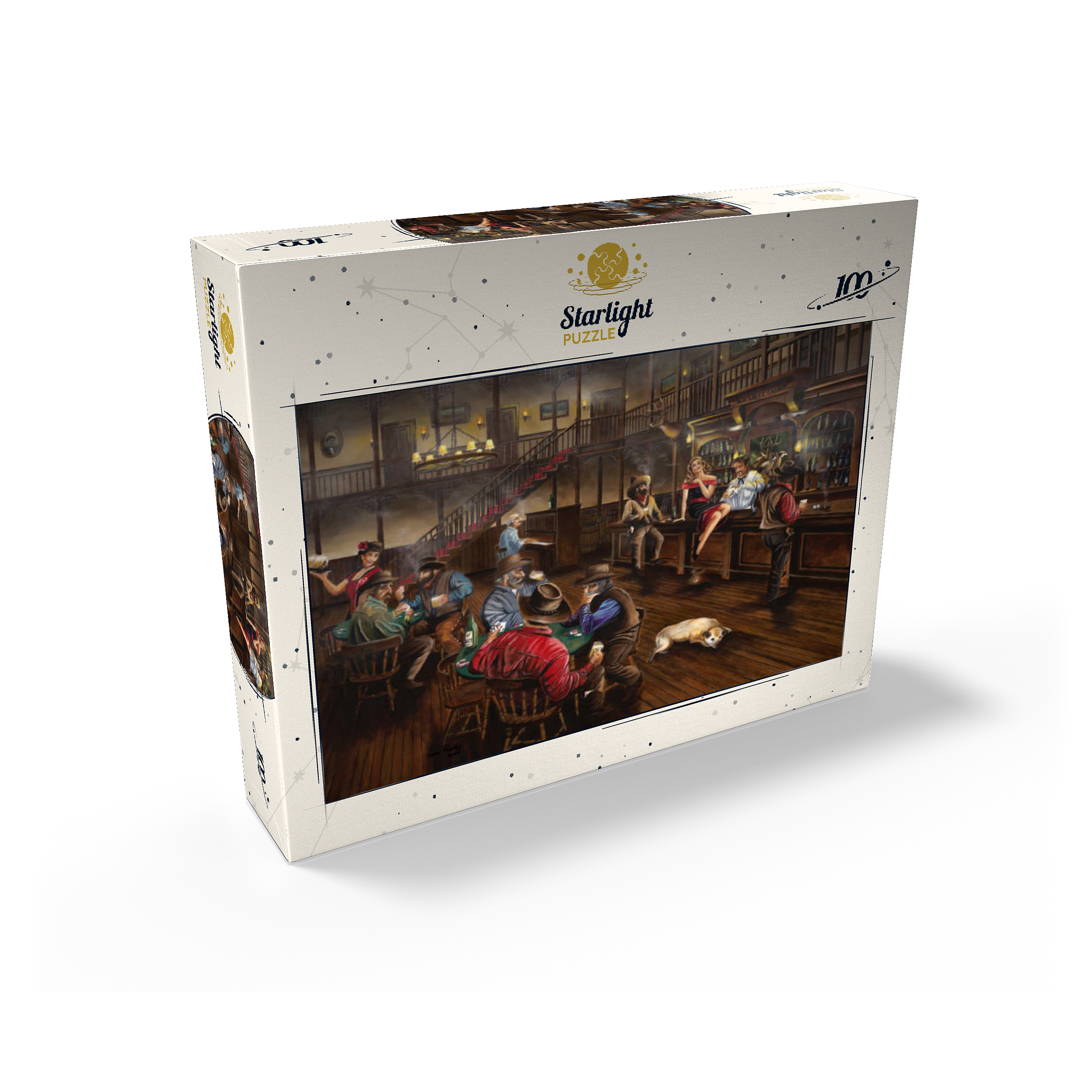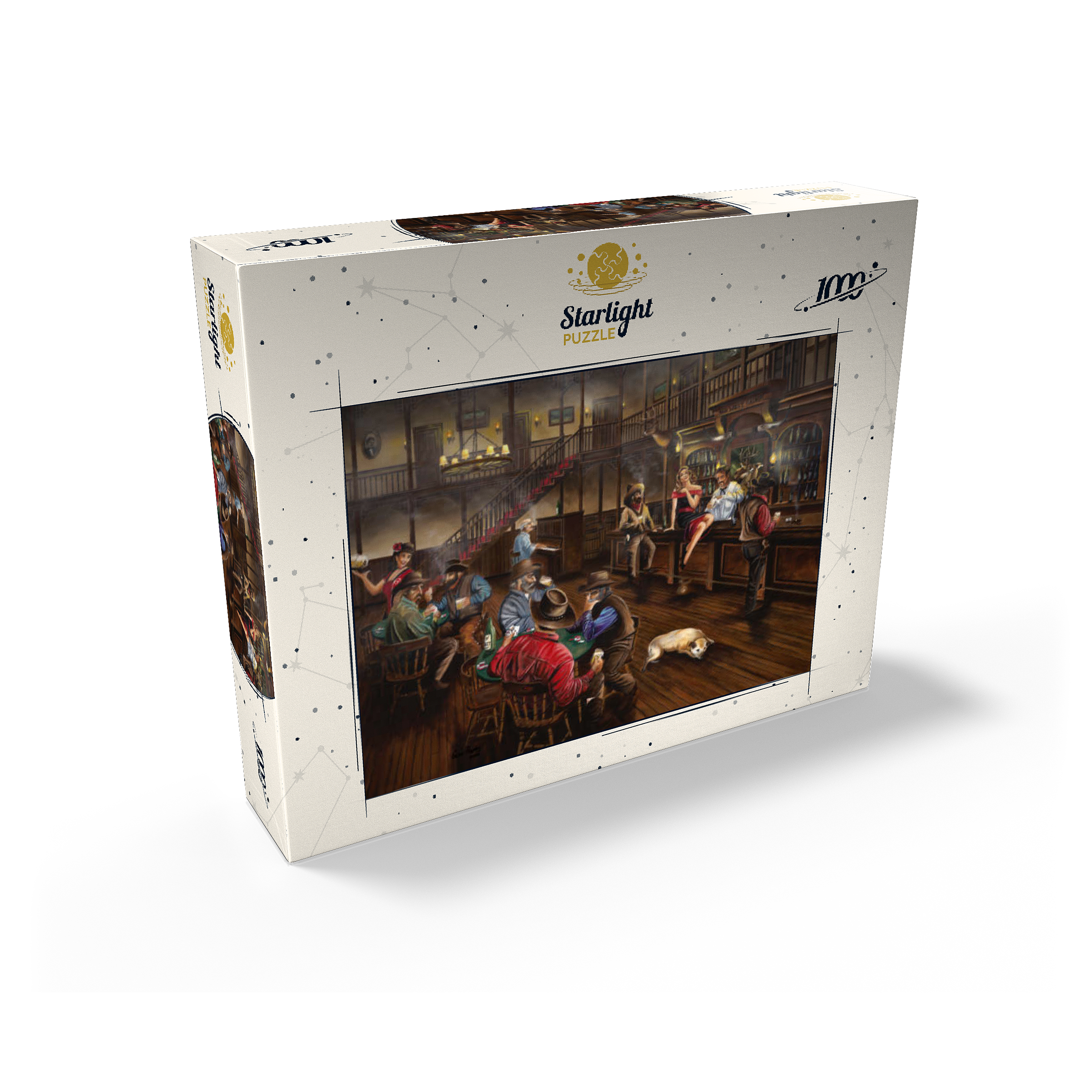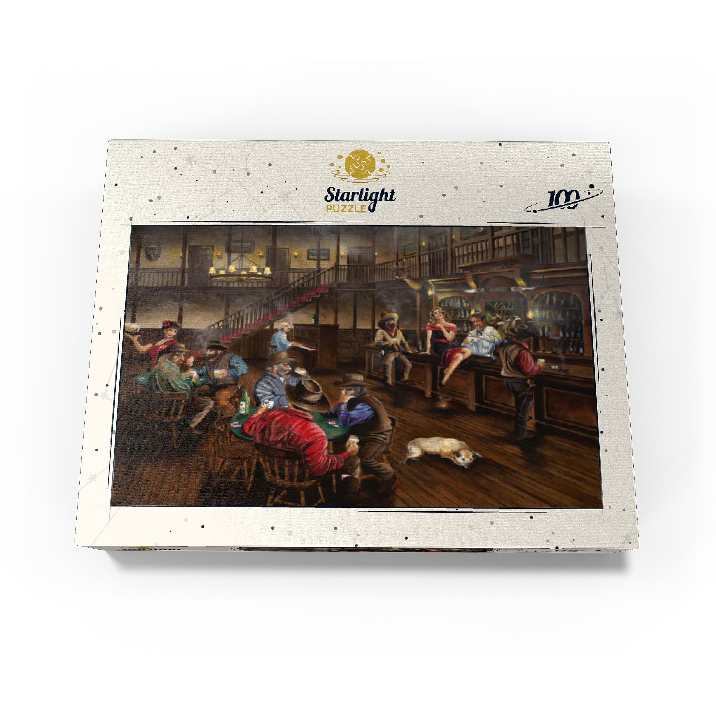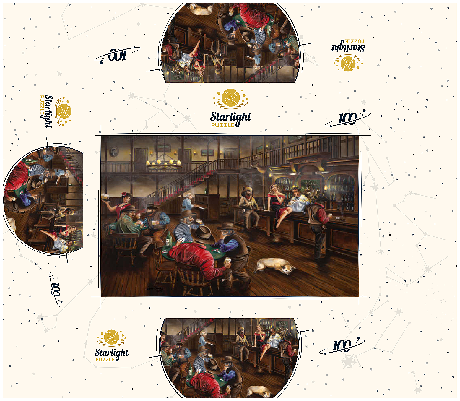 This richly detailed artwork captures a vibrant scene inside a classic Old West saloon. Cowboys gather around card tables, engaged in intense poker games and sharing drinks, while a lively bartender serves up whiskey behind a well-stocked bar. A piano player adds musical charm in the background, and a showgirl in red draws attention with her poised allure. Taxidermy decor, wooden interiors, chandeliers, and a staircase leading to upstairs rooms all contribute to the authentic Western ambiance. The relaxed presence of a sleeping dog adds a touch of calm to the otherwise bustling environment of camaraderie and mischief.
