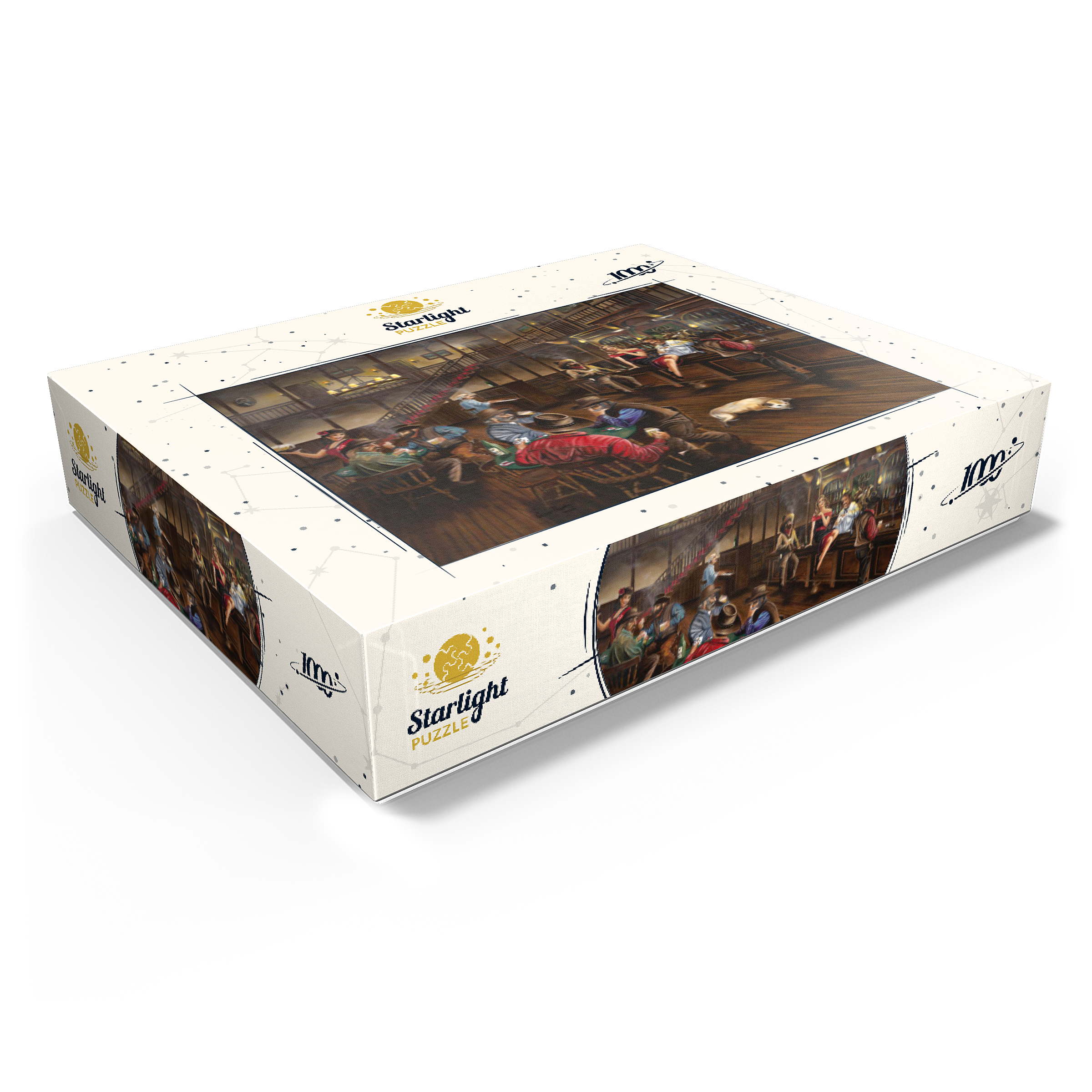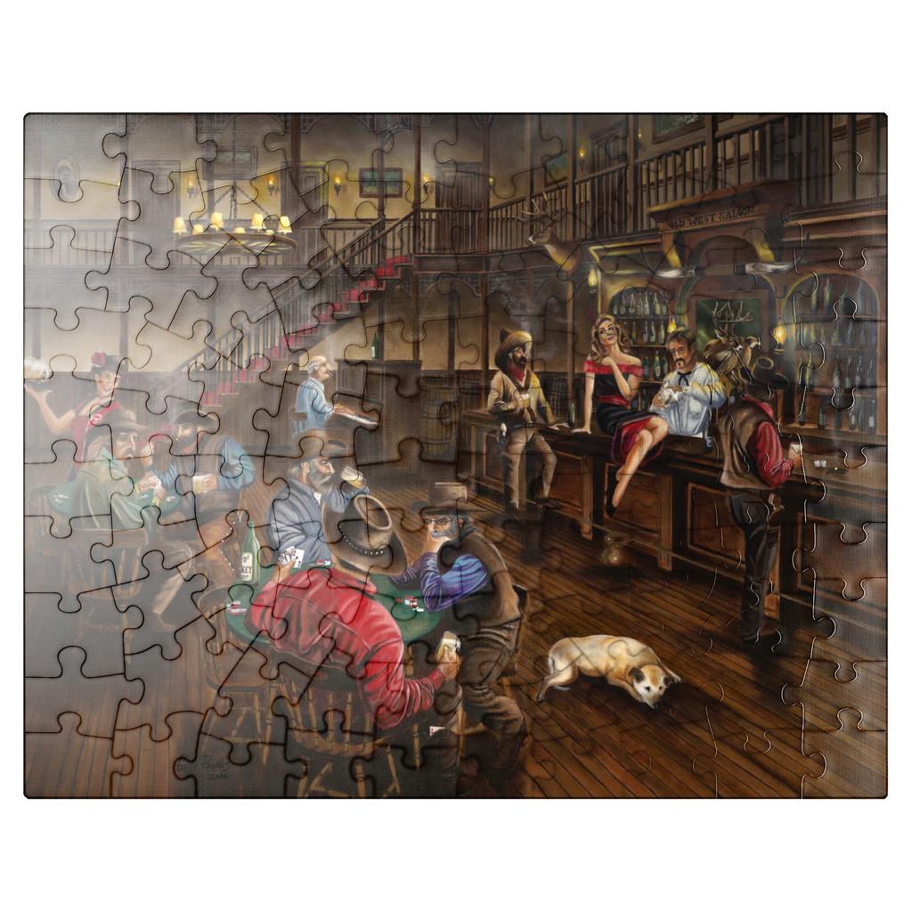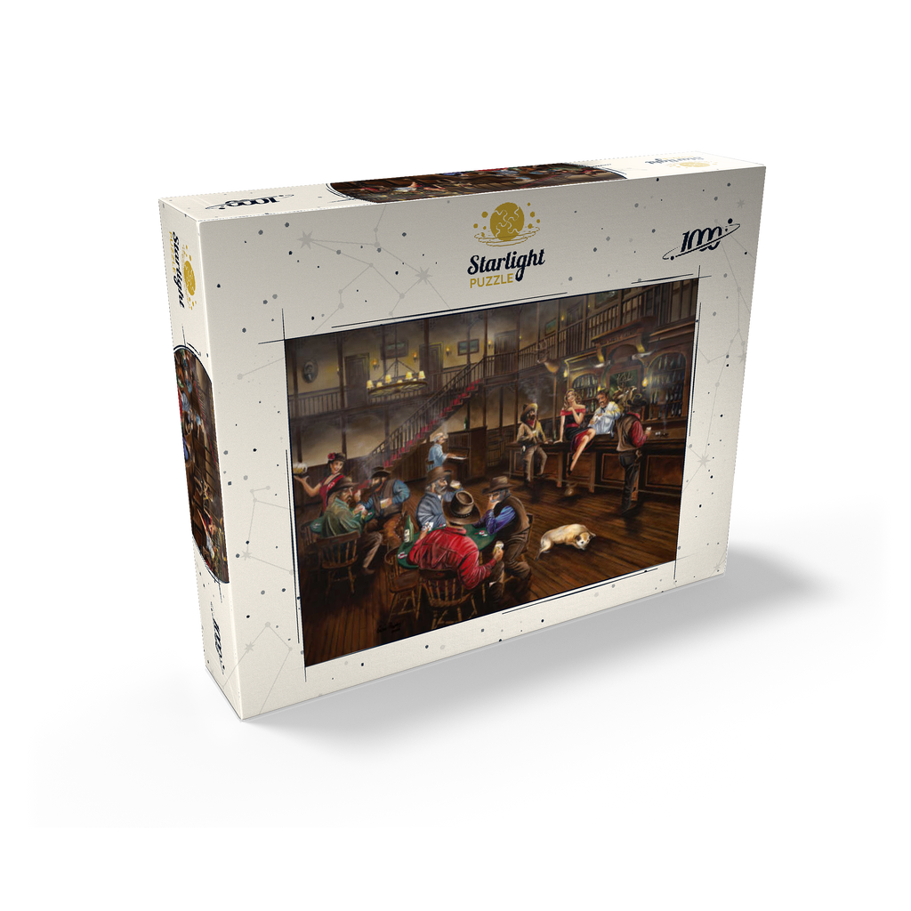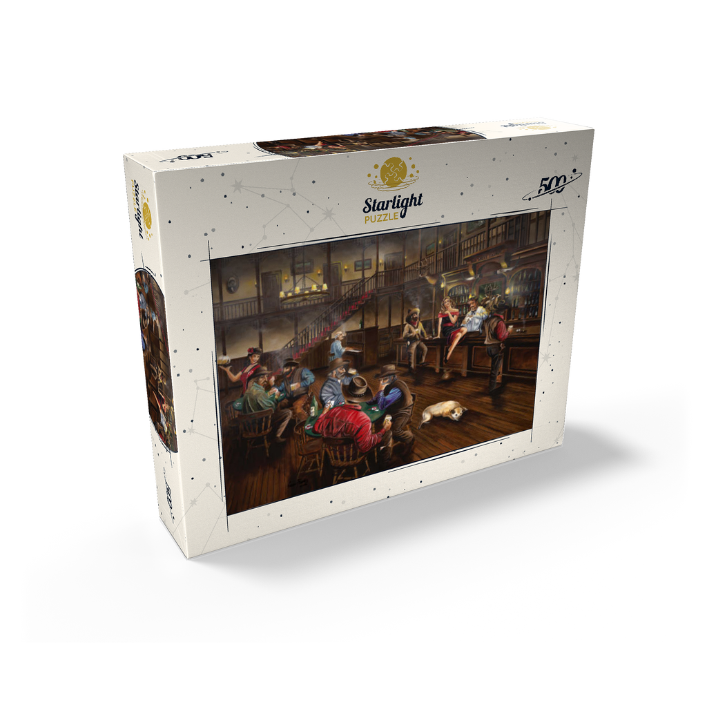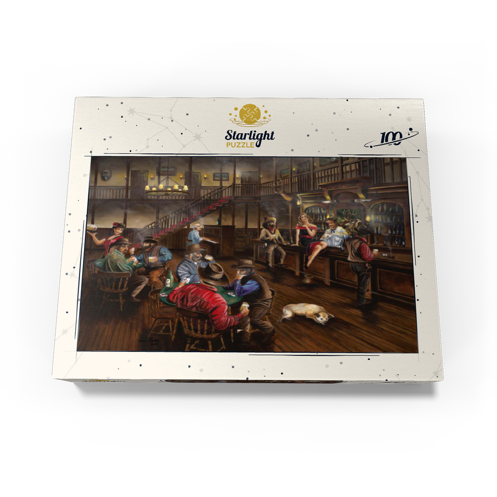 This richly detailed artwork captures a vibrant scene inside a classic Old West saloon. Cowboys gather around card tables, engaged in intense poker games and sharing drinks, while a lively bartender serves up whiskey behind a well-stocked bar. A piano player adds musical charm in the background, and a showgirl in red draws attention with her poised allure. Taxidermy decor, wooden interiors, chandeliers, and a staircase leading to upstairs rooms all contribute to the authentic Western ambiance. The relaxed presence of a sleeping dog adds a touch of calm to the otherwise bustling environment of camaraderie and mischief.