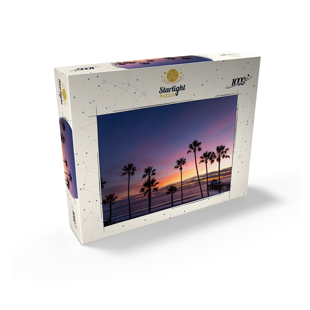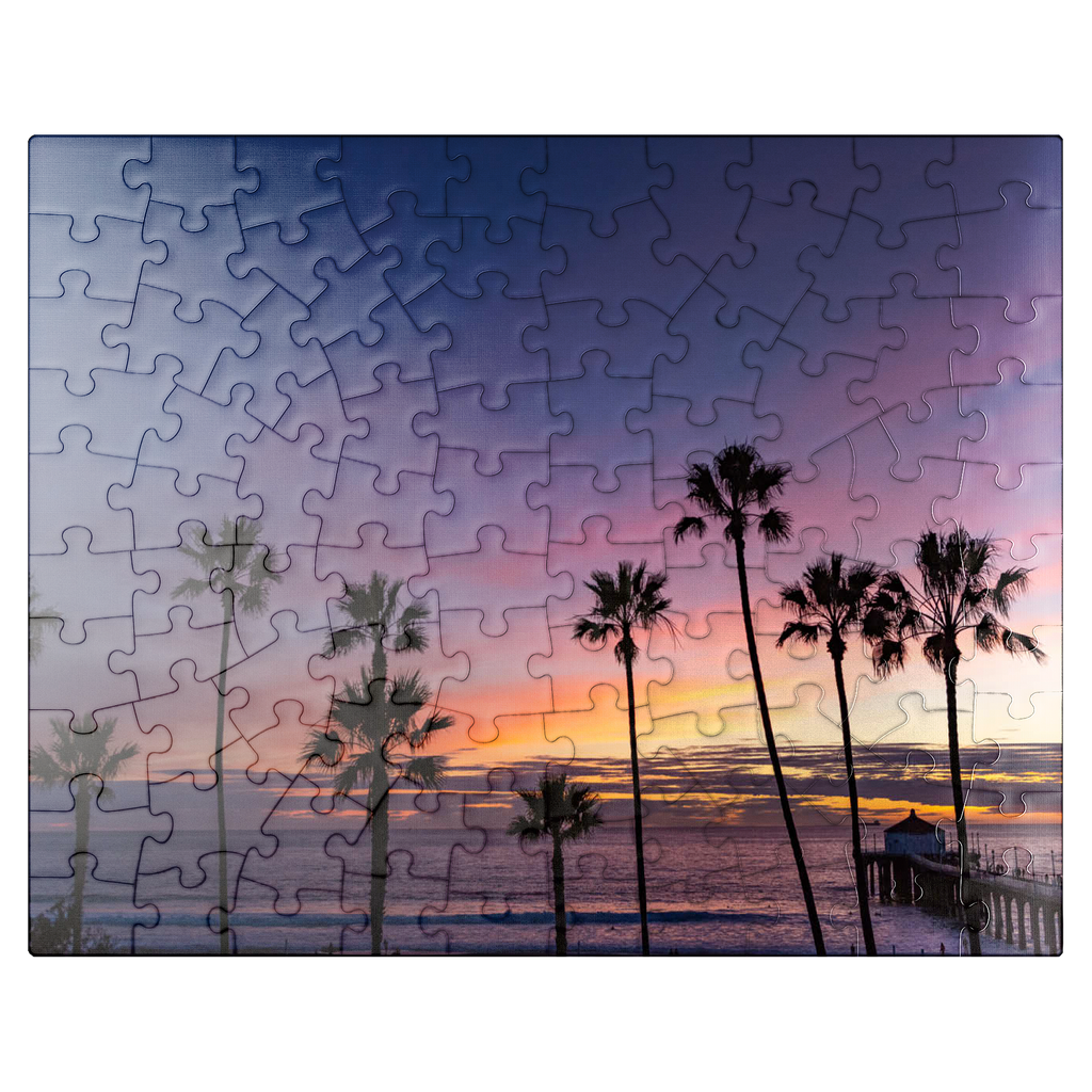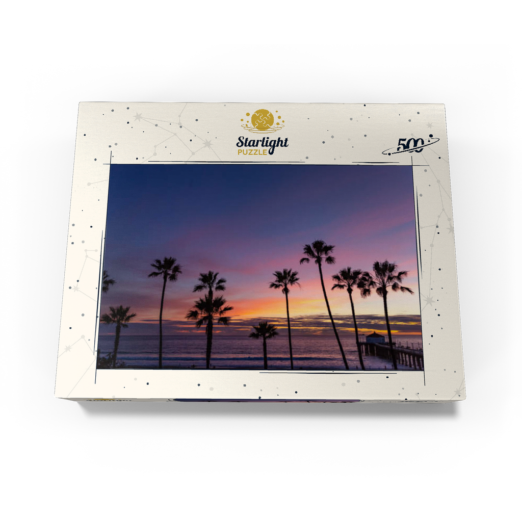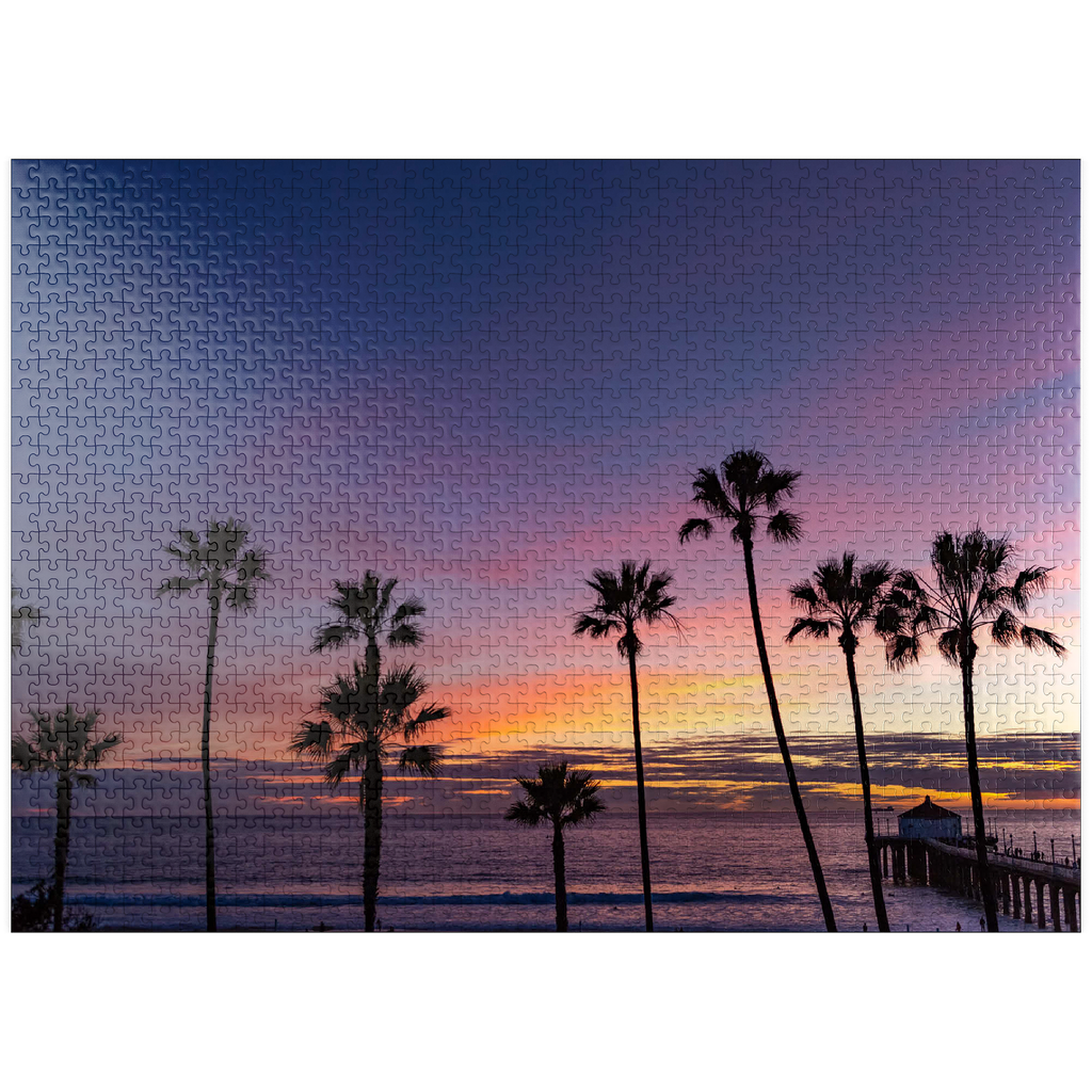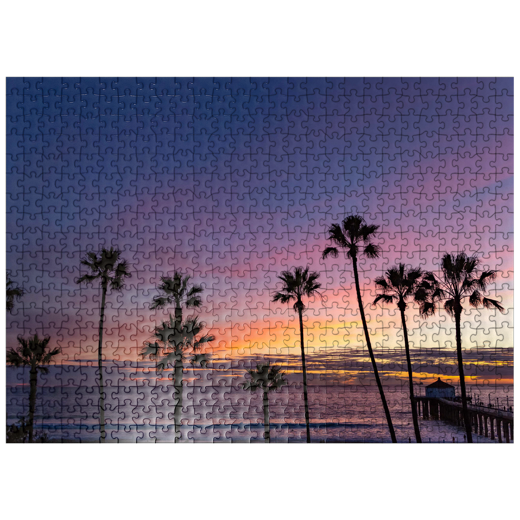 This stunning view captures the Manhattan Beach Pier in Southern California, framed by tall, iconic palm trees silhouetted against a vibrant sunset sky. The deep purples and soft orange hues stretch across the horizon, reflecting the tranquil transition from day to night along the Pacific Ocean. As the waves gently roll ashore, the historic pier extends into the water, its end pavilion softly illuminated in the twilight glow. This scenic image evokes the classic Southern California coastal vibe-perfect for beach lovers, sunset chasers, and those drawn to the timeless beauty of Los Angeles beaches. The palm-lined silhouette adds a tropical charm to this captivating evening scene.