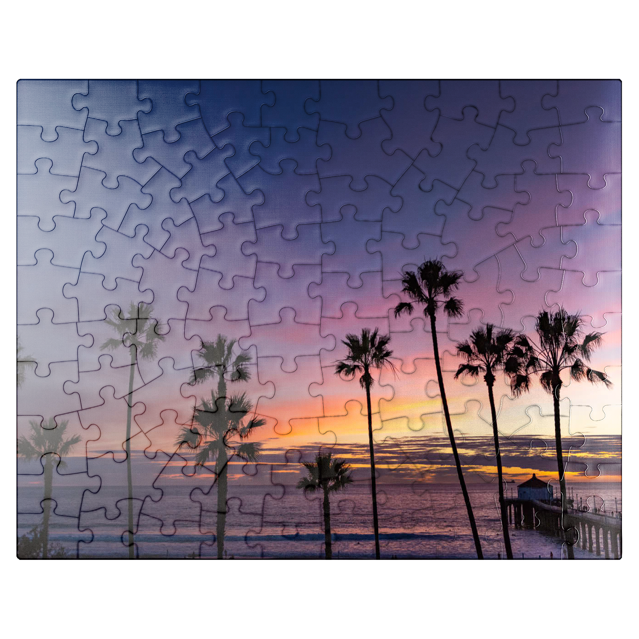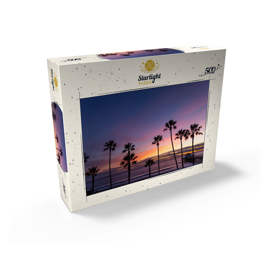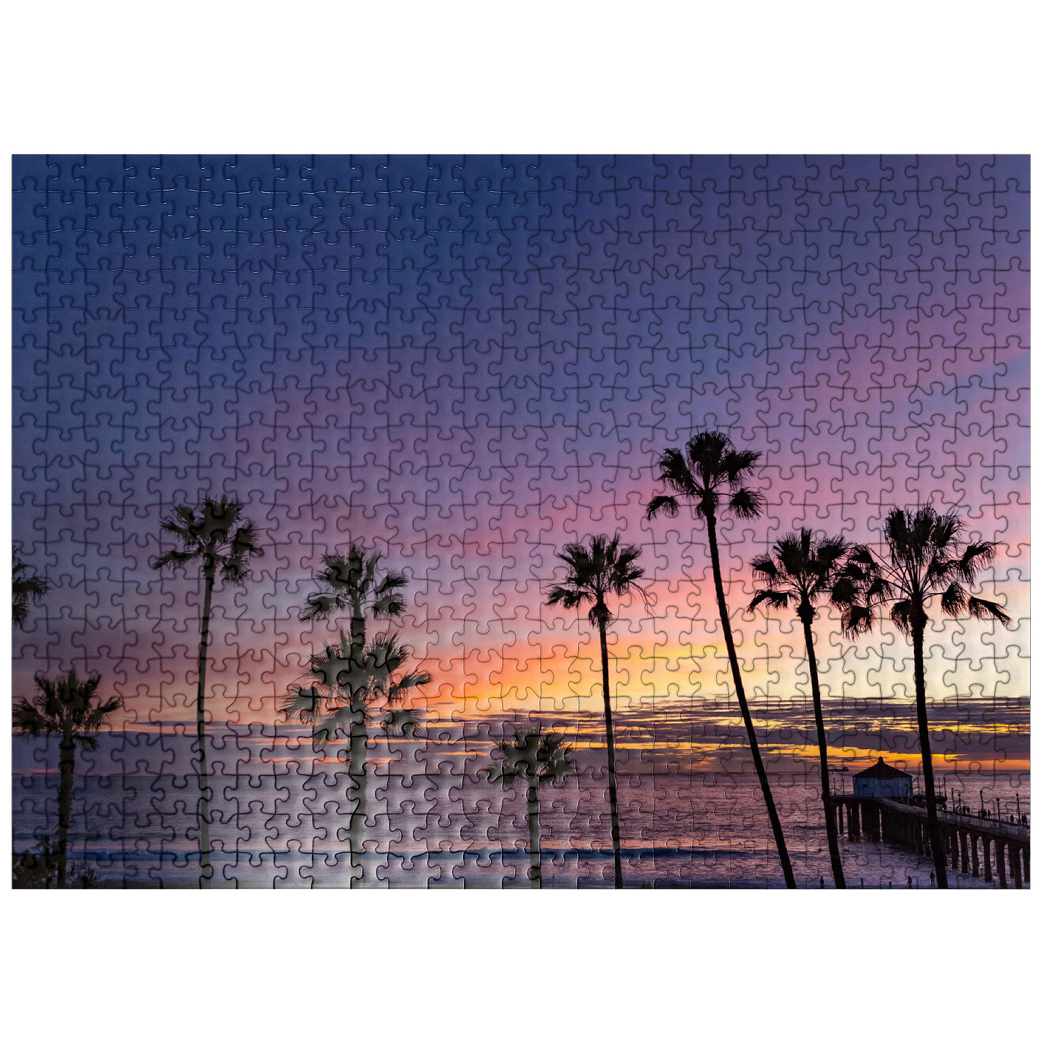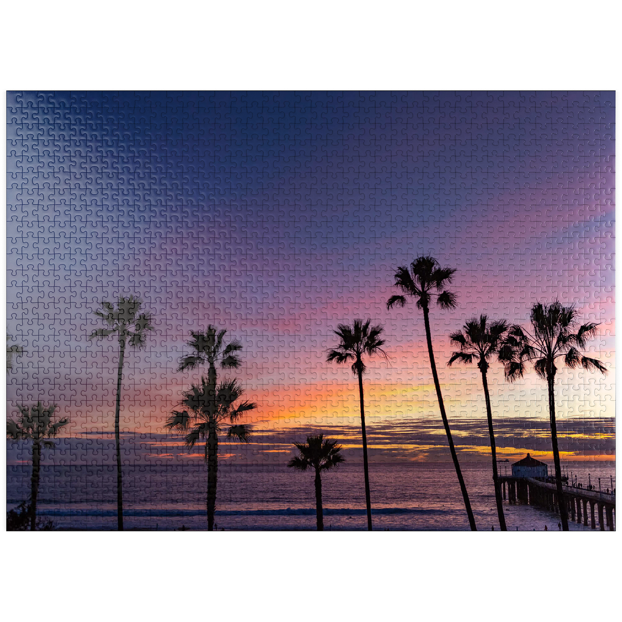 This stunning view captures the Manhattan Beach Pier in Southern California, framed by tall, iconic palm trees silhouetted against a vibrant sunset sky. The deep purples and soft orange hues stretch across the horizon, reflecting the tranquil transition from day to night along the Pacific Ocean. As the waves gently roll ashore, the historic pier extends into the water, its end pavilion softly illuminated in the twilight glow. This scenic image evokes the classic Southern California coastal vibe-perfect for beach lovers, sunset chasers, and those drawn to the timeless beauty of Los Angeles beaches. The palm-lined silhouette adds a tropical charm to this captivating evening scene.