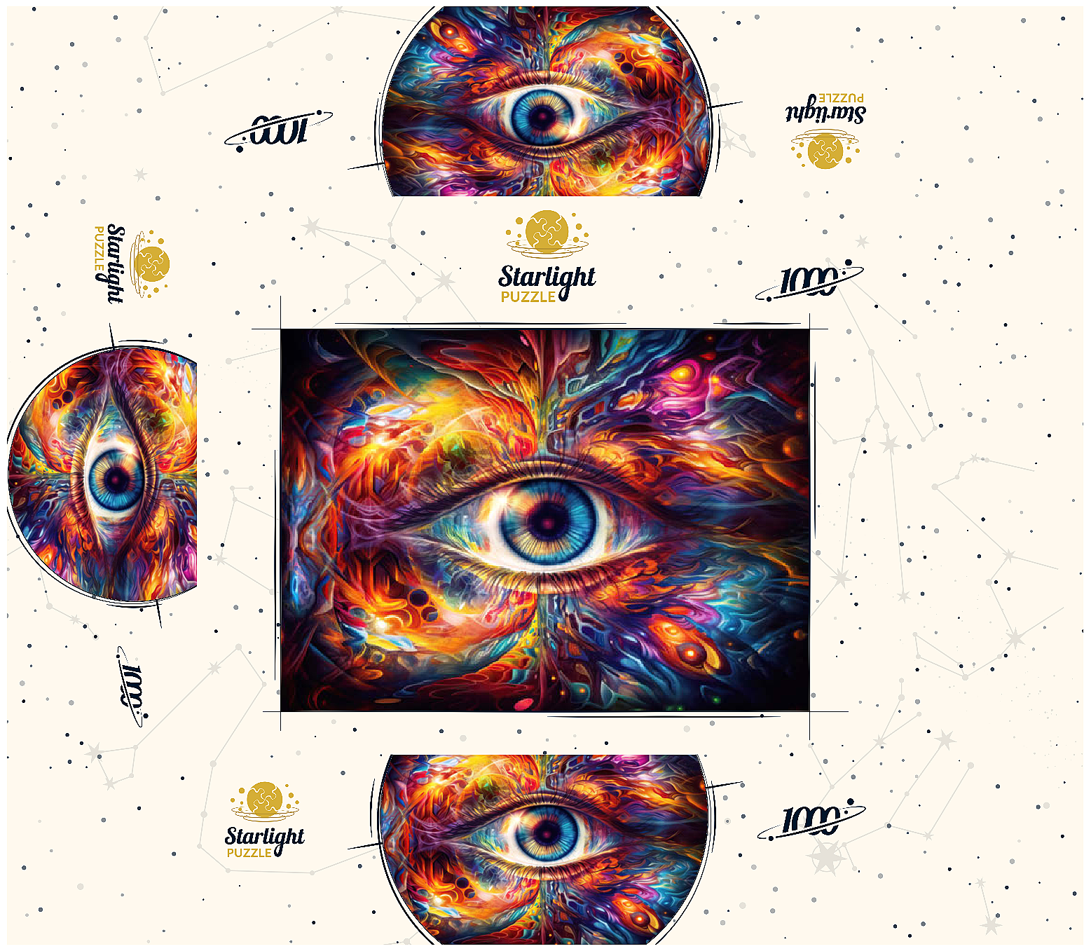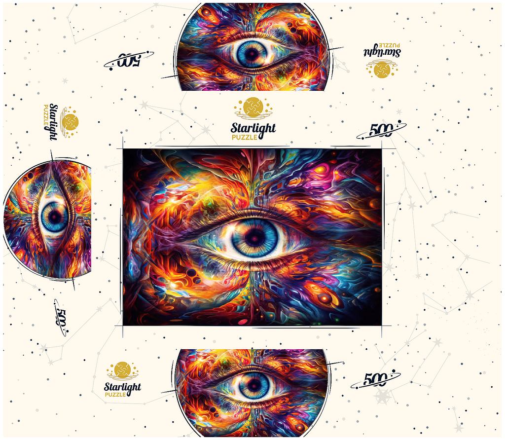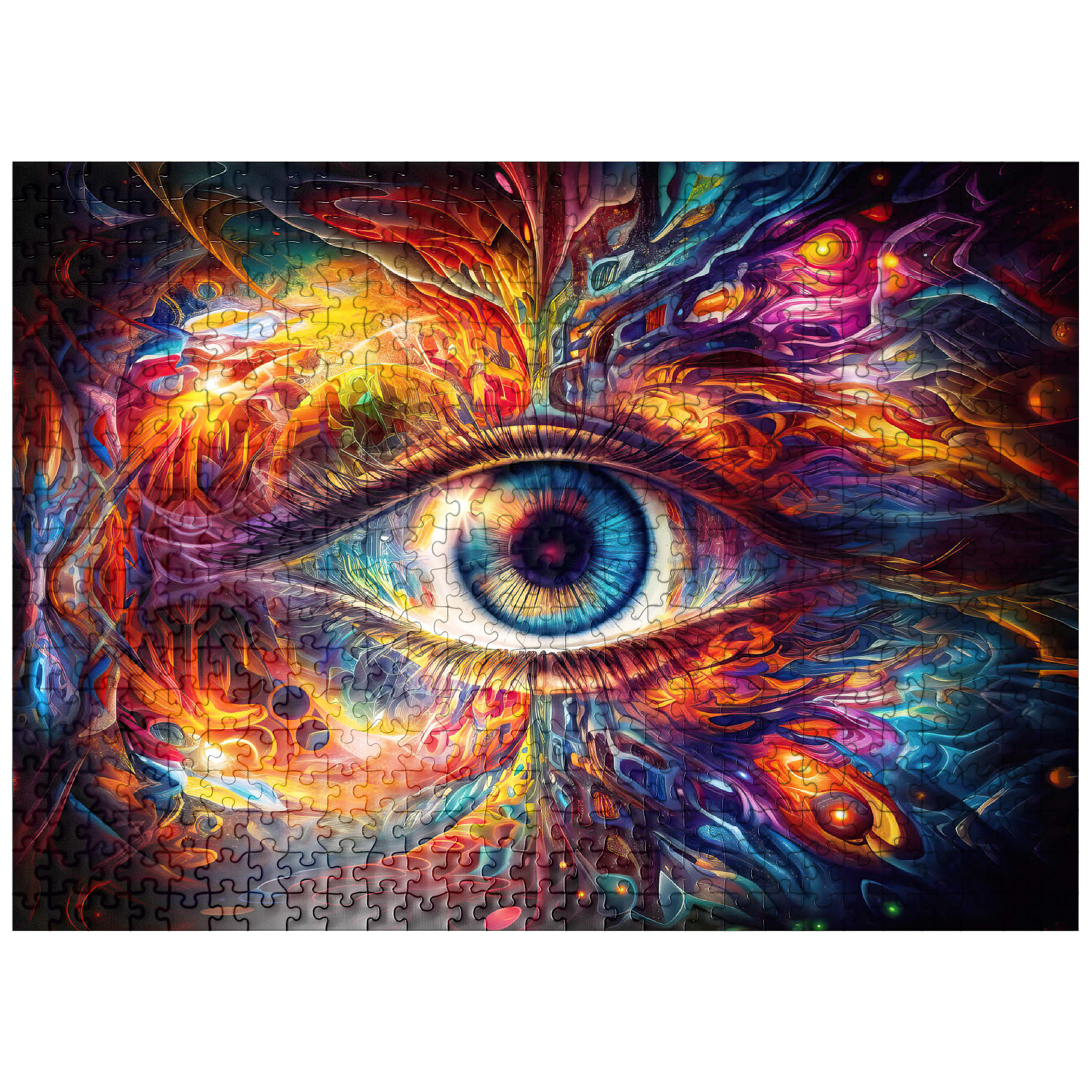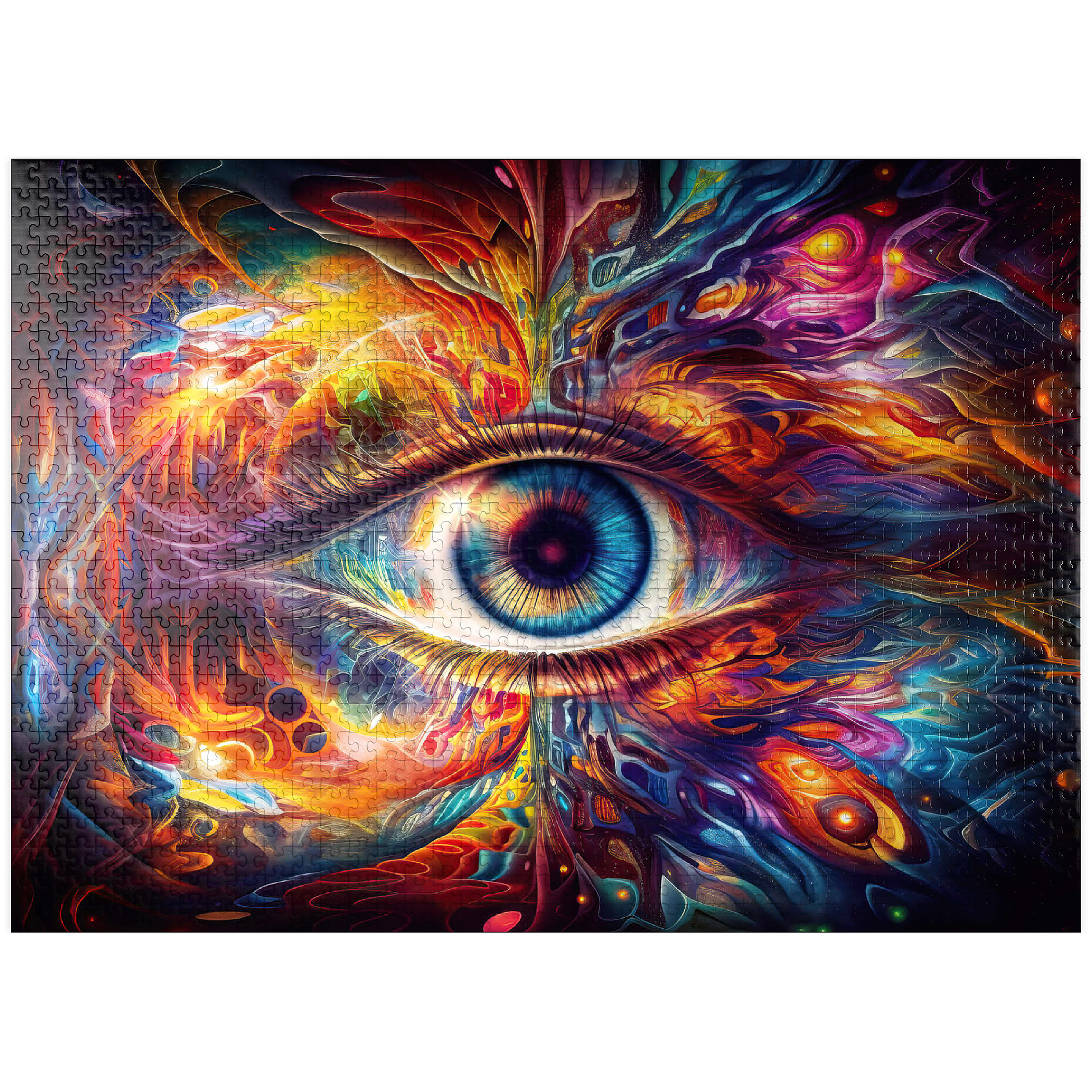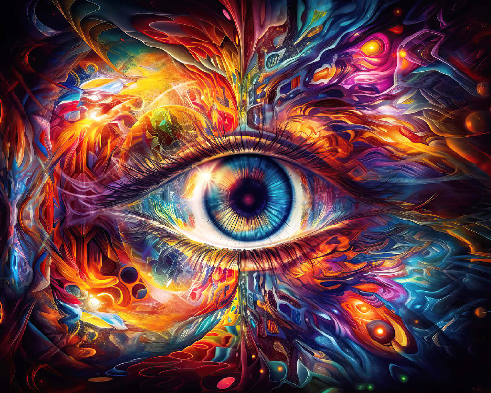 This stunning psychedelic artwork features a mesmerizing, hyper-detailed eye surrounded by a cosmic explosion of colors and intricate patterns. The iris glows with deep blues and radiant golds, symbolizing perception, enlightenment, and higher consciousness. Swirling hues of fiery orange, electric purple, and celestial blue blend seamlessly, evoking a sense of transcendence and infinite depth. The fusion of abstract and visionary art elements creates a dreamlike, almost otherworldly aesthetic, making this piece perfect for those drawn to surrealism, mysticism, and psychedelic visuals. A captivating representation of cosmic awareness, introspection, and boundless imagination.