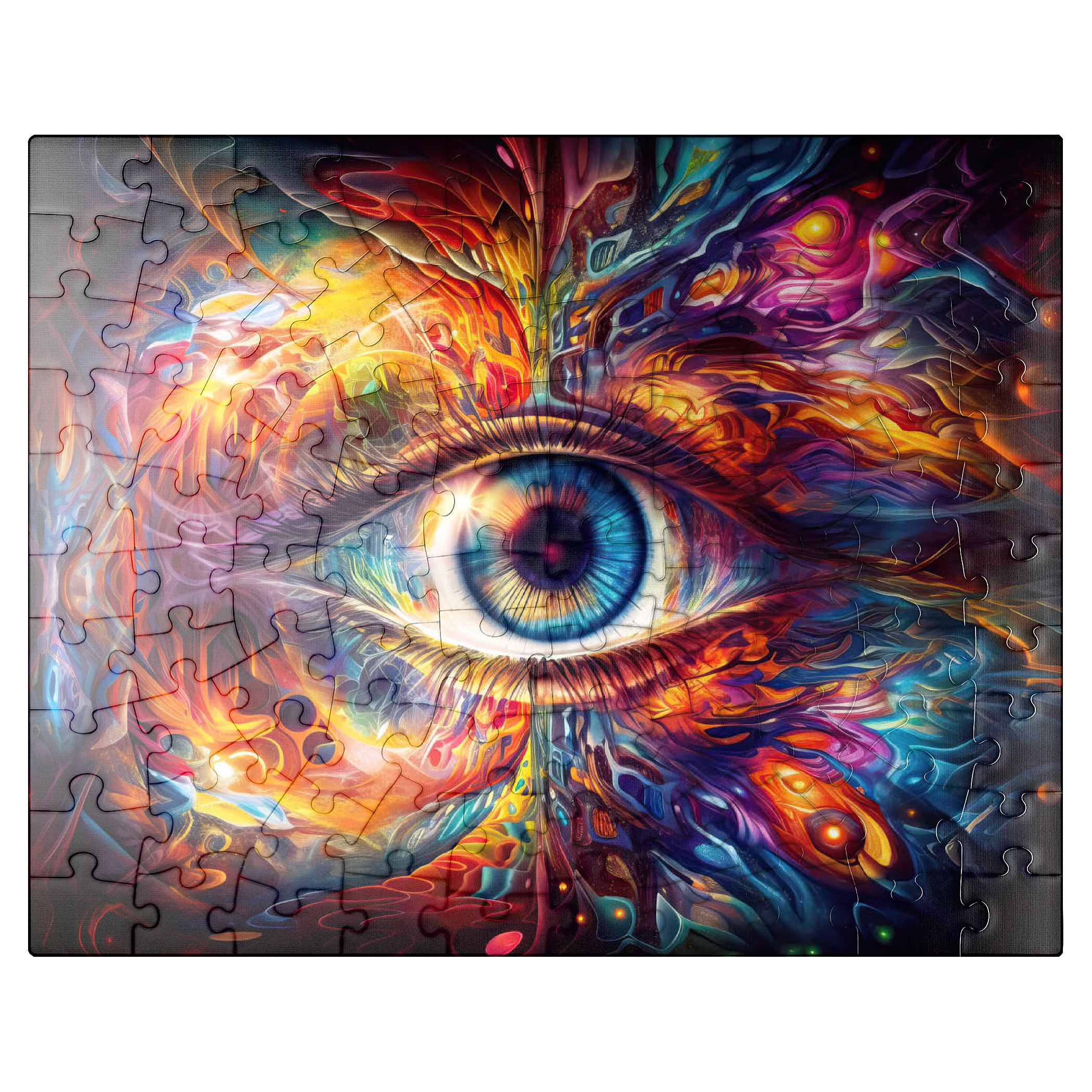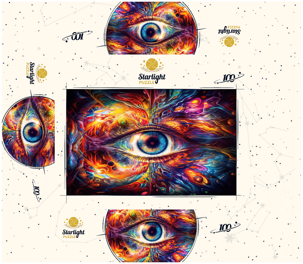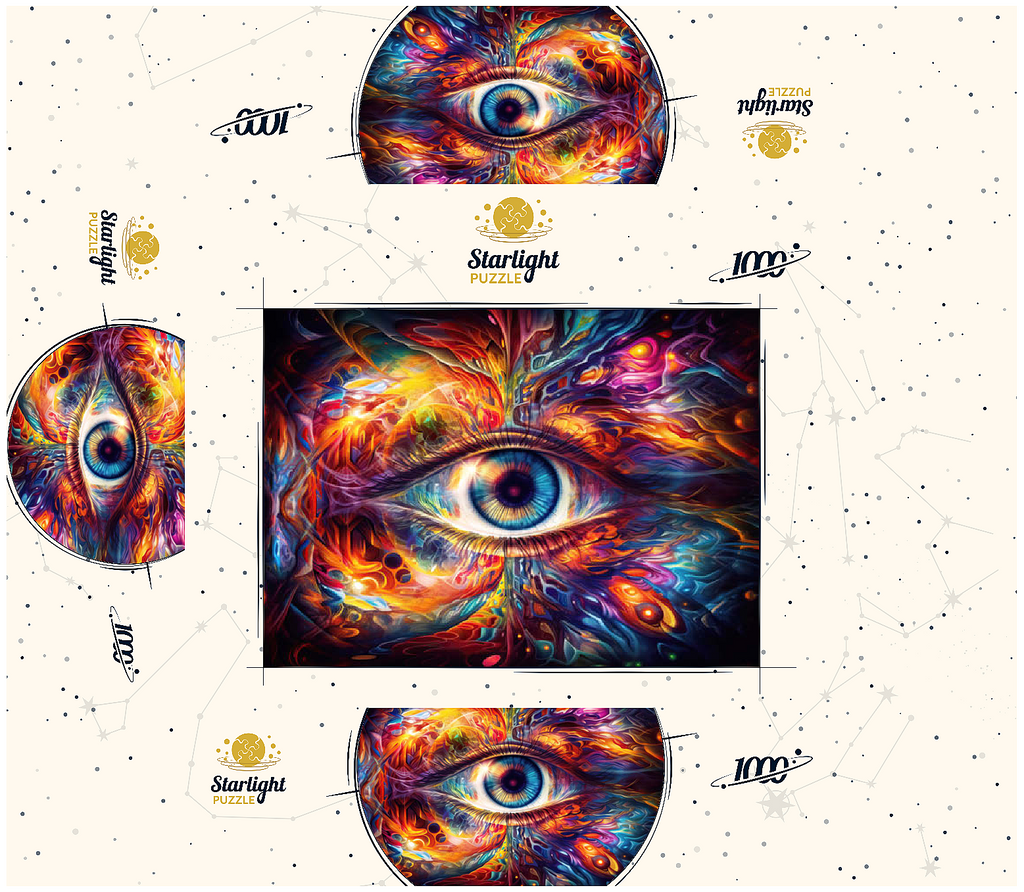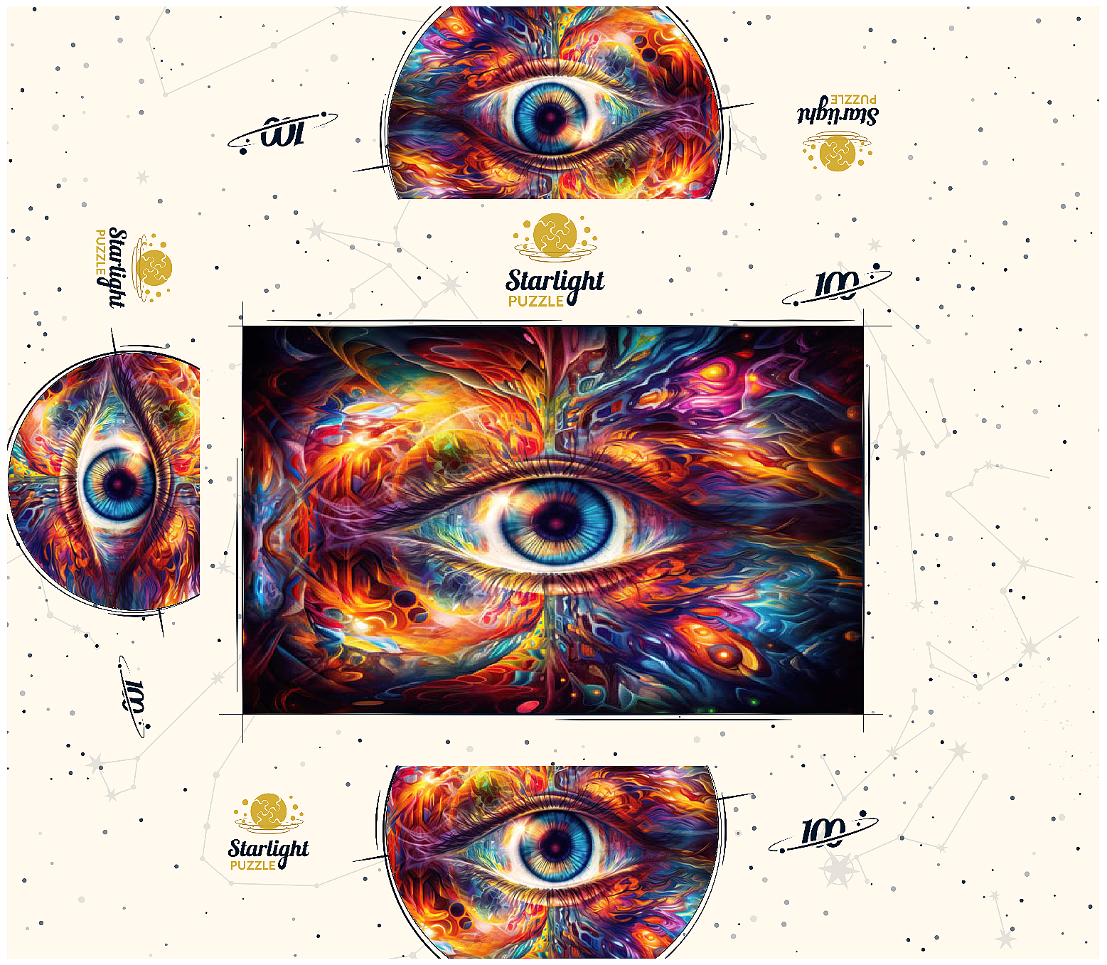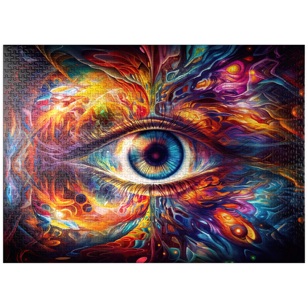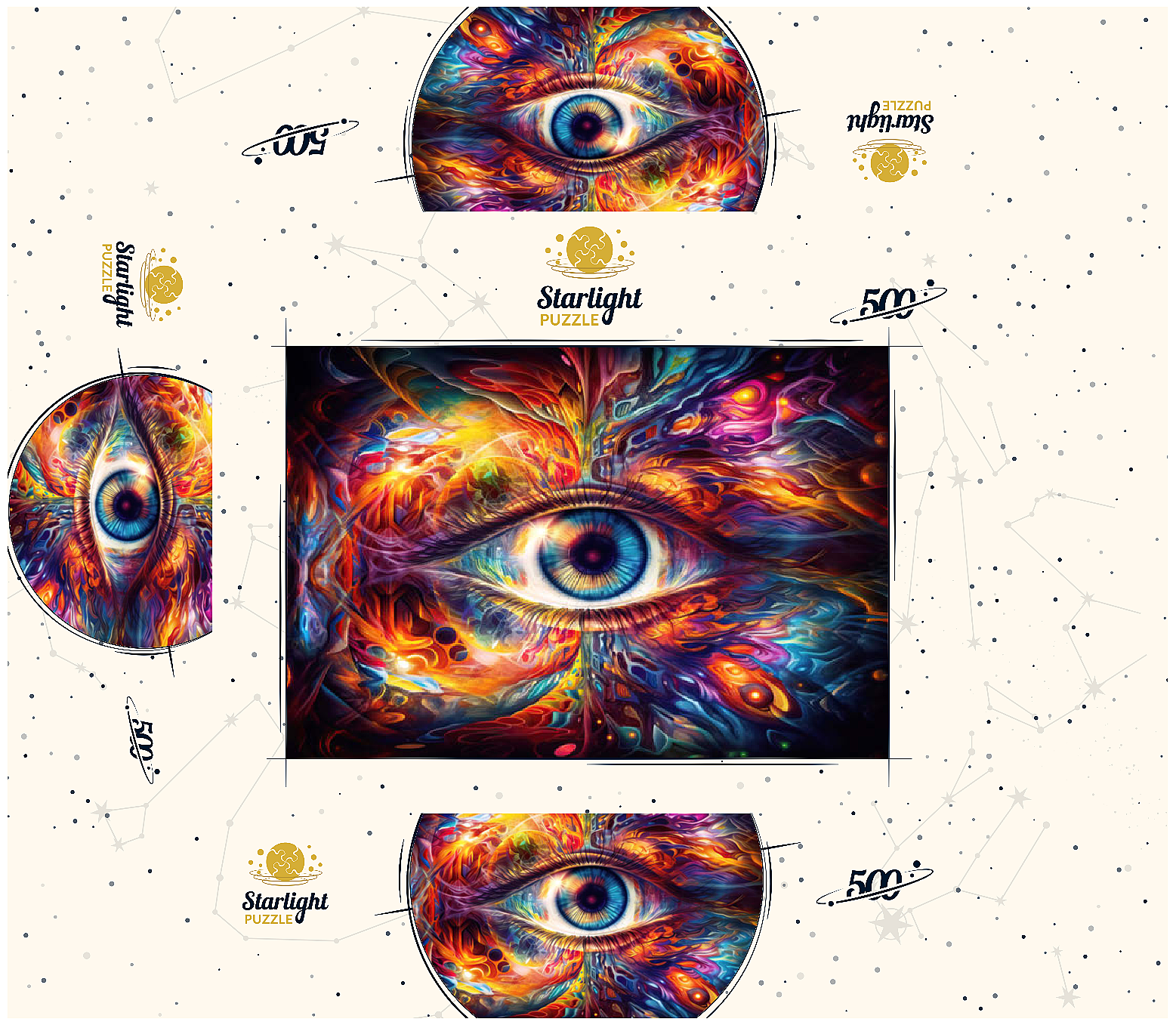 This stunning psychedelic artwork features a mesmerizing, hyper-detailed eye surrounded by a cosmic explosion of colors and intricate patterns. The iris glows with deep blues and radiant golds, symbolizing perception, enlightenment, and higher consciousness. Swirling hues of fiery orange, electric purple, and celestial blue blend seamlessly, evoking a sense of transcendence and infinite depth. The fusion of abstract and visionary art elements creates a dreamlike, almost otherworldly aesthetic, making this piece perfect for those drawn to surrealism, mysticism, and psychedelic visuals. A captivating representation of cosmic awareness, introspection, and boundless imagination.