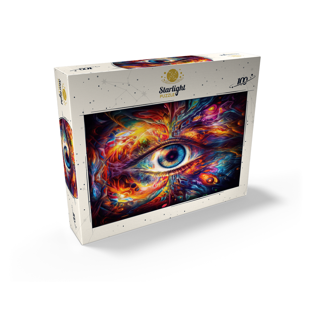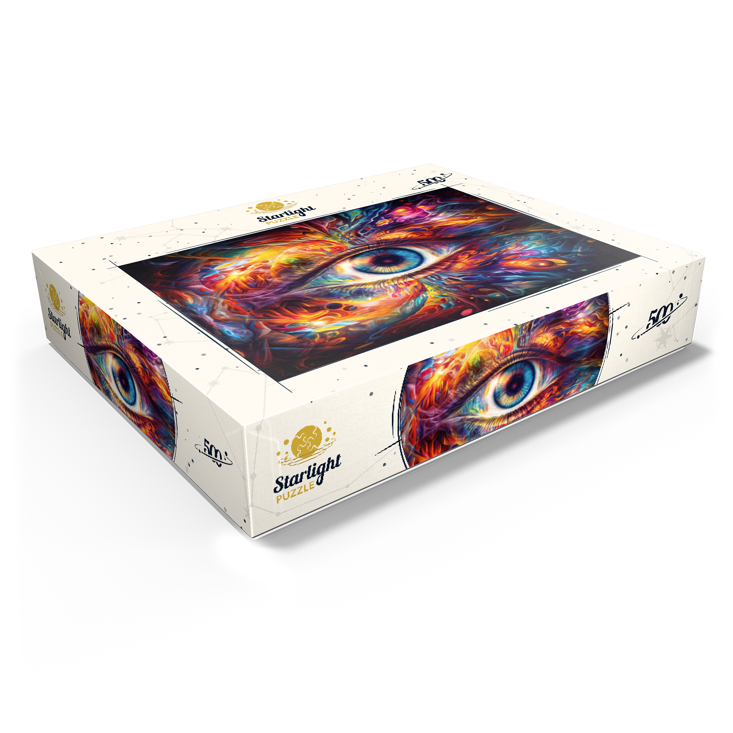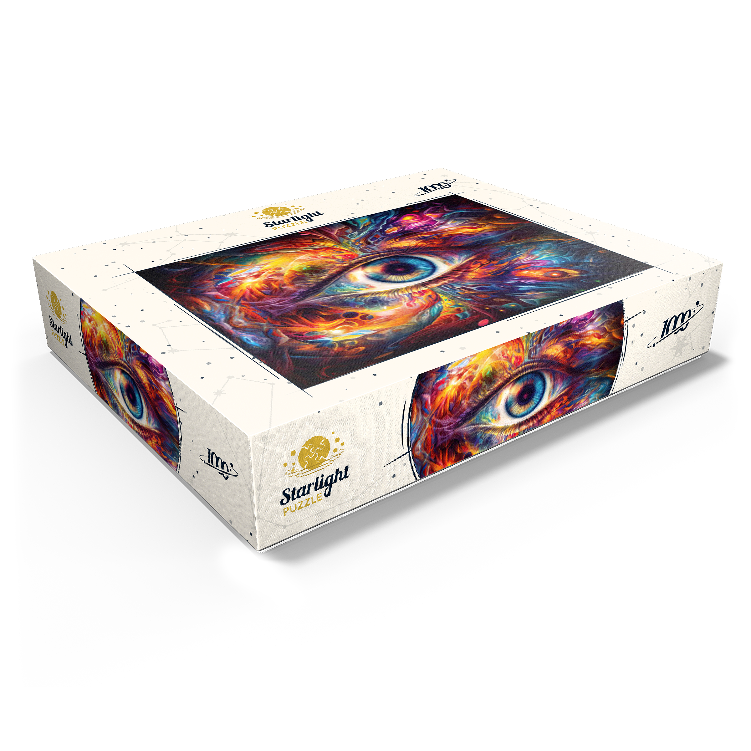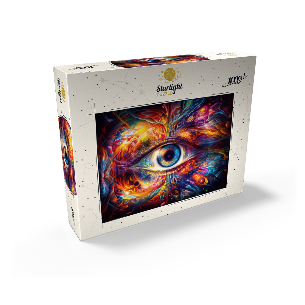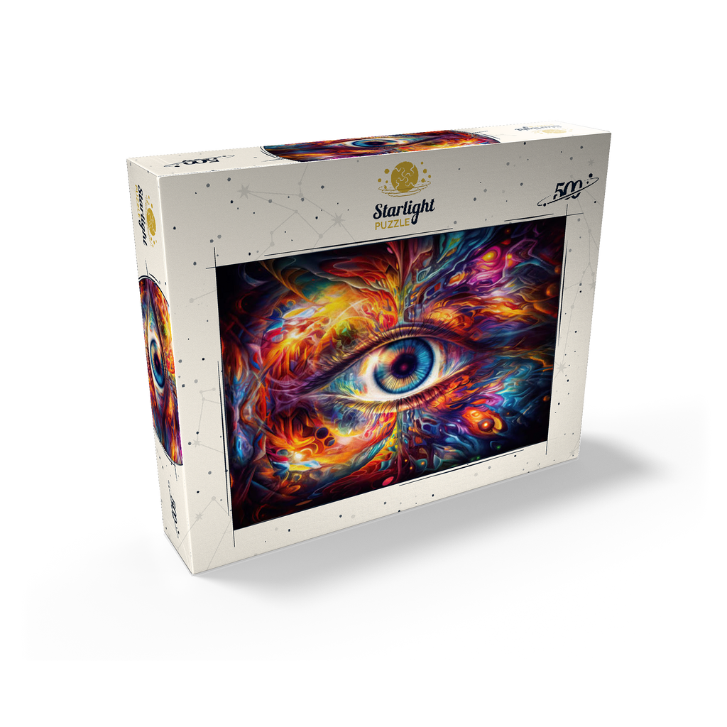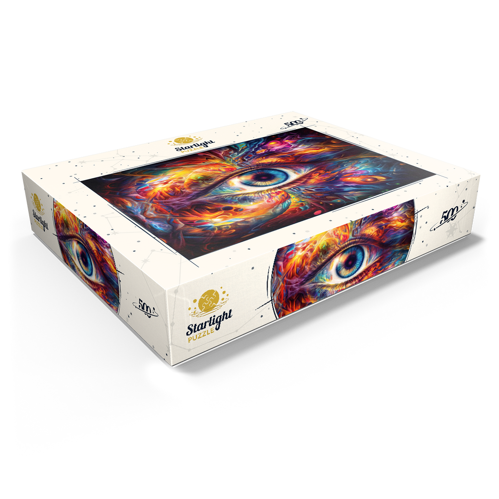 This stunning psychedelic artwork features a mesmerizing, hyper-detailed eye surrounded by a cosmic explosion of colors and intricate patterns. The iris glows with deep blues and radiant golds, symbolizing perception, enlightenment, and higher consciousness. Swirling hues of fiery orange, electric purple, and celestial blue blend seamlessly, evoking a sense of transcendence and infinite depth. The fusion of abstract and visionary art elements creates a dreamlike, almost otherworldly aesthetic, making this piece perfect for those drawn to surrealism, mysticism, and psychedelic visuals. A captivating representation of cosmic awareness, introspection, and boundless imagination.