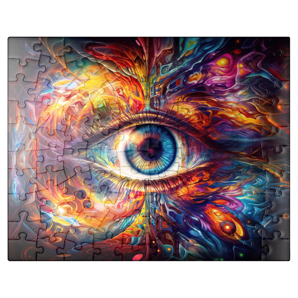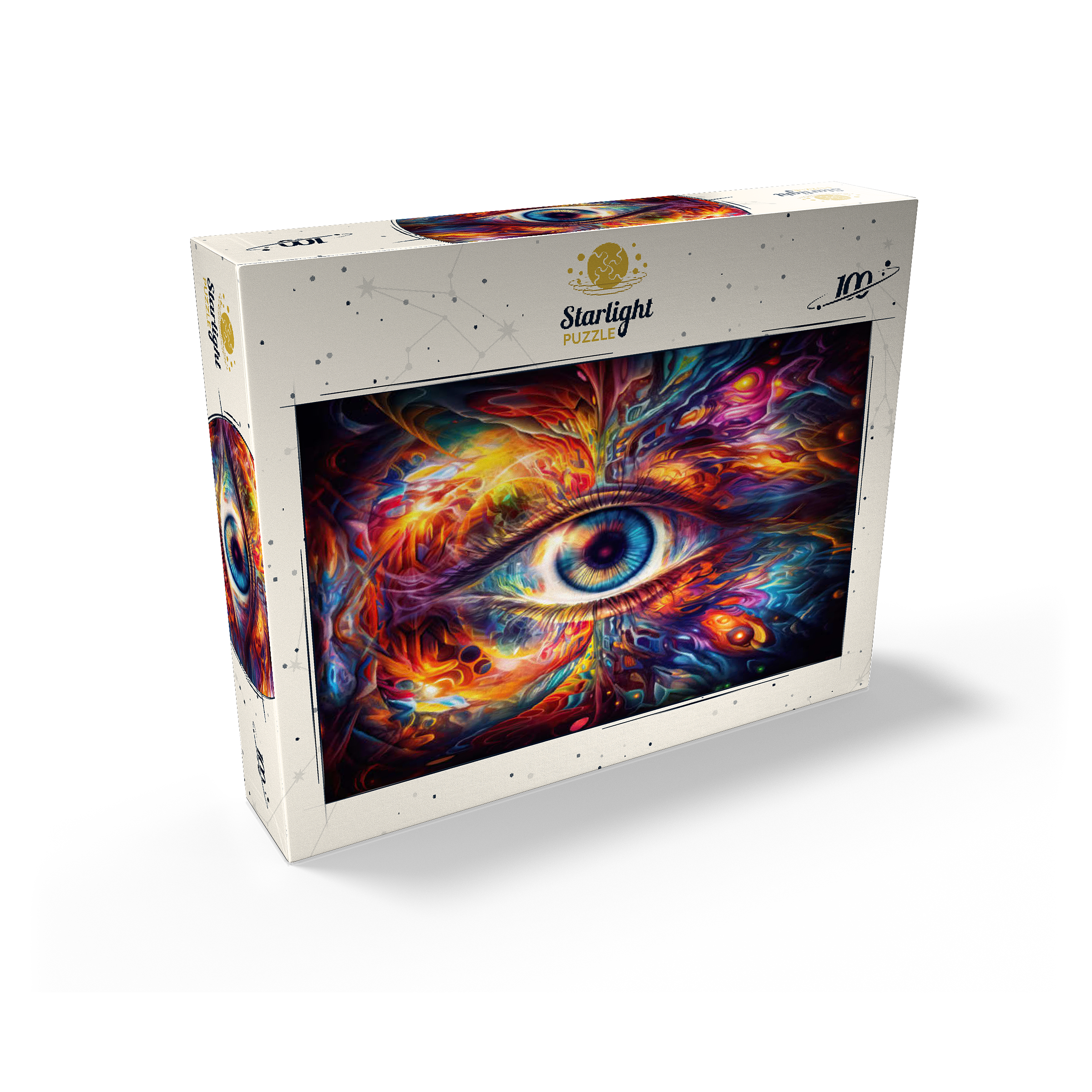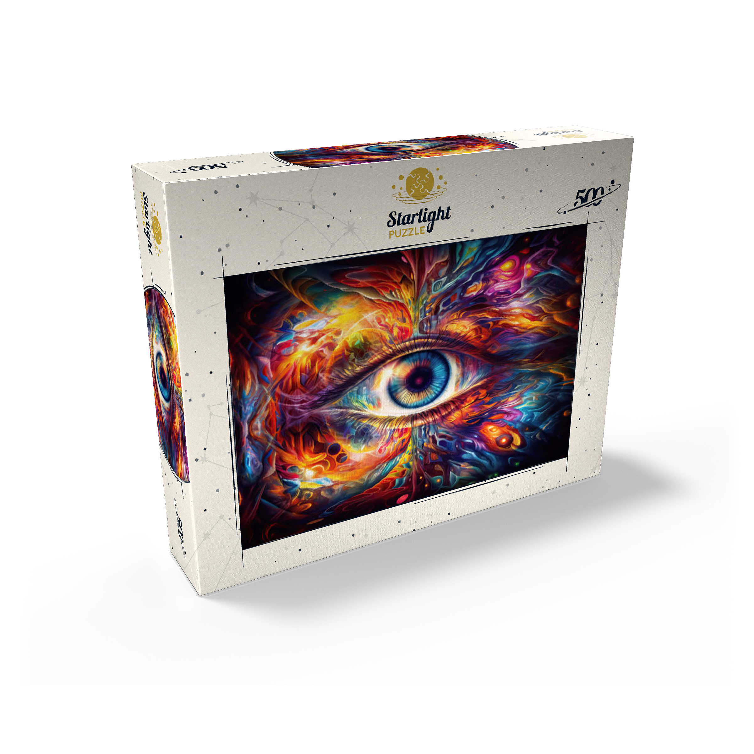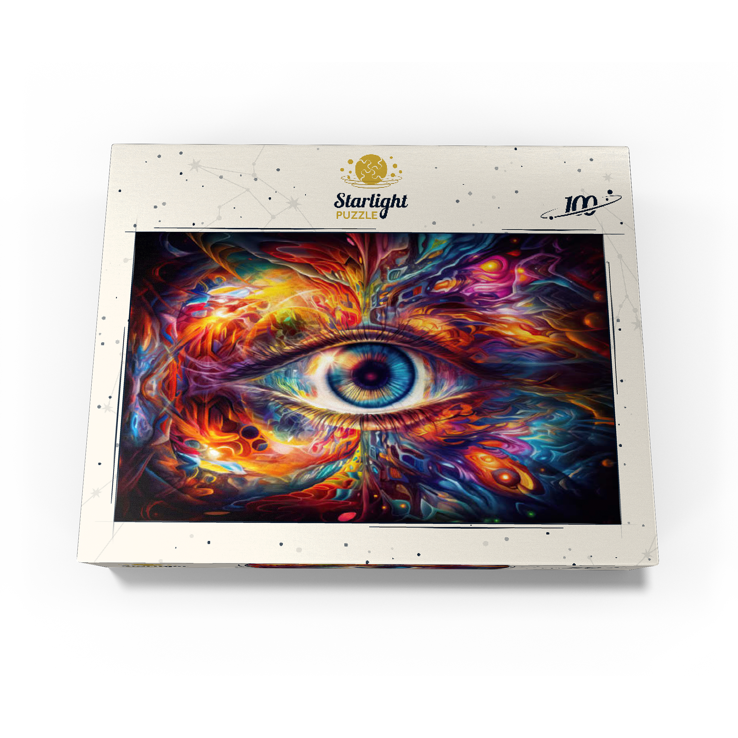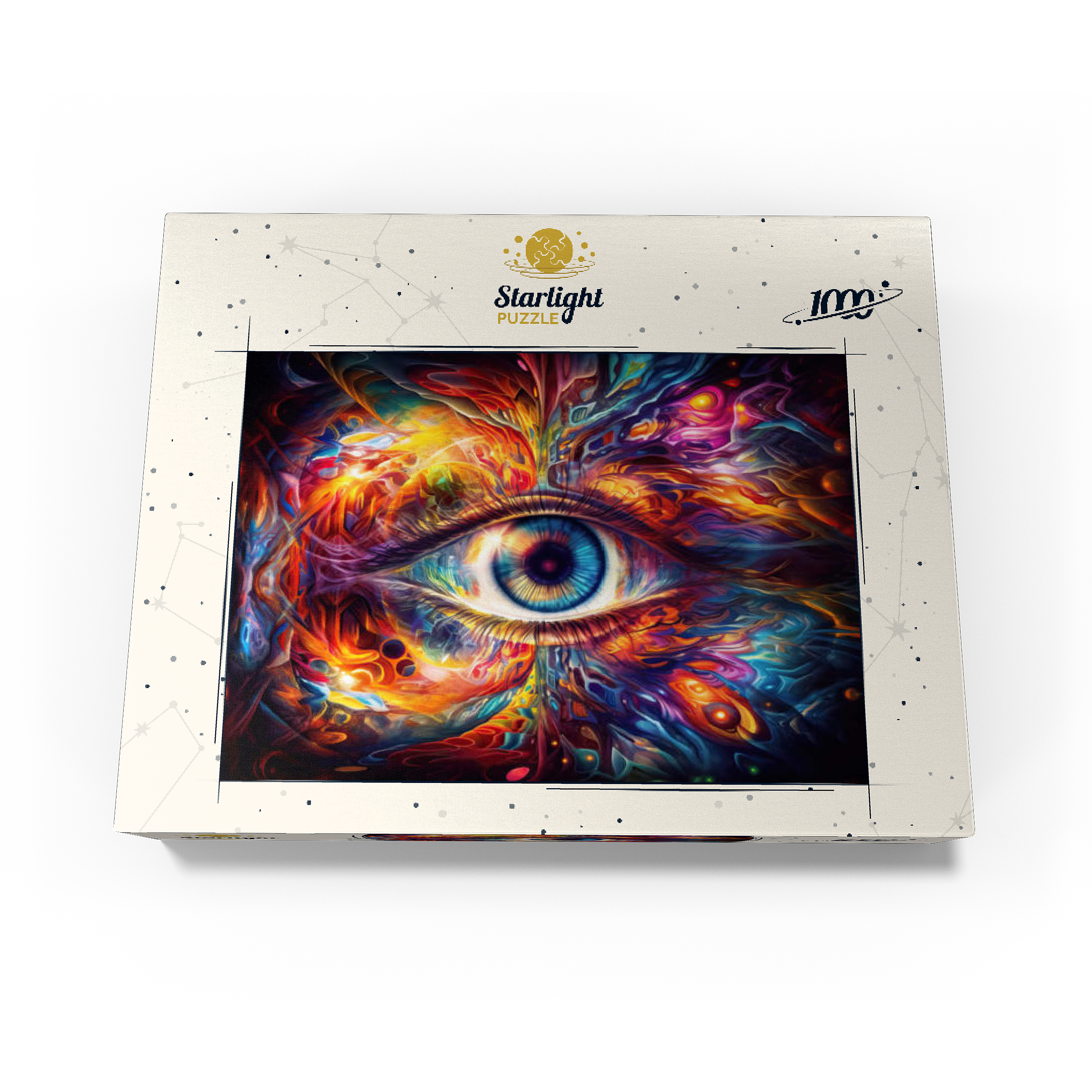 This stunning psychedelic artwork features a mesmerizing, hyper-detailed eye surrounded by a cosmic explosion of colors and intricate patterns. The iris glows with deep blues and radiant golds, symbolizing perception, enlightenment, and higher consciousness. Swirling hues of fiery orange, electric purple, and celestial blue blend seamlessly, evoking a sense of transcendence and infinite depth. The fusion of abstract and visionary art elements creates a dreamlike, almost otherworldly aesthetic, making this piece perfect for those drawn to surrealism, mysticism, and psychedelic visuals. A captivating representation of cosmic awareness, introspection, and boundless imagination.