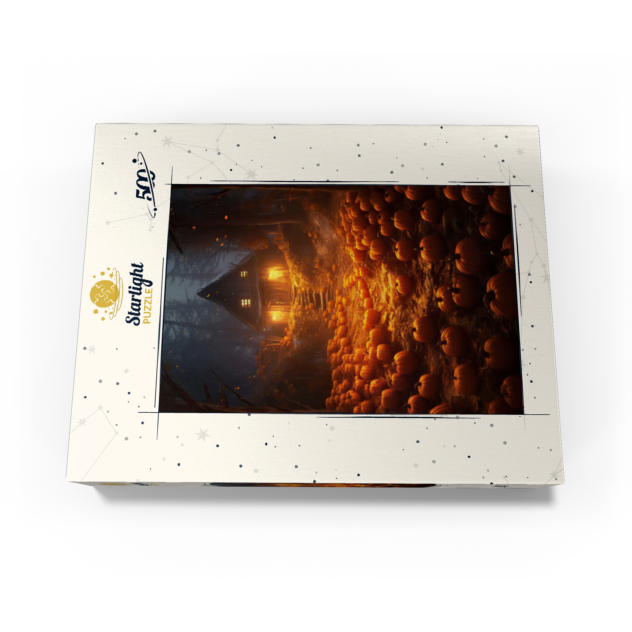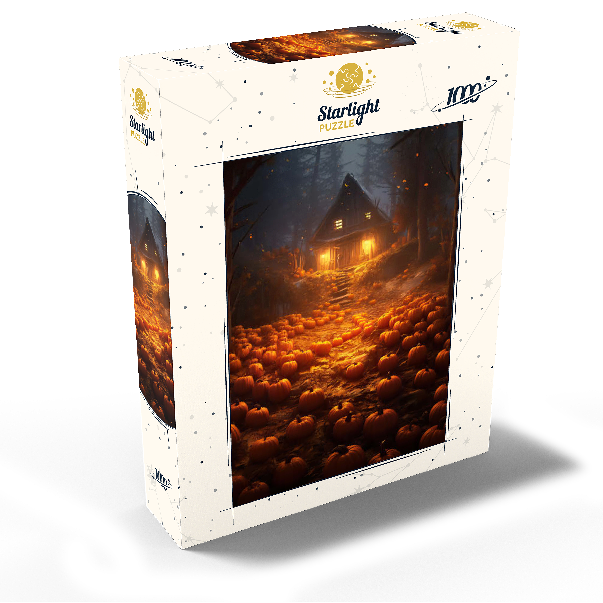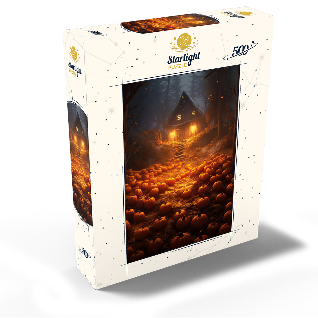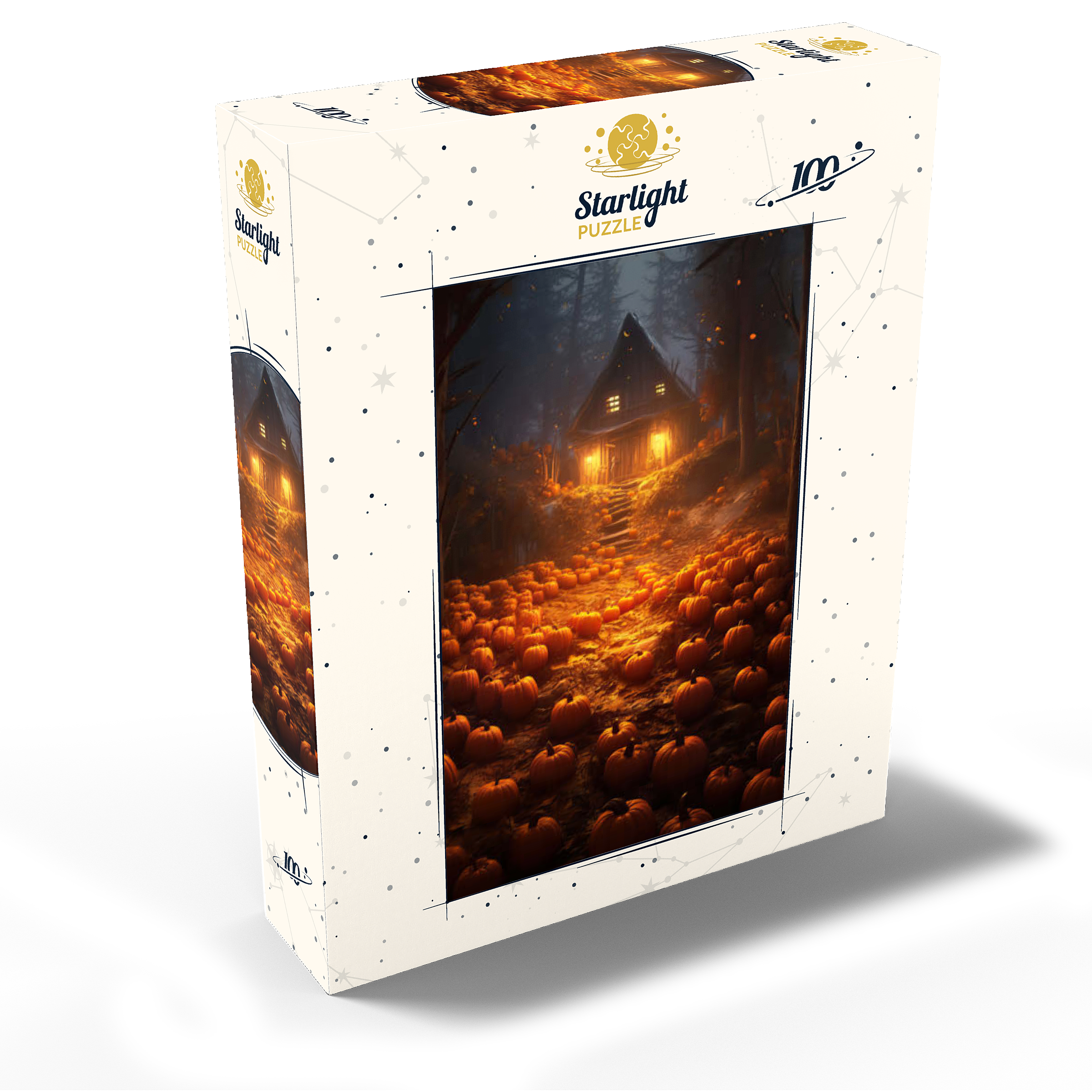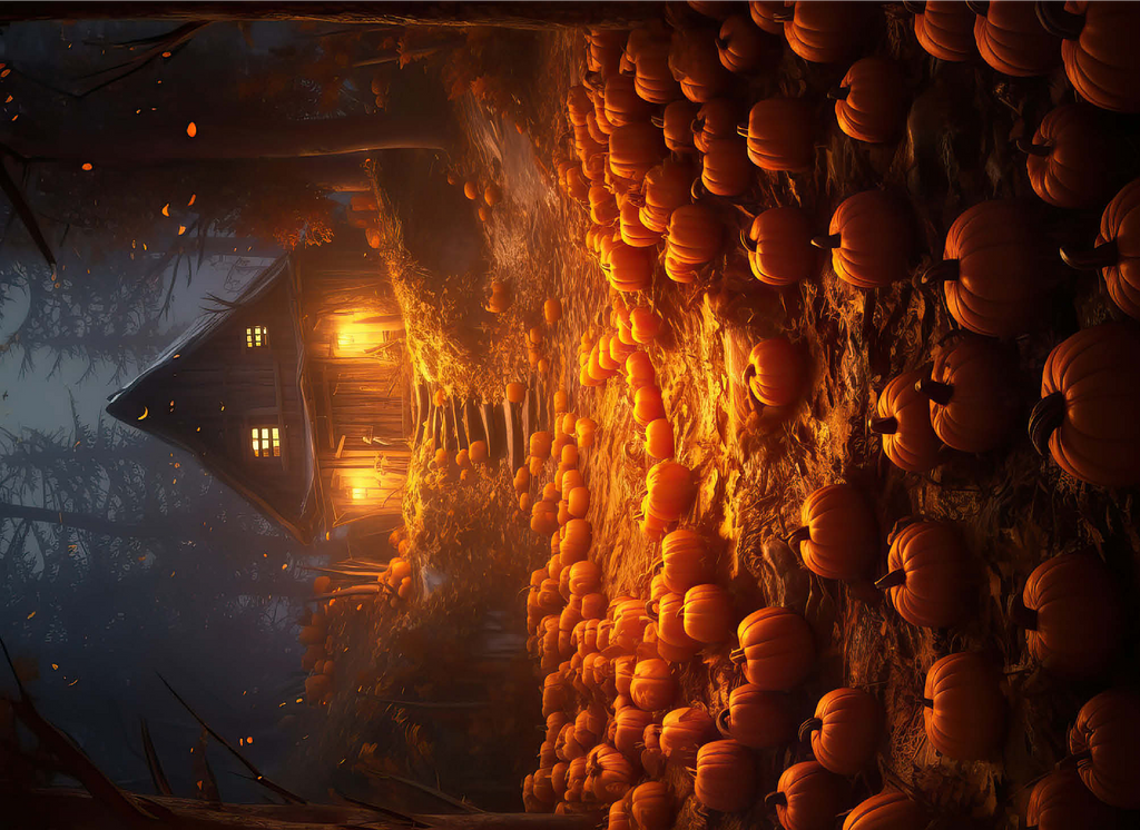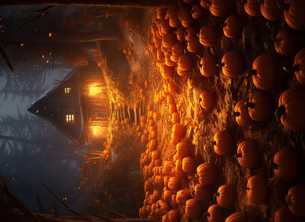 This hauntingly atmospheric scene showcases a secluded wooden cabin nestled in the heart of a dark forest, illuminated by warm, glowing lights. A winding path blanketed with vibrant orange pumpkins leads up to the cabin, adding a mysterious allure. The faintly glowing windows and flickering lanterns create an inviting yet eerie charm, perfect for a Halloween-inspired setting. The surrounding trees cast deep shadows, while scattered leaves dance in the dim moonlight, enhancing the mystical ambiance of this captivating fall night.