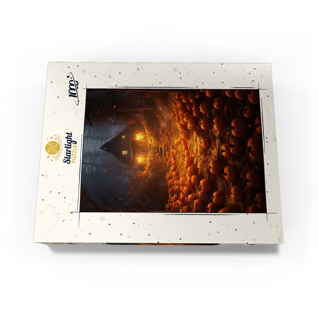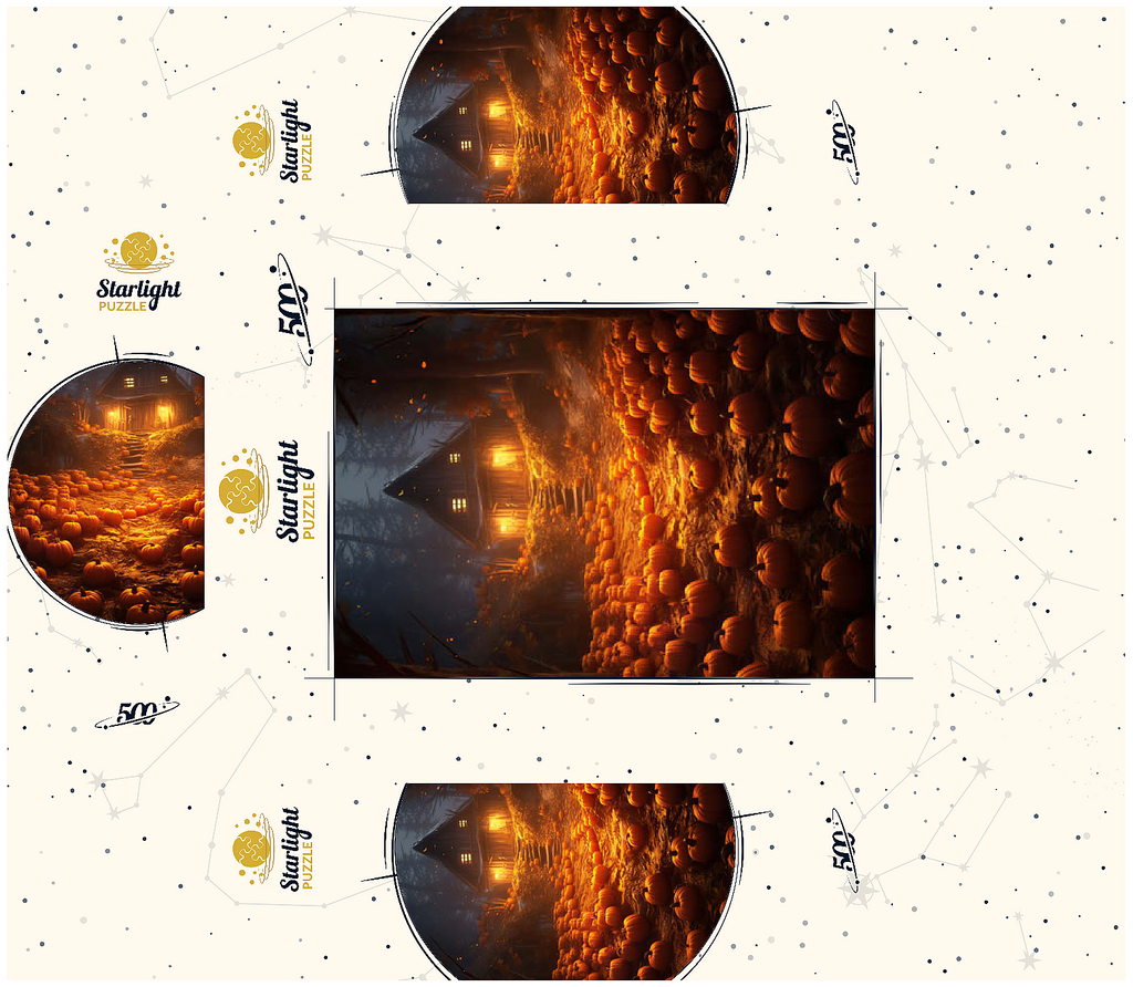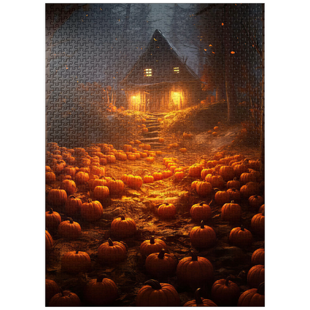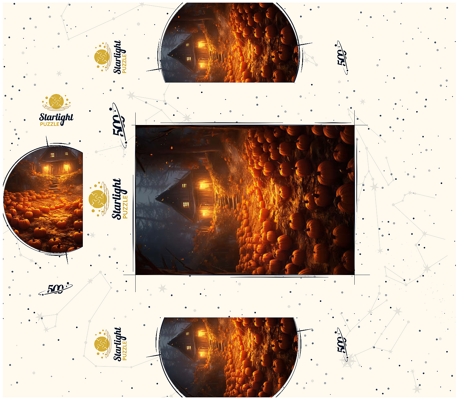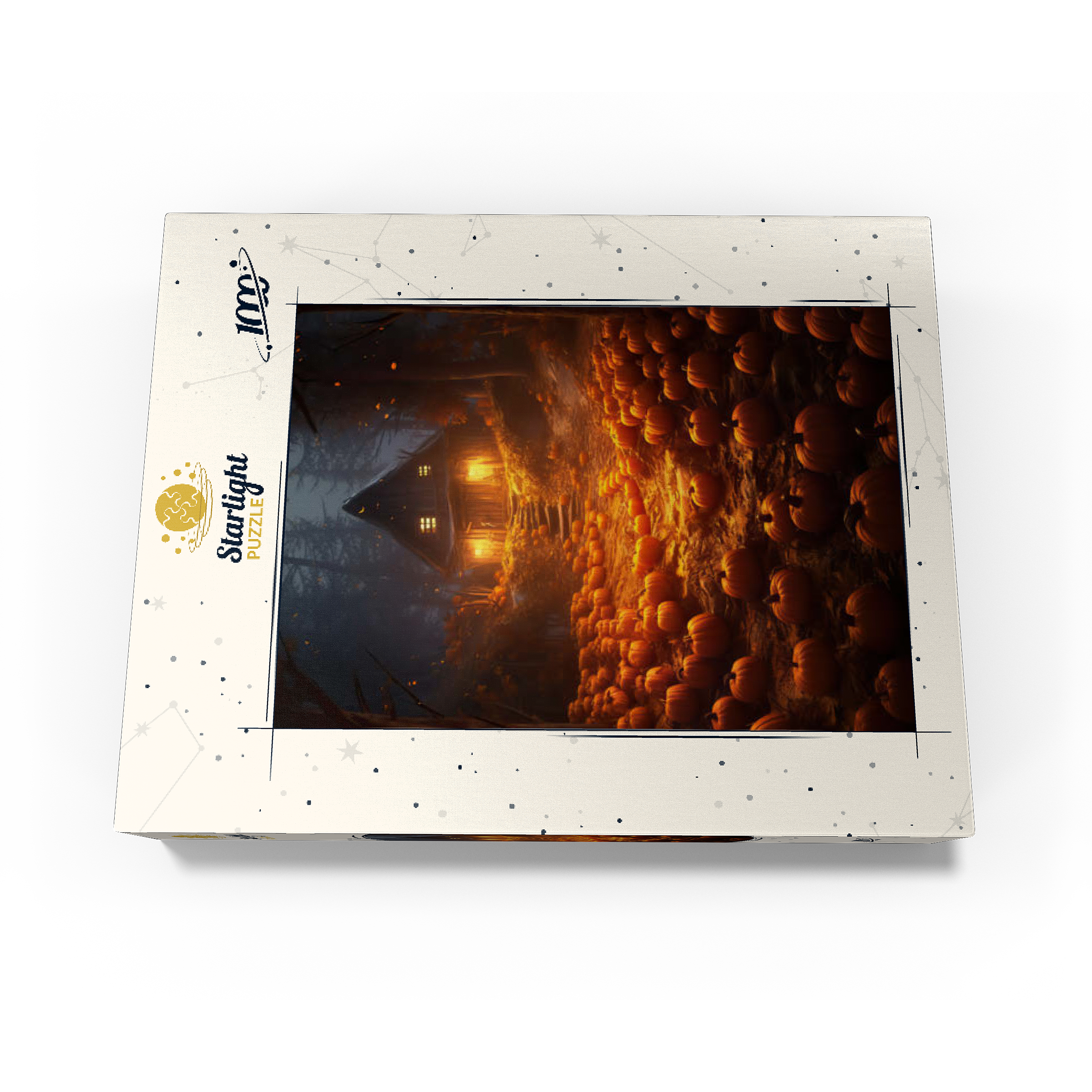 This hauntingly atmospheric scene showcases a secluded wooden cabin nestled in the heart of a dark forest, illuminated by warm, glowing lights. A winding path blanketed with vibrant orange pumpkins leads up to the cabin, adding a mysterious allure. The faintly glowing windows and flickering lanterns create an inviting yet eerie charm, perfect for a Halloween-inspired setting. The surrounding trees cast deep shadows, while scattered leaves dance in the dim moonlight, enhancing the mystical ambiance of this captivating fall night.