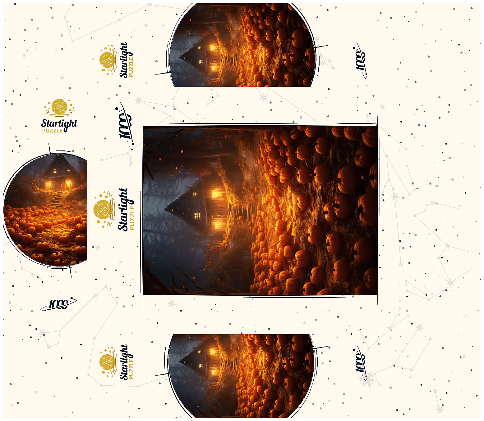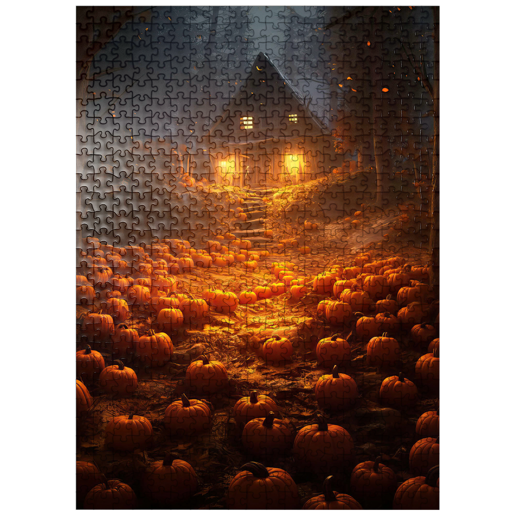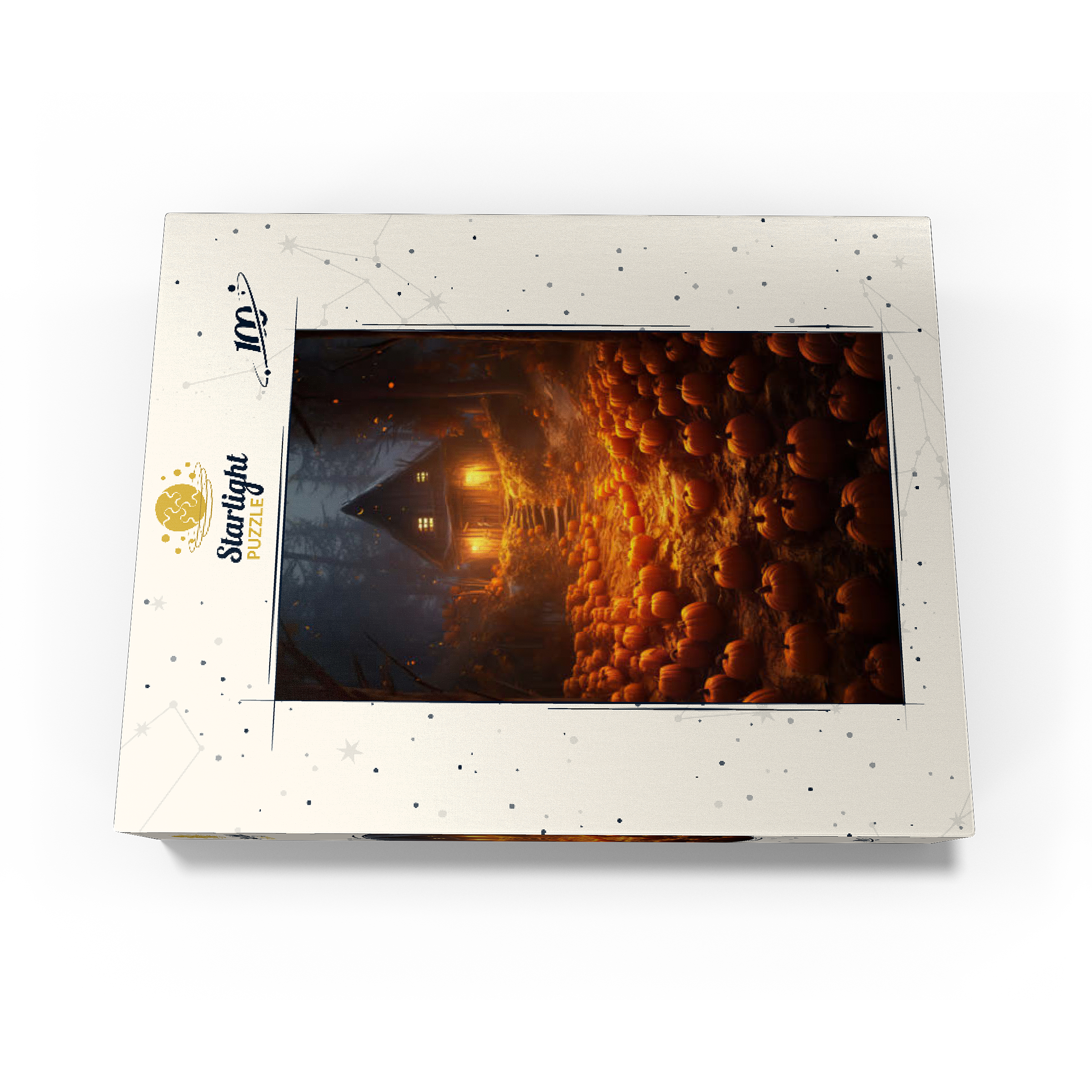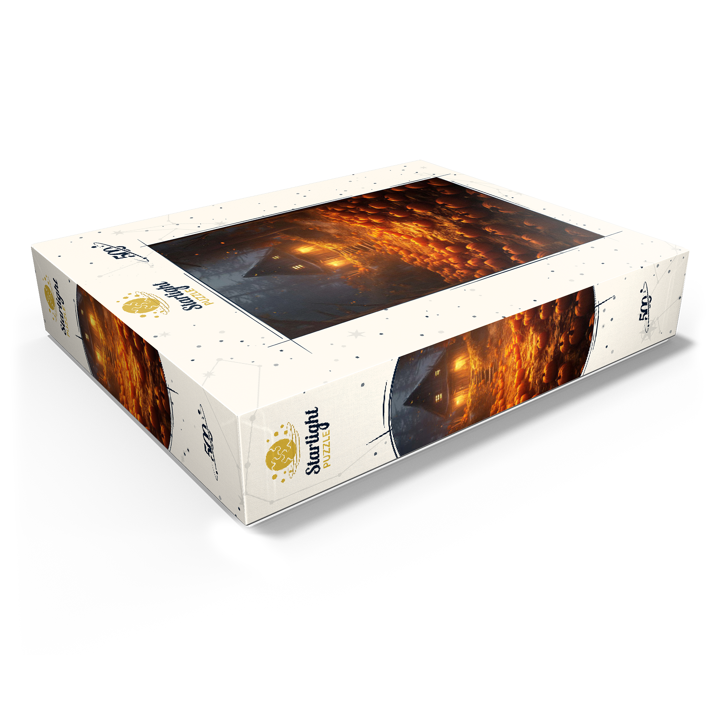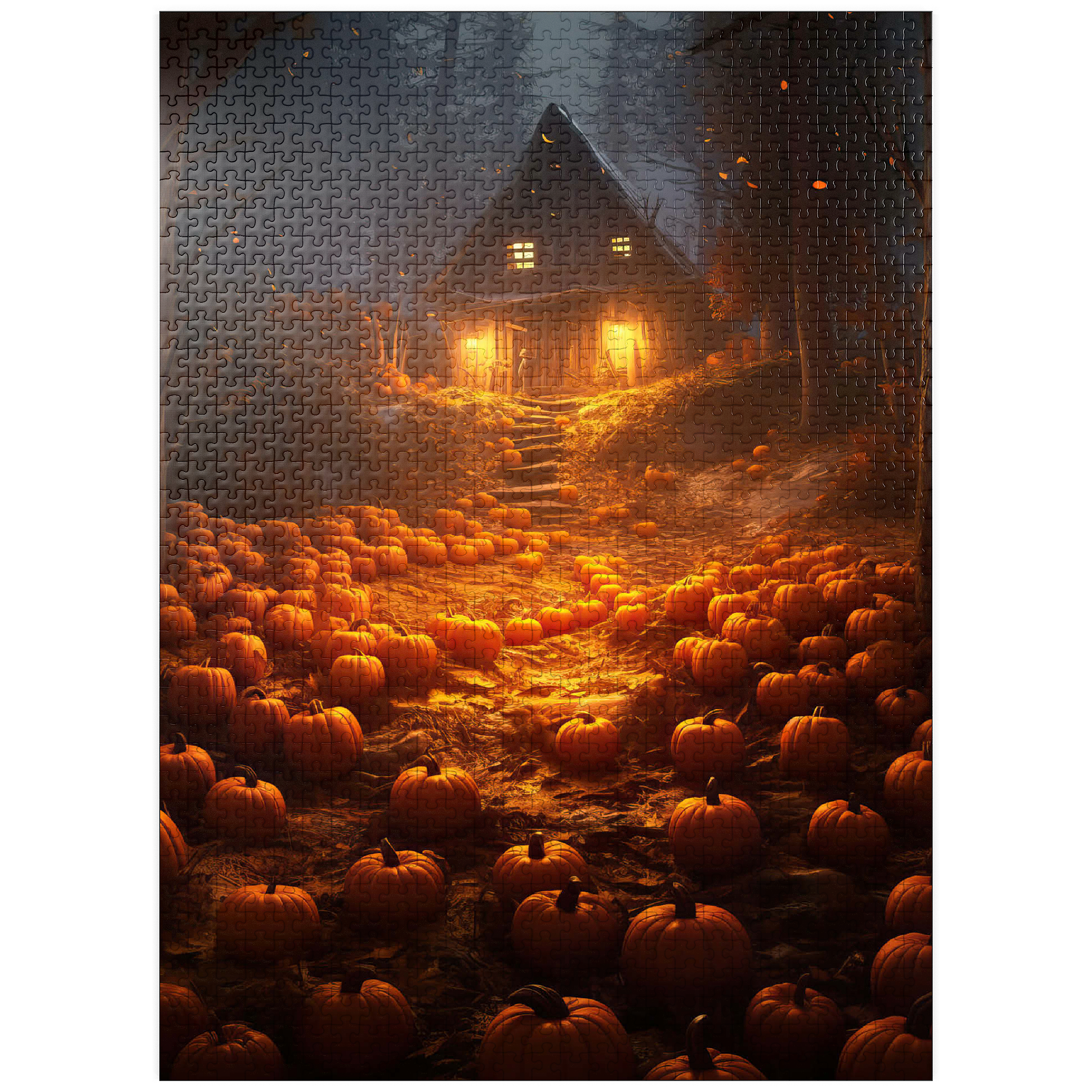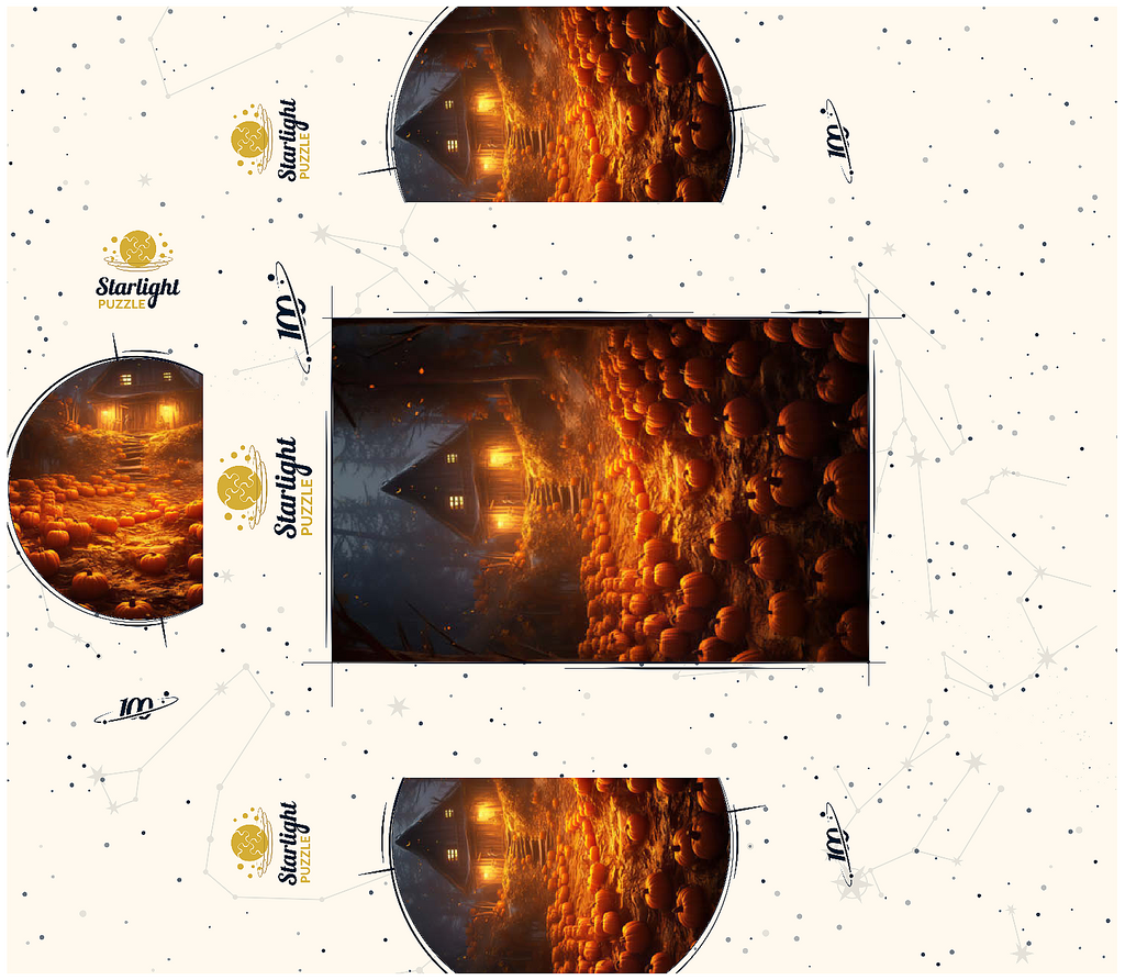This hauntingly atmospheric scene showcases a secluded wooden cabin nestled in the heart of a dark forest, illuminated by warm, glowing lights. A winding path blanketed with vibrant orange pumpkins leads up to the cabin, adding a mysterious allure. The faintly glowing windows and flickering lanterns create an inviting yet eerie charm, perfect for a Halloween-inspired setting. The surrounding trees cast deep shadows, while scattered leaves dance in the dim moonlight, enhancing the mystical ambiance of this captivating fall night.