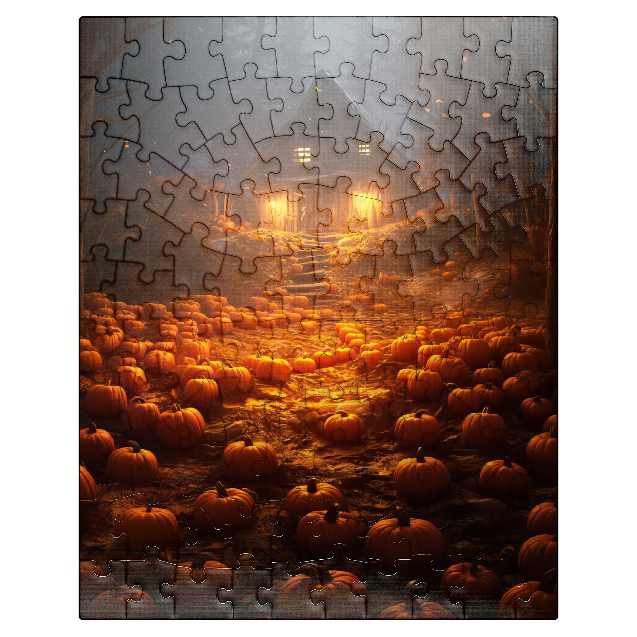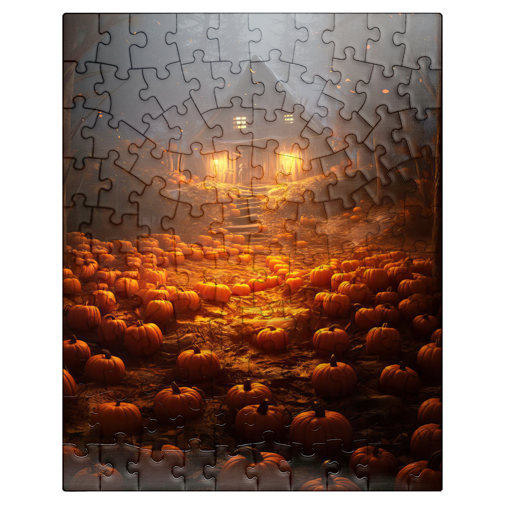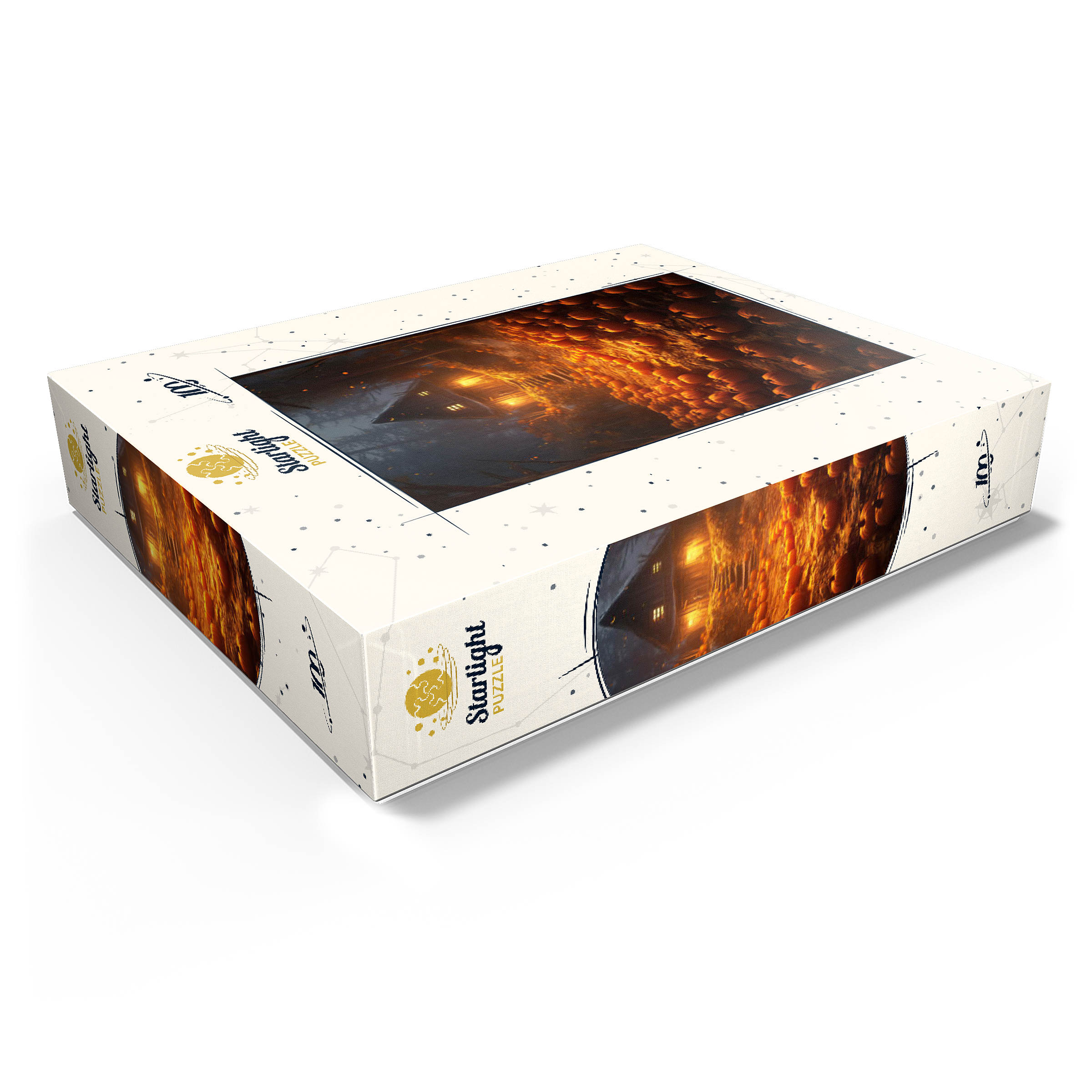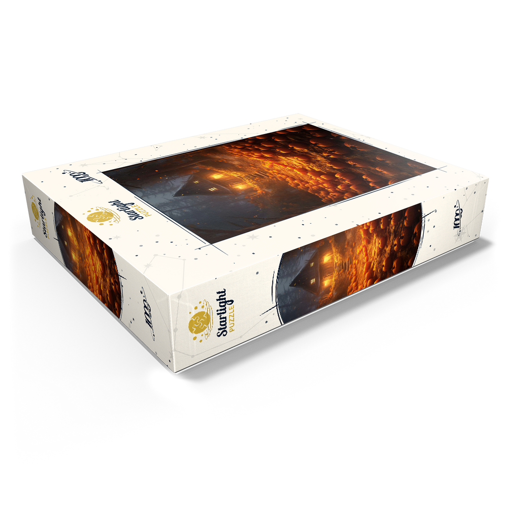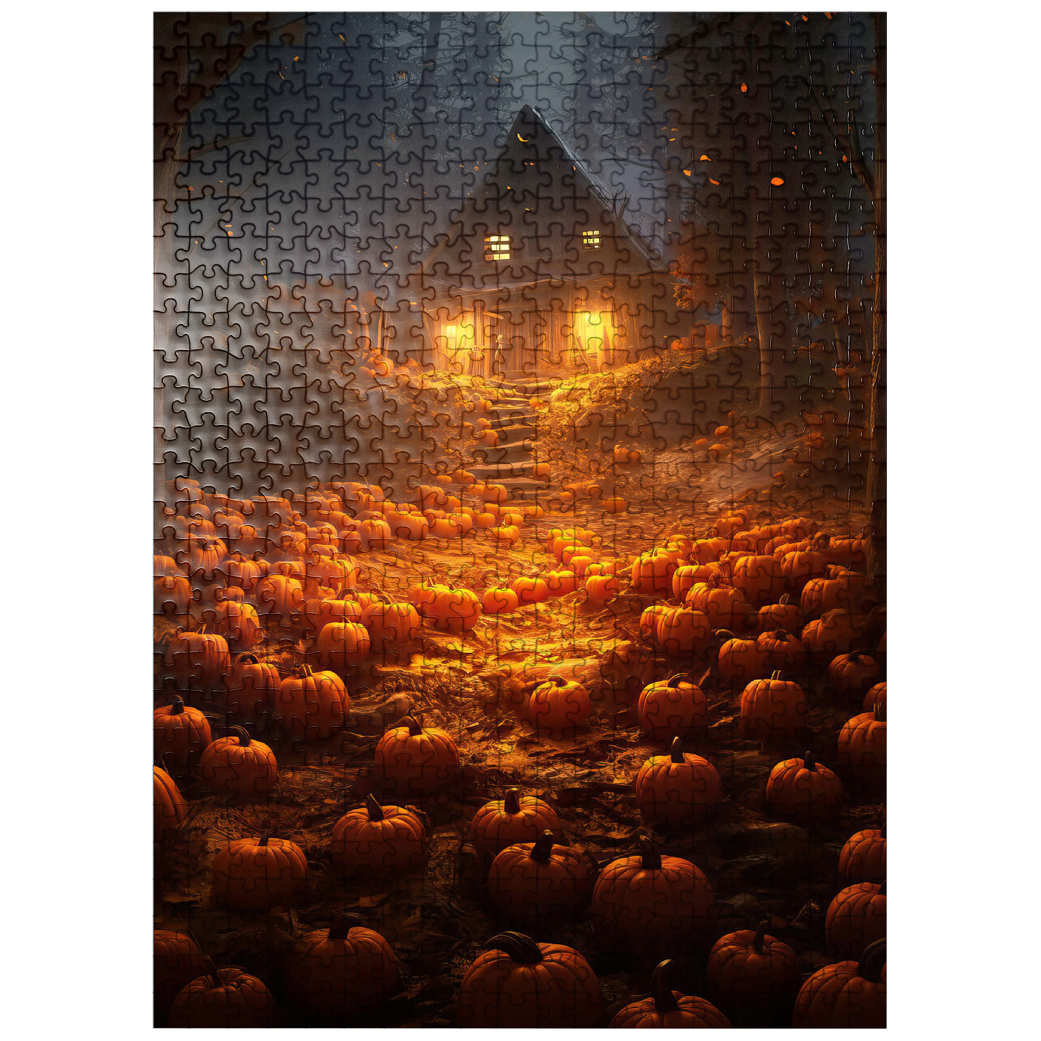 This hauntingly atmospheric scene showcases a secluded wooden cabin nestled in the heart of a dark forest, illuminated by warm, glowing lights. A winding path blanketed with vibrant orange pumpkins leads up to the cabin, adding a mysterious allure. The faintly glowing windows and flickering lanterns create an inviting yet eerie charm, perfect for a Halloween-inspired setting. The surrounding trees cast deep shadows, while scattered leaves dance in the dim moonlight, enhancing the mystical ambiance of this captivating fall night.