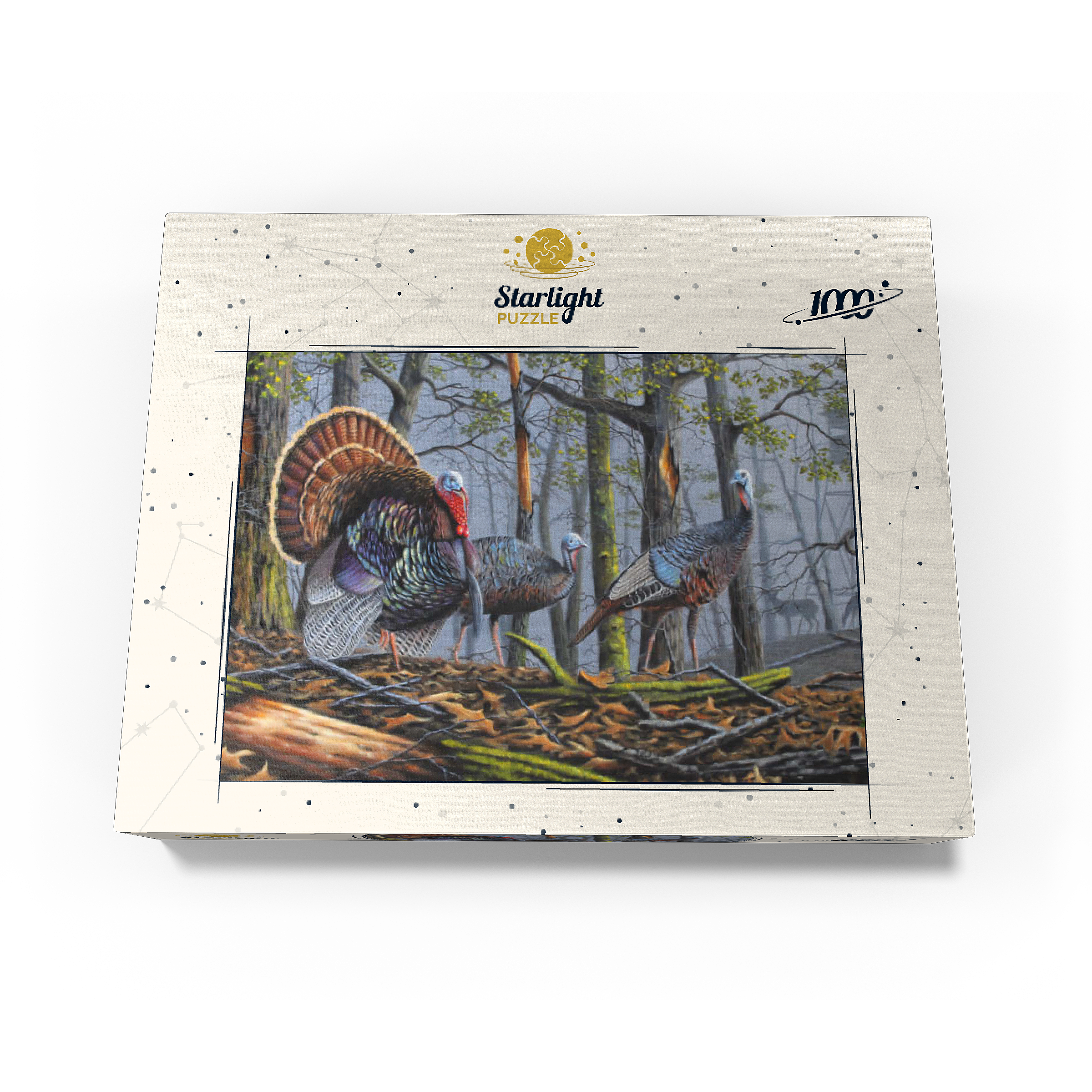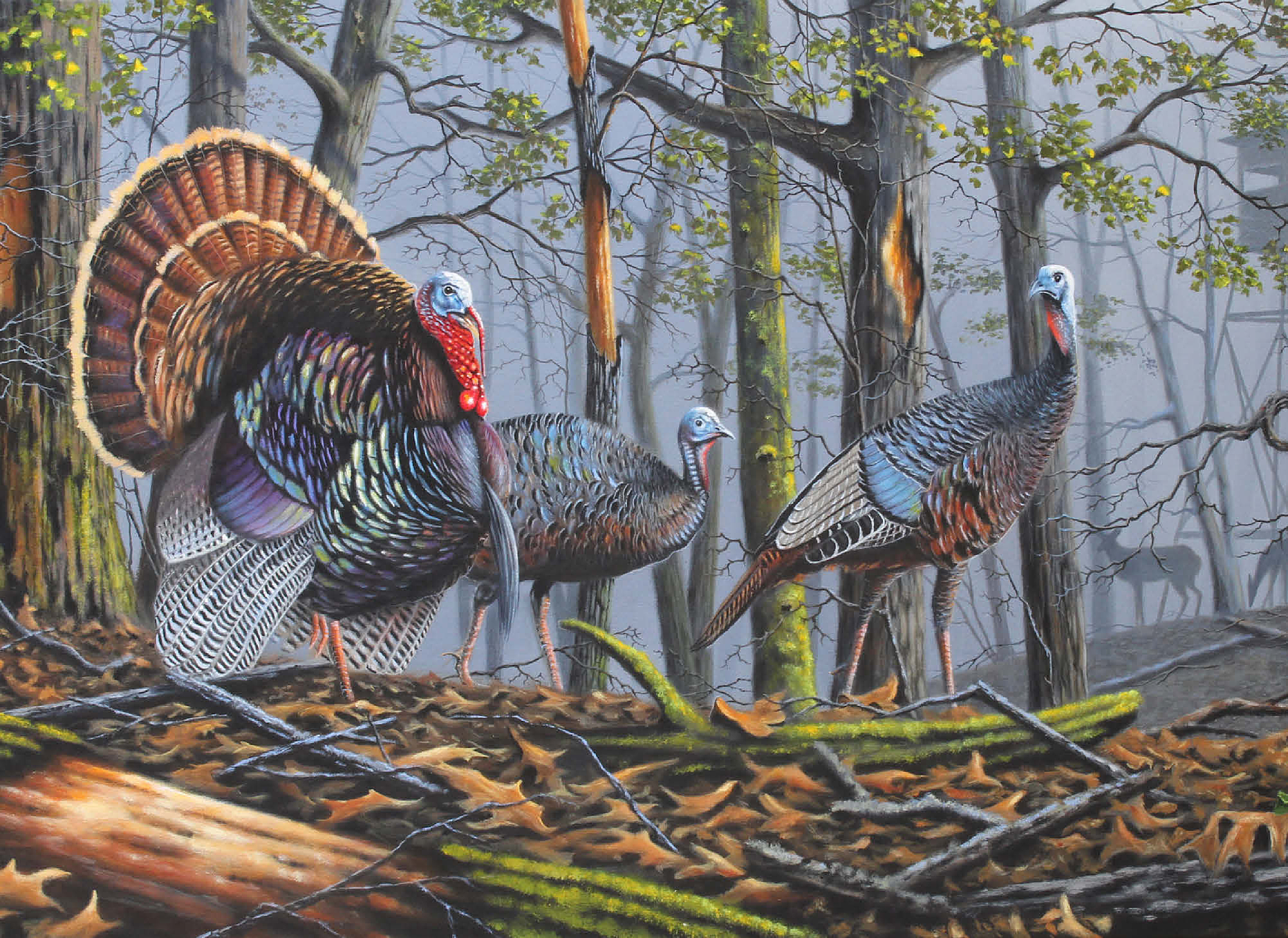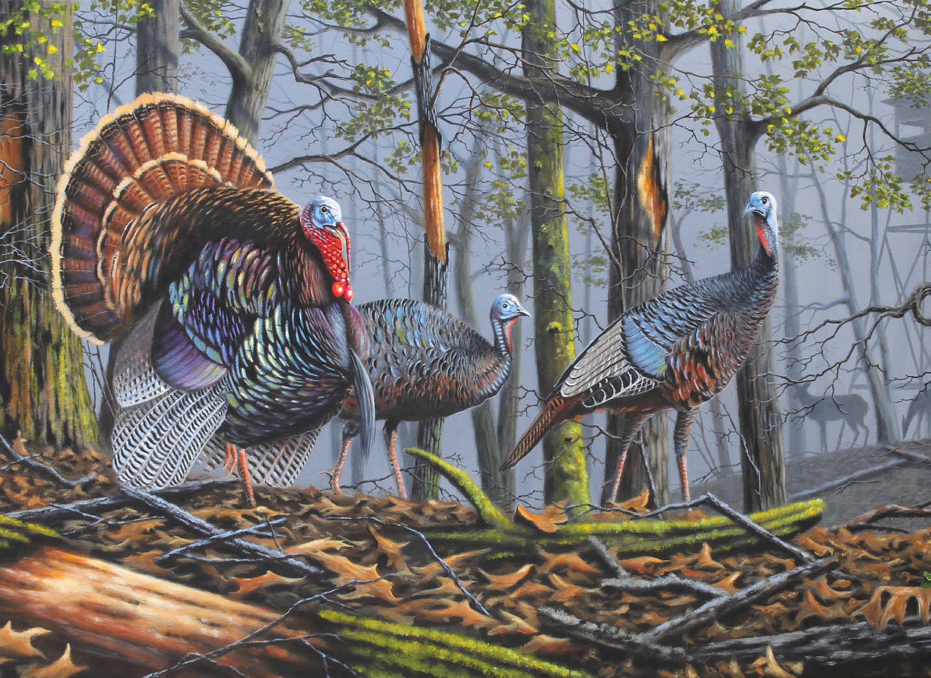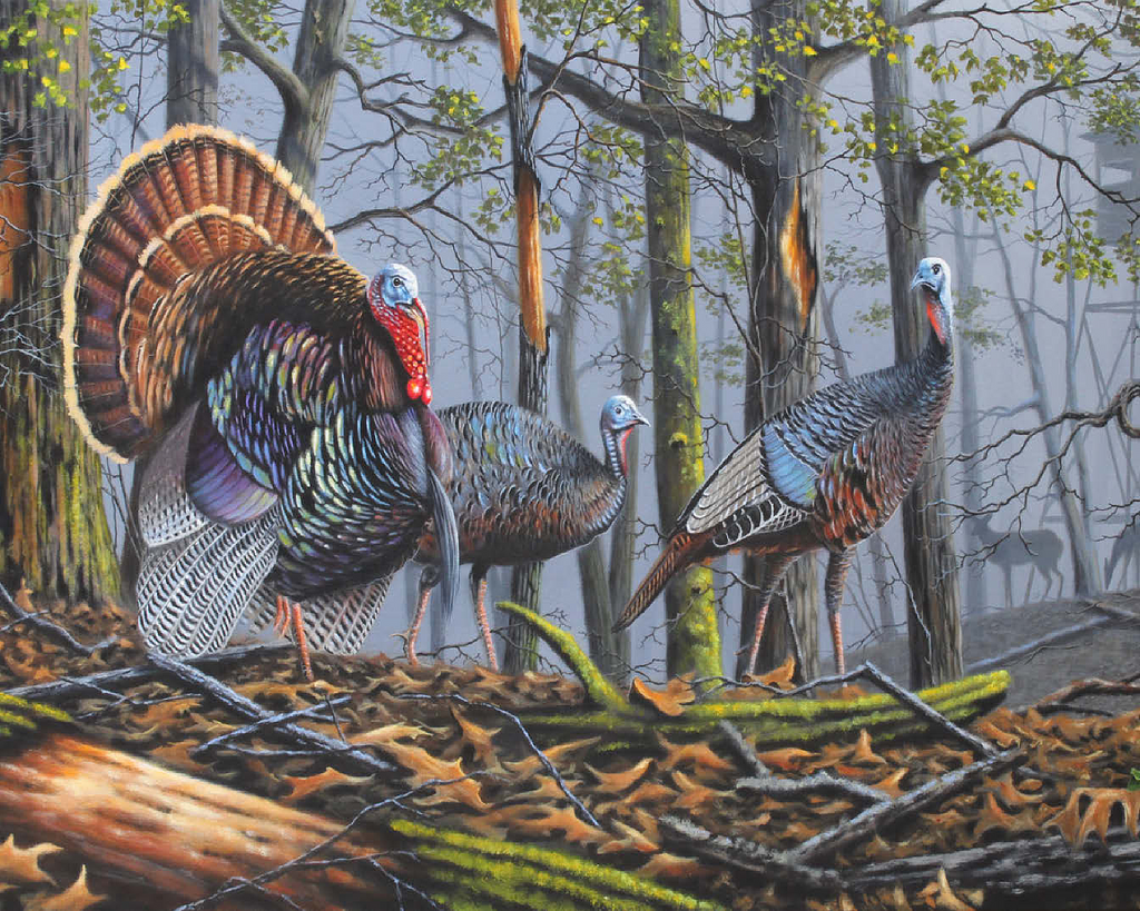 This vibrant forest scene captures a group of Wild Eastern Turkeys (Meleagris gallopavo silvestris) in their natural habitat on a misty morning. The dominant tom displays his iridescent plumage with pride, while two hens forage nearby among fallen leaves and moss-covered logs. Bare trees rise from the forest floor, their silhouettes blending into the foggy backdrop, where distant deer and a hunting stand subtly emerge. The setting evokes the quiet beauty of North American hardwood forests in late fall, showcasing the turkey's natural behavior and environment with striking detail.