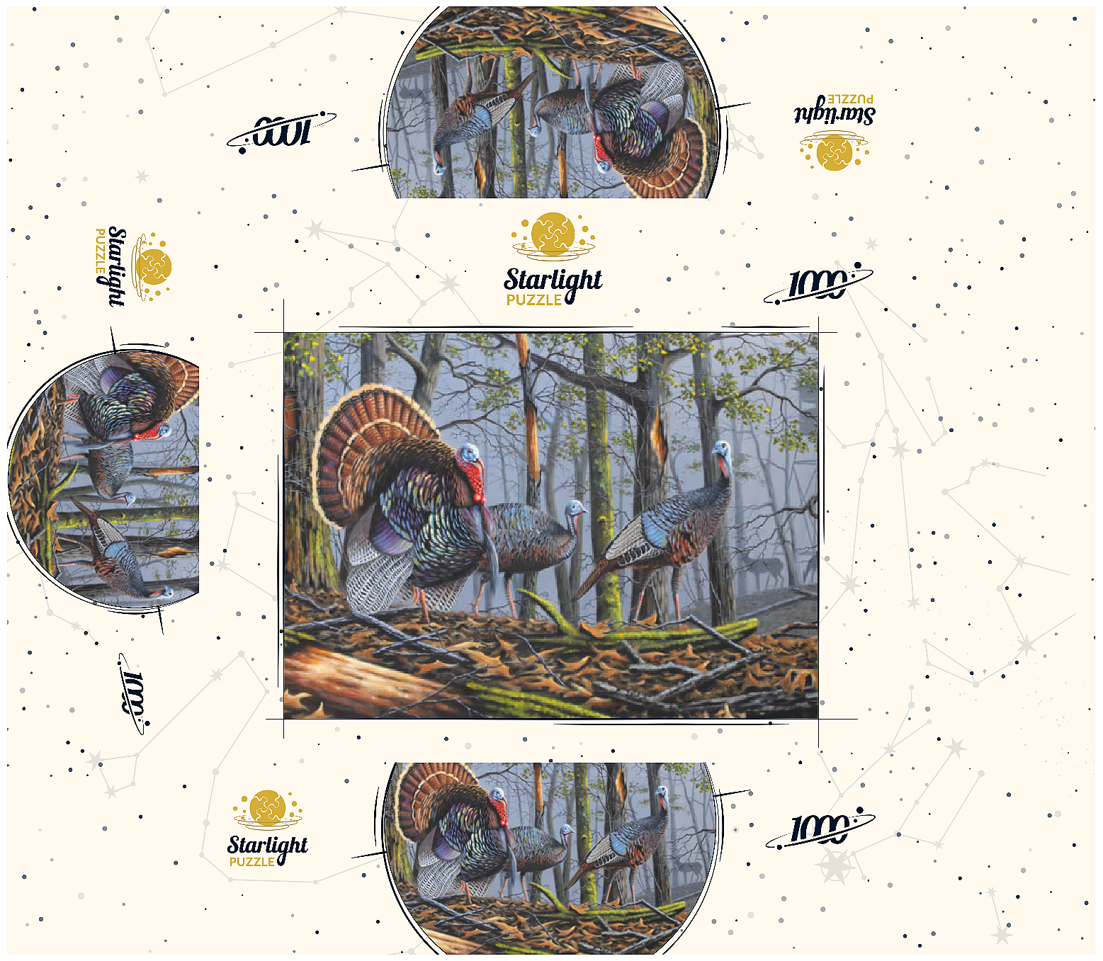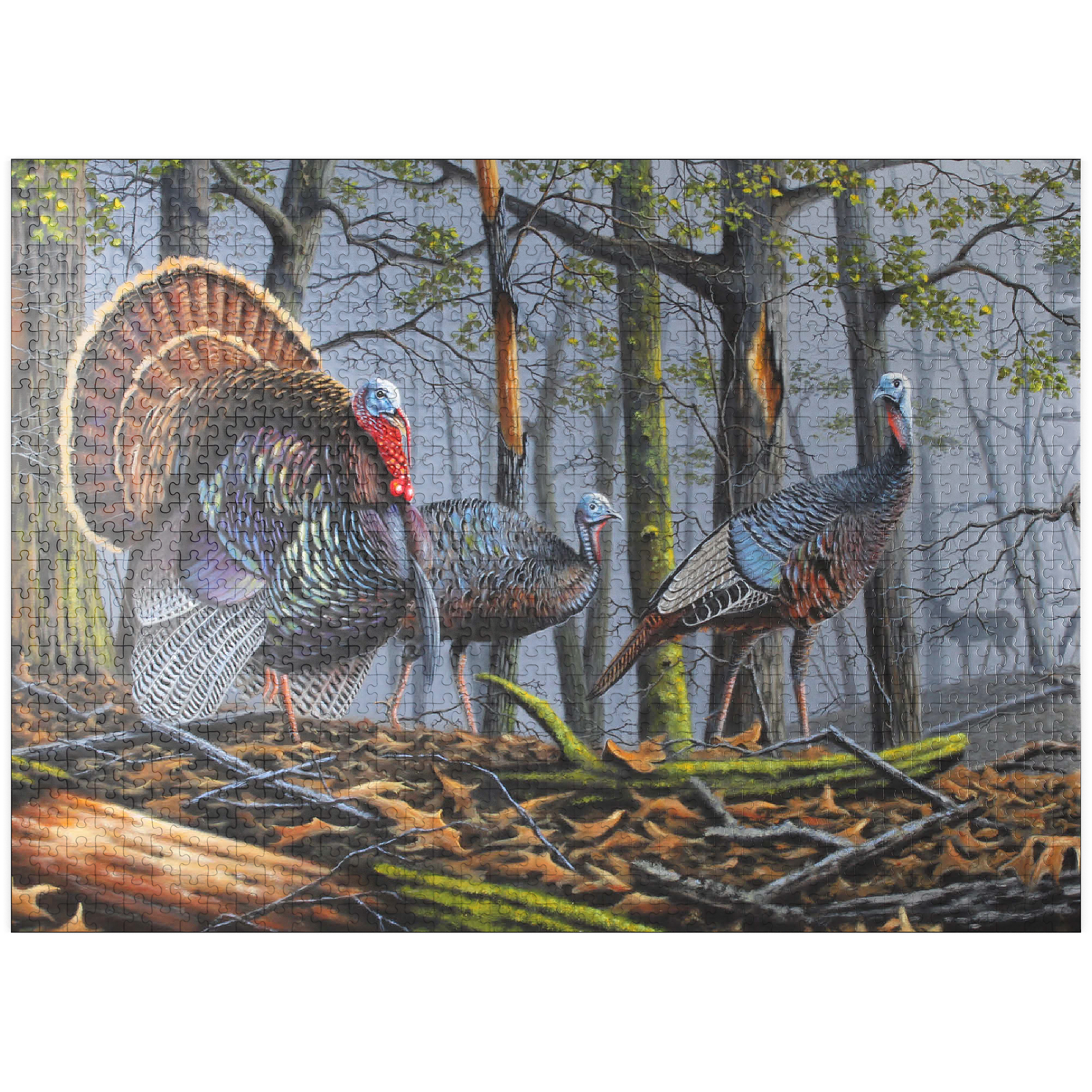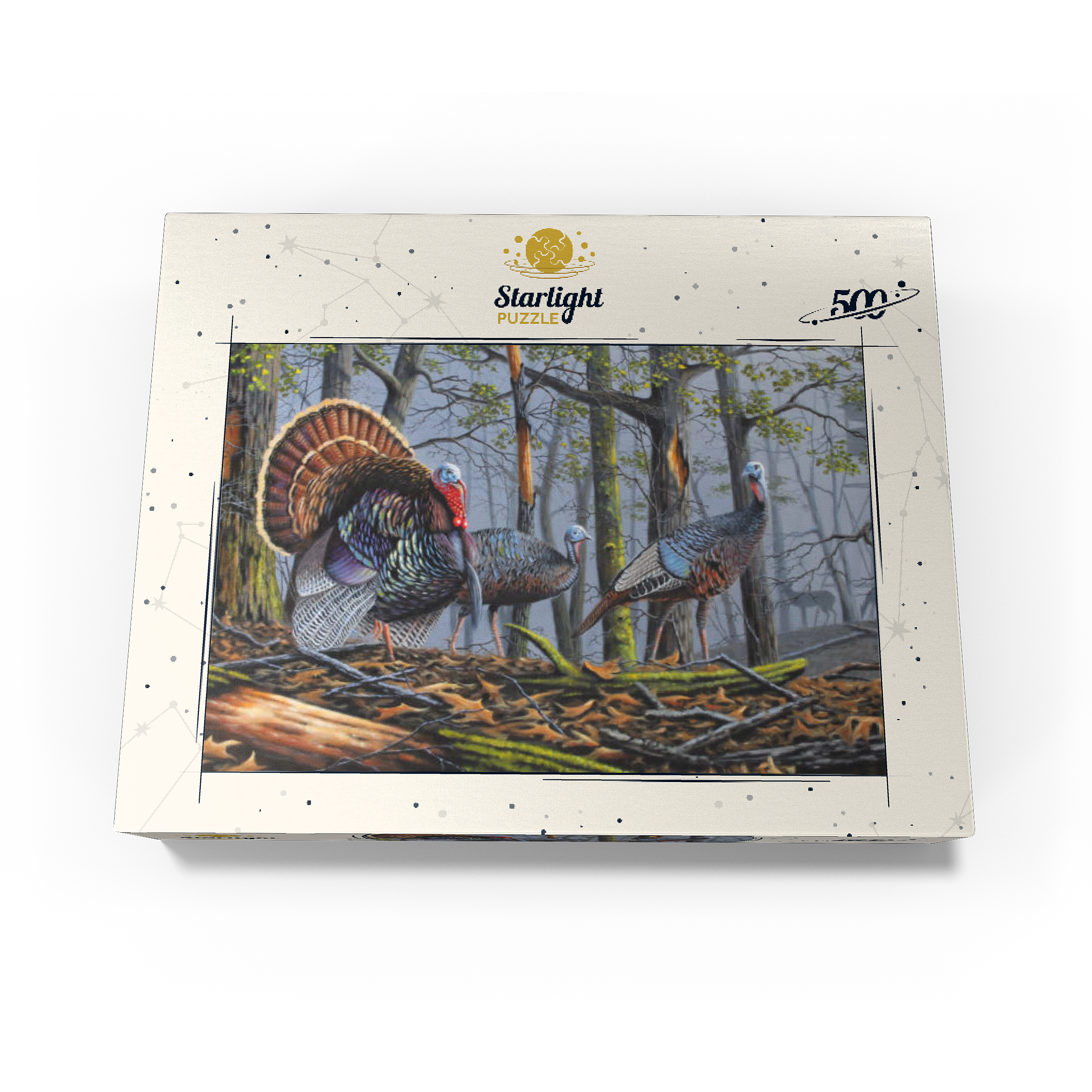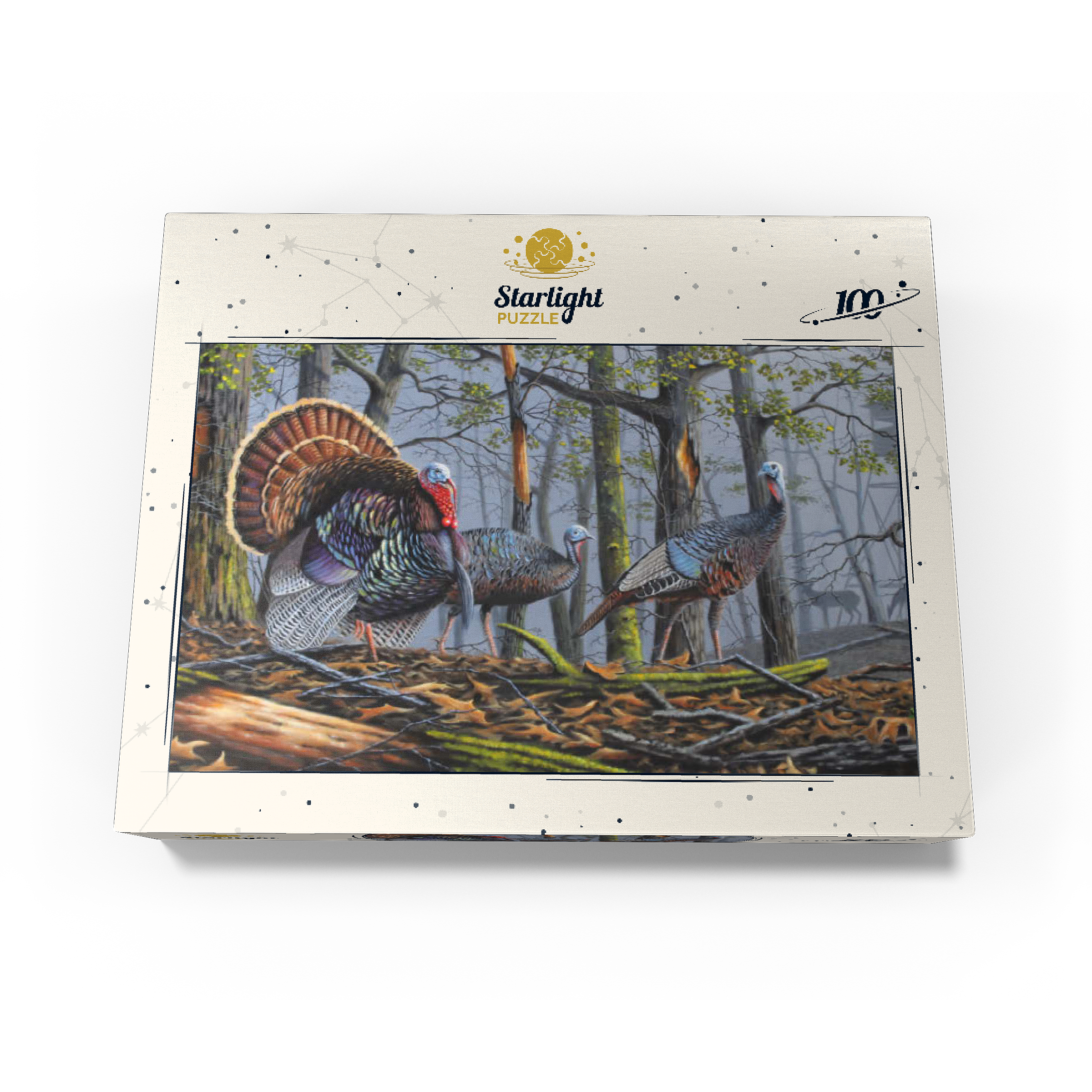 This vibrant forest scene captures a group of Wild Eastern Turkeys (Meleagris gallopavo silvestris) in their natural habitat on a misty morning. The dominant tom displays his iridescent plumage with pride, while two hens forage nearby among fallen leaves and moss-covered logs. Bare trees rise from the forest floor, their silhouettes blending into the foggy backdrop, where distant deer and a hunting stand subtly emerge. The setting evokes the quiet beauty of North American hardwood forests in late fall, showcasing the turkey's natural behavior and environment with striking detail.