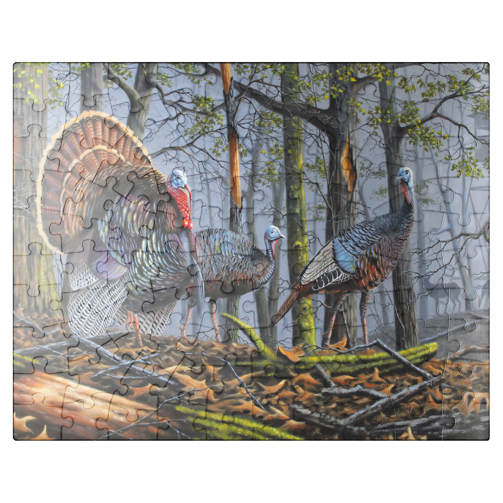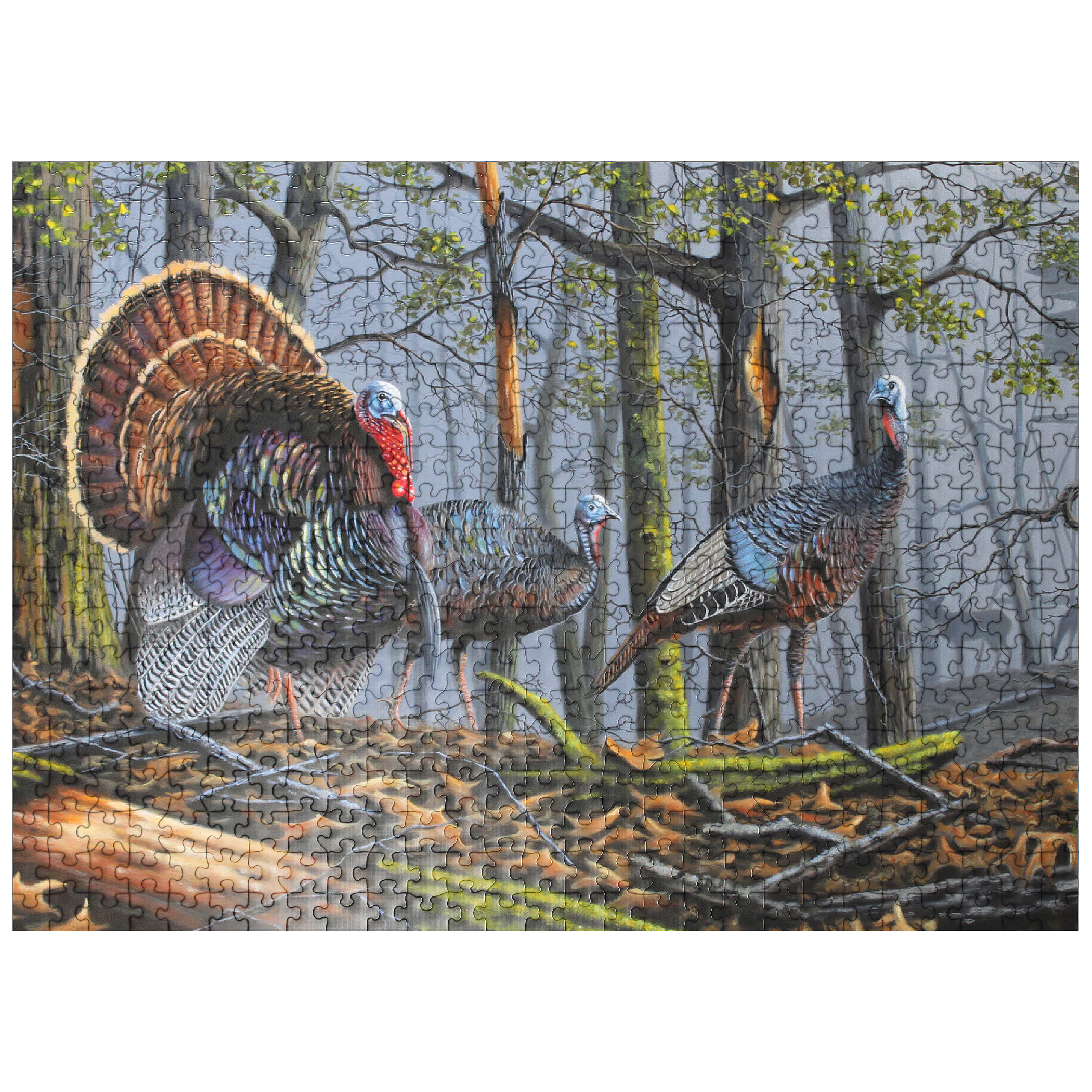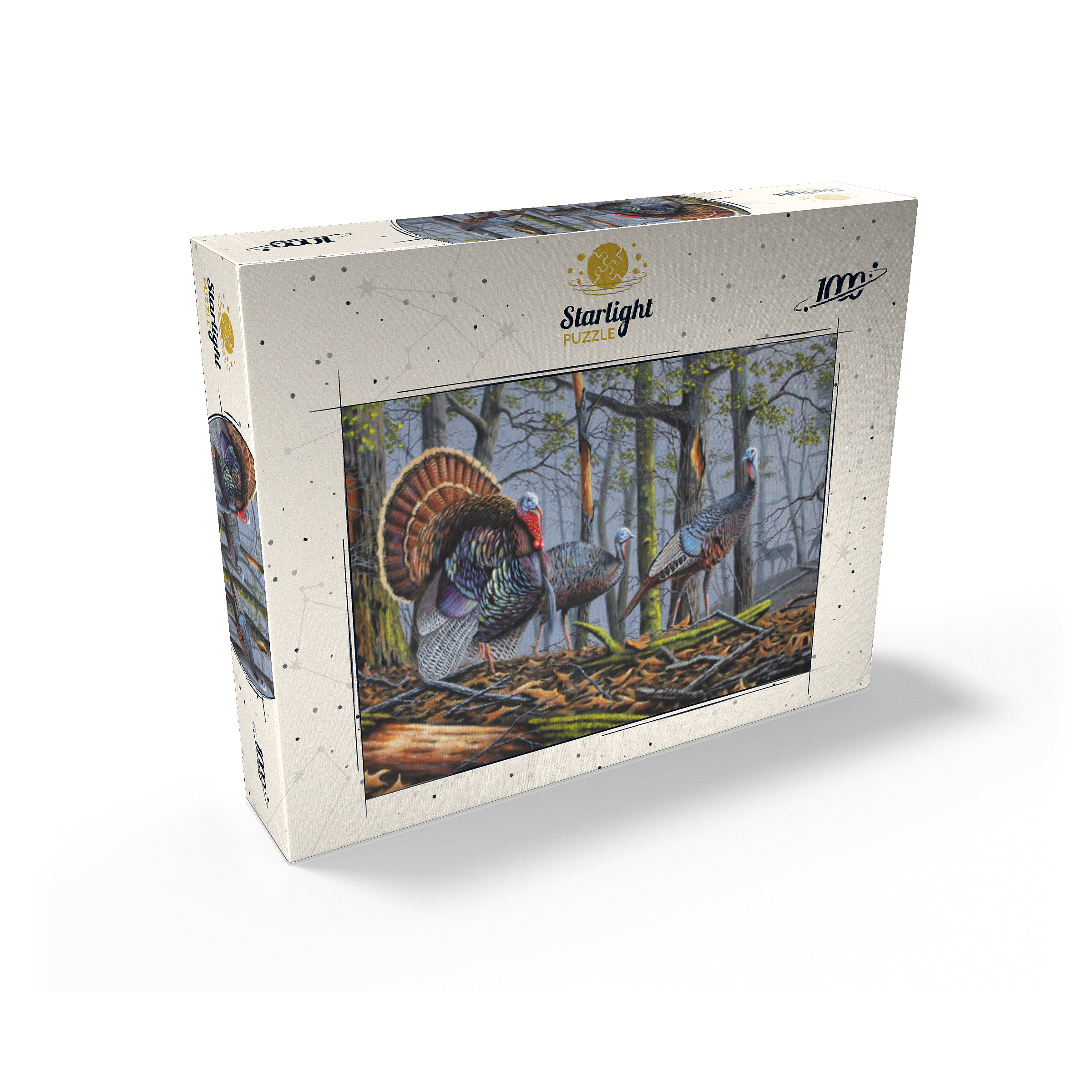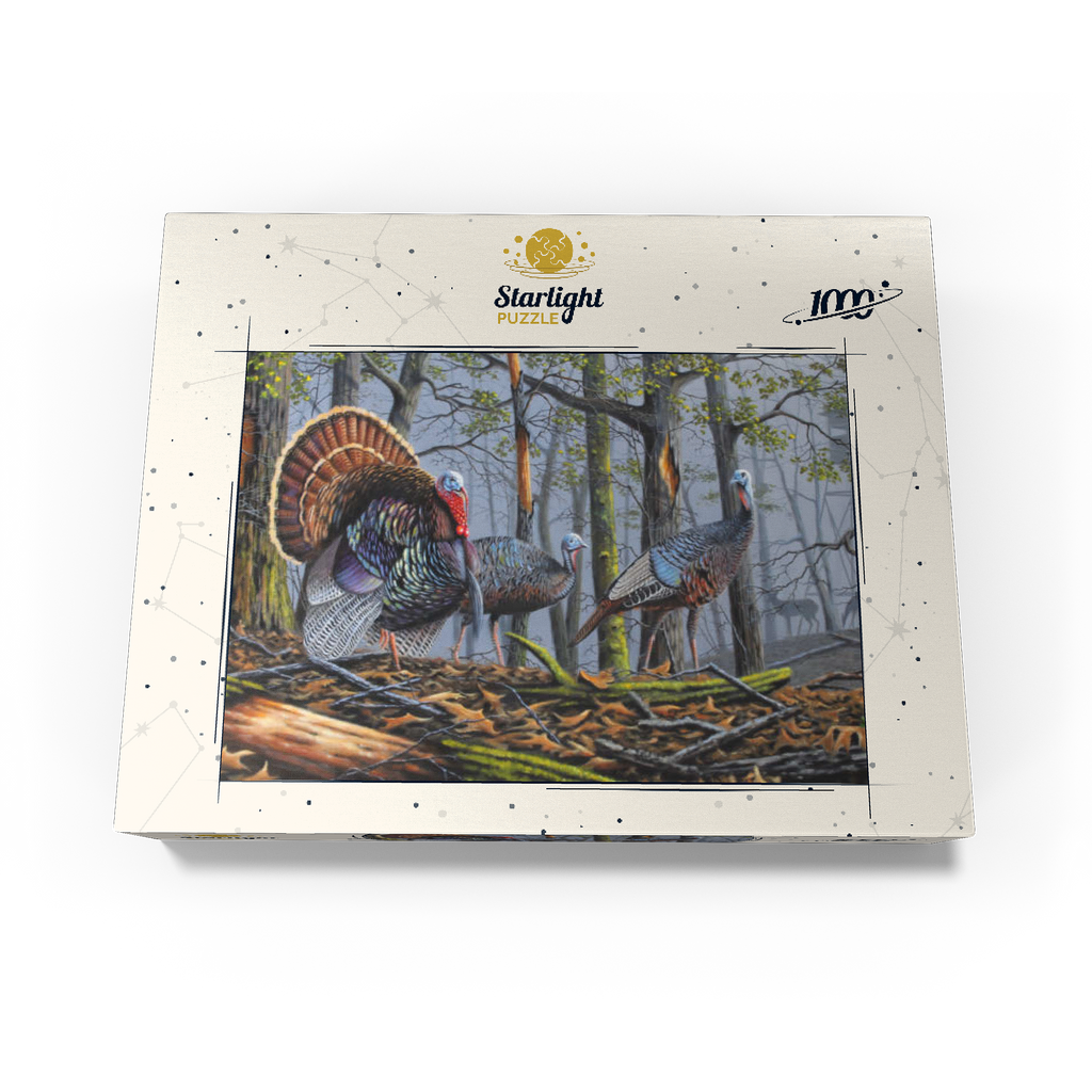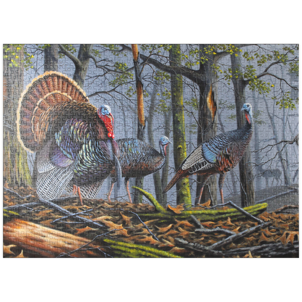 This vibrant forest scene captures a group of Wild Eastern Turkeys (Meleagris gallopavo silvestris) in their natural habitat on a misty morning. The dominant tom displays his iridescent plumage with pride, while two hens forage nearby among fallen leaves and moss-covered logs. Bare trees rise from the forest floor, their silhouettes blending into the foggy backdrop, where distant deer and a hunting stand subtly emerge. The setting evokes the quiet beauty of North American hardwood forests in late fall, showcasing the turkey's natural behavior and environment with striking detail.